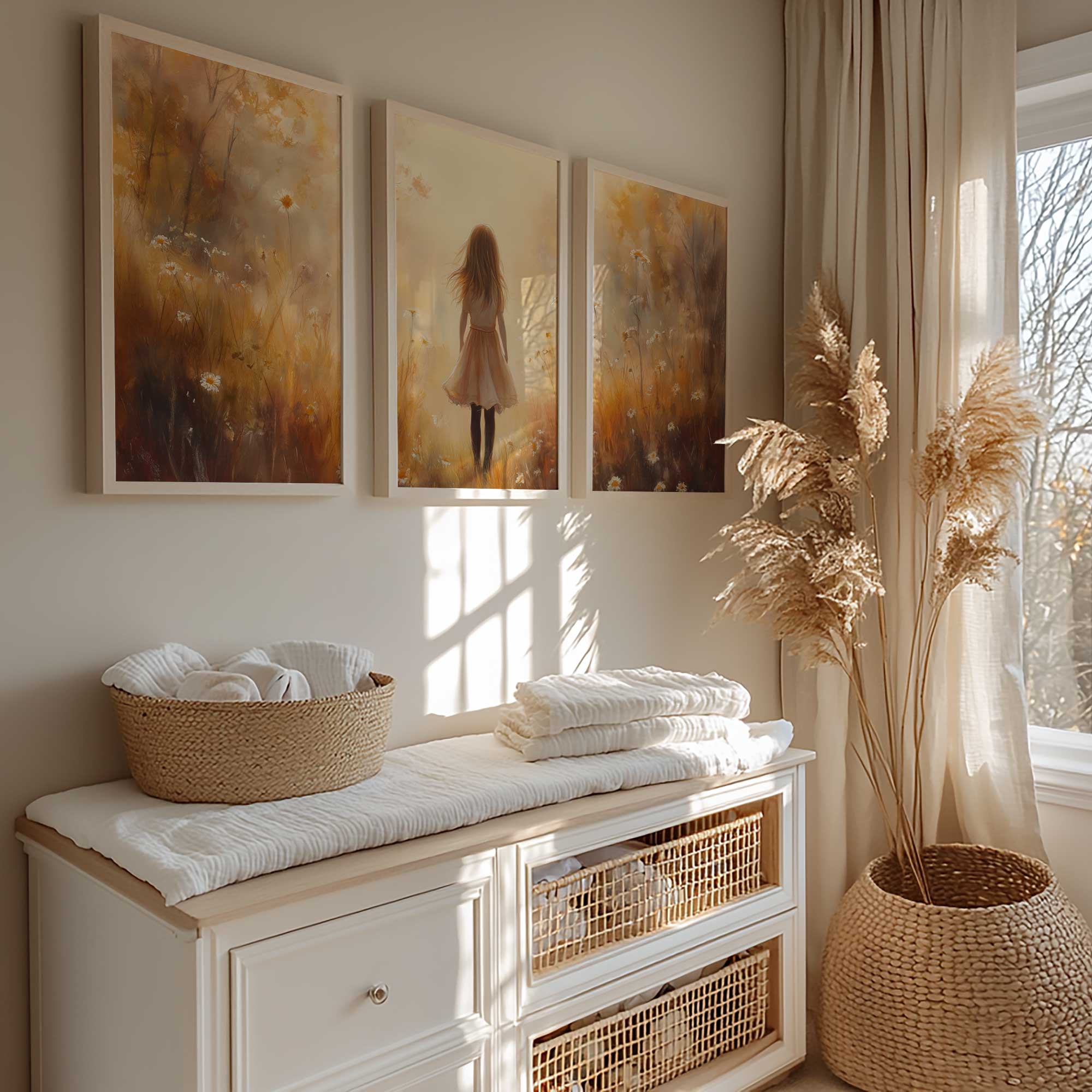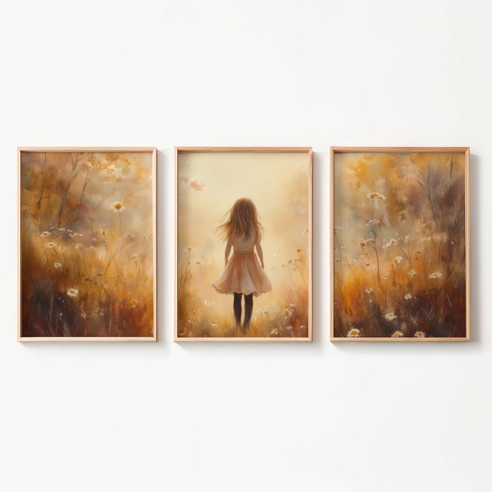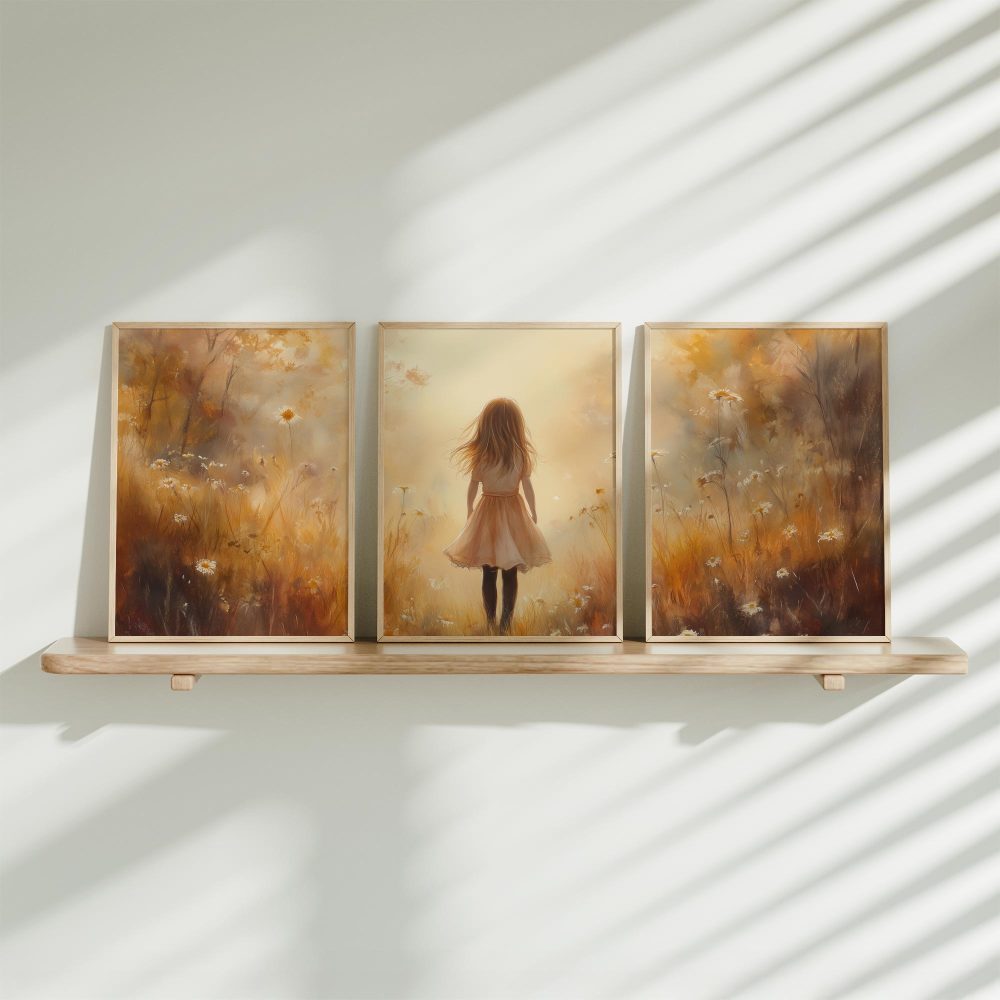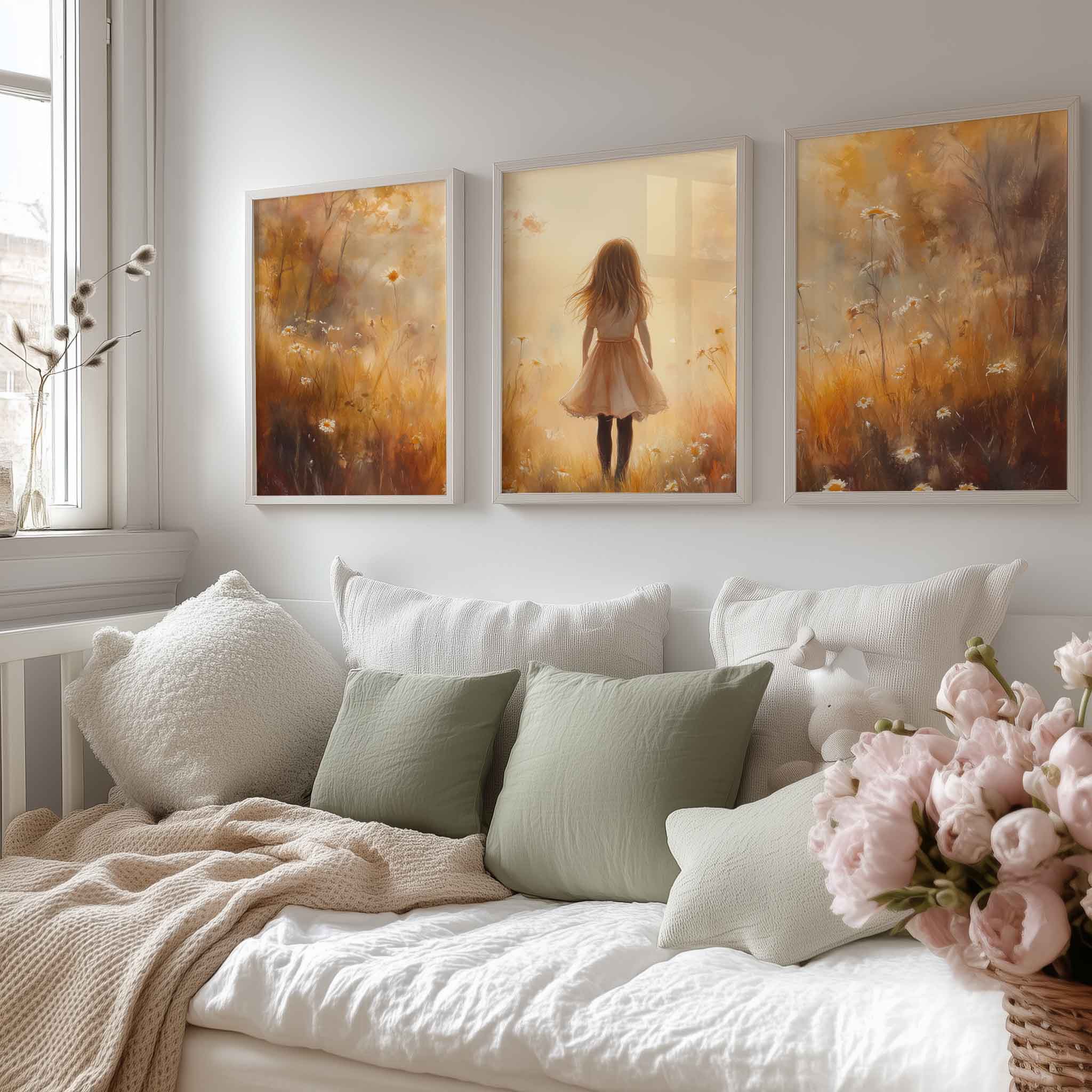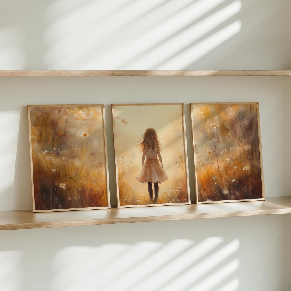 Terug naar collectie / Kinderkamer posters / Bloemen posters / Dromerig Meisje in Bloemenveld – Warme Kinderfantasie