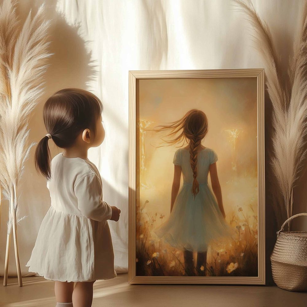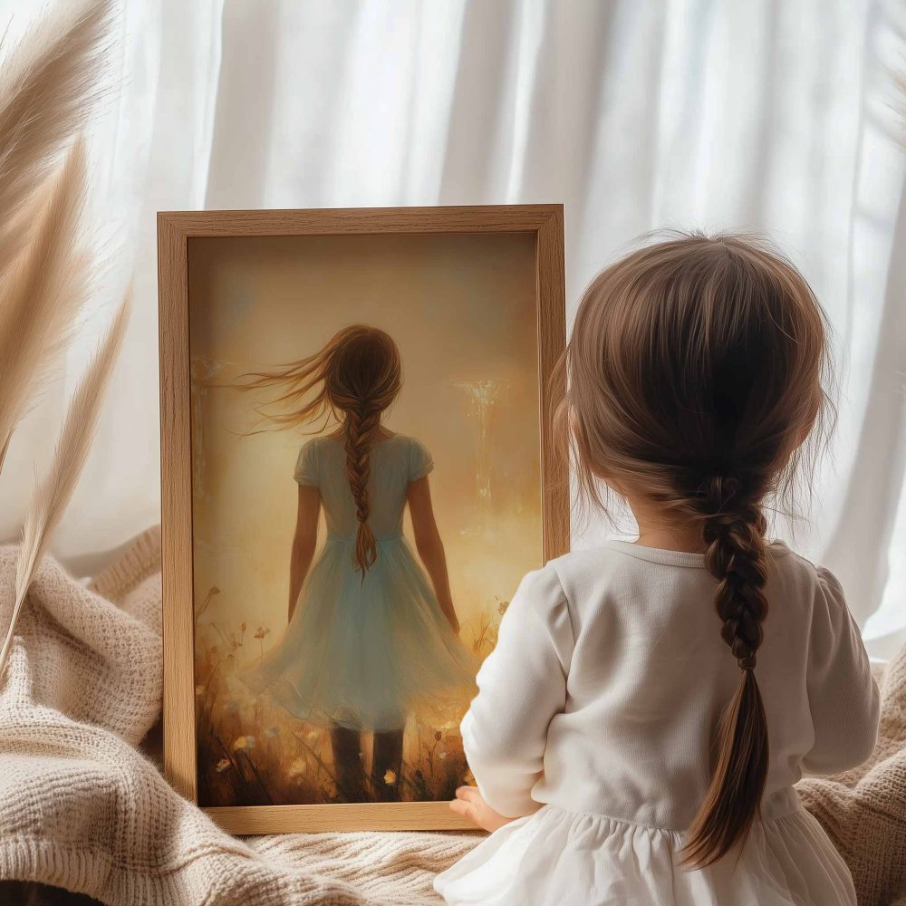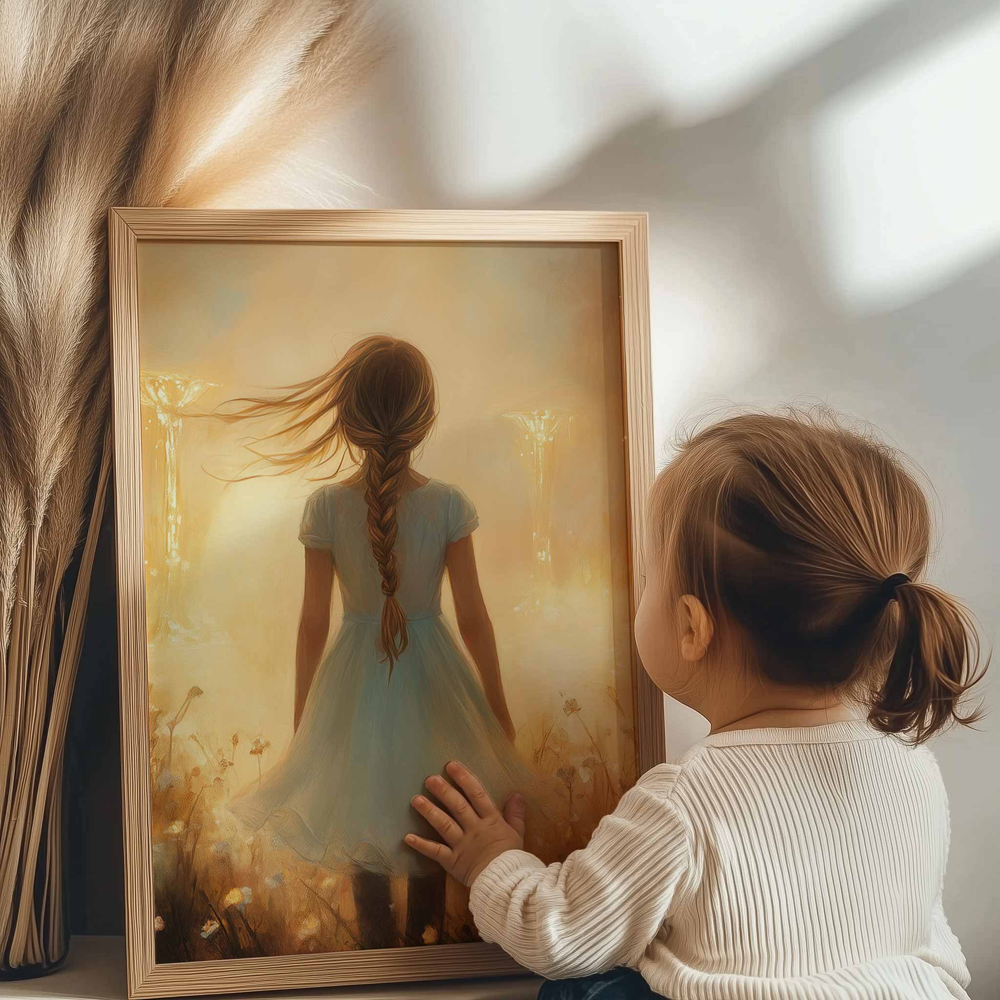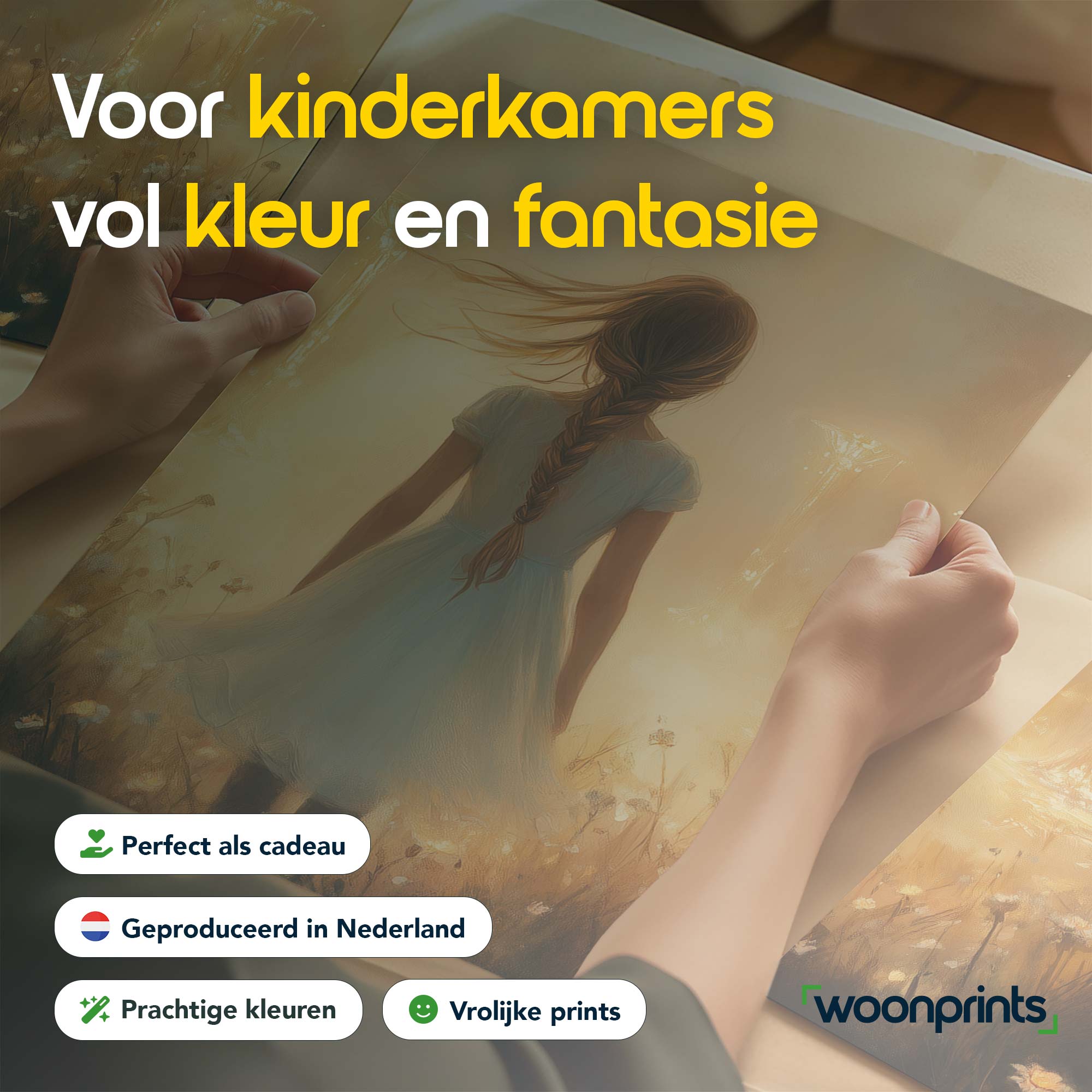 Terug naar collectie / Kinderkamer posters / Bloemen posters / Dromerig Meisje in Bloemenveld – Warme Zonneschijn