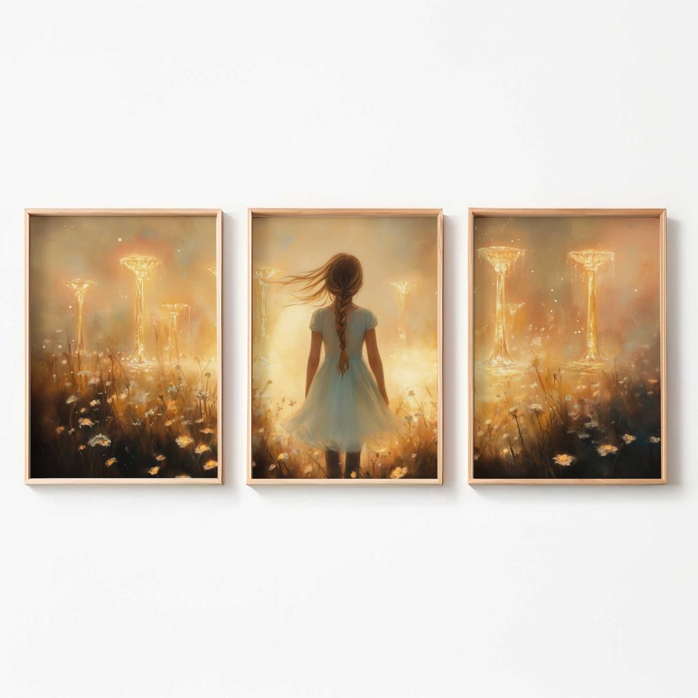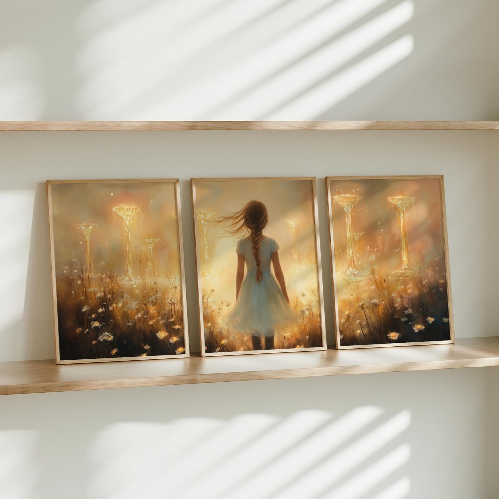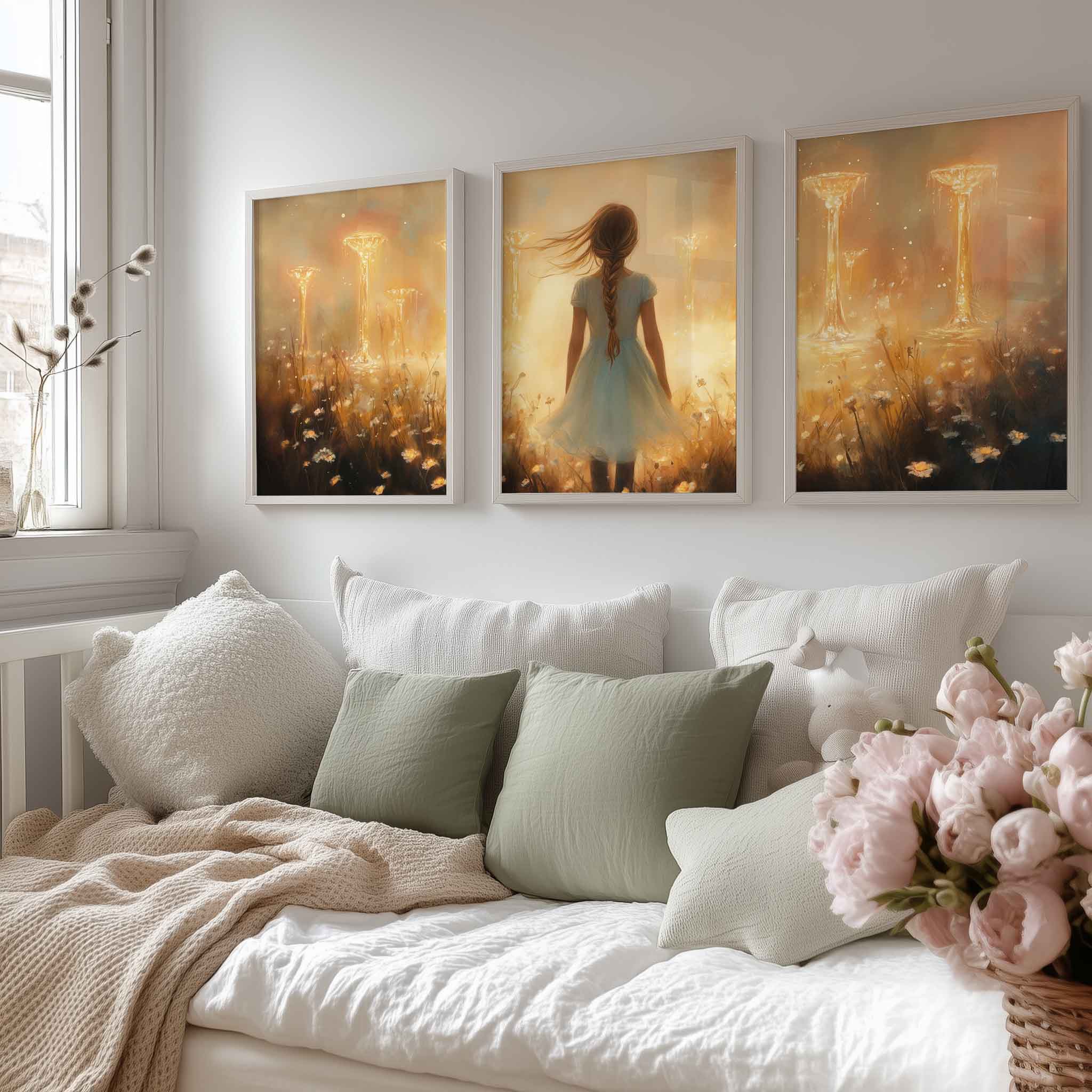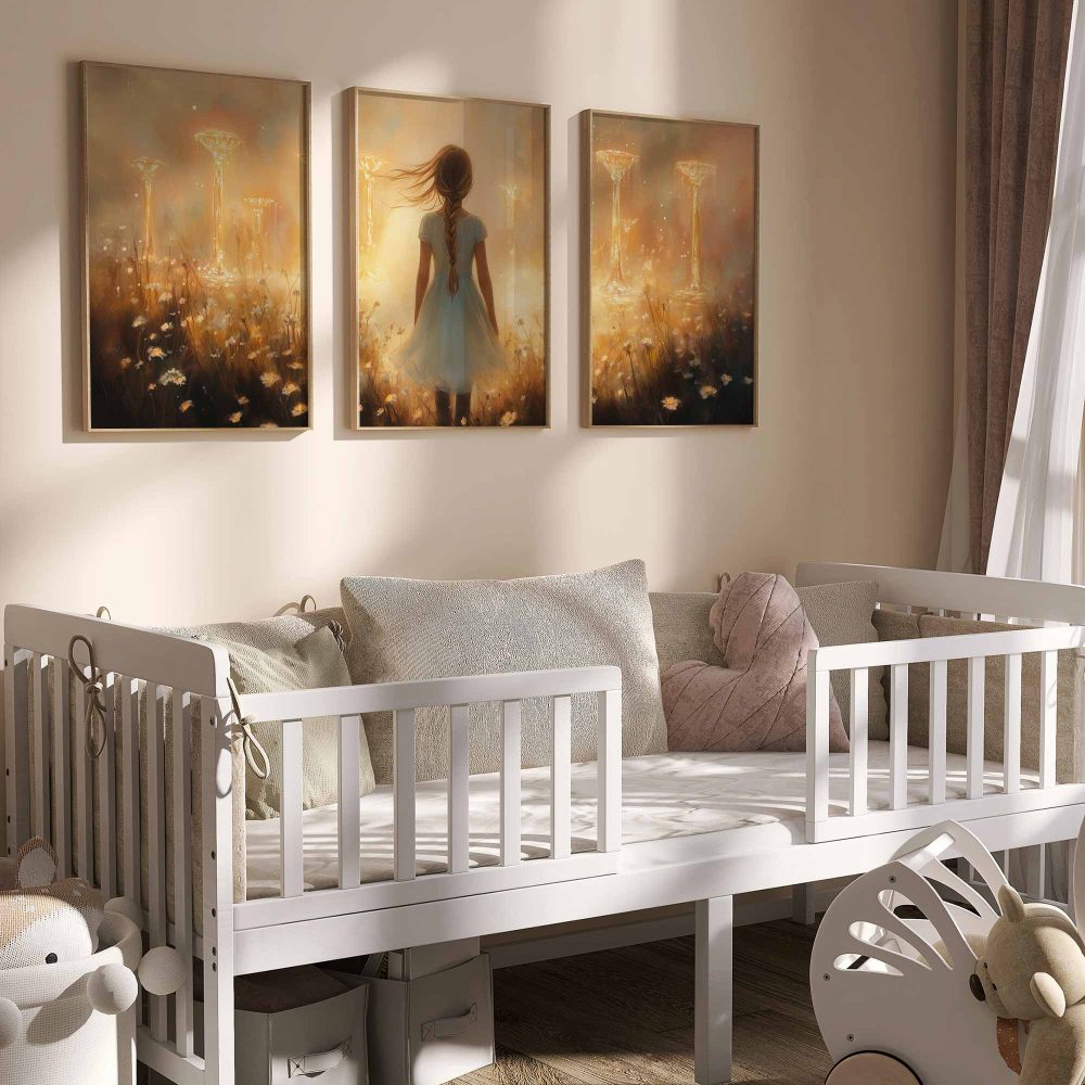 Terug naar collectie / Kinderkamer posters / Bloemen posters / Dromerig Meisje in Bloemenveld – Warme Zonneschijn
