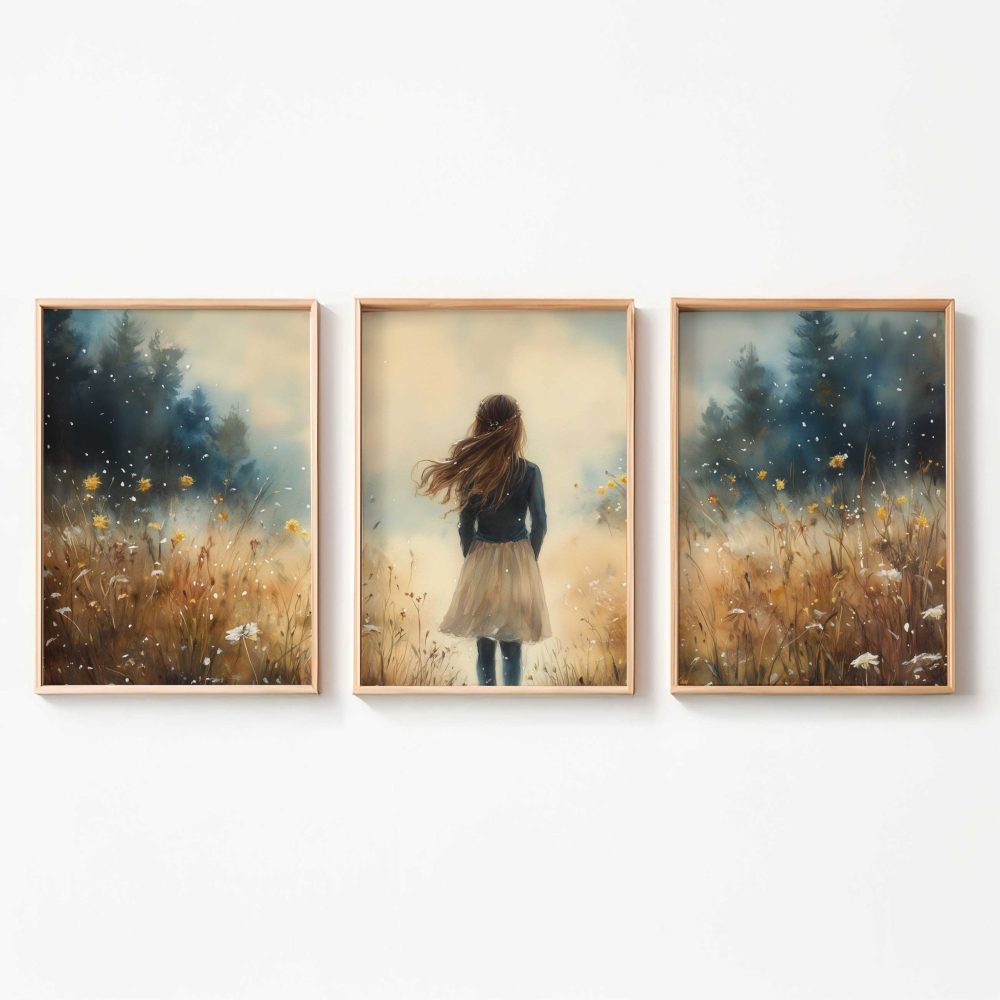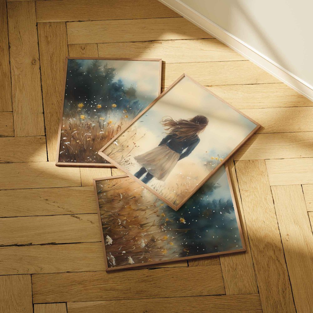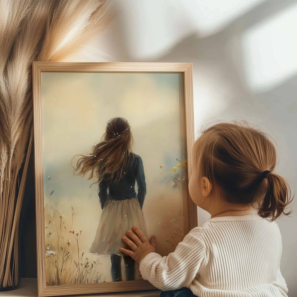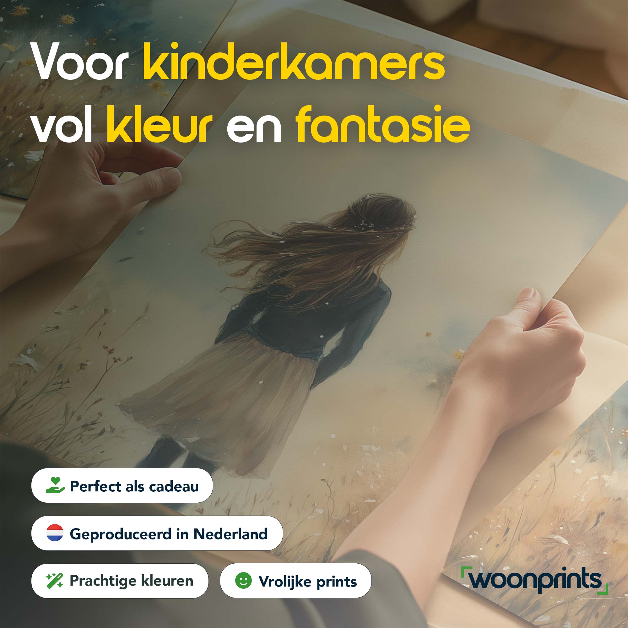 Terug naar collectie / Kinderkamer posters / Bloemen posters / Dromerig Meisje in Bloemenveld – Zachte Aardetinten
