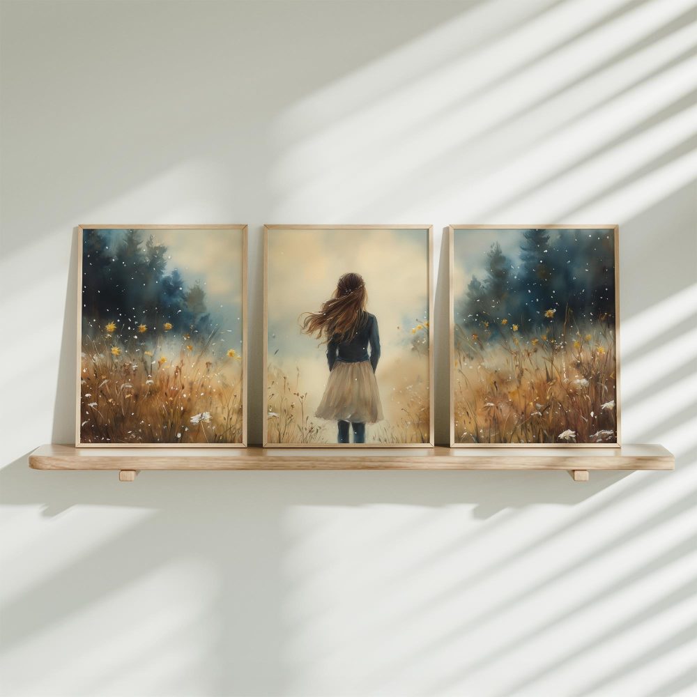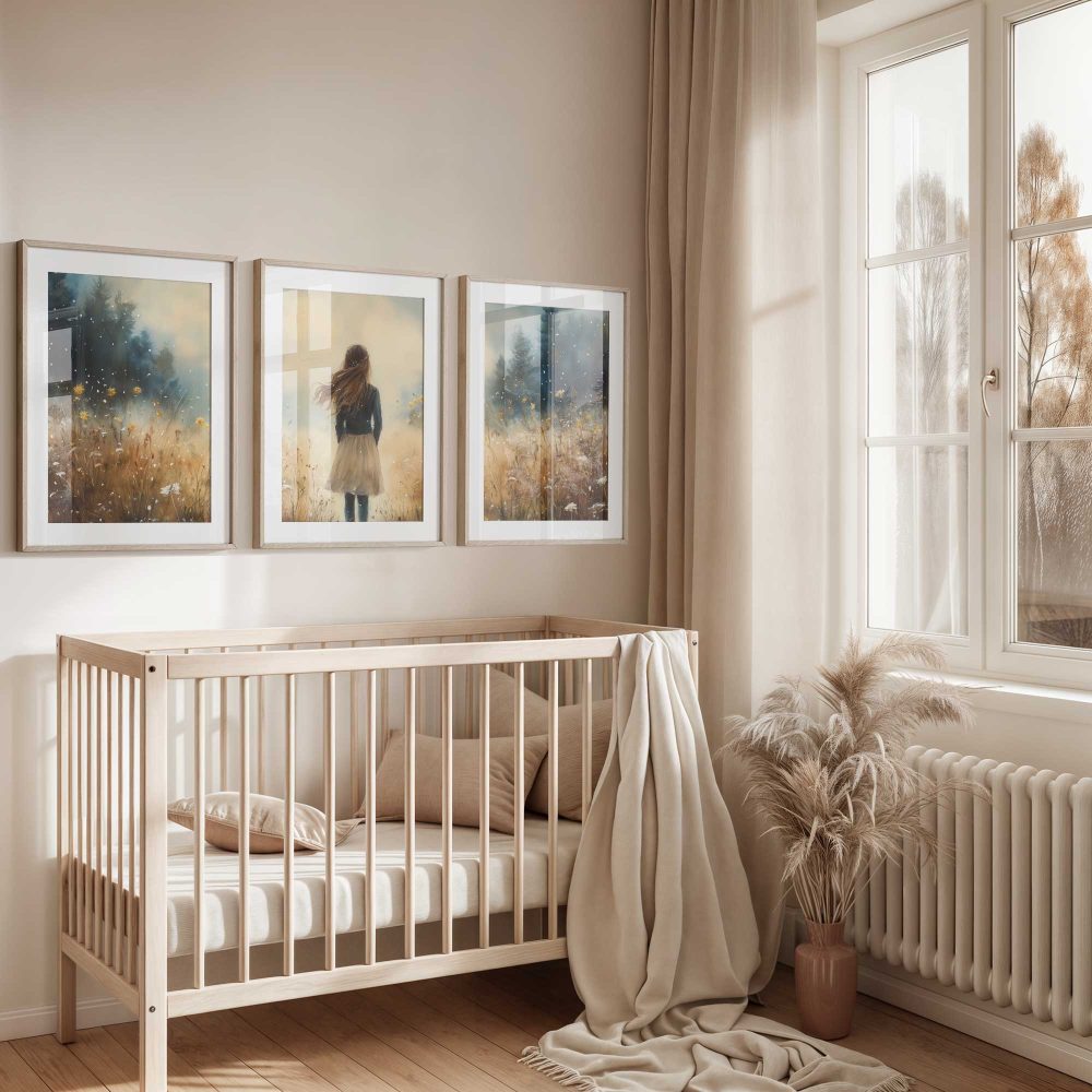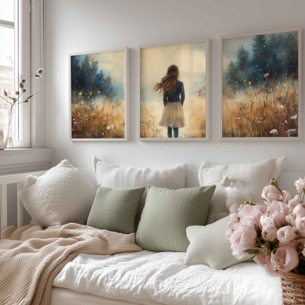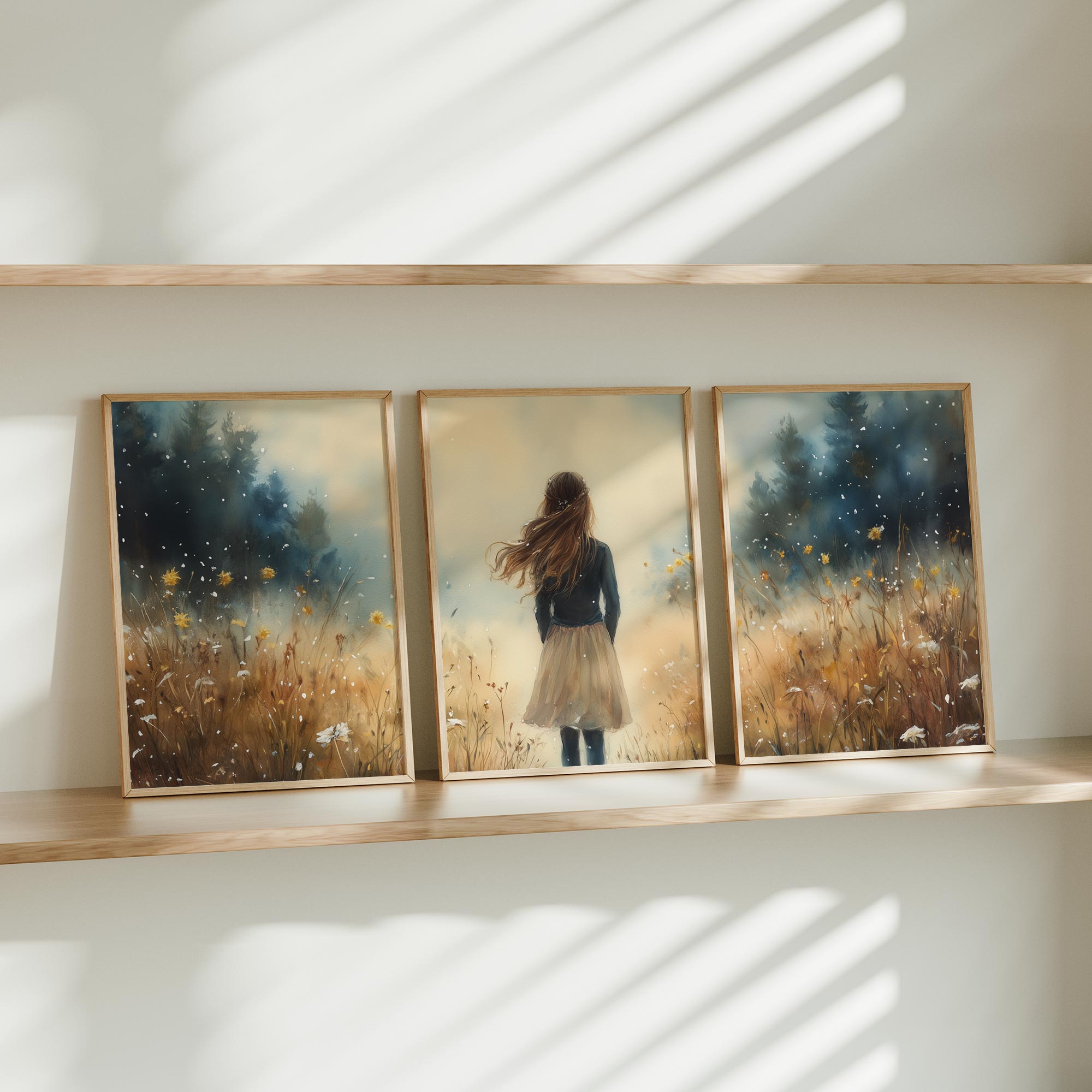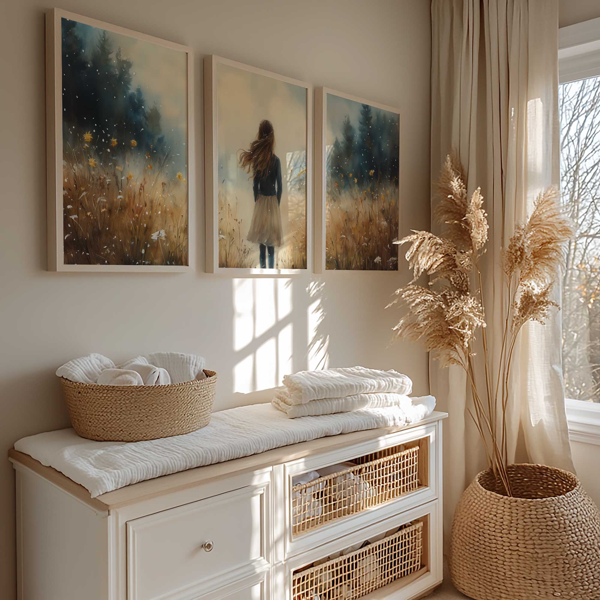 Terug naar collectie / Kinderkamer posters / Bloemen posters / Dromerig Meisje in Bloemenveld – Zachte Aardetinten