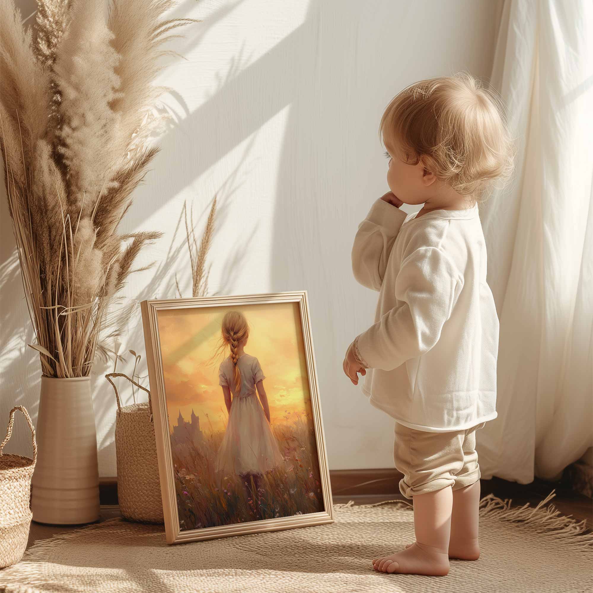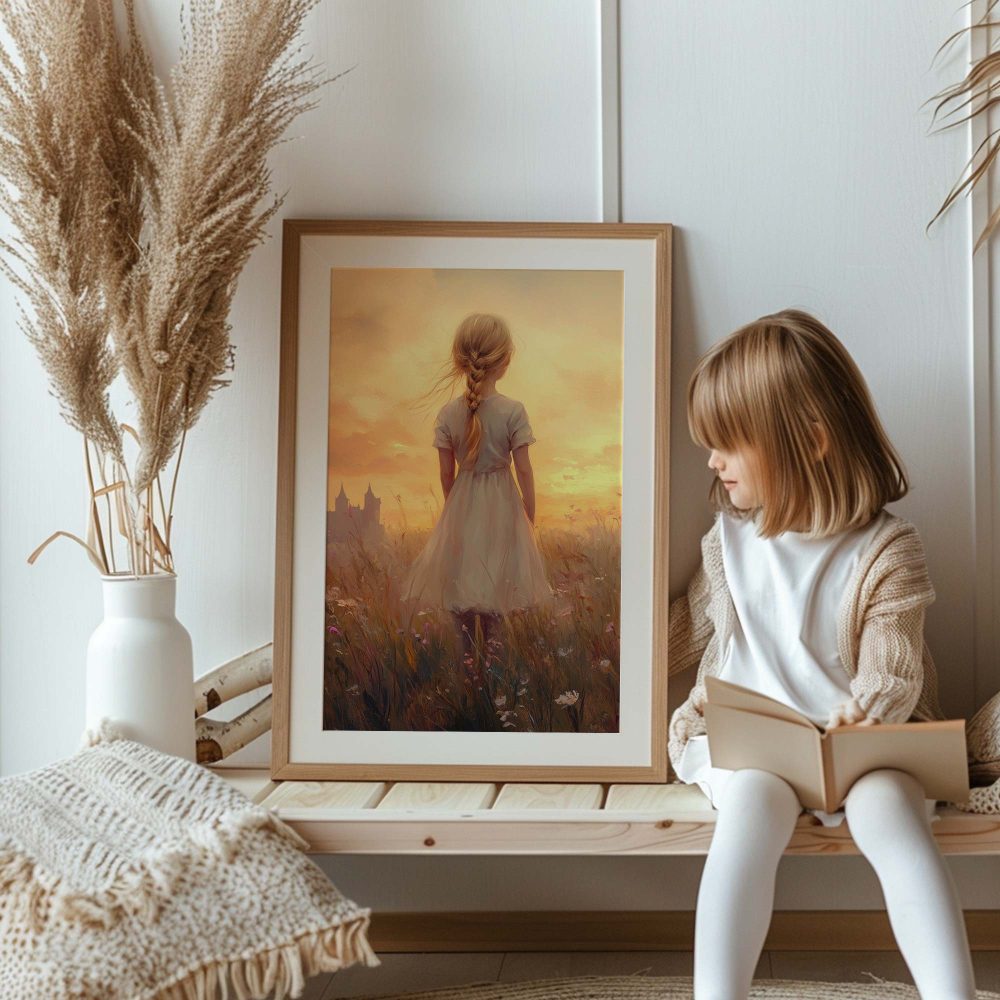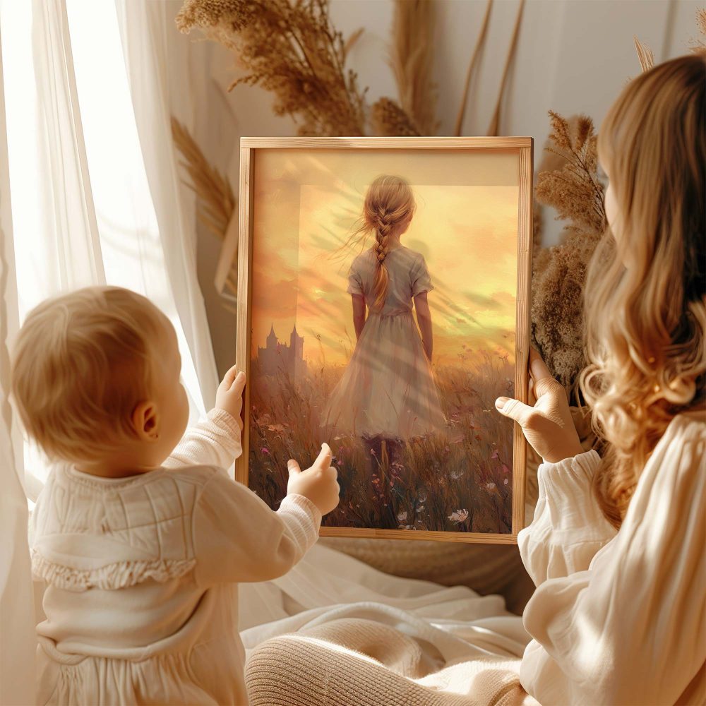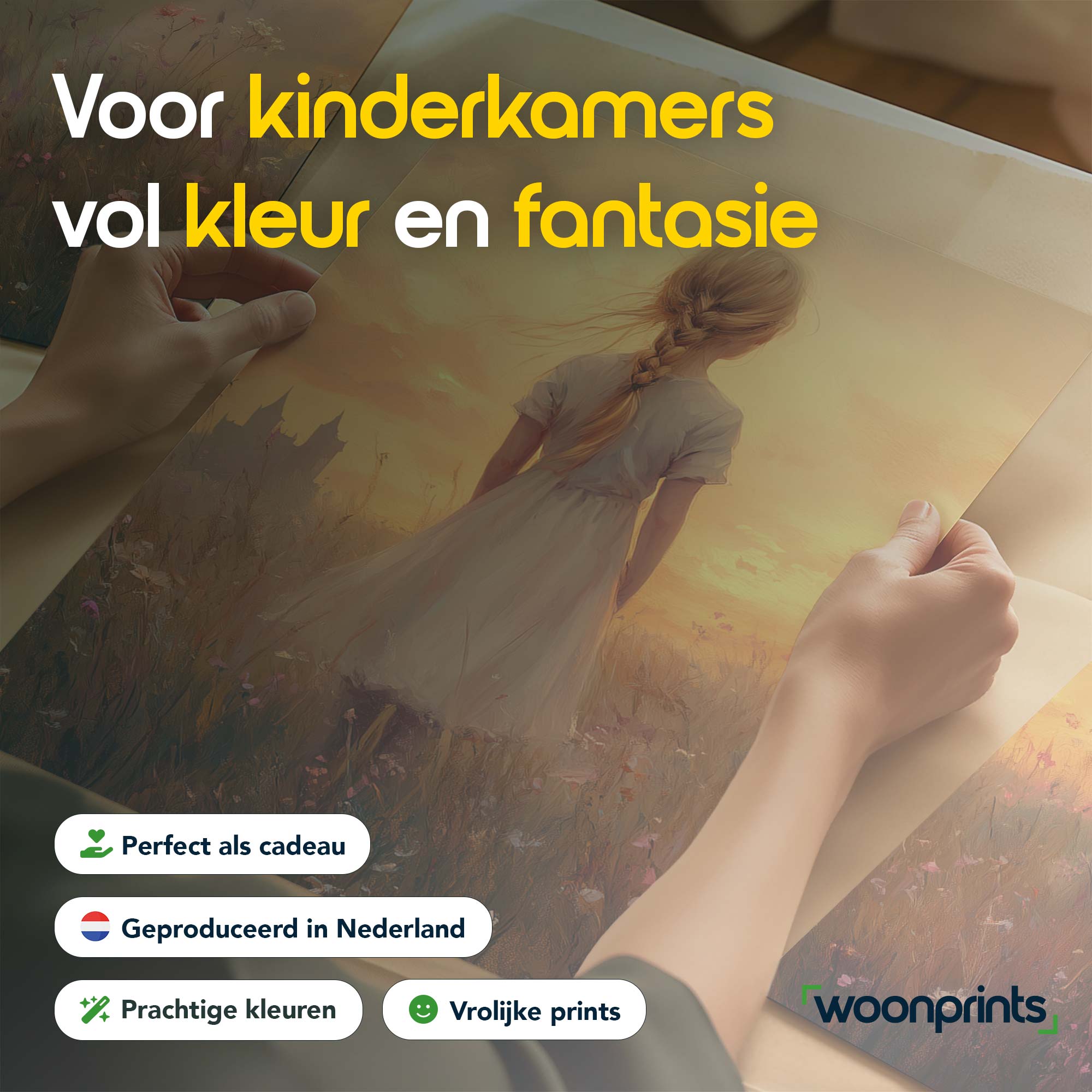 Terug naar collectie / Kinderkamer posters / Bloemen posters / Dromerig Meisje in Bloemenveld – Zachte Pastelkleuren