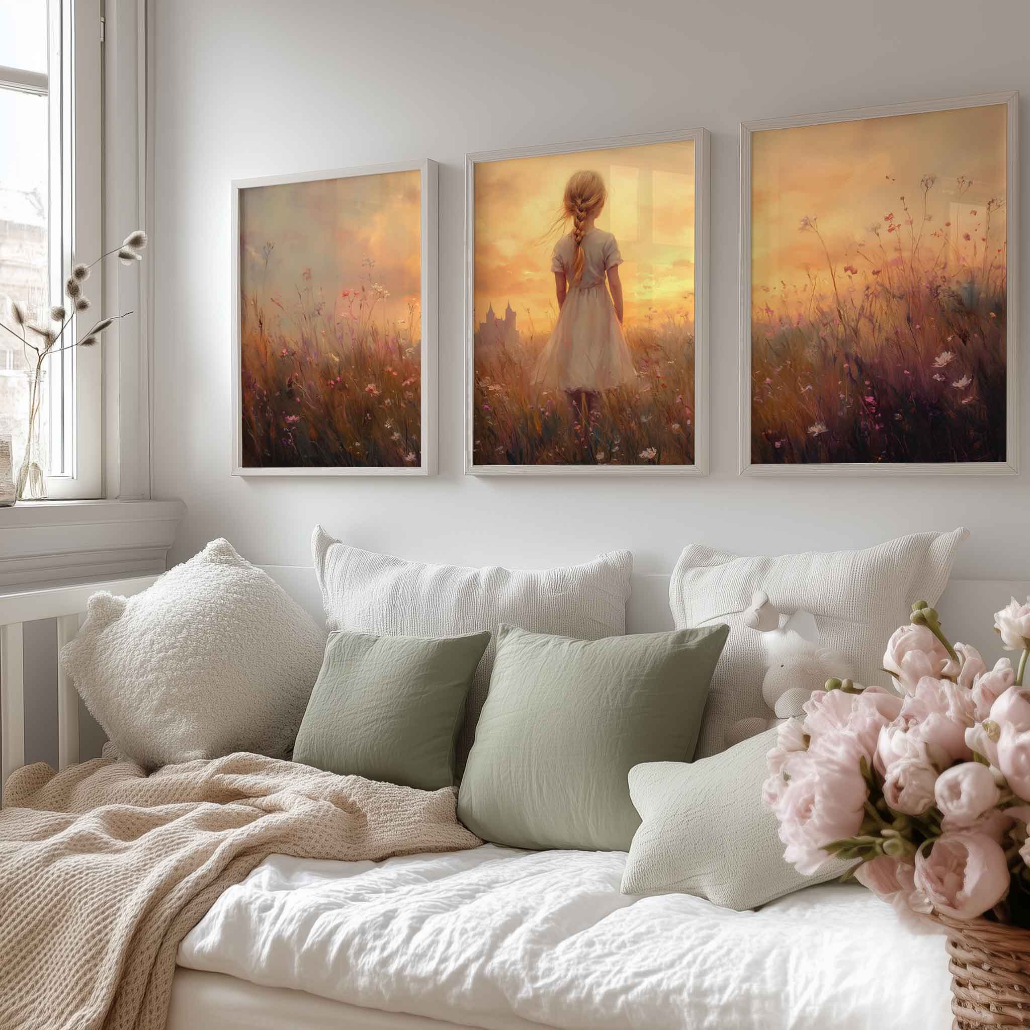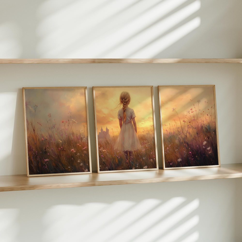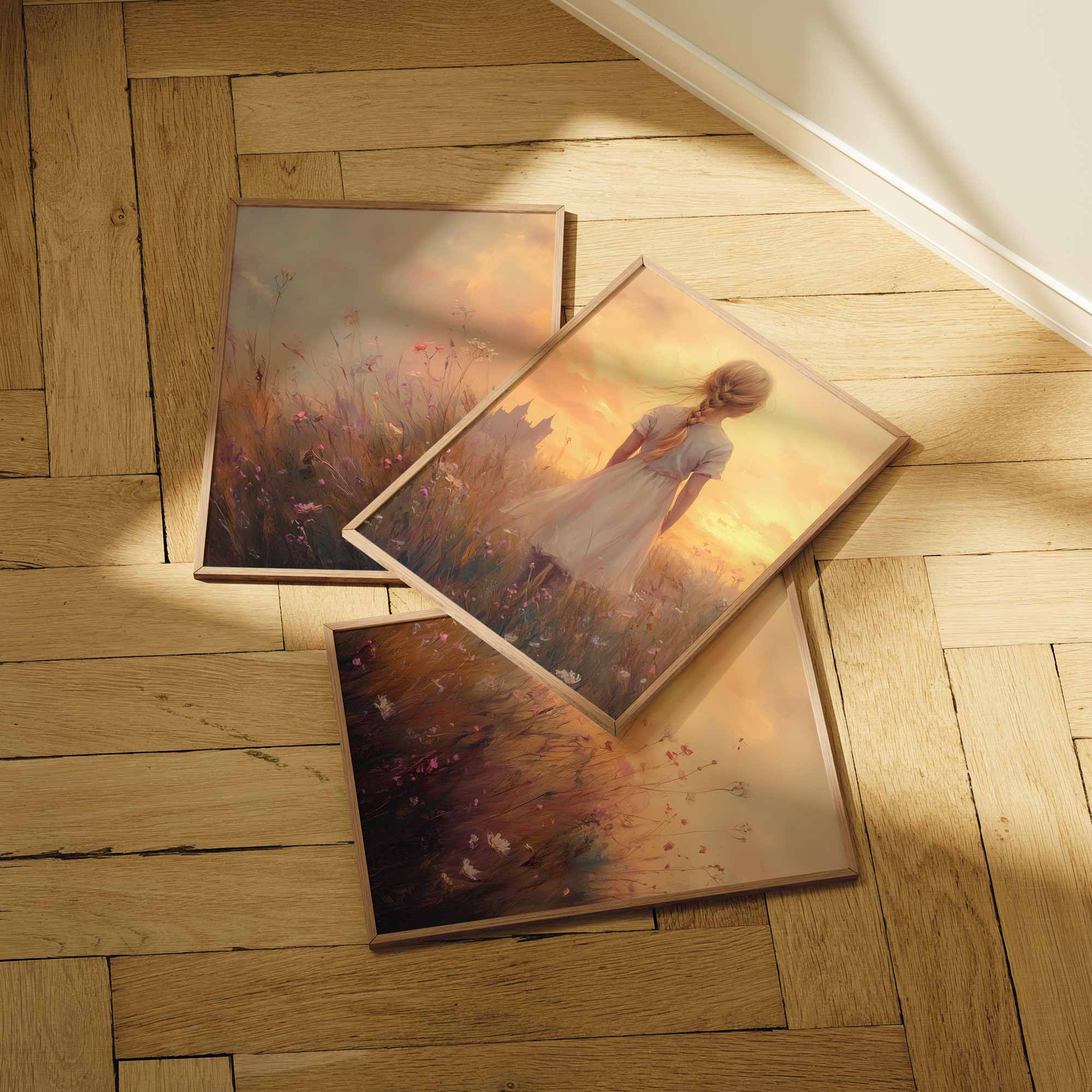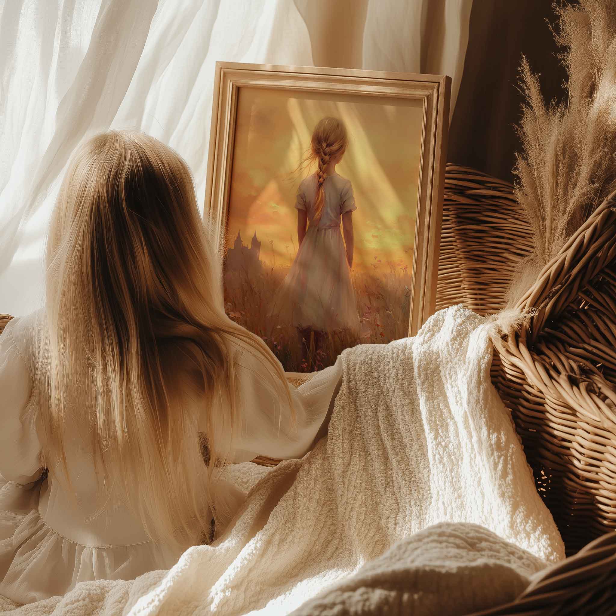 Terug naar collectie / Kinderkamer posters / Bloemen posters / Dromerig Meisje in Bloemenveld – Zachte Pastelkleuren