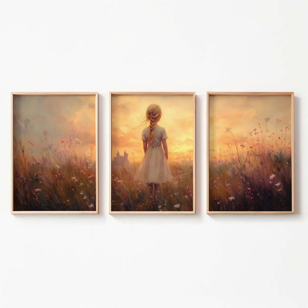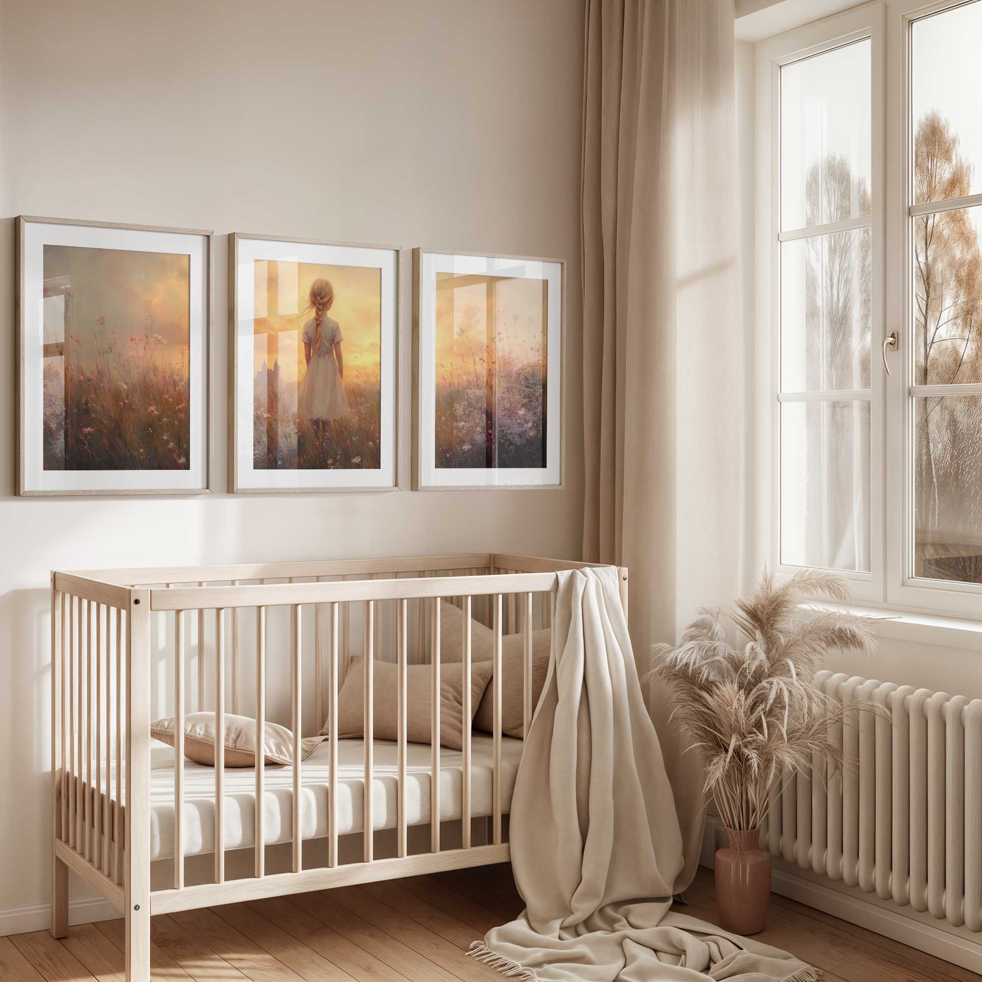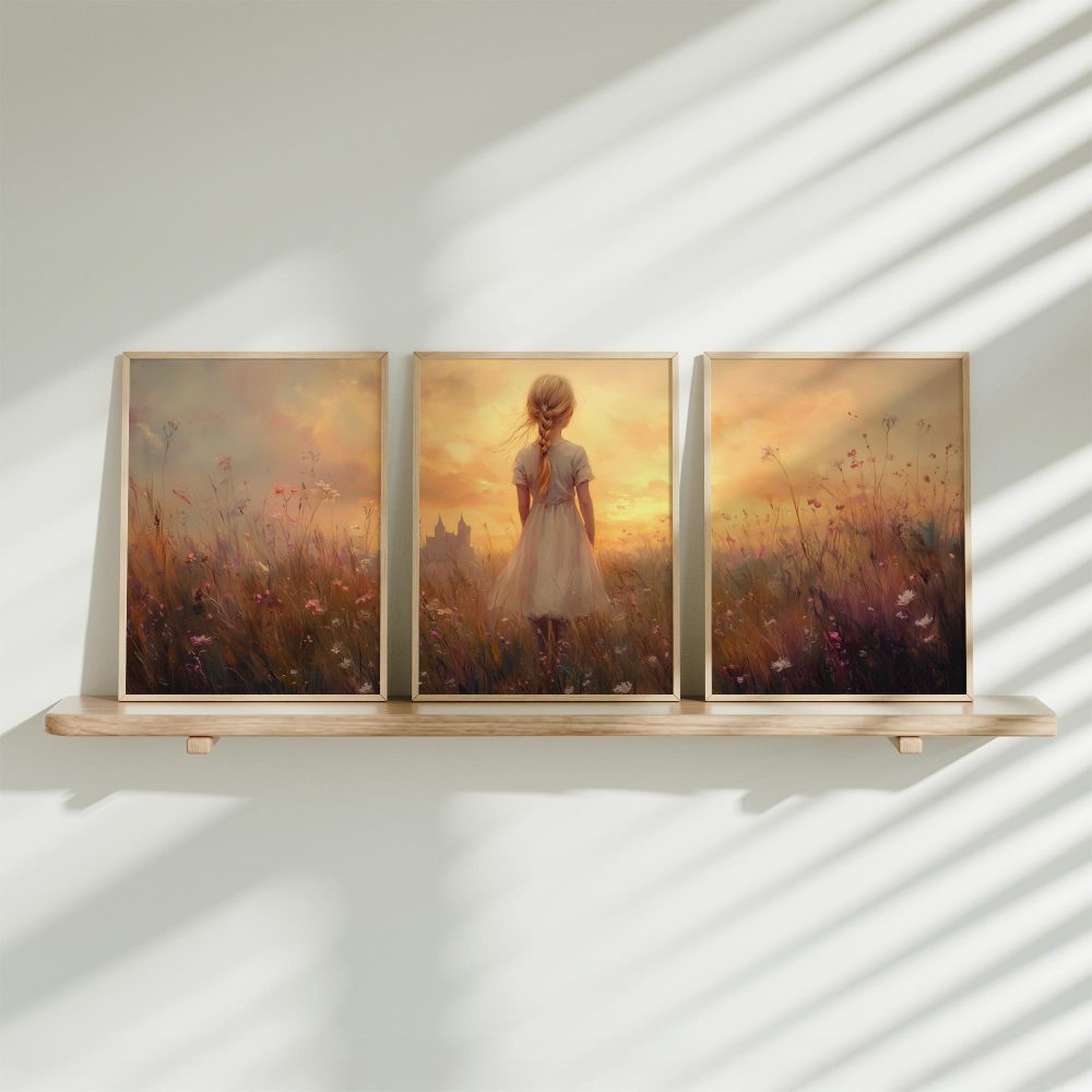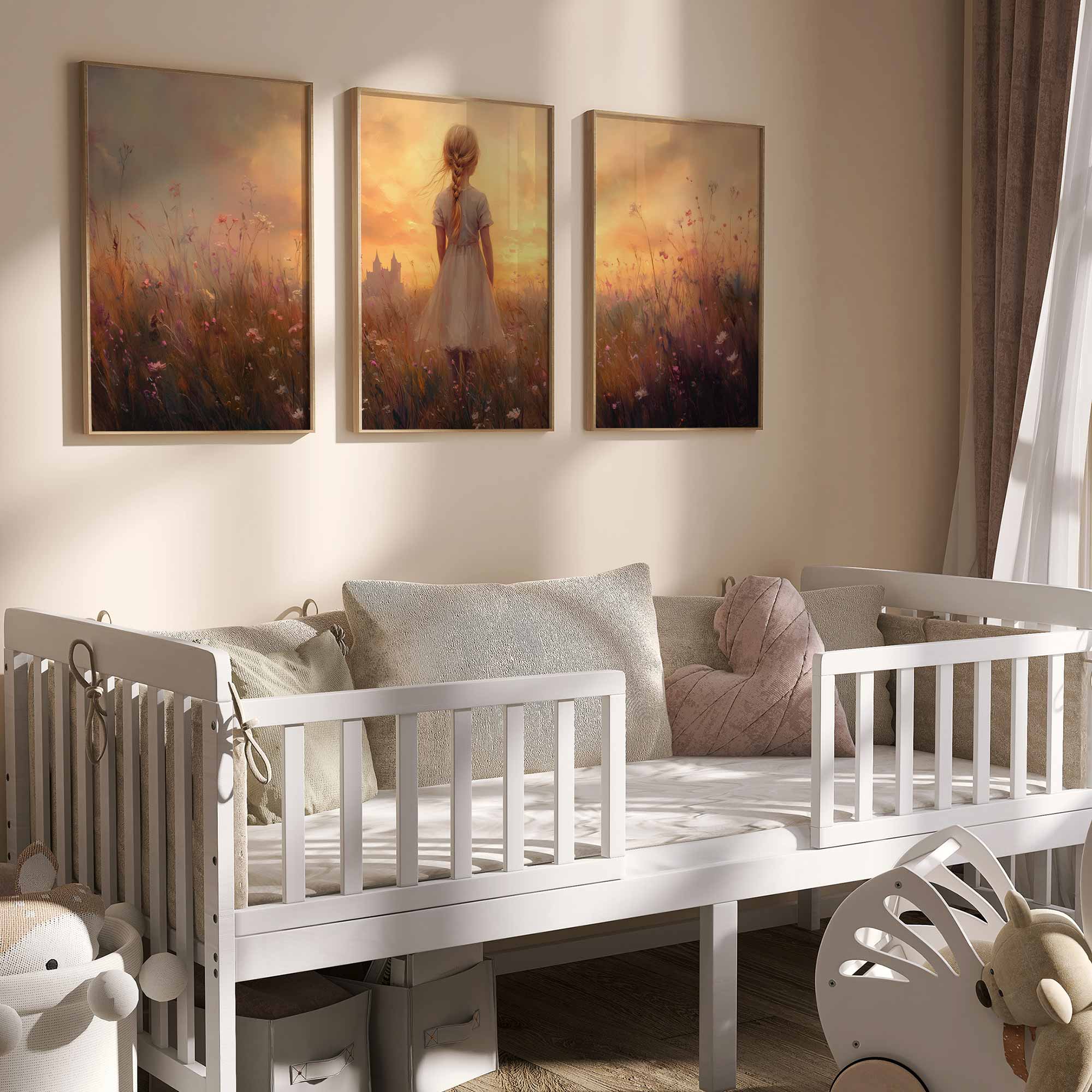 Terug naar collectie / Kinderkamer posters / Bloemen posters / Dromerig Meisje in Bloemenveld – Zachte Pastelkleuren