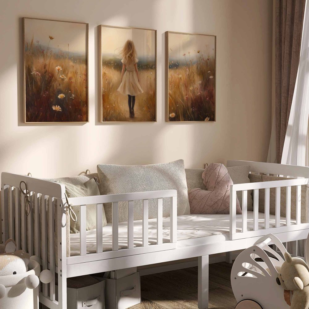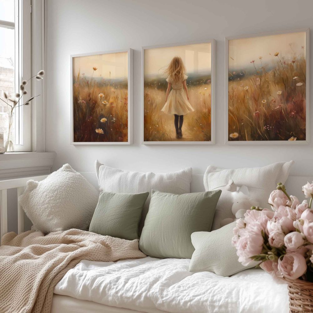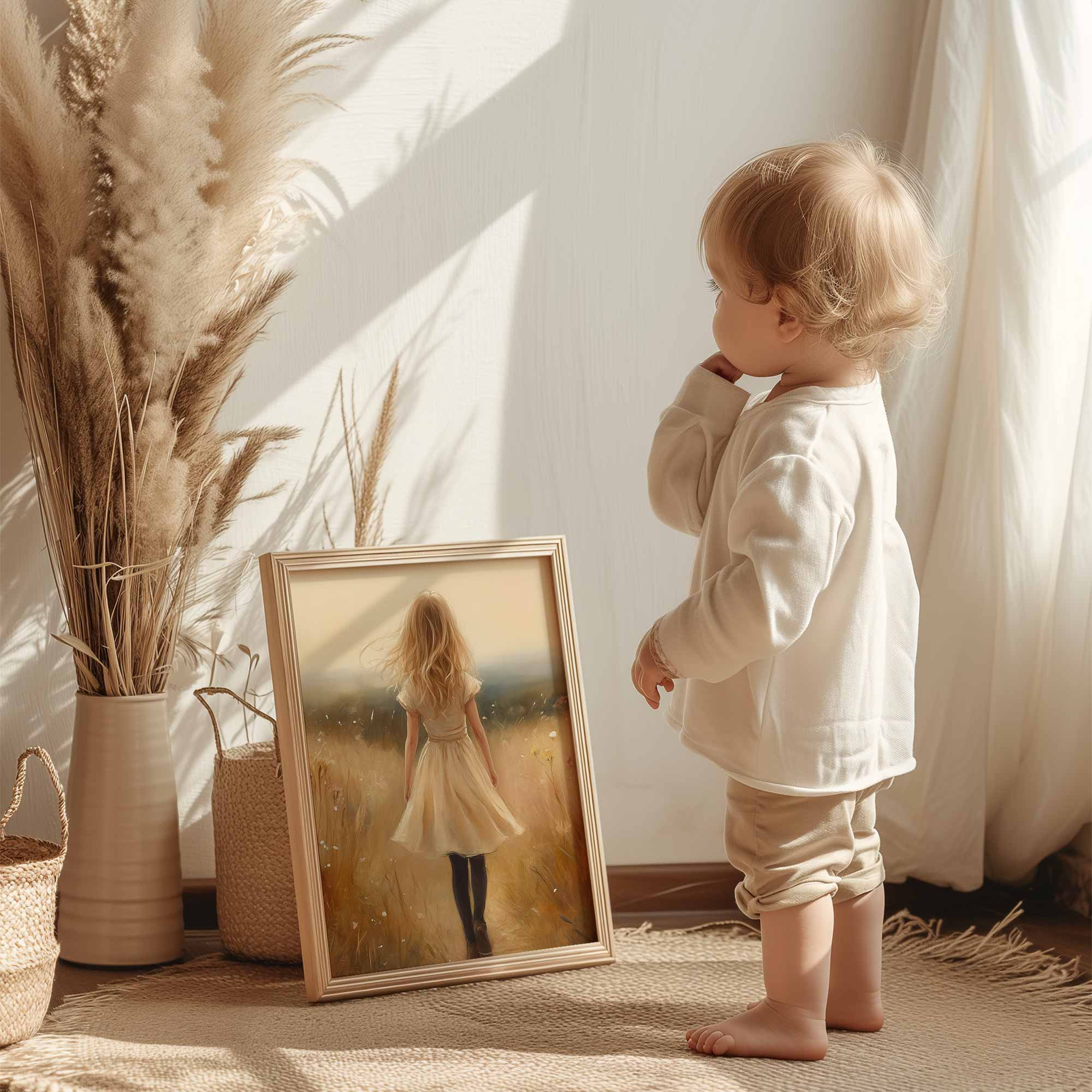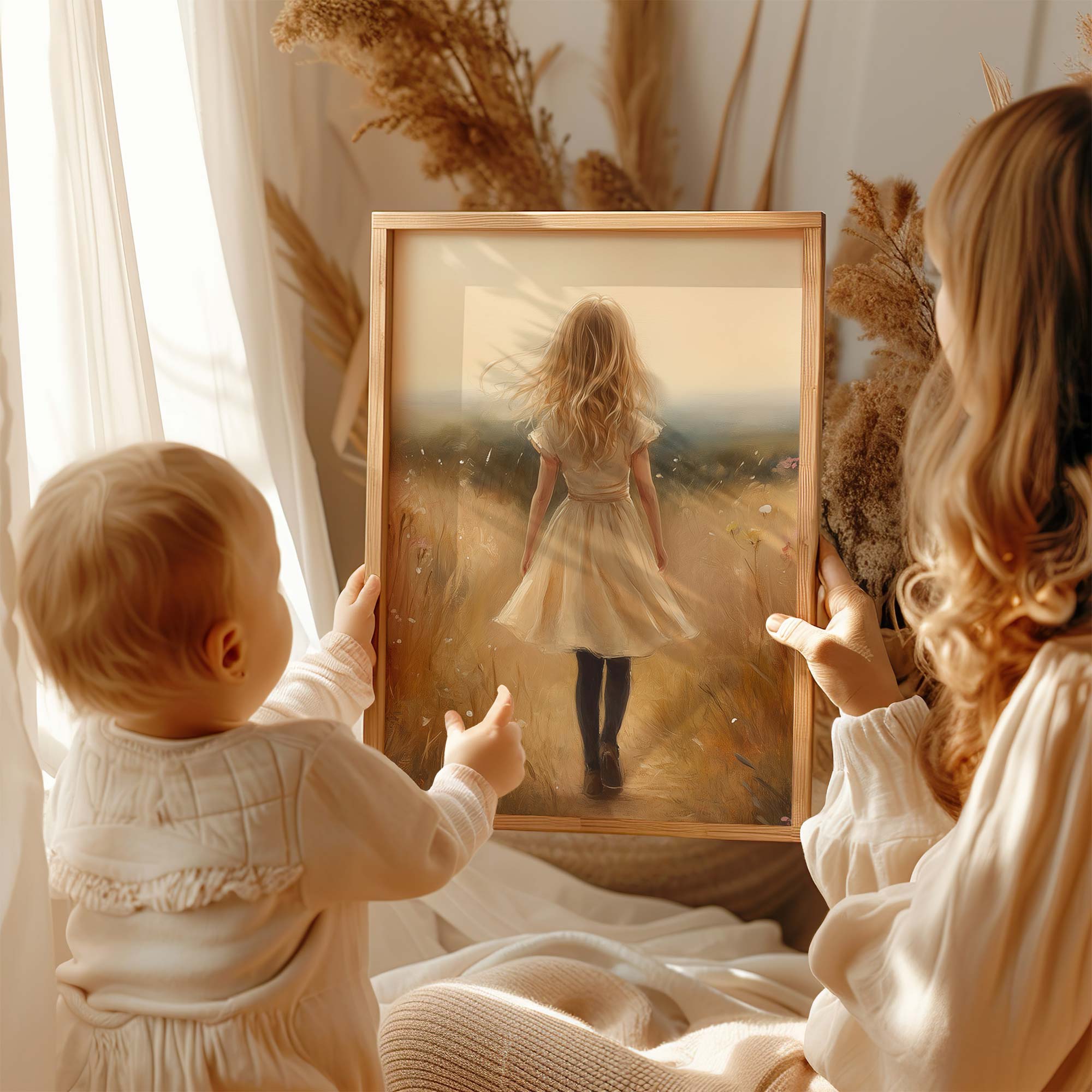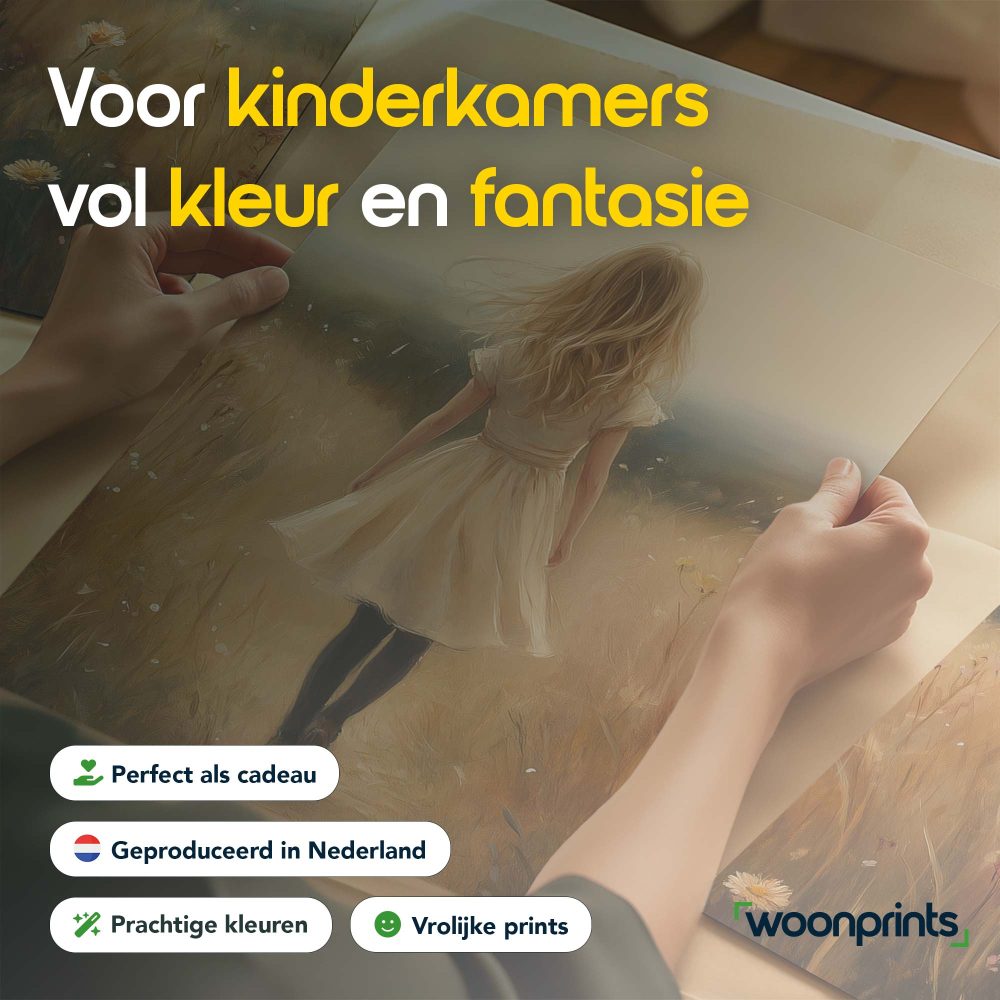 Terug naar collectie / Kinderkamer posters / Bloemen posters / Dromerig Meisje in Bloemenveld – Zachte Pastelkleuren