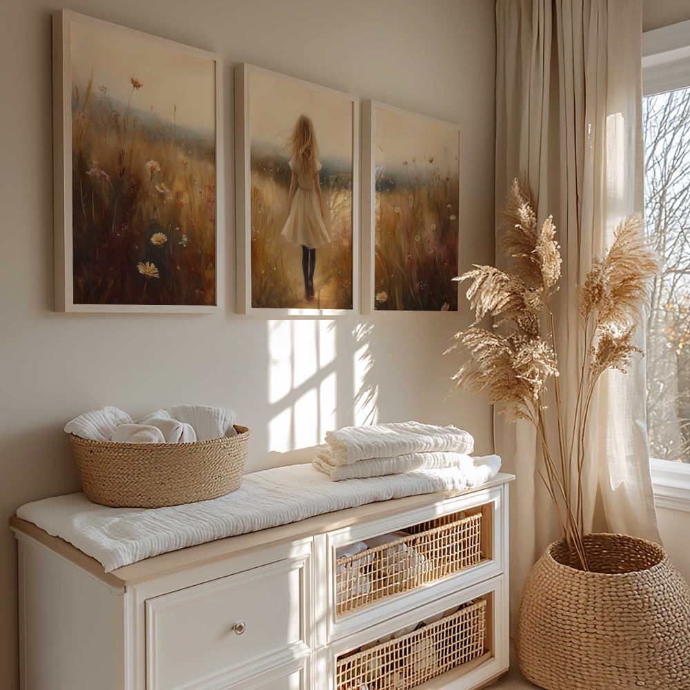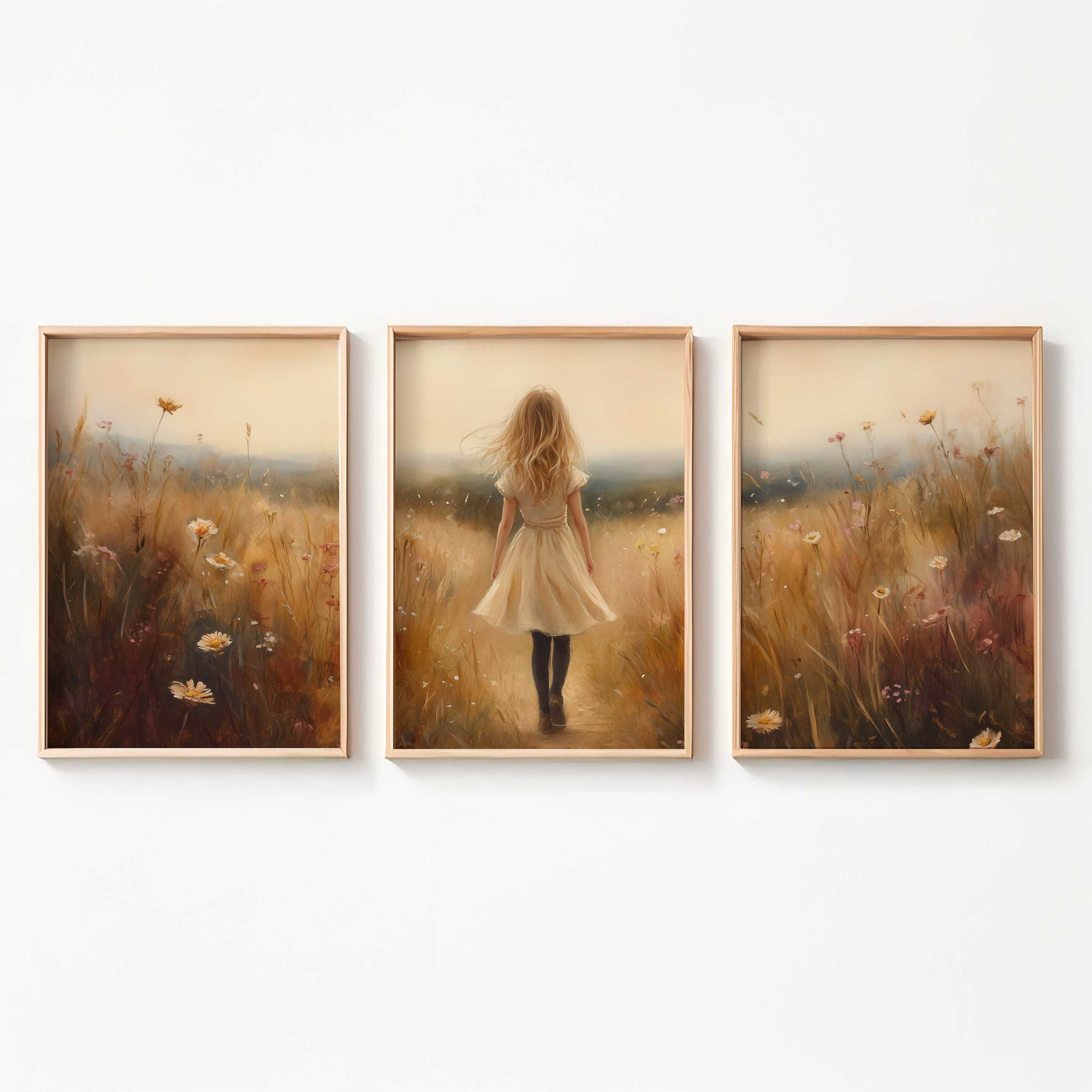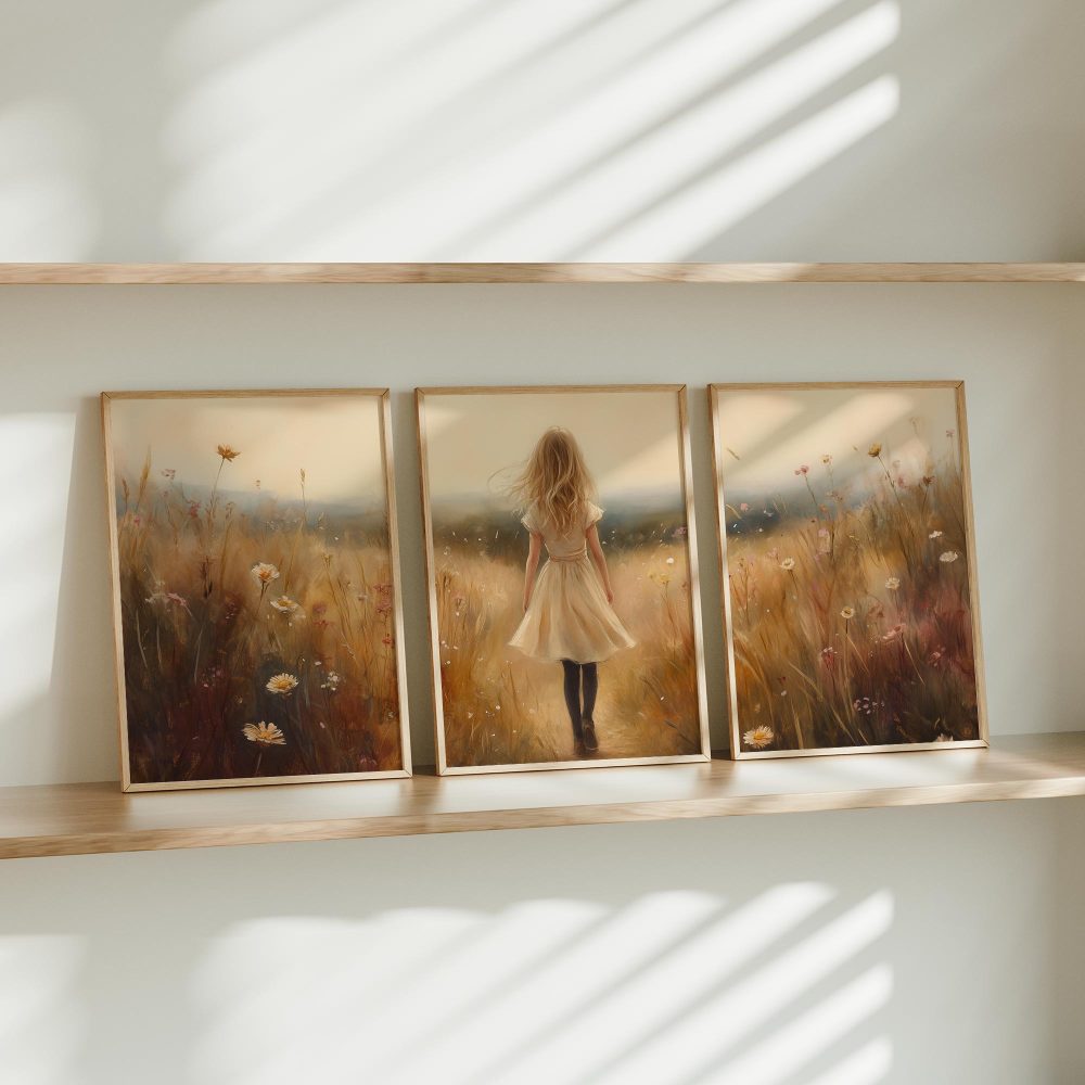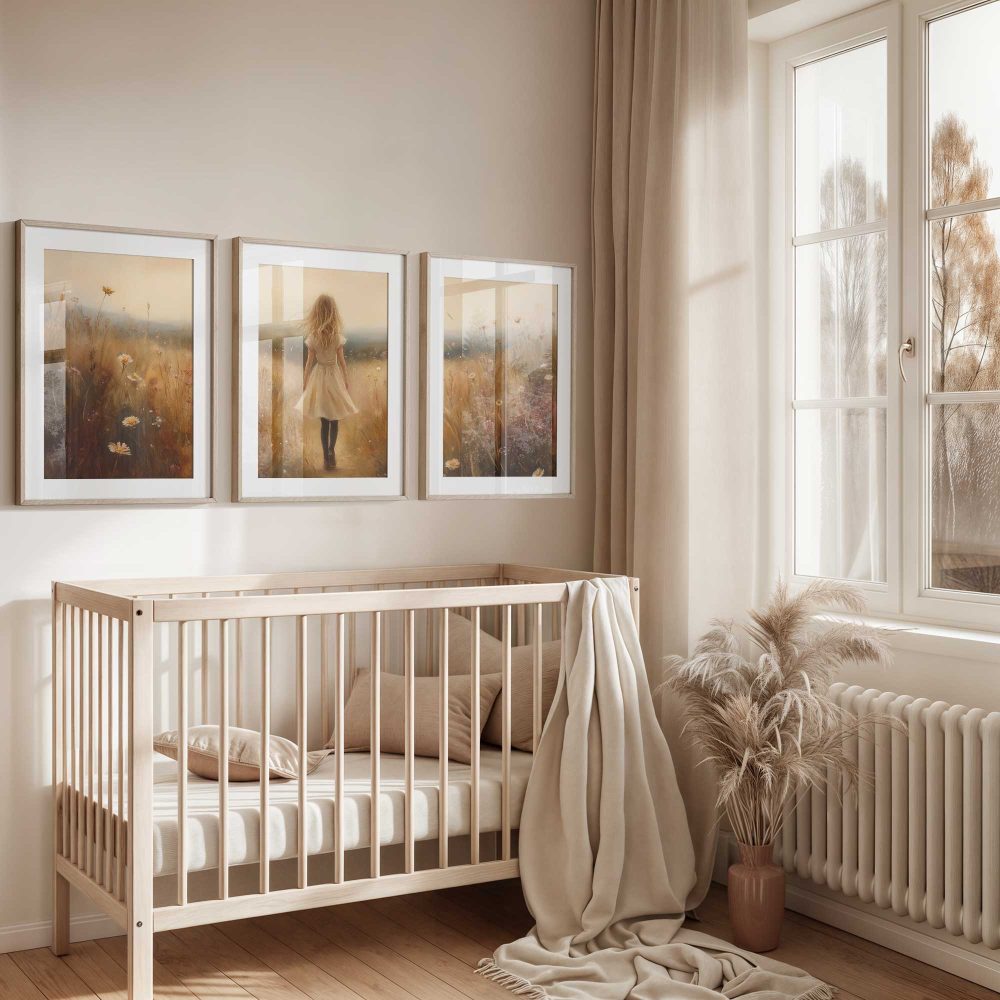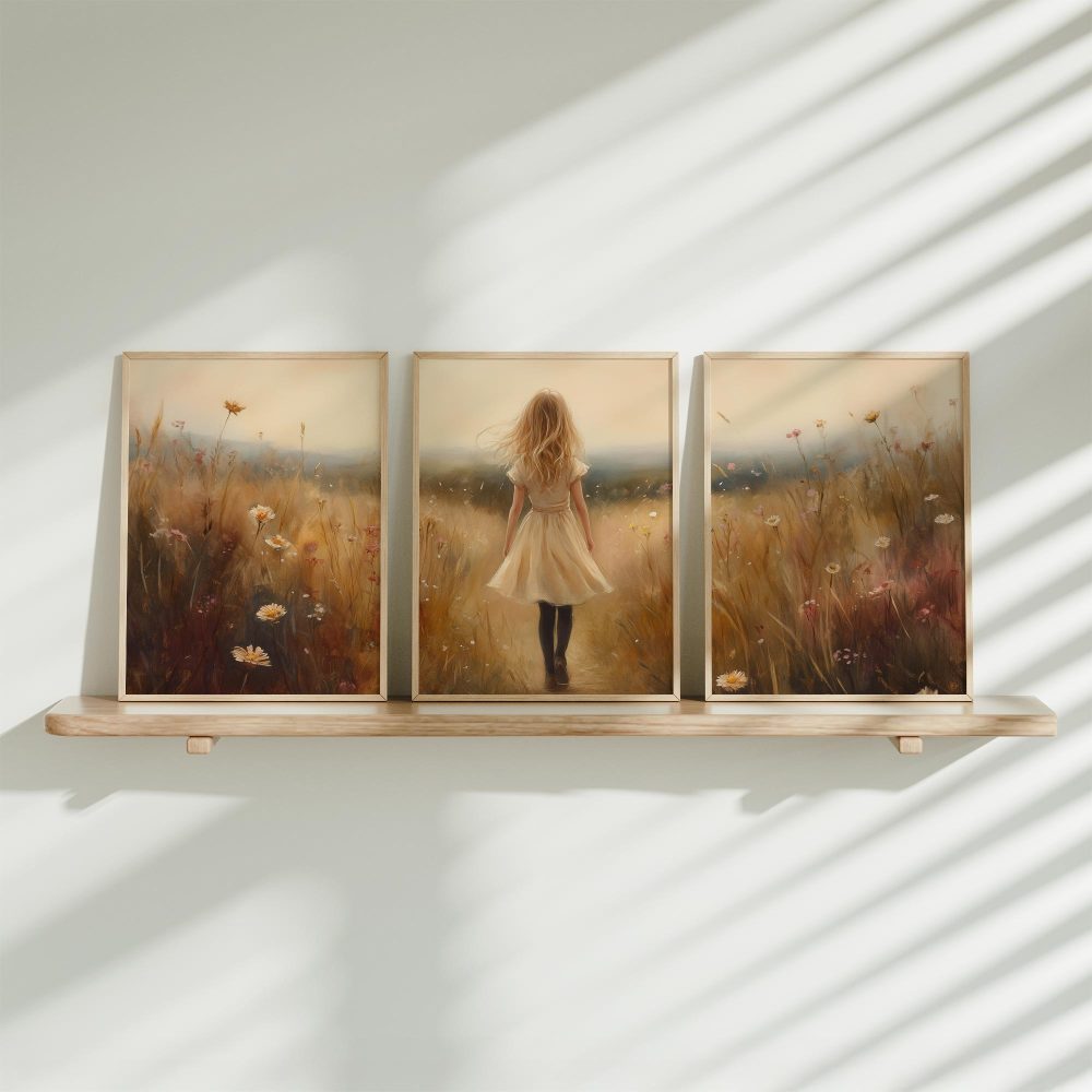 Terug naar collectie / Kinderkamer posters / Bloemen posters / Dromerig Meisje in Bloemenveld – Zachte Pastelkleuren