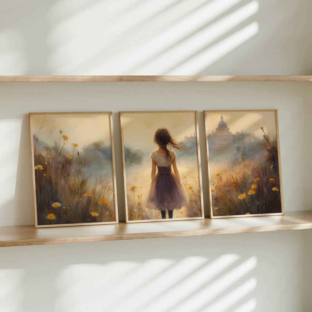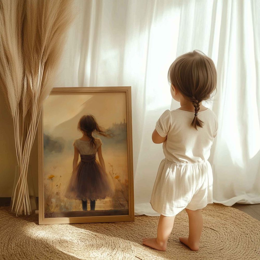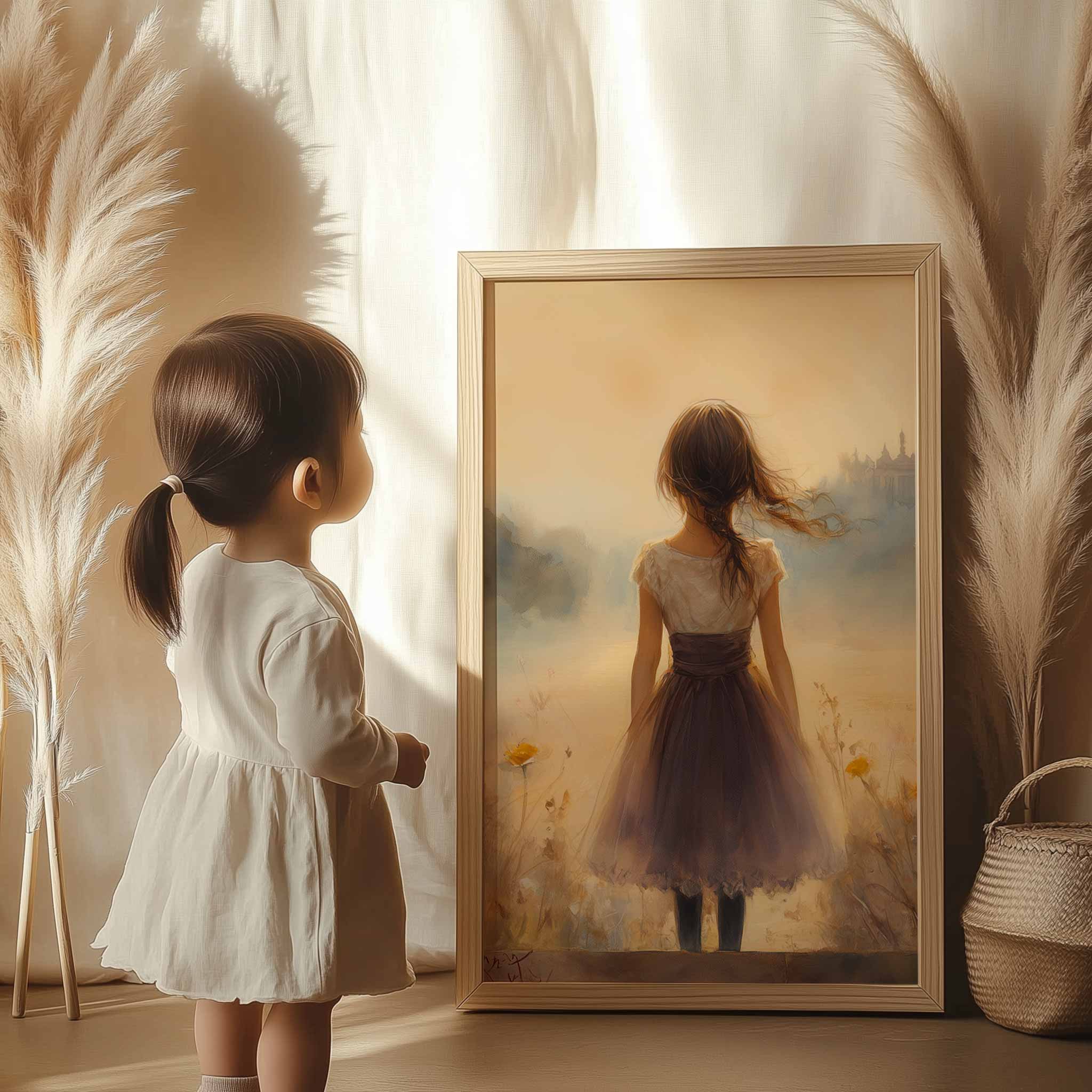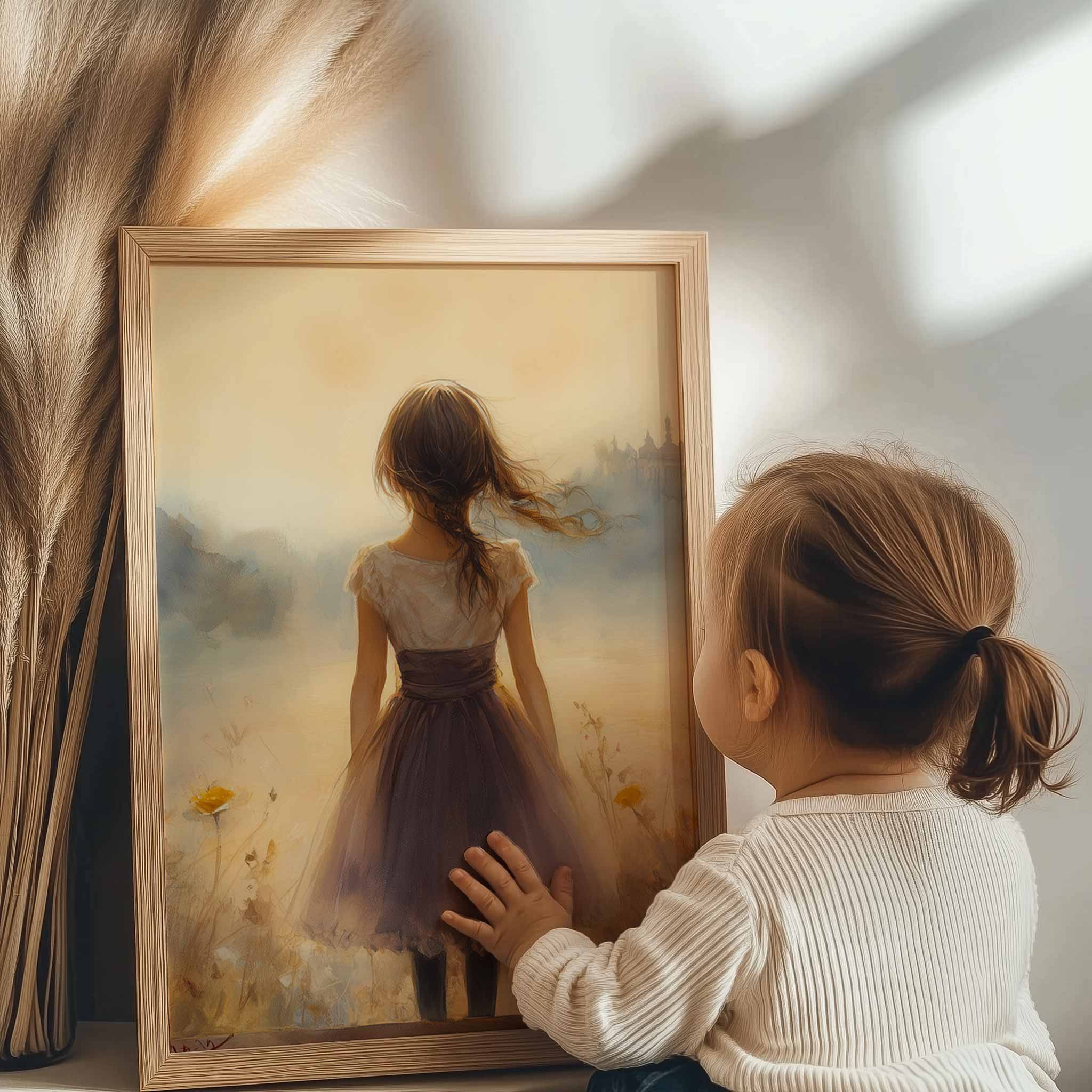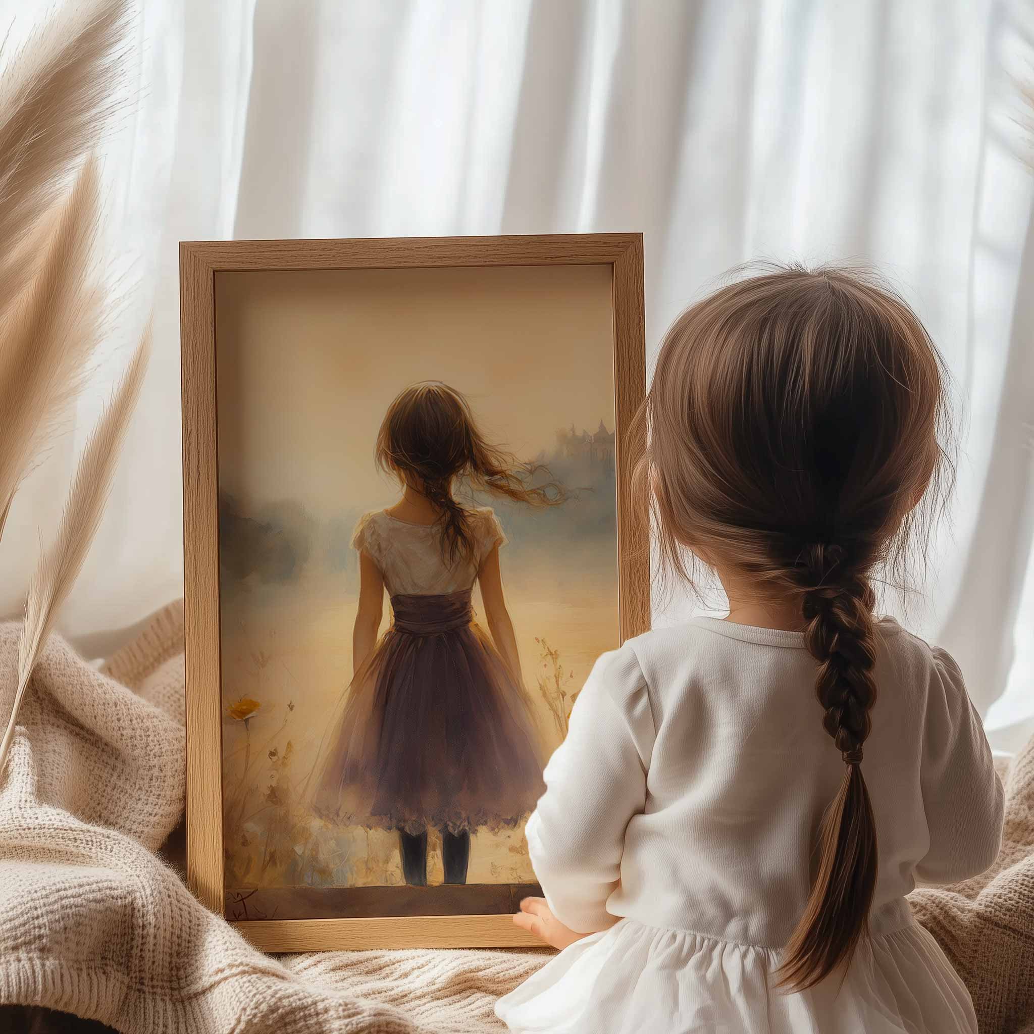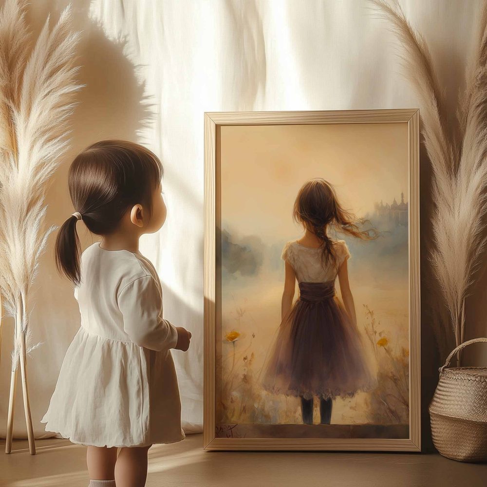 Dromerig Meisje in Bloemenveld – Zachte Sfeerprint