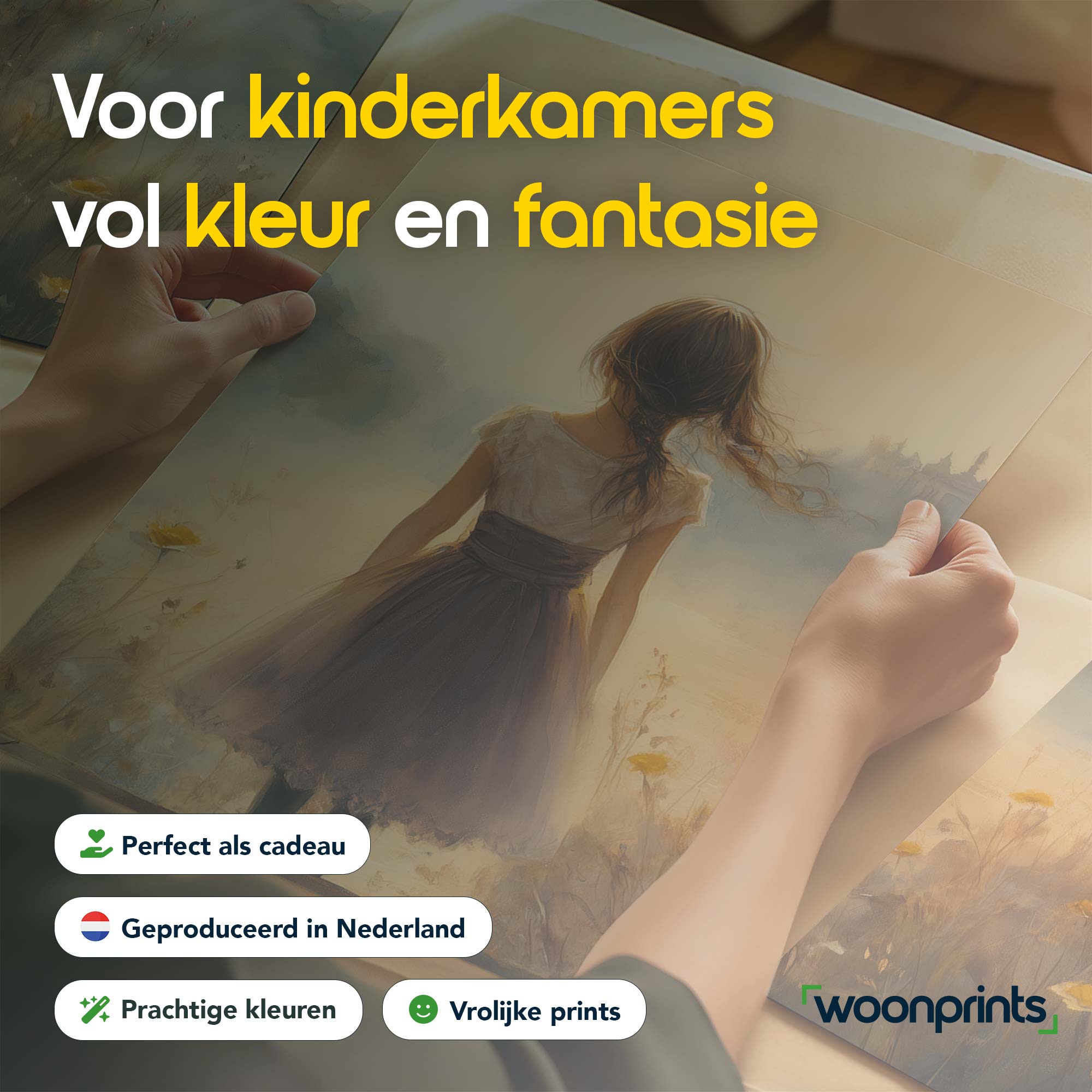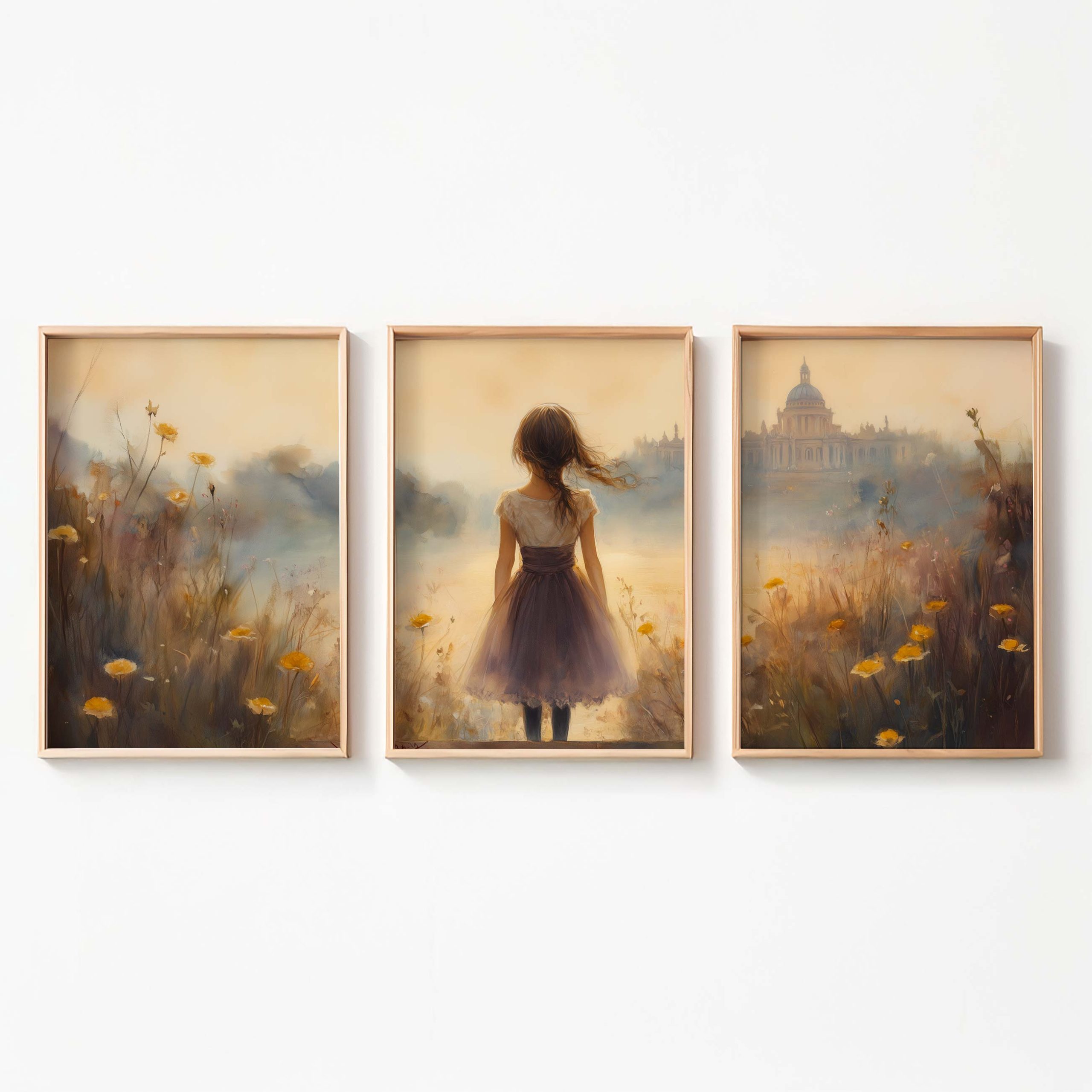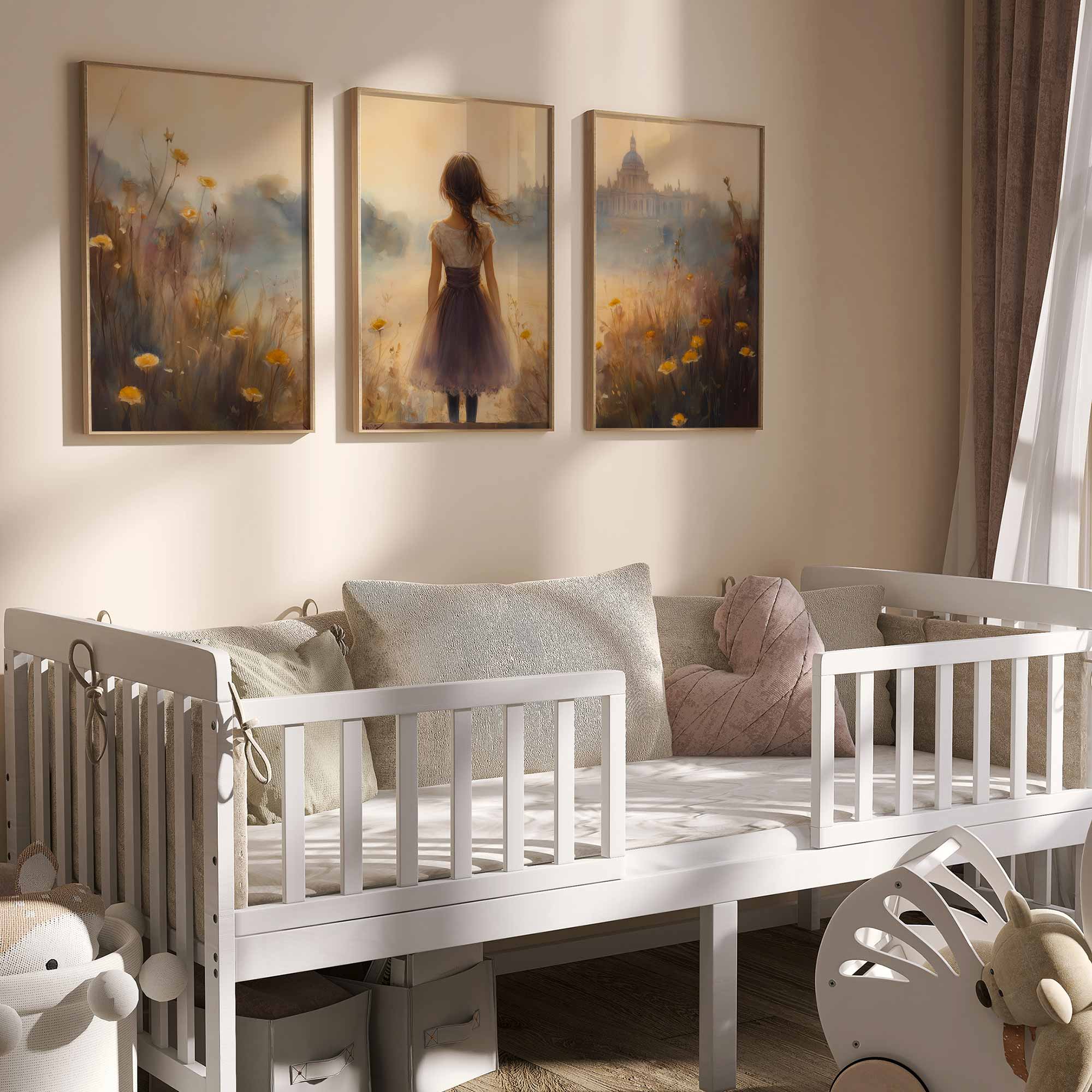 Terug naar collectie / Kinderkamer posters / Bloemen posters / Dromerig Meisje in Bloemenveld – Zachte Sfeerprint