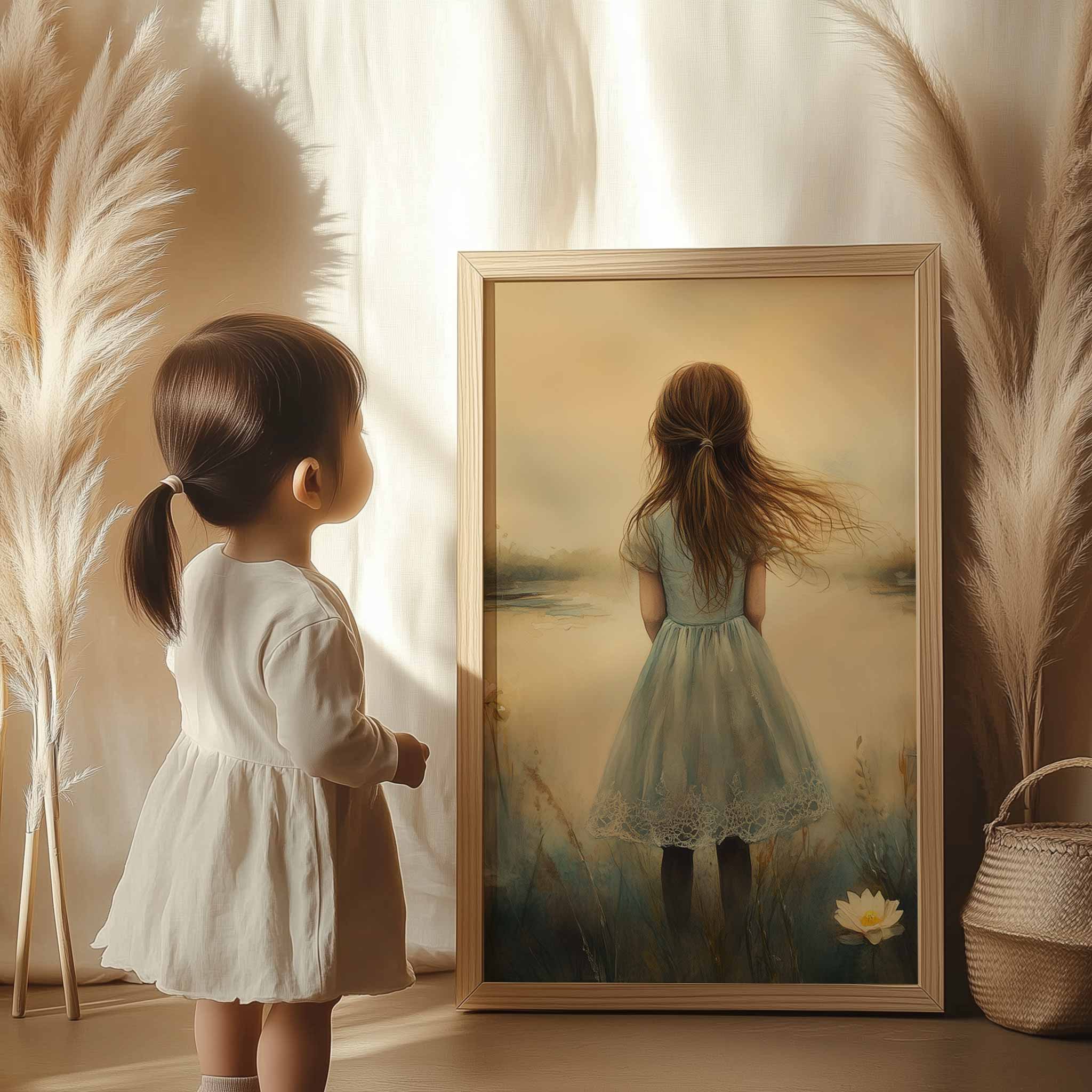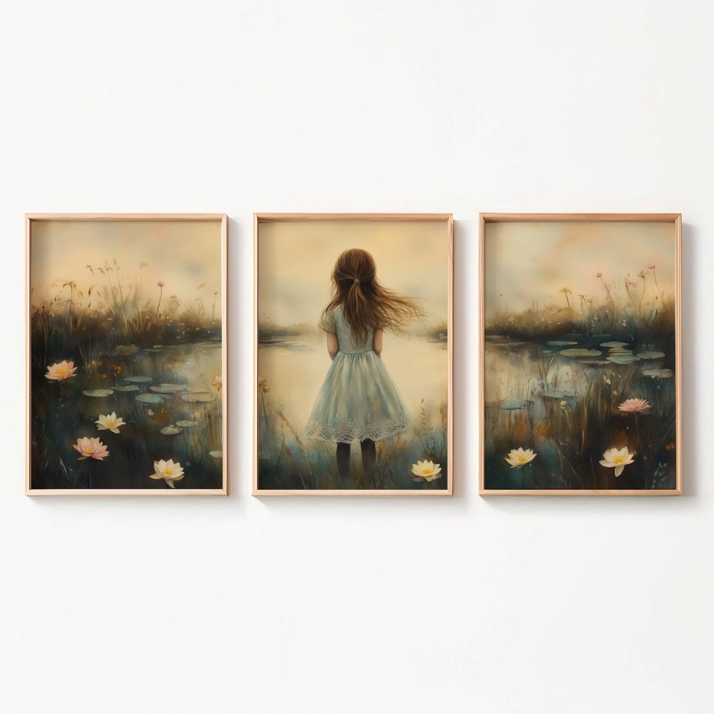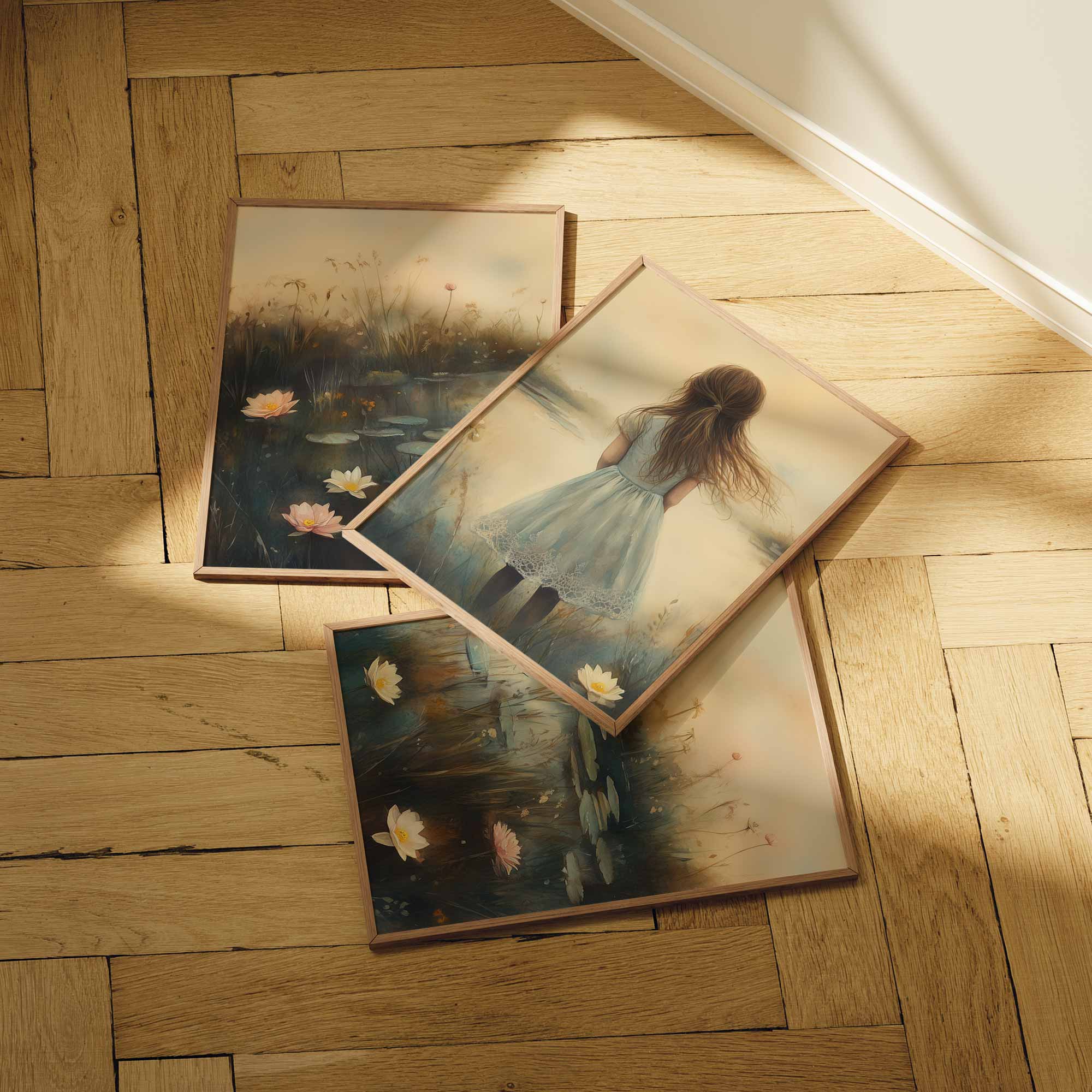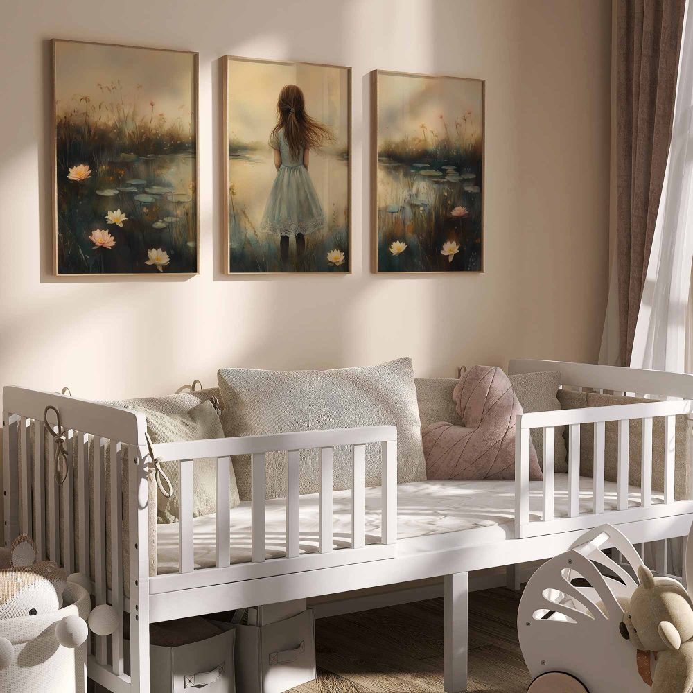 Terug naar collectie / Kinderkamer posters / Avontuurlijk posters / Dromerig Meisje in een Zee van Bloemen en Waterlelies