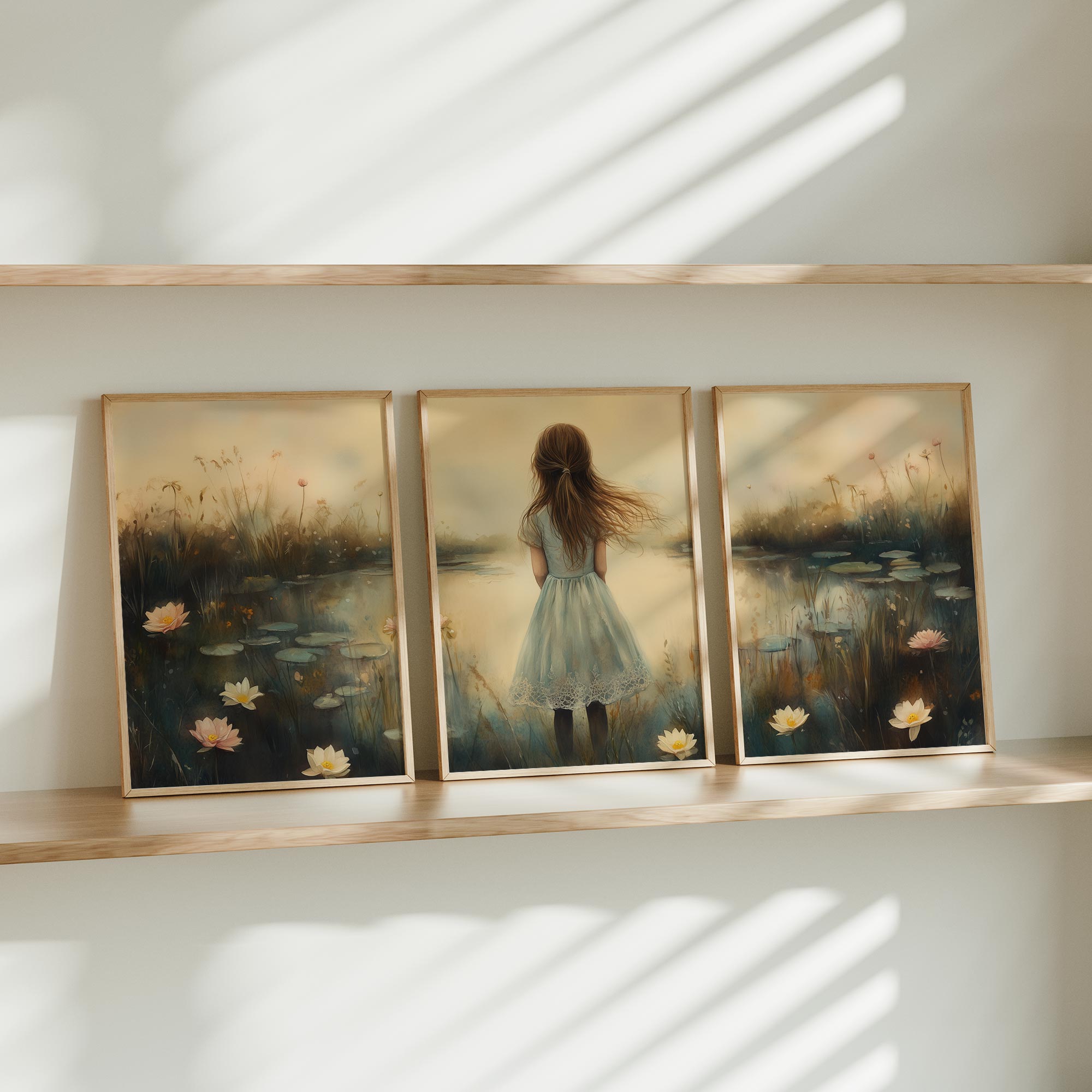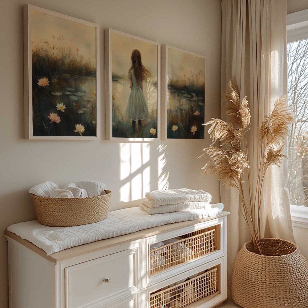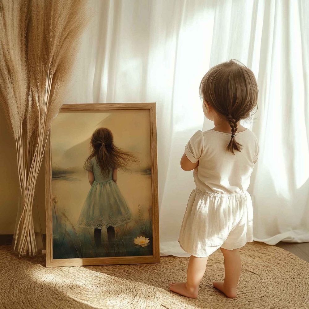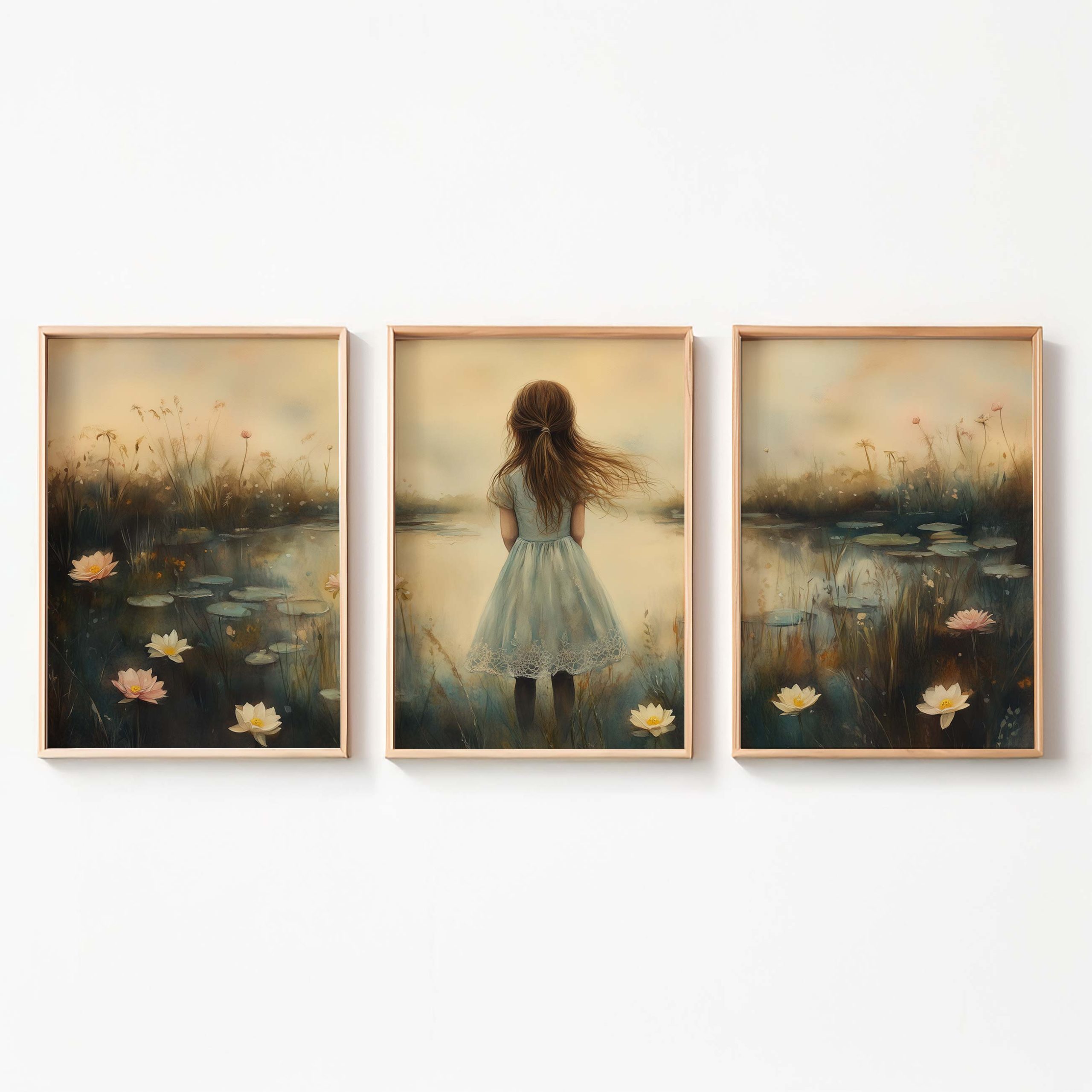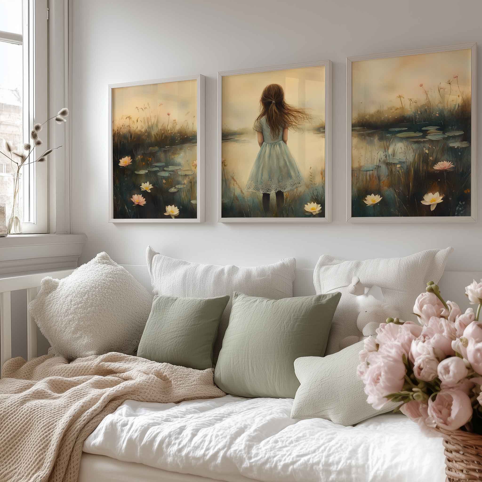 Terug naar collectie / Kinderkamer posters / Avontuurlijk posters / Dromerig Meisje in een Zee van Bloemen en Waterlelies