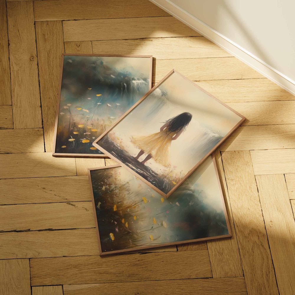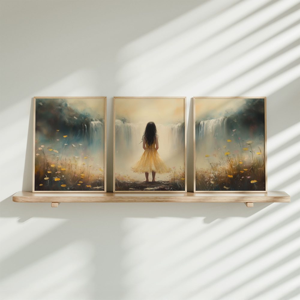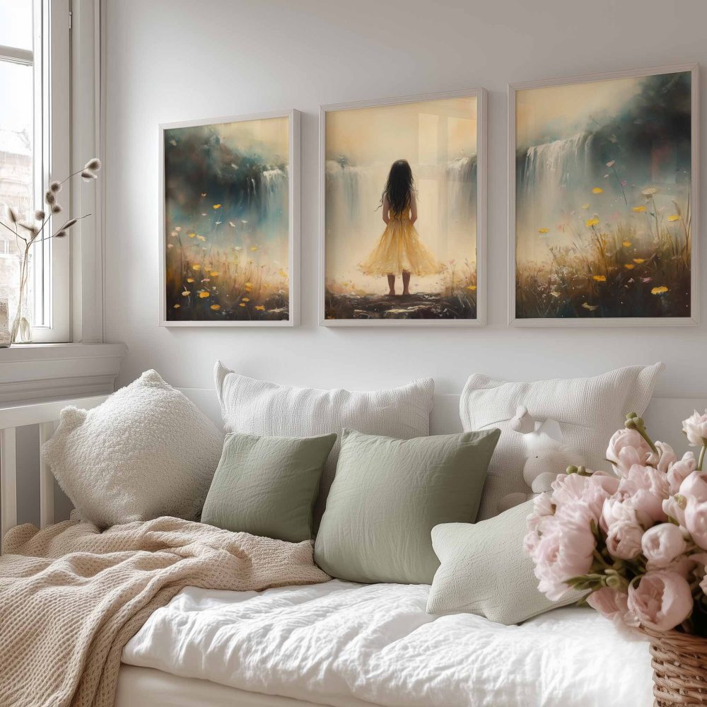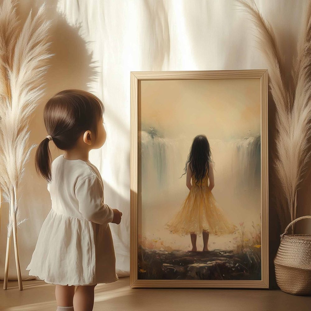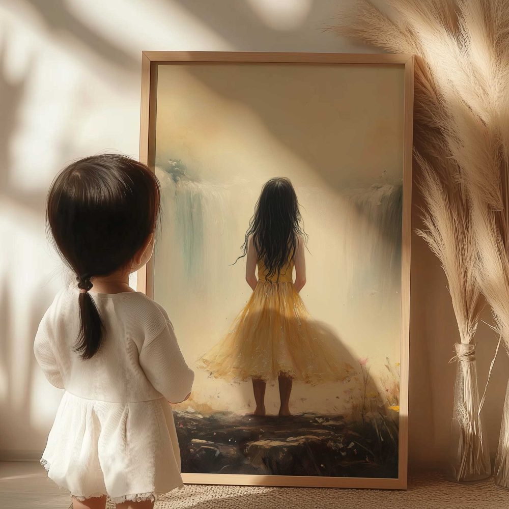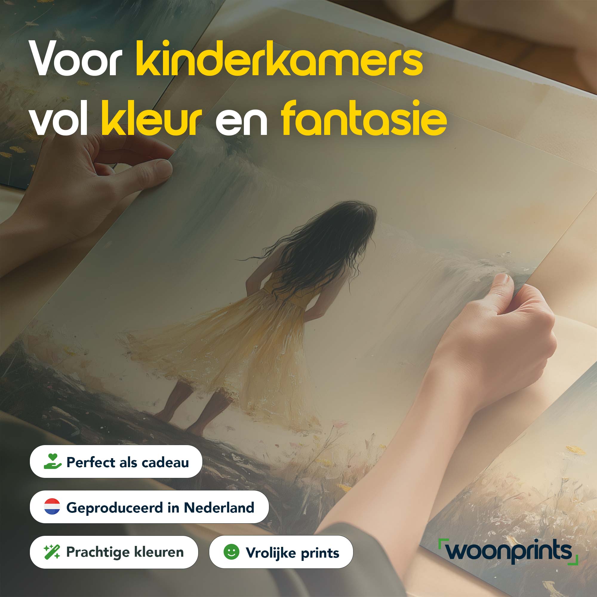 Terug naar collectie / Kinderkamer posters / Bloemen posters / Dromerig Meisje in Gele Jurk tussen Bloemen en Waterval