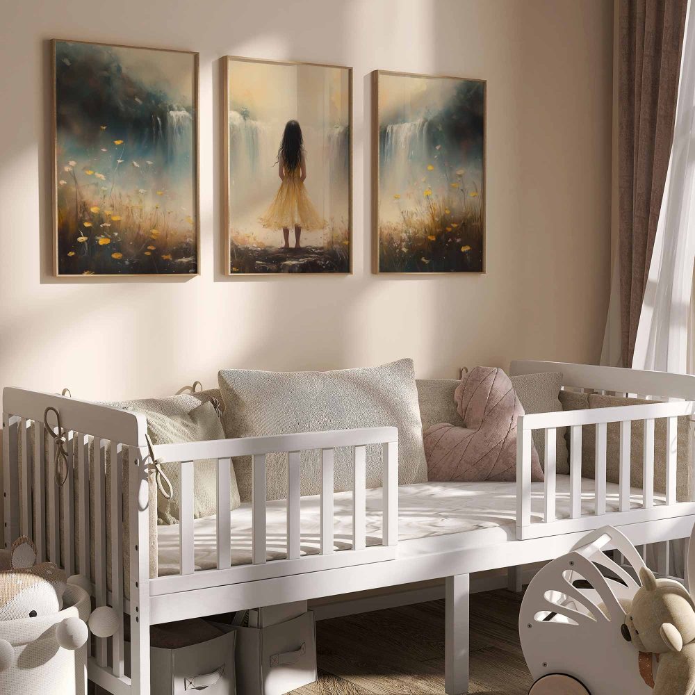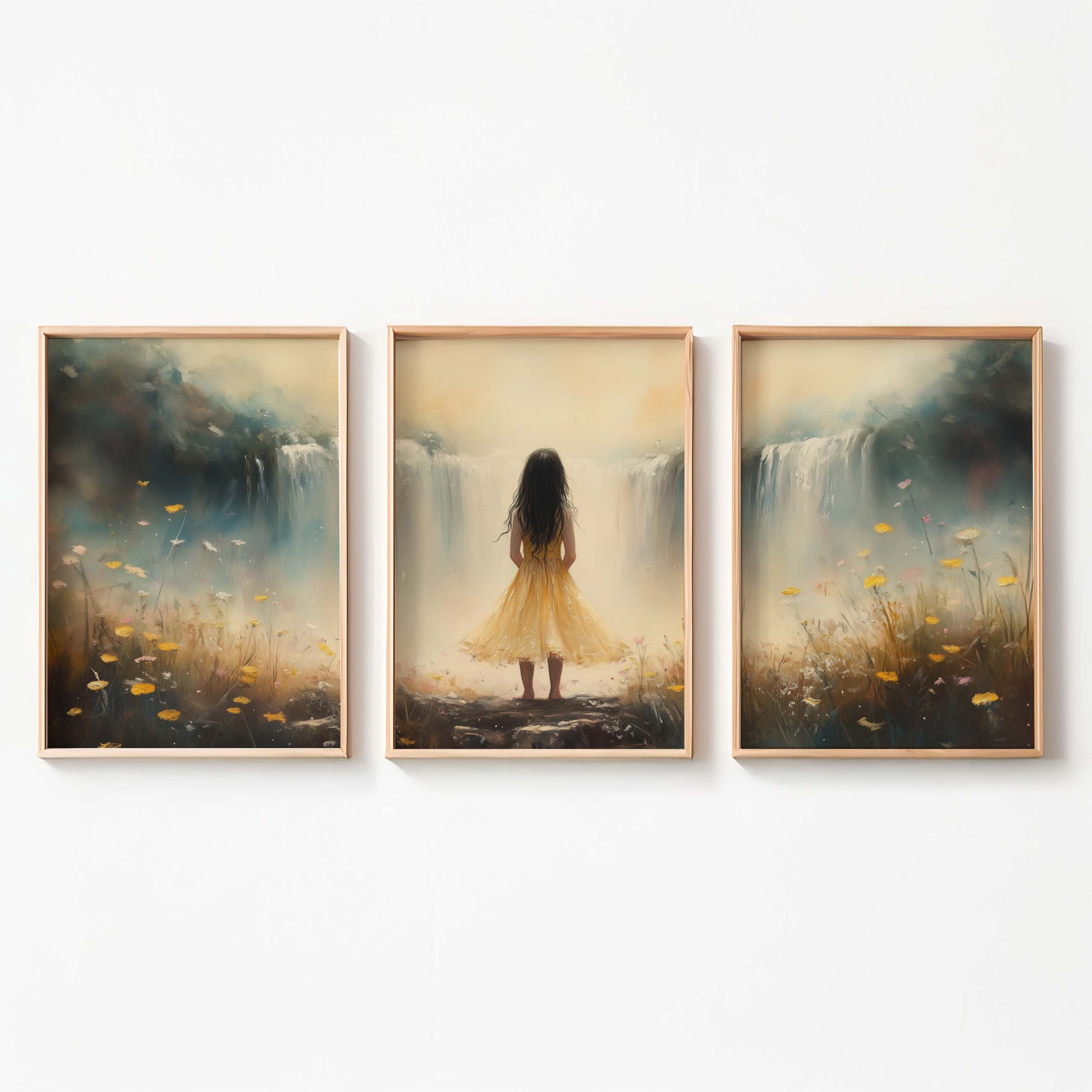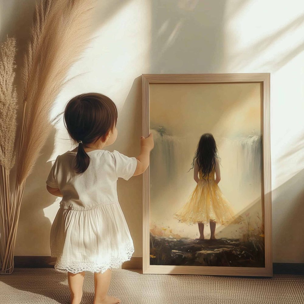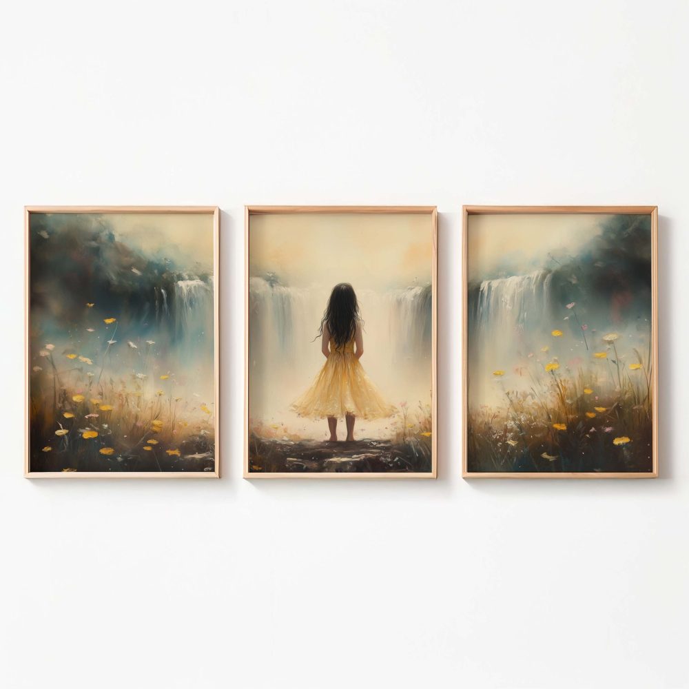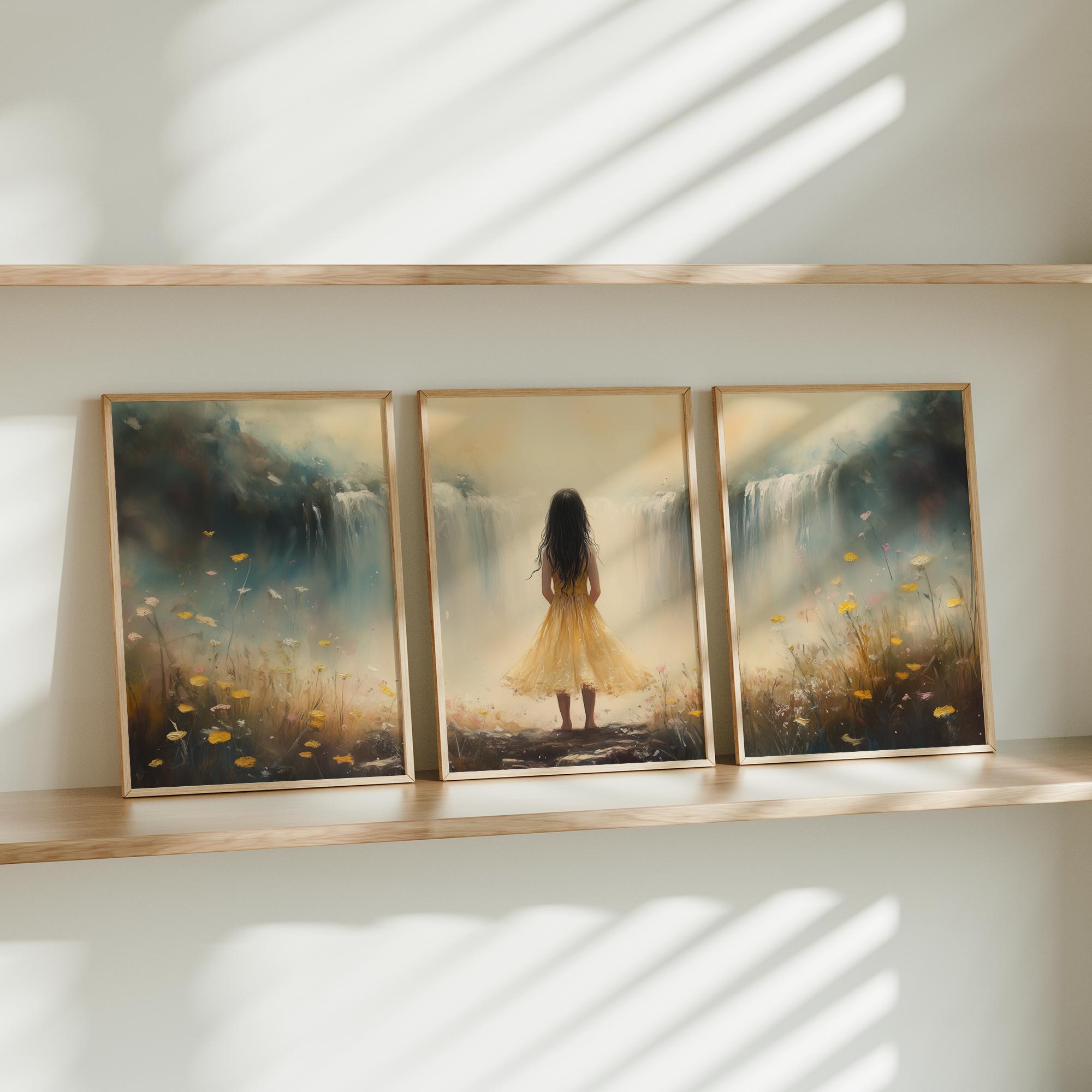 Terug naar collectie / Kinderkamer posters / Bloemen posters / Dromerig Meisje in Gele Jurk tussen Bloemen en Waterval