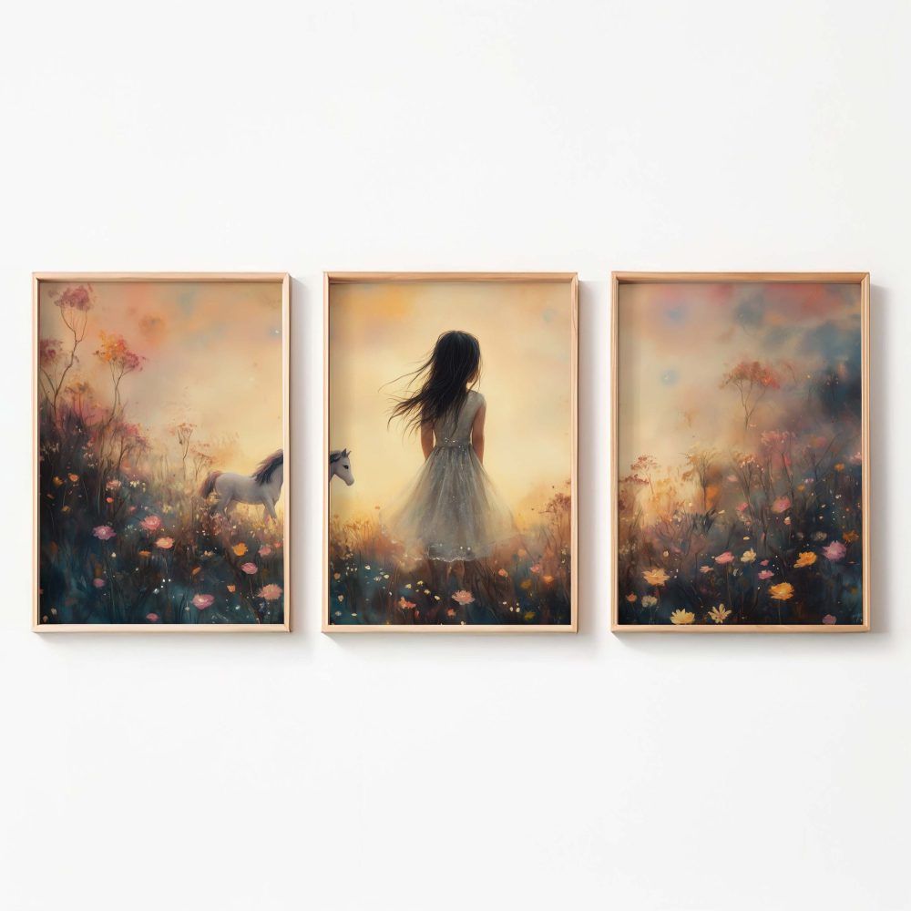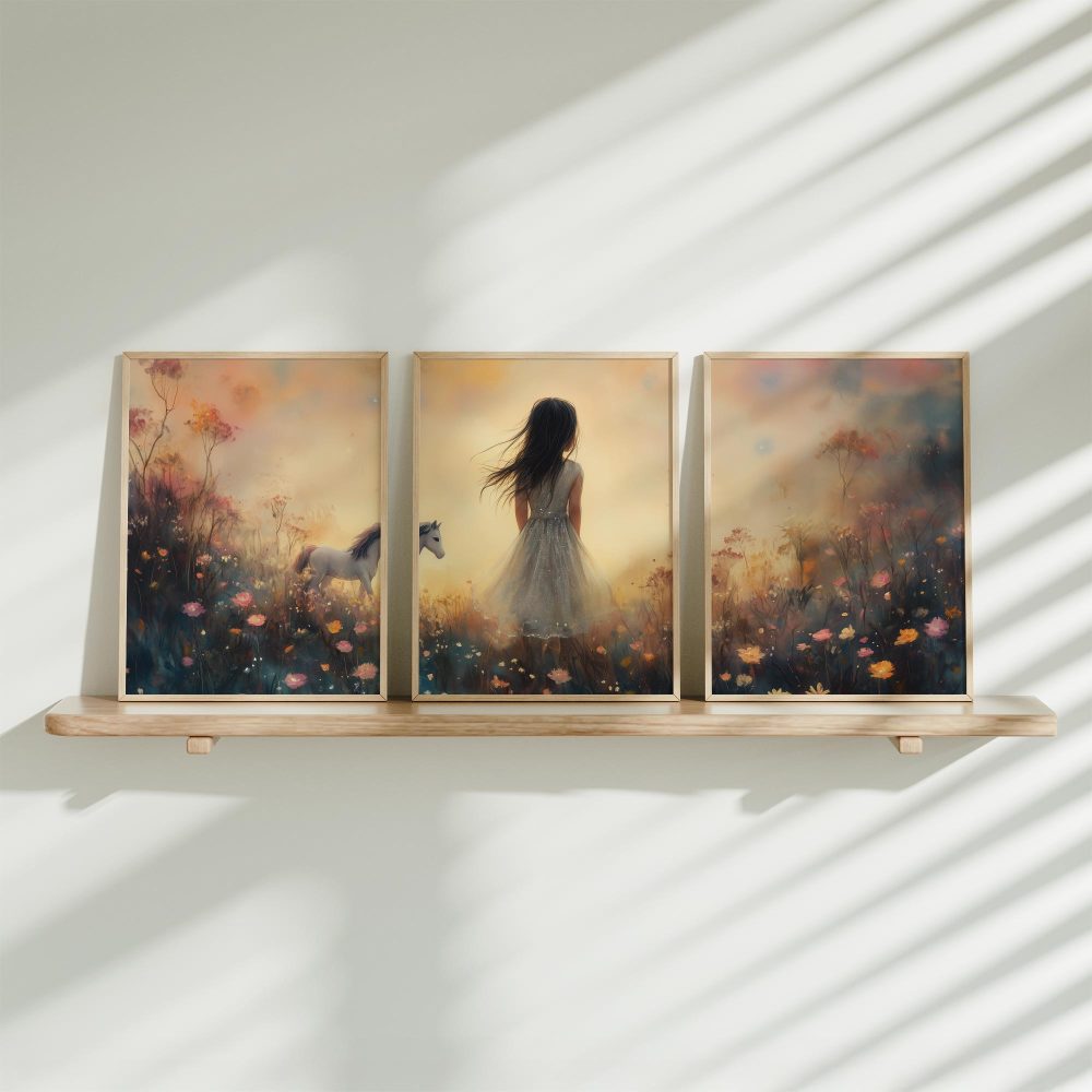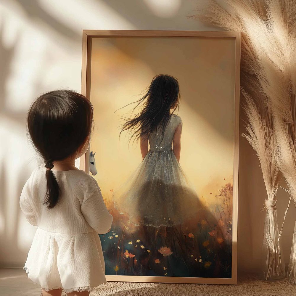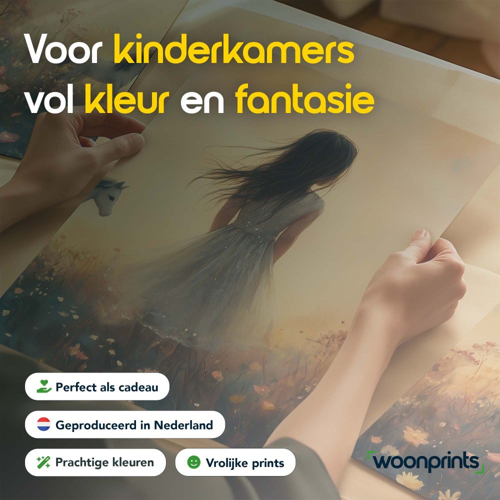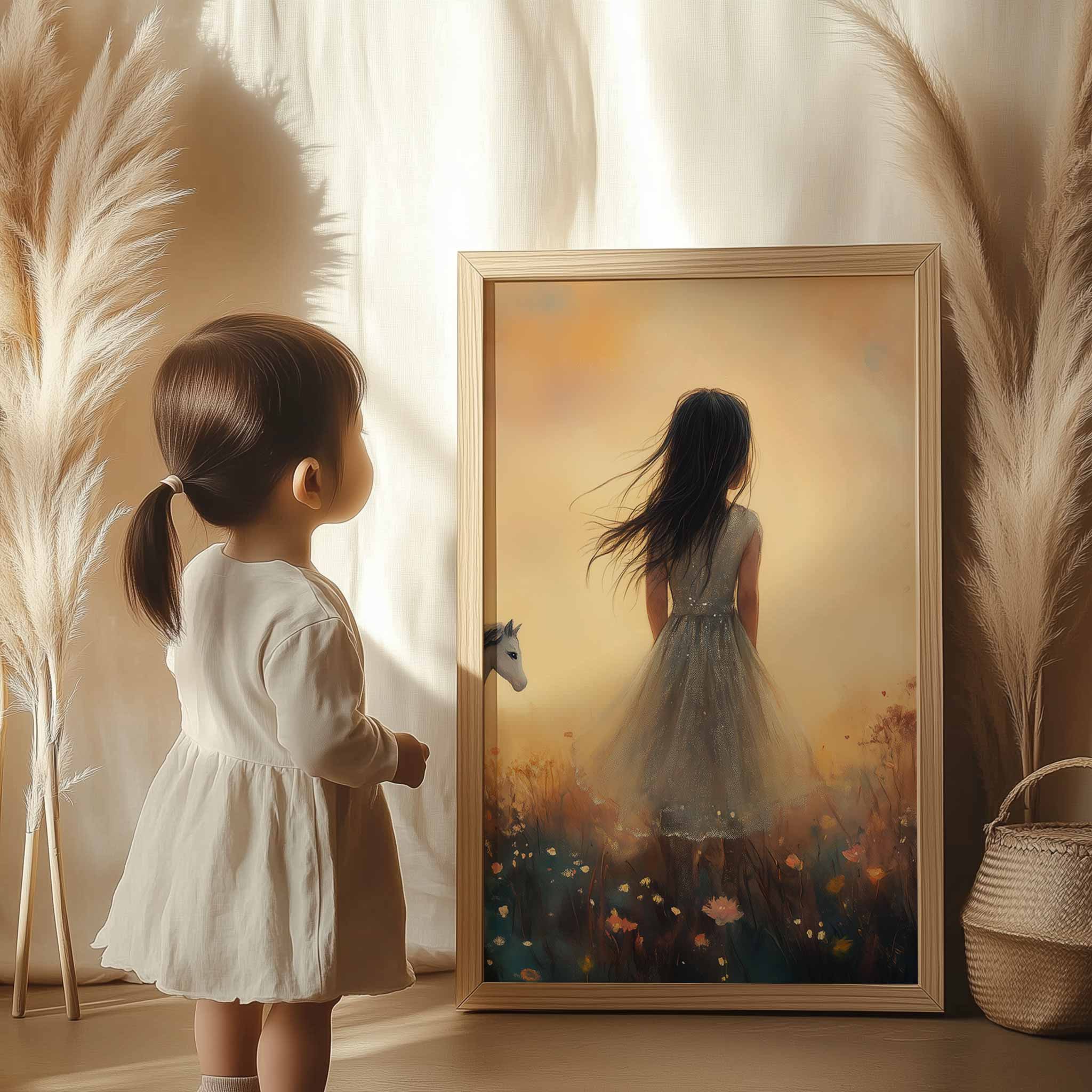 Terug naar collectie / Kinderkamer posters / Bloemen posters / Dromerig Meisje met Paard in Bloemenveld