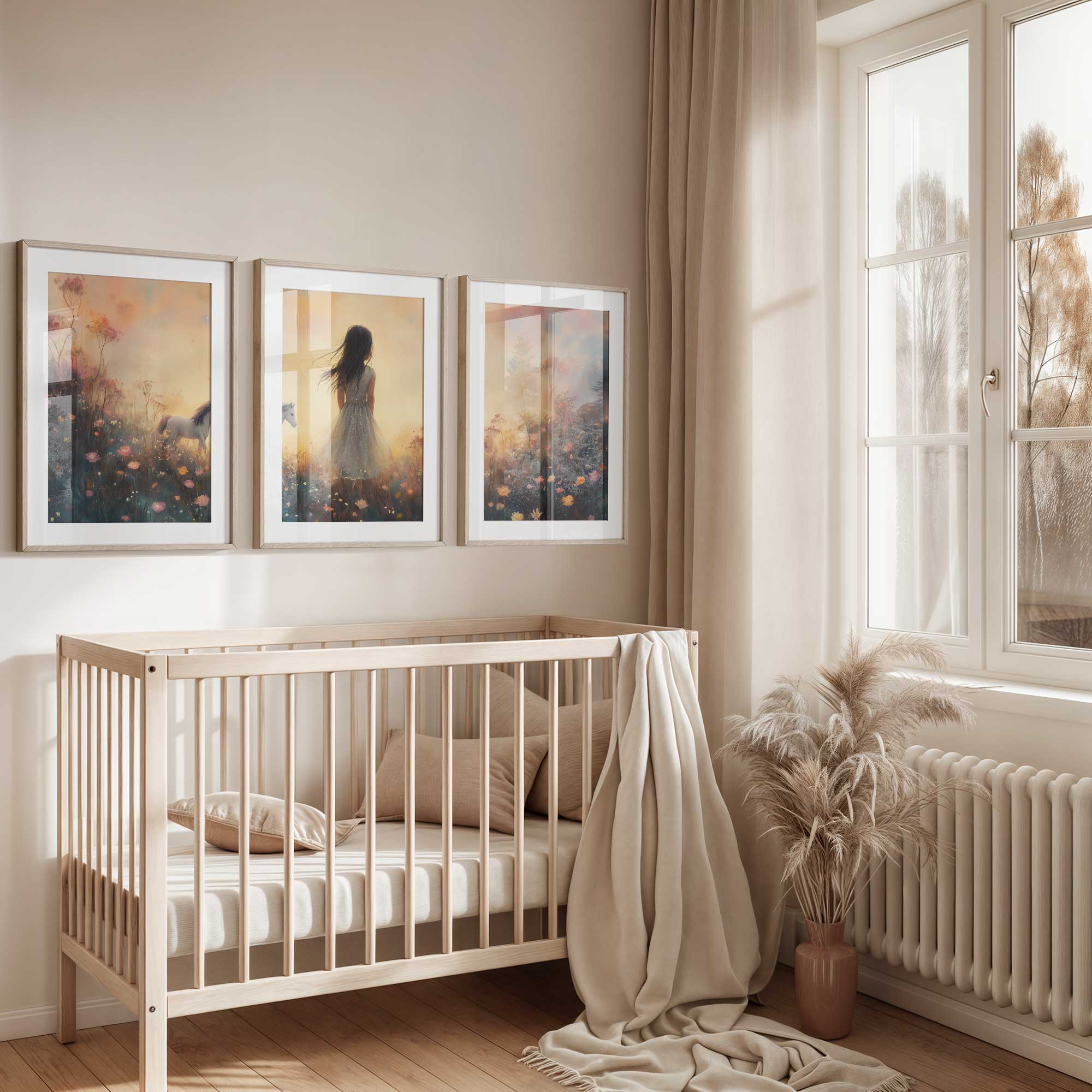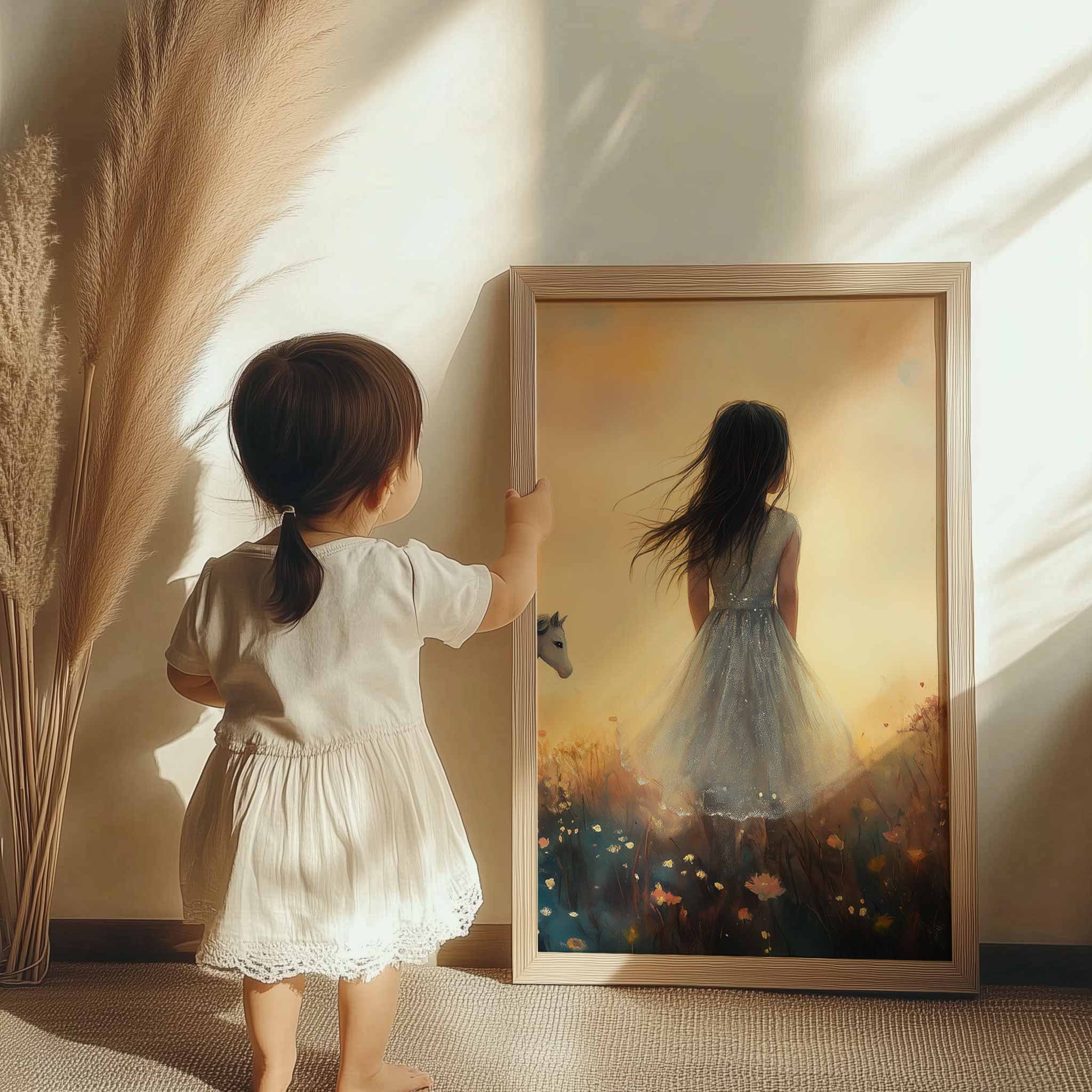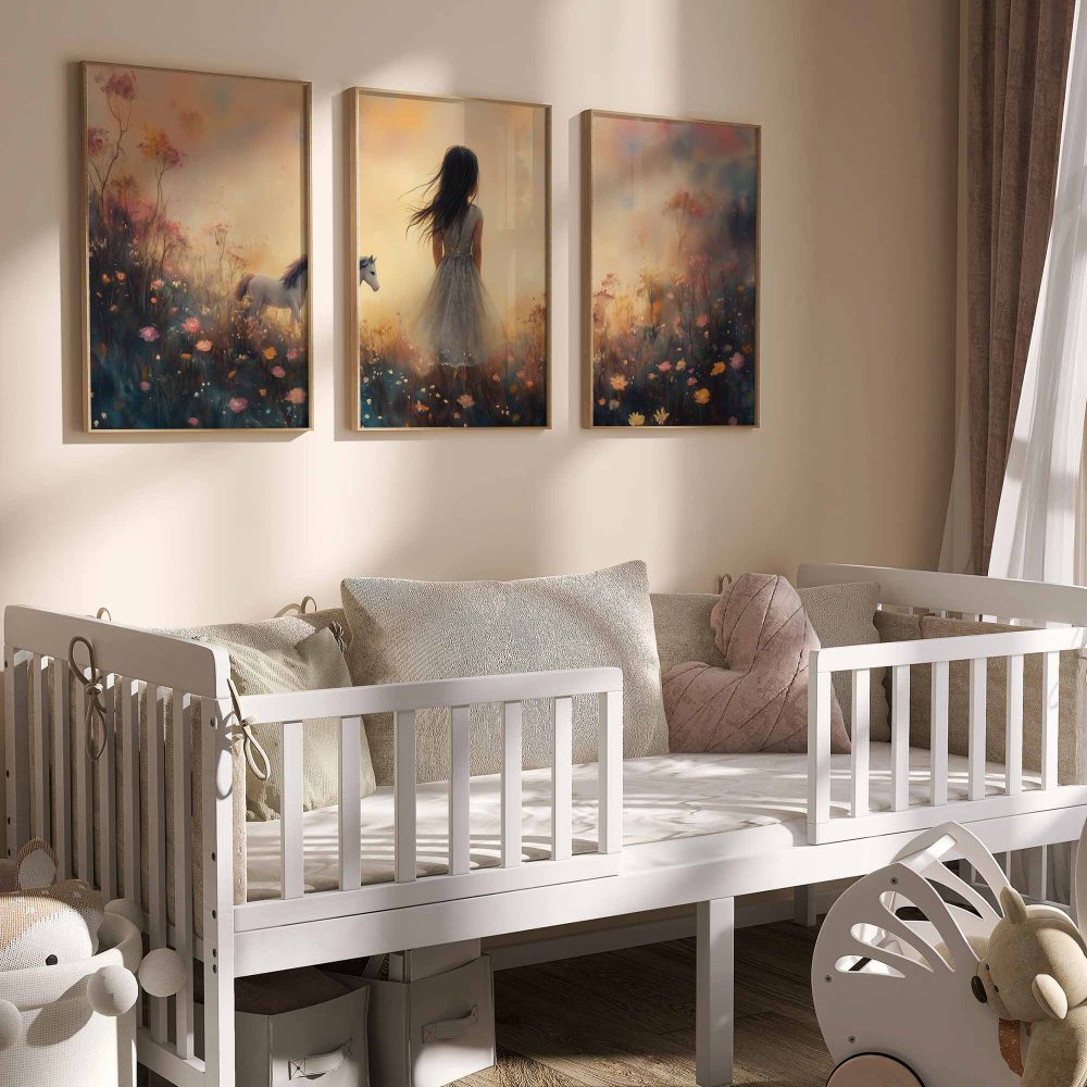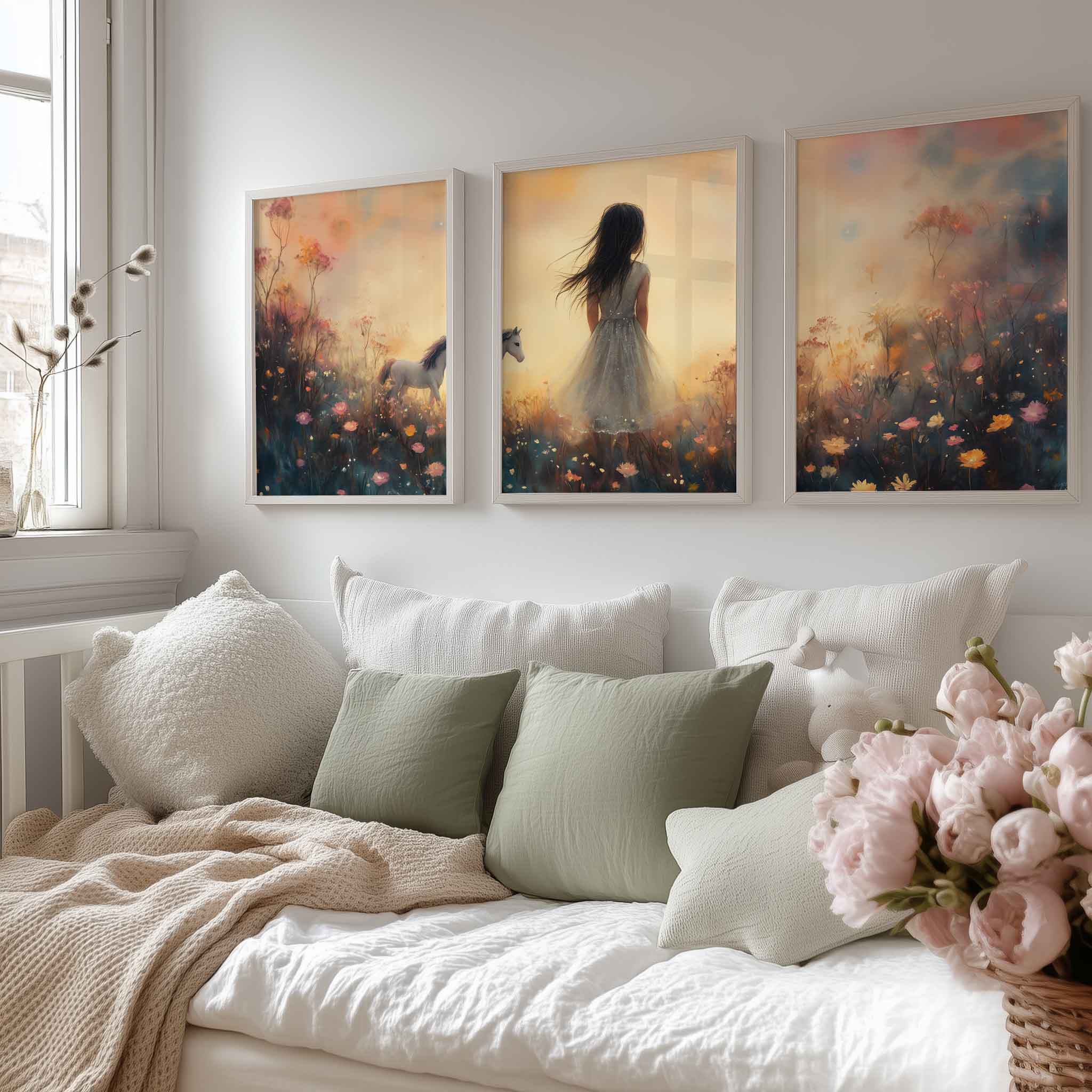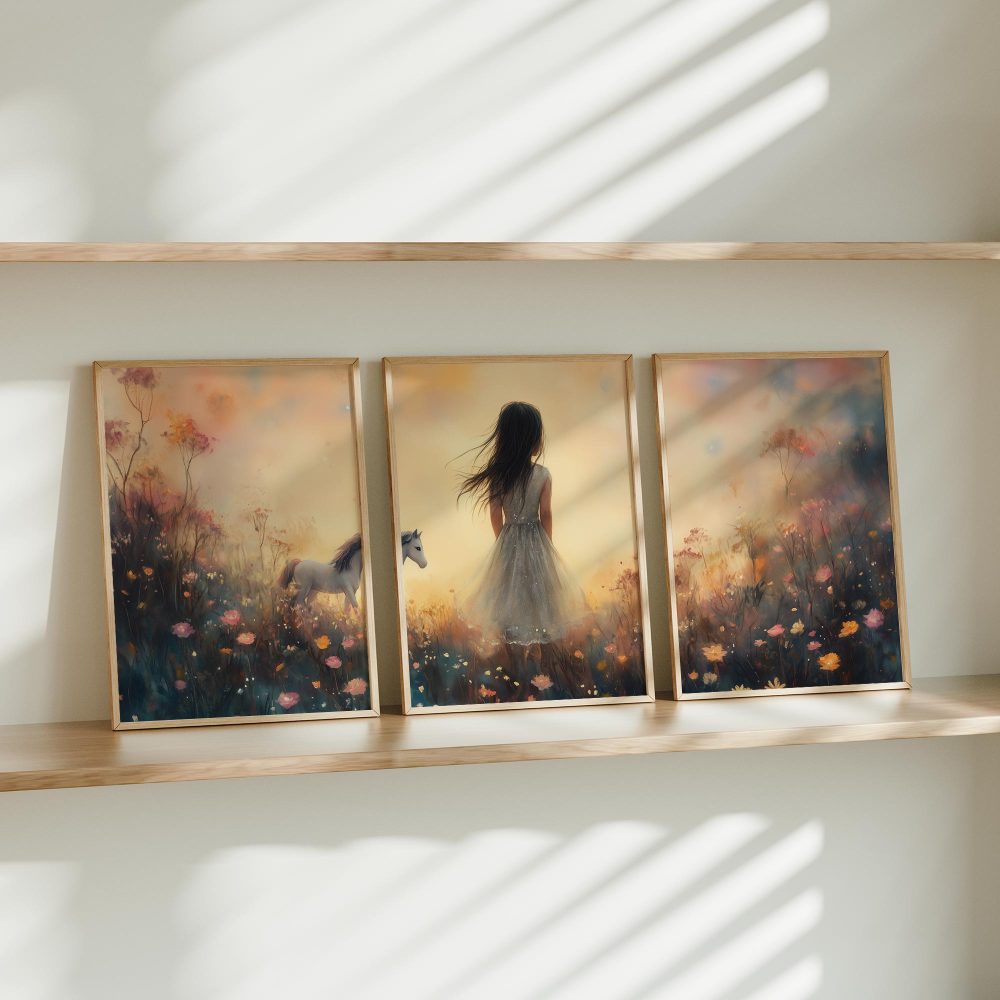 Terug naar collectie / Kinderkamer posters / Bloemen posters / Dromerig Meisje met Paard in Bloemenveld