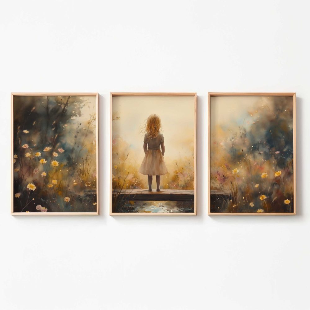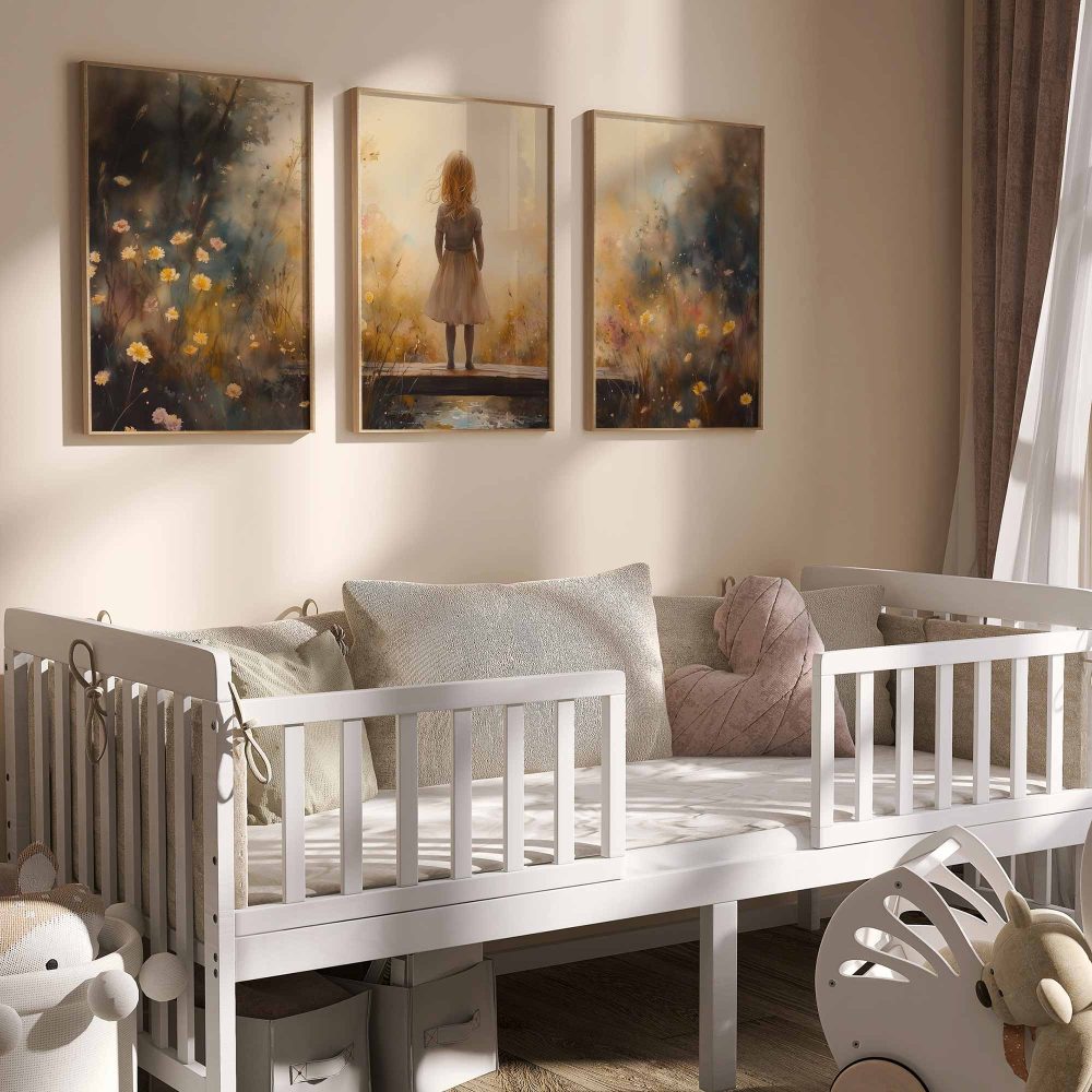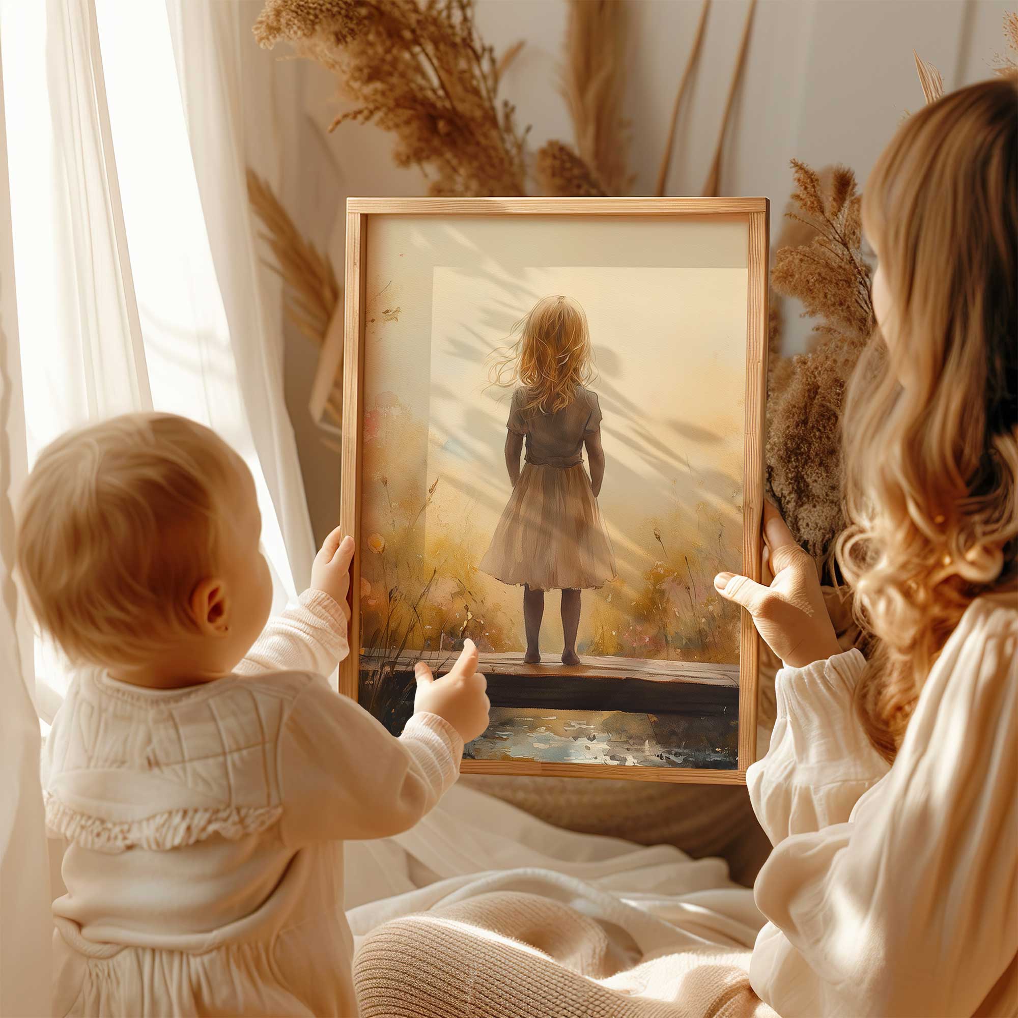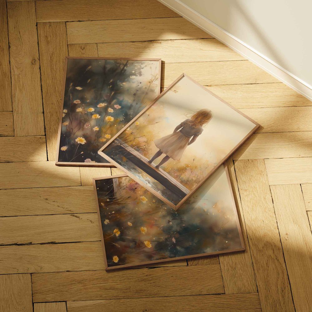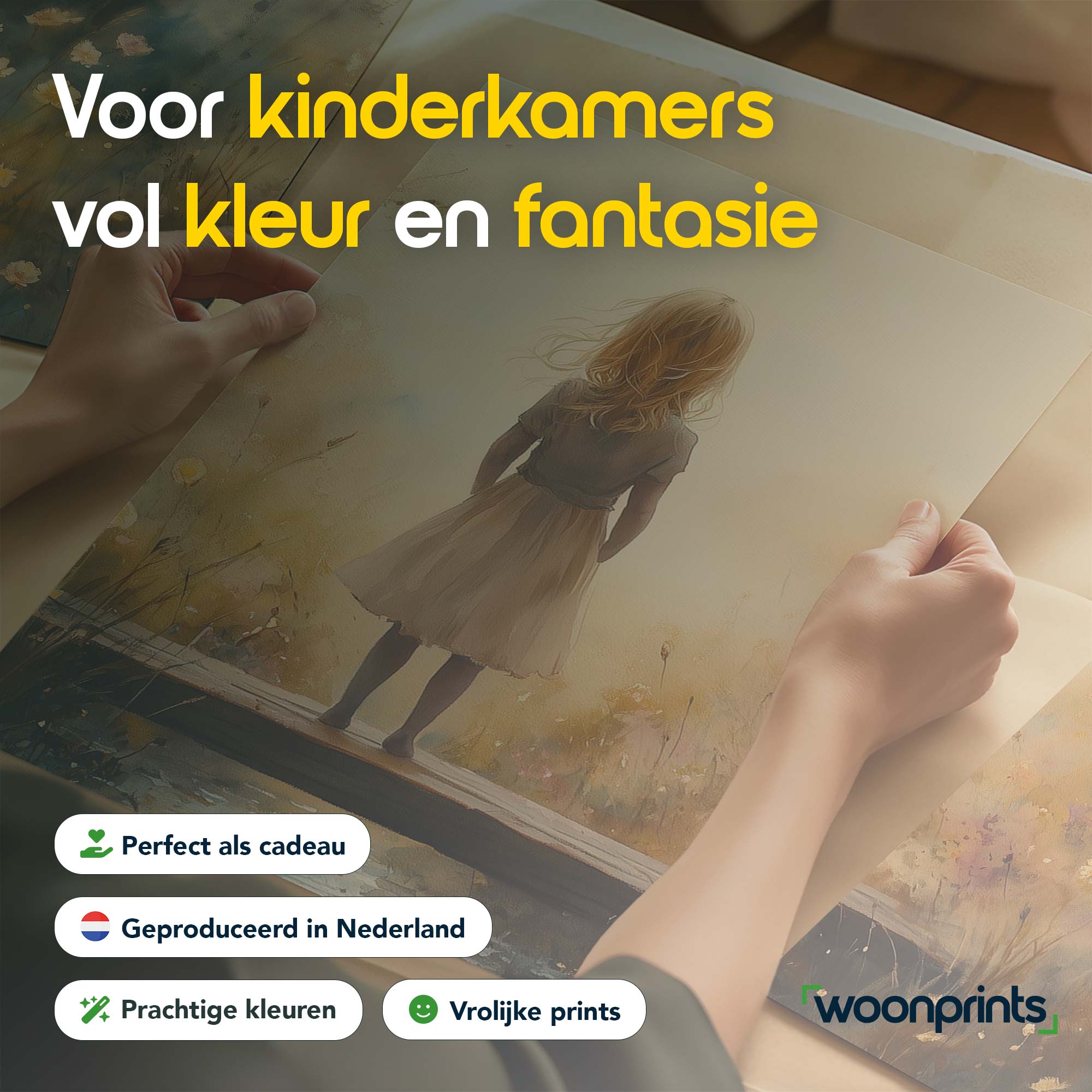 Terug naar collectie / Kinderkamer posters / Bloemen posters / Dromerig Meisje op Bloemenbrug – Warme Kleuren