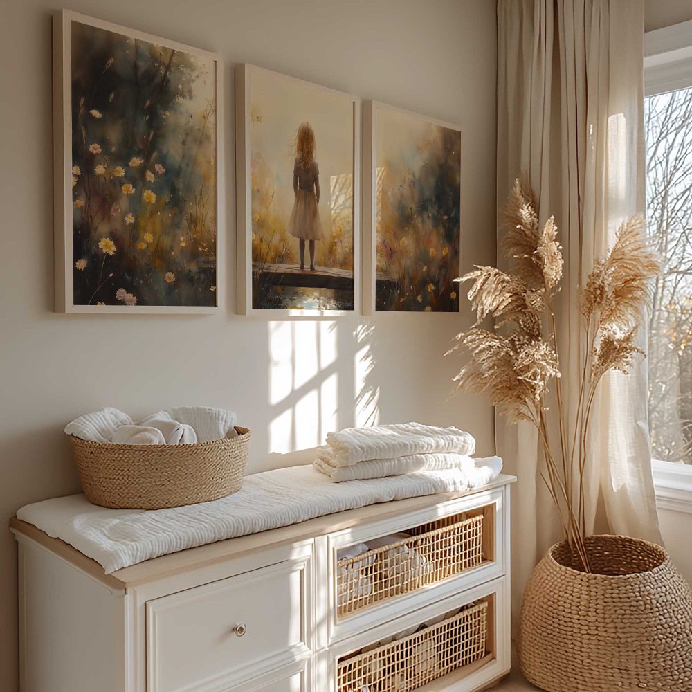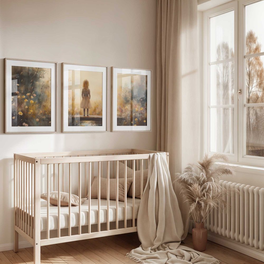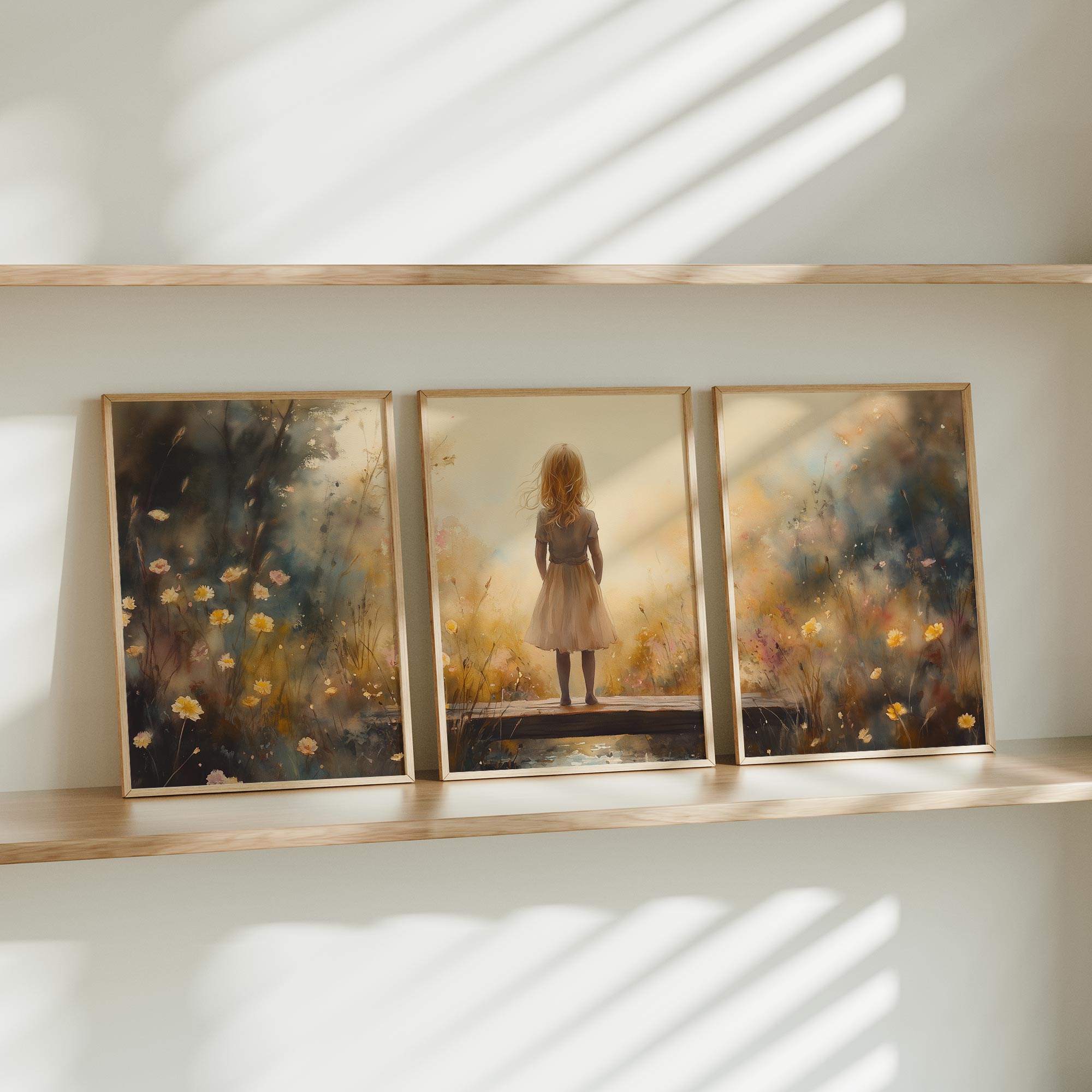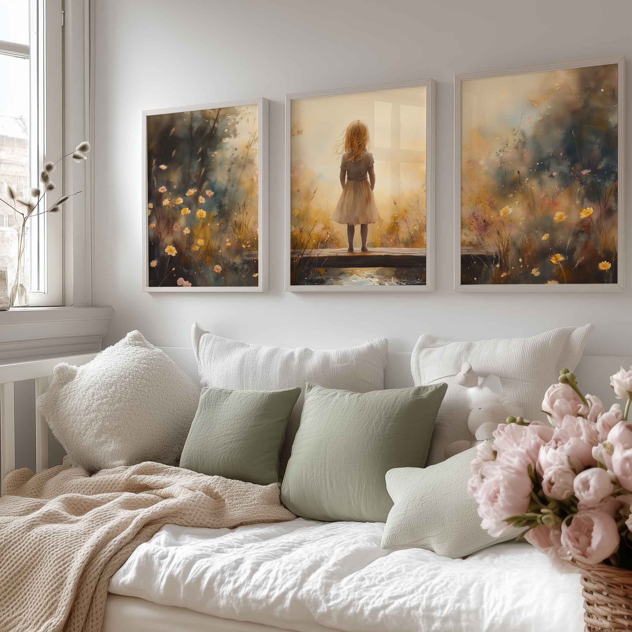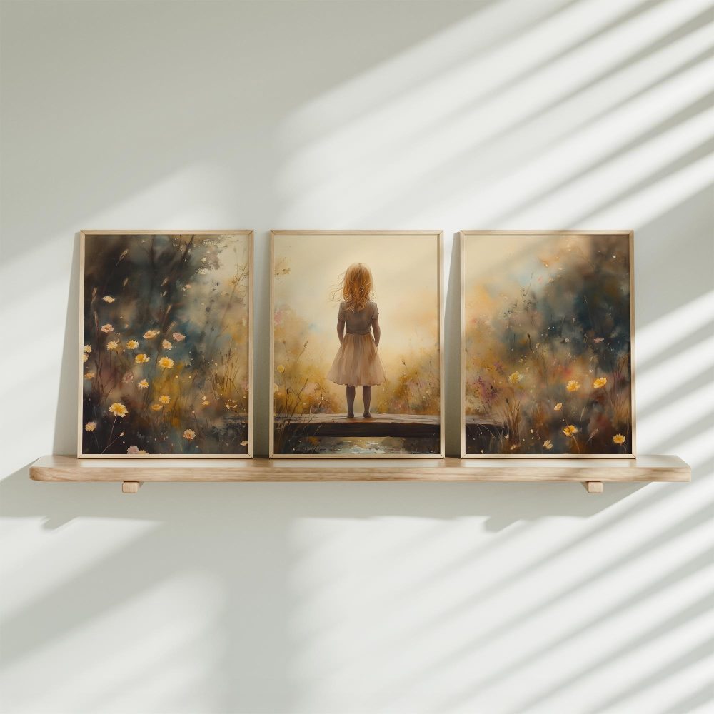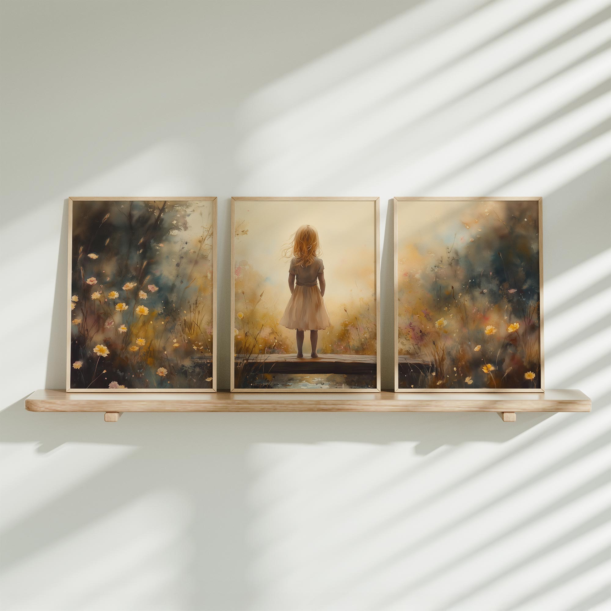 Terug naar collectie / Kinderkamer posters / Bloemen posters / Dromerig Meisje op Bloemenbrug – Warme Kleuren