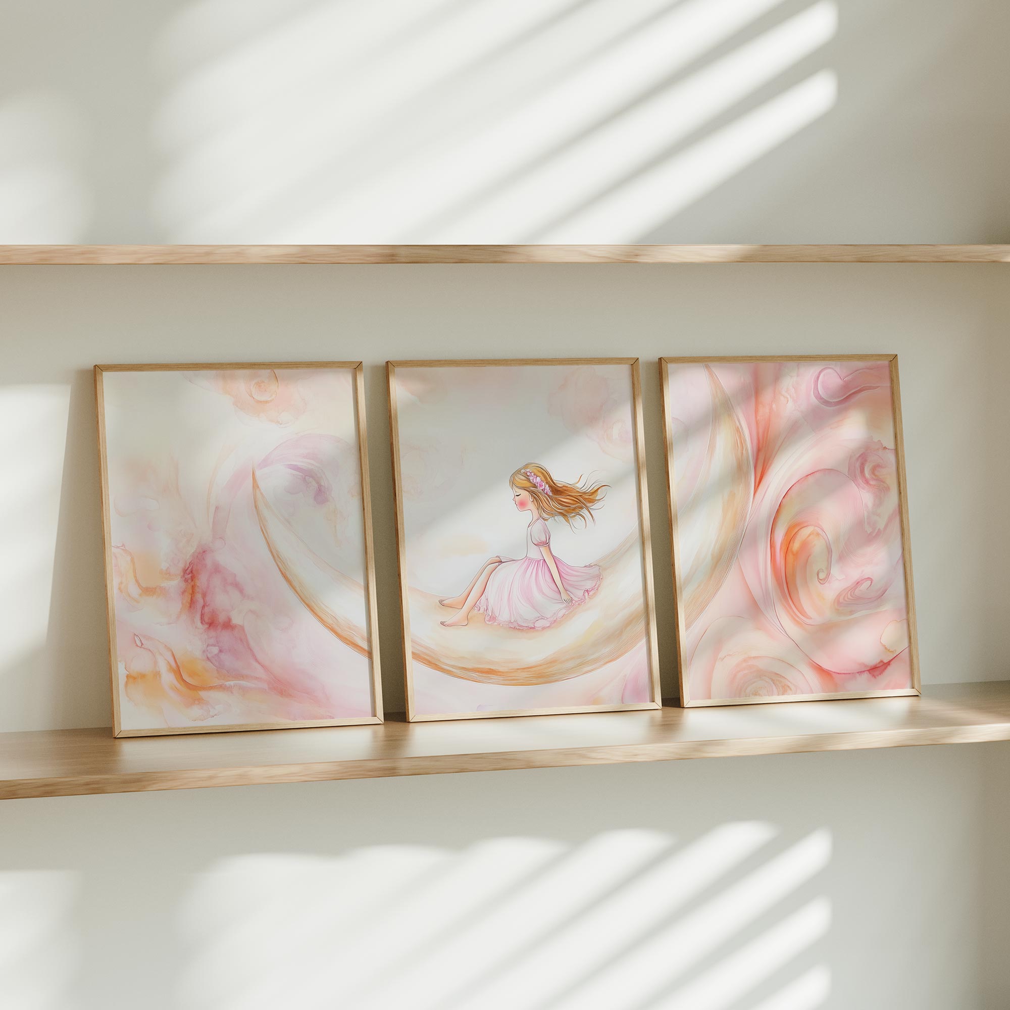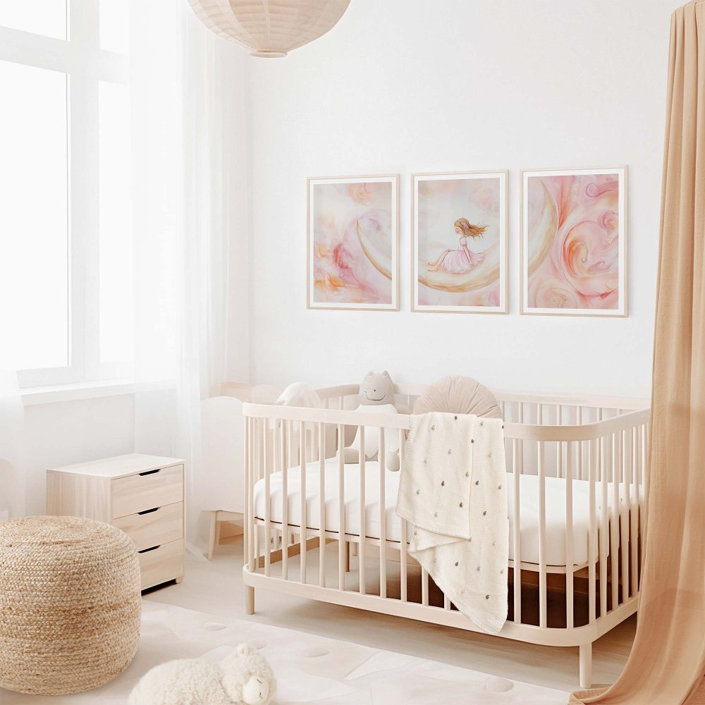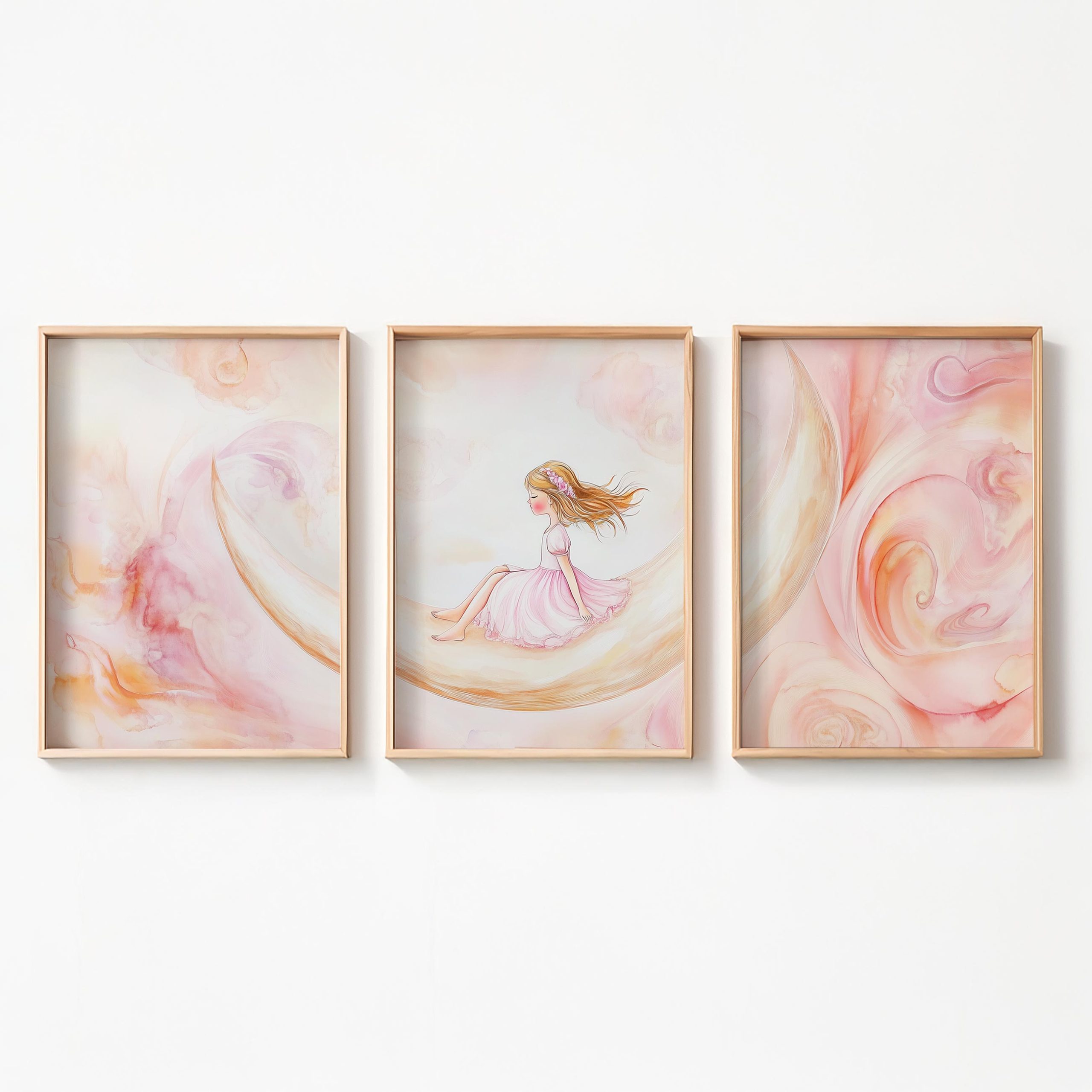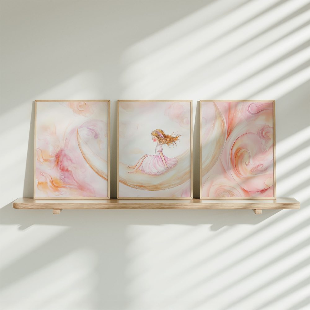 Terug naar collectie / Kinderkamer posters / Dromerig Meisje op Maansikkel – Pastel Waterverf Sfeer