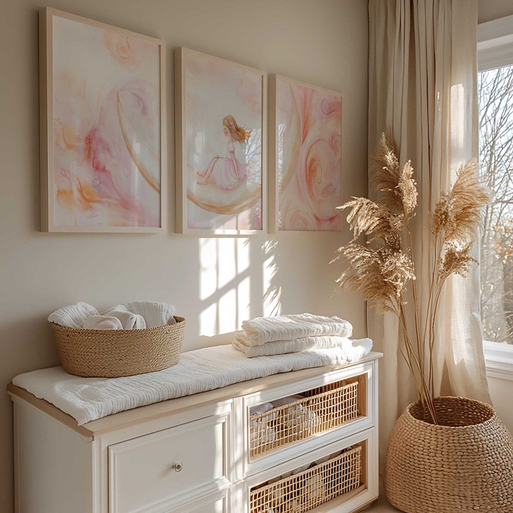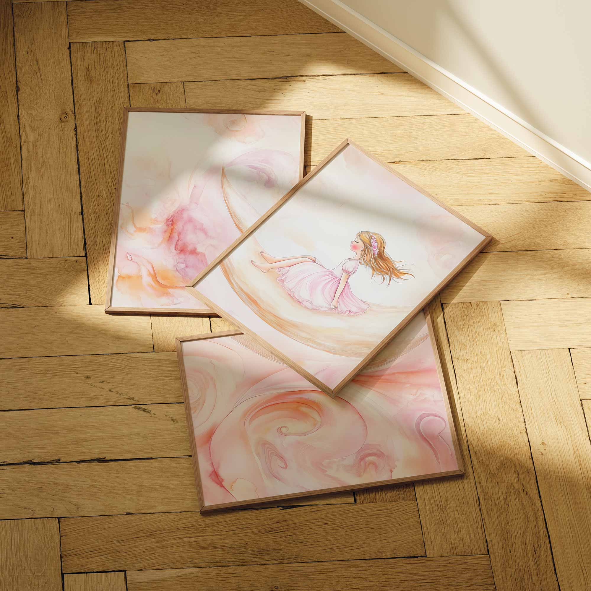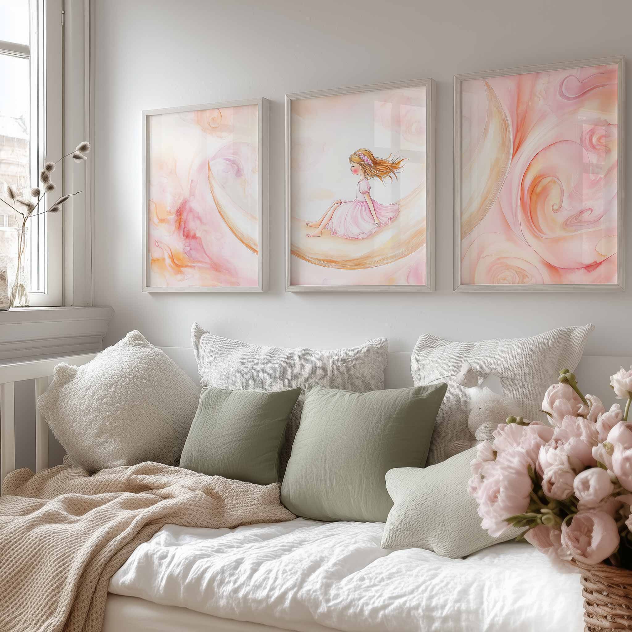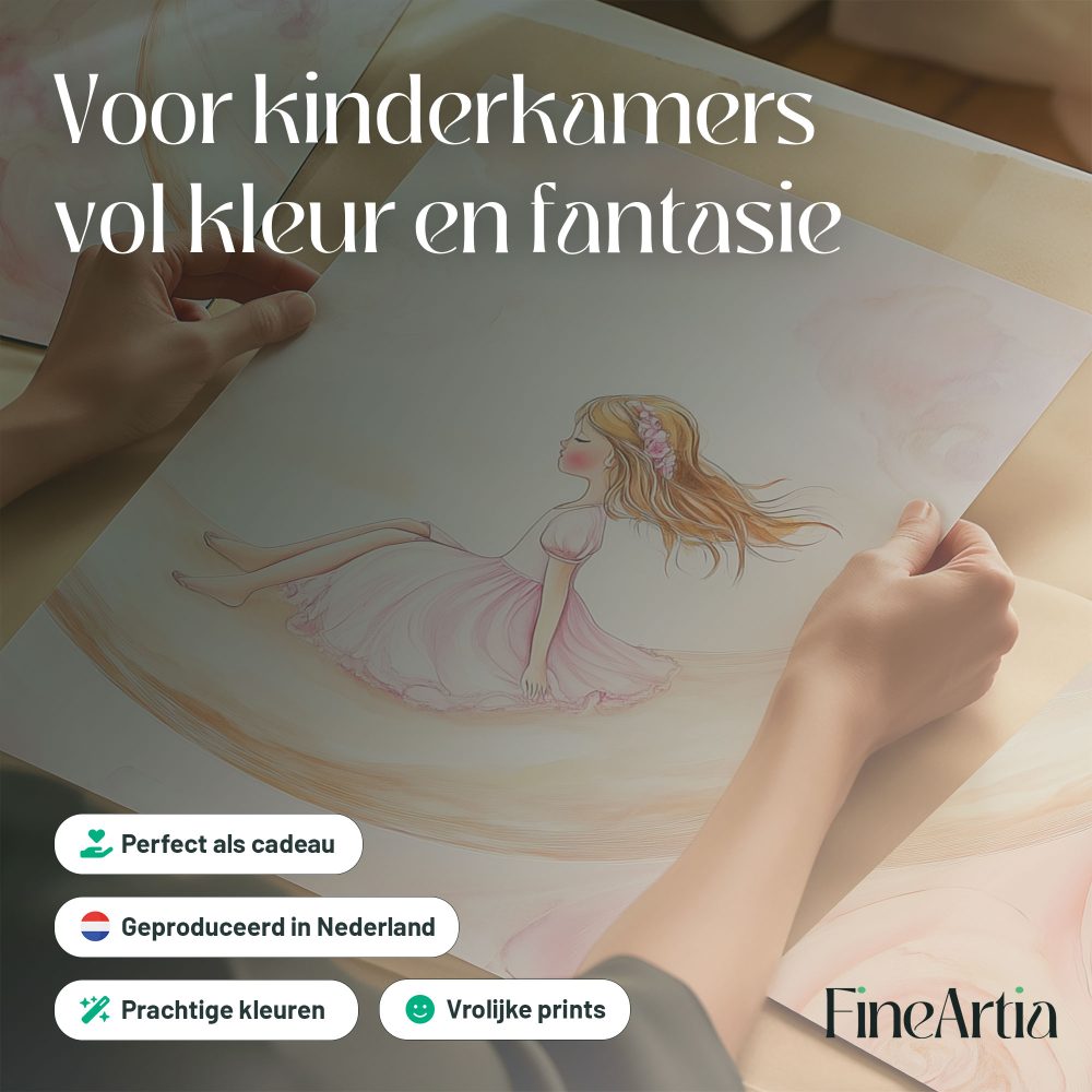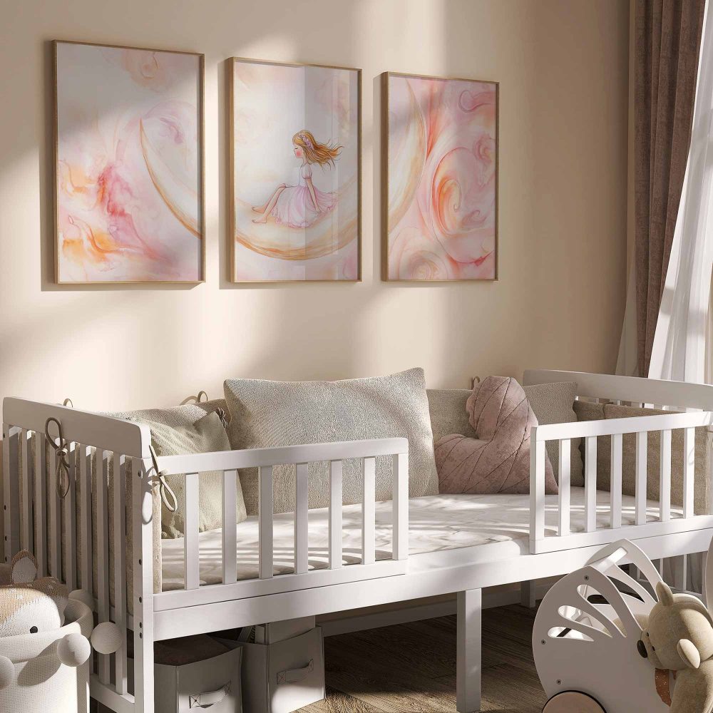 Terug naar collectie / Kinderkamer posters / Dromerig Meisje op Maansikkel – Pastel Waterverf Sfeer