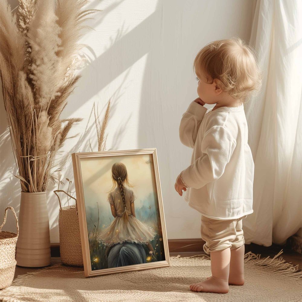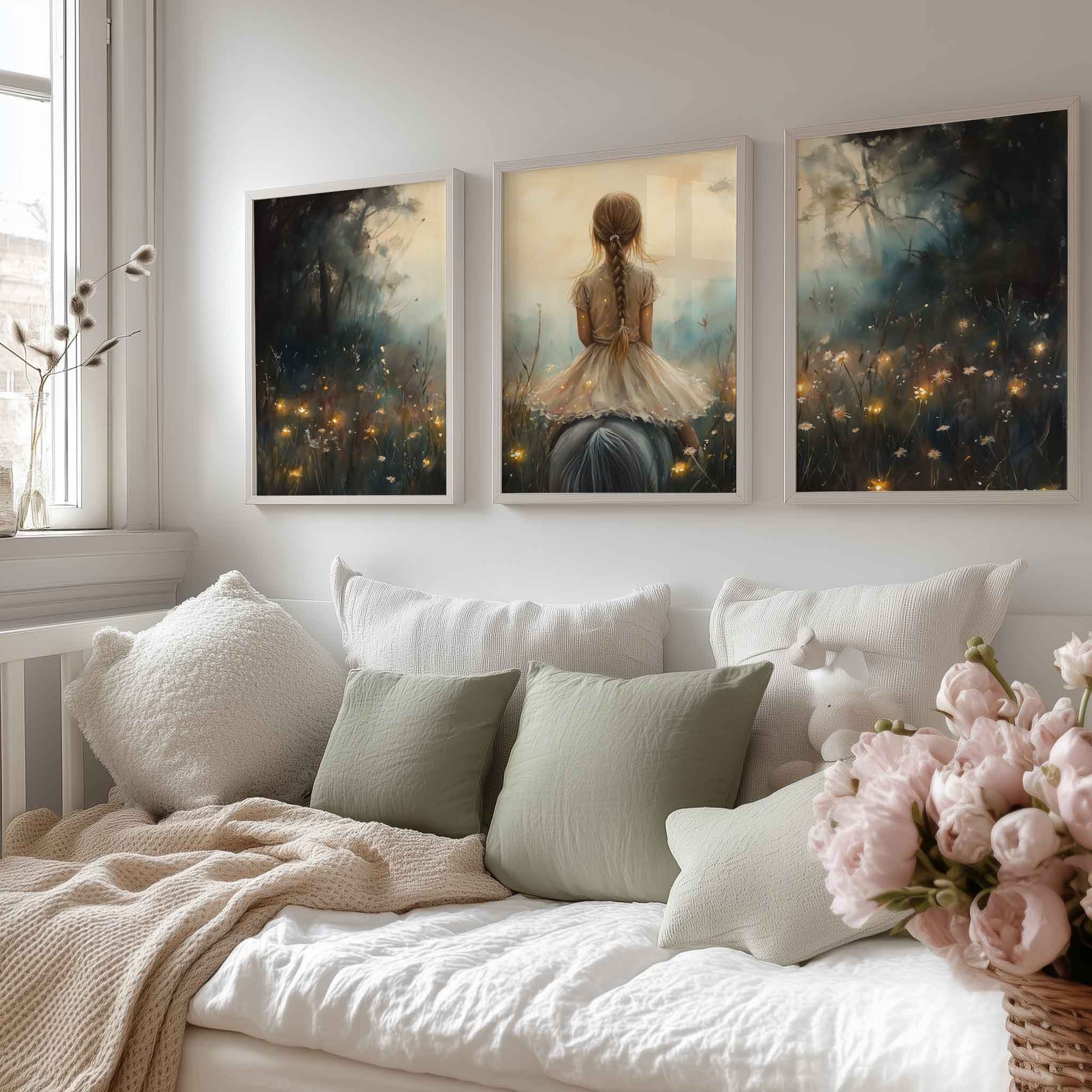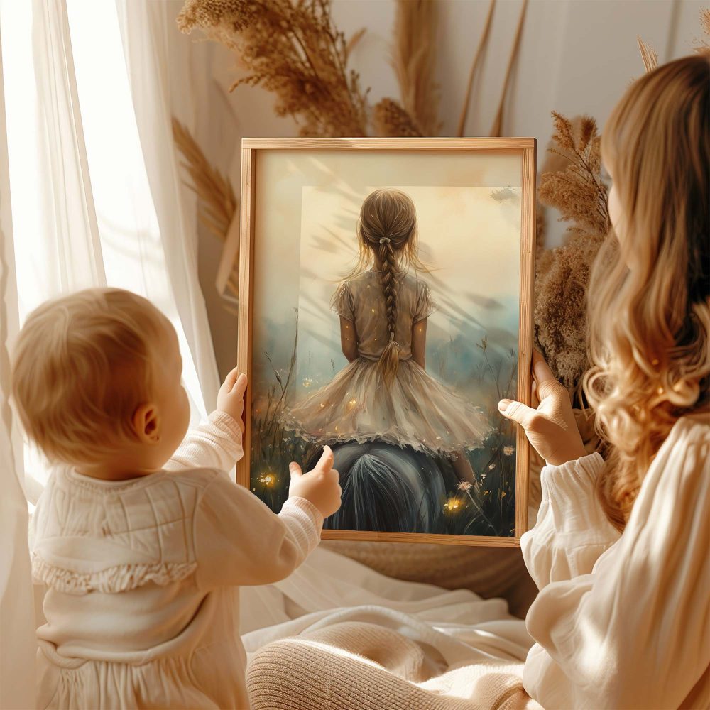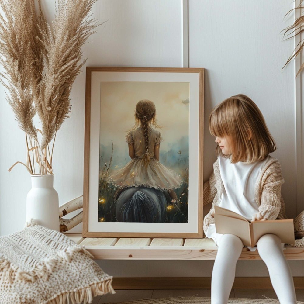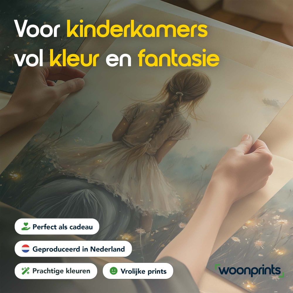 Terug naar collectie / Kinderkamer posters / Bloemen posters / Dromerig Meisje op Paard in Bloemenveld