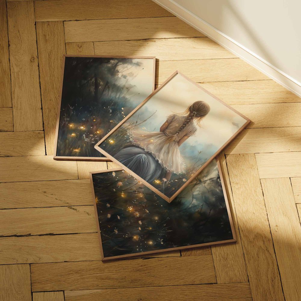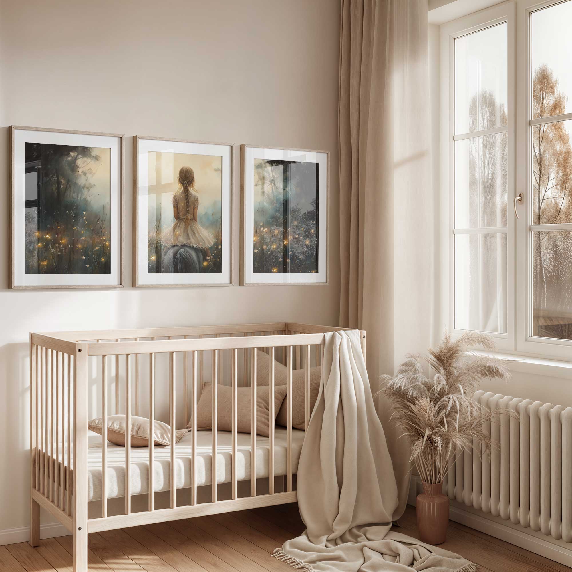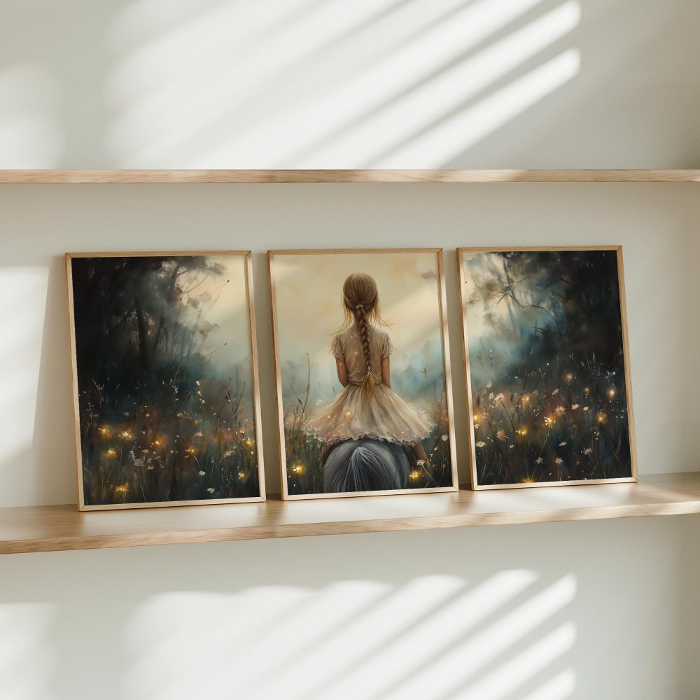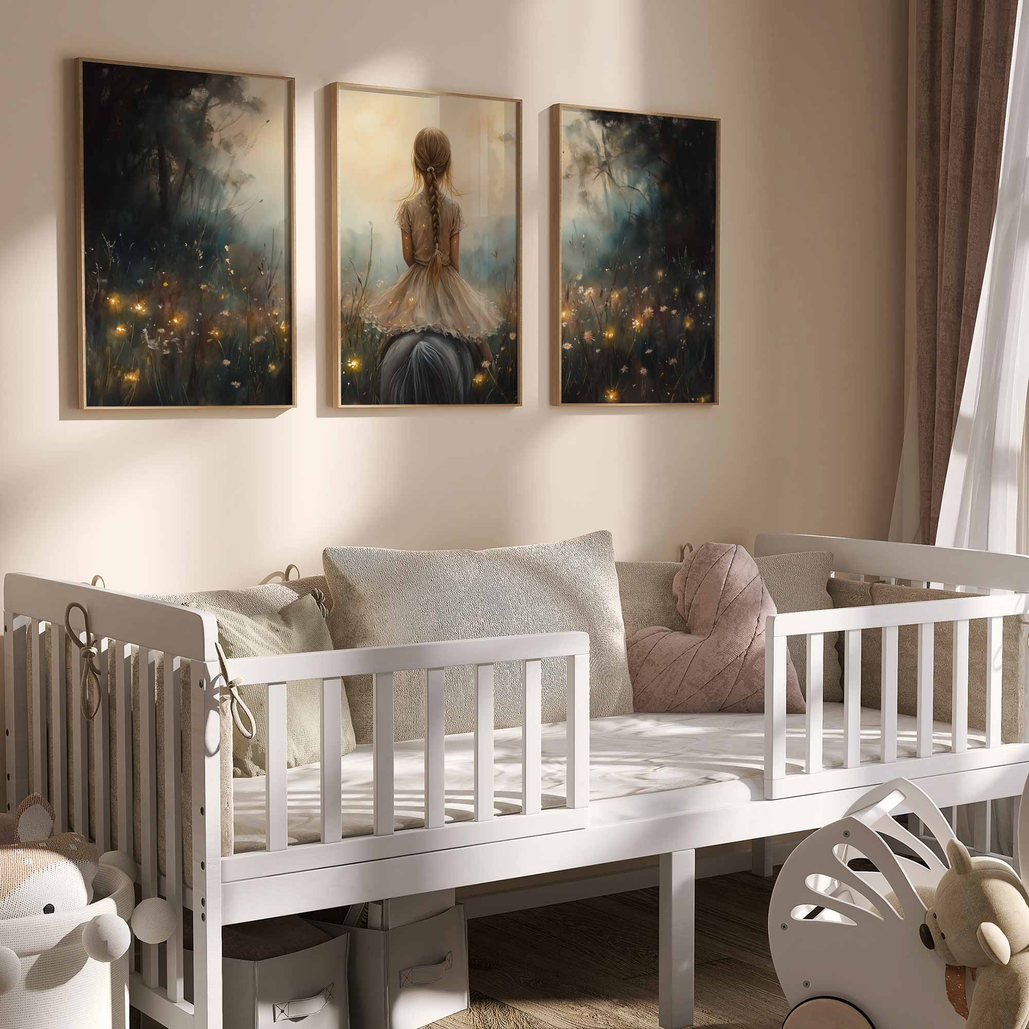 Terug naar collectie / Kinderkamer posters / Bloemen posters / Dromerig Meisje op Paard in Bloemenveld
