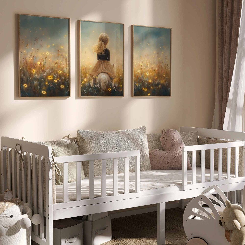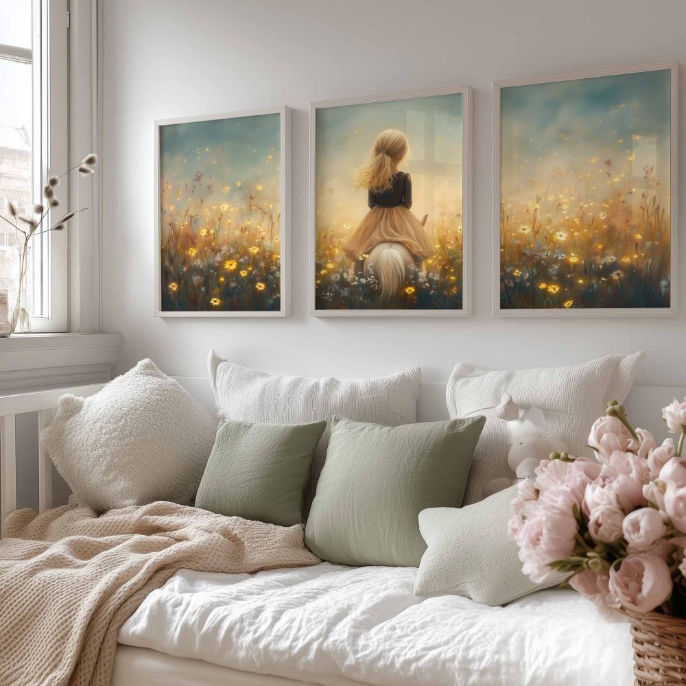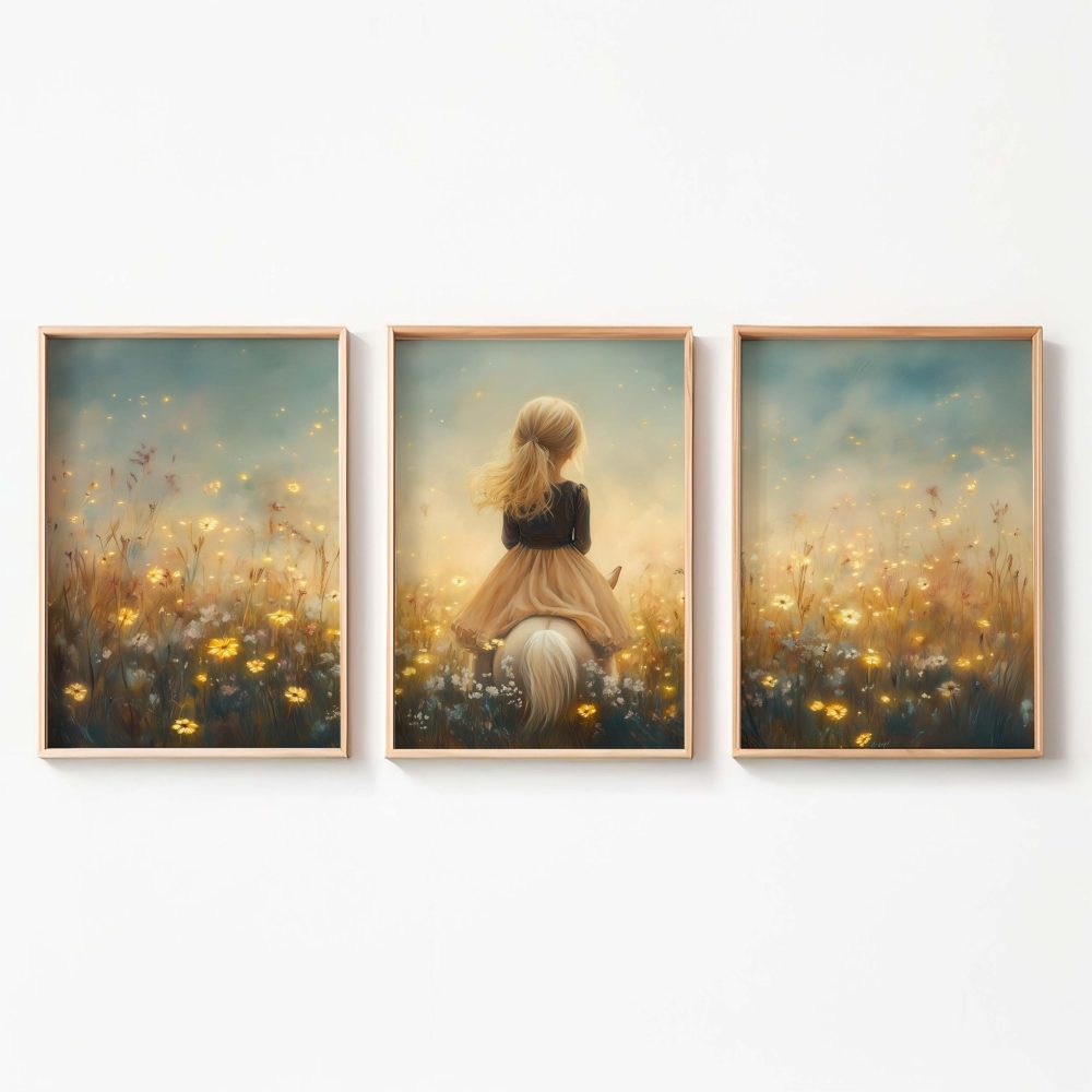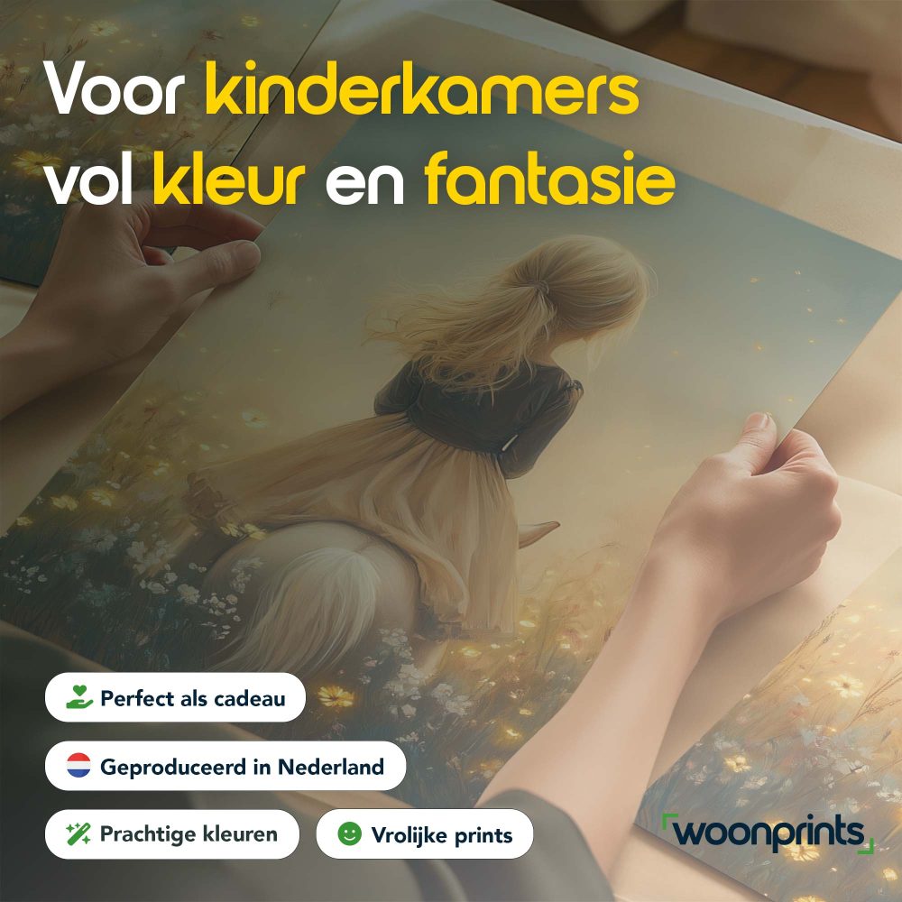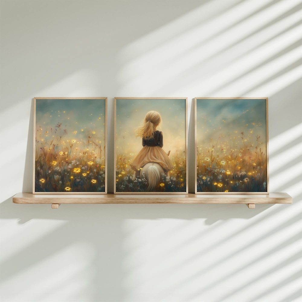 Terug naar collectie / Kinderkamer posters / Avontuurlijk posters / Dromerig Meisje op Paard in Bloemenveld