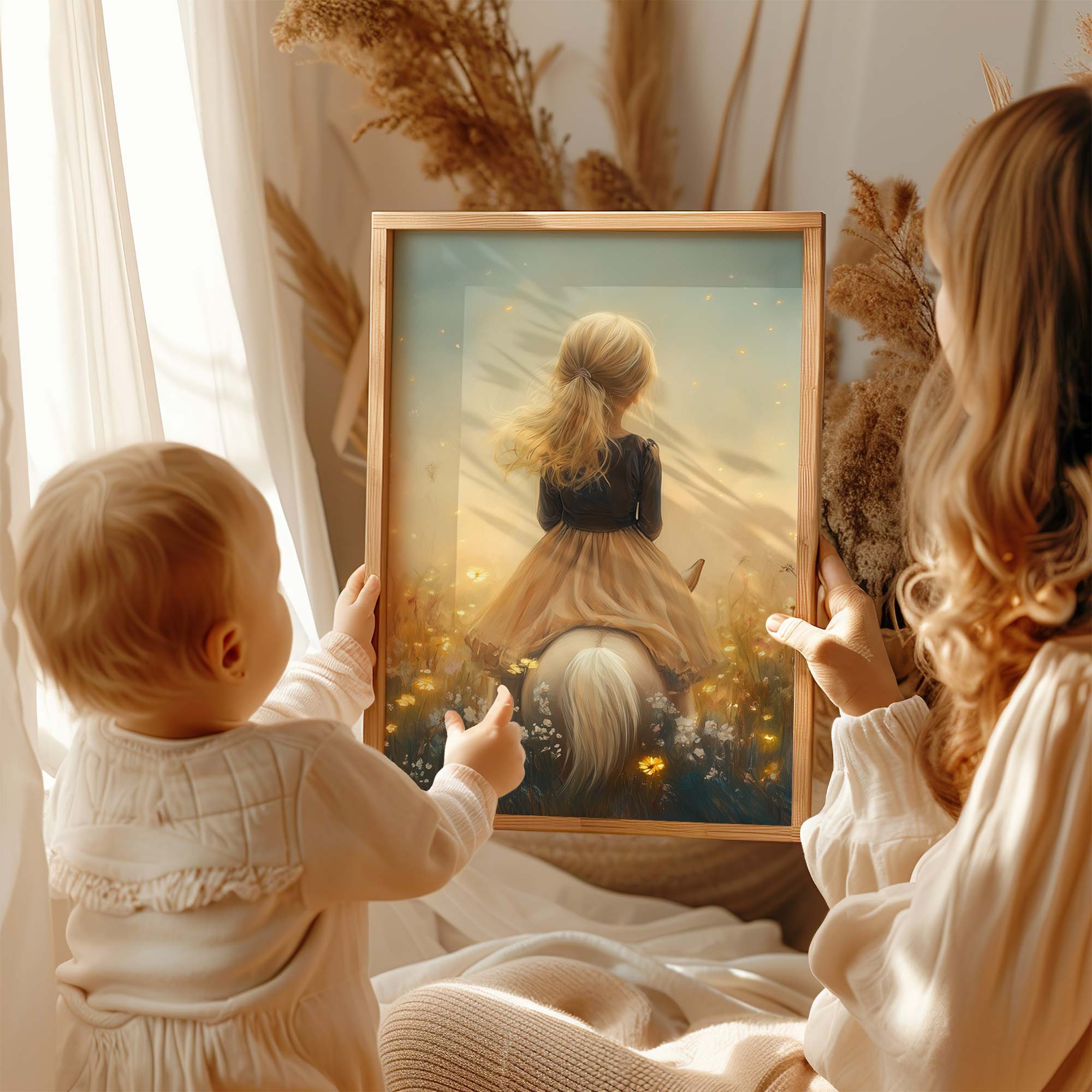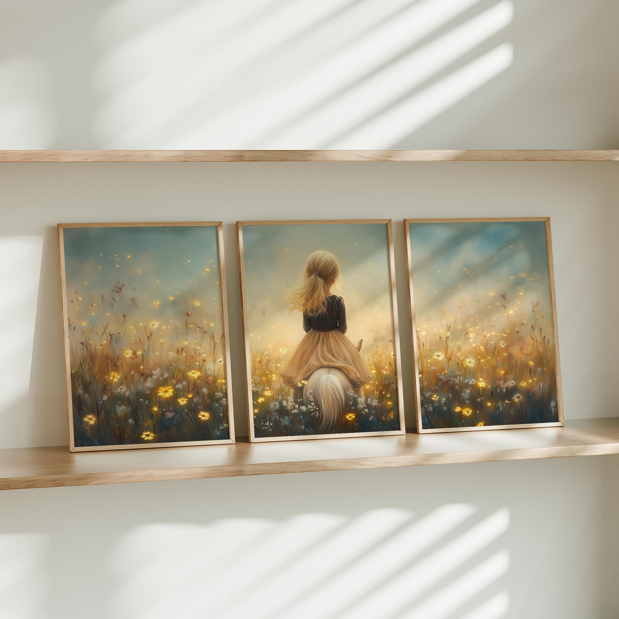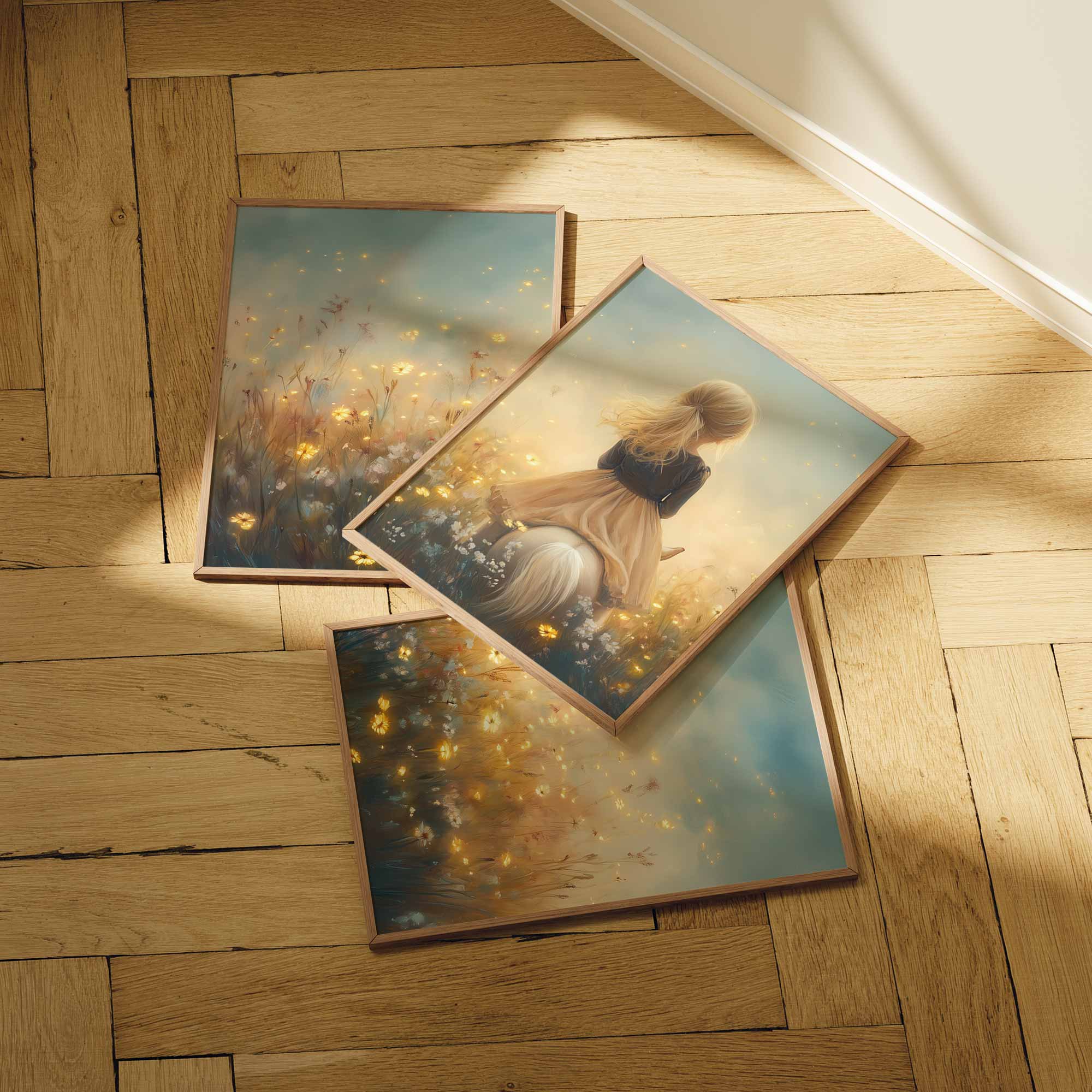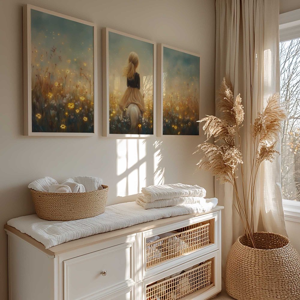 Terug naar collectie / Kinderkamer posters / Avontuurlijk posters / Dromerig Meisje op Paard in Bloemenveld