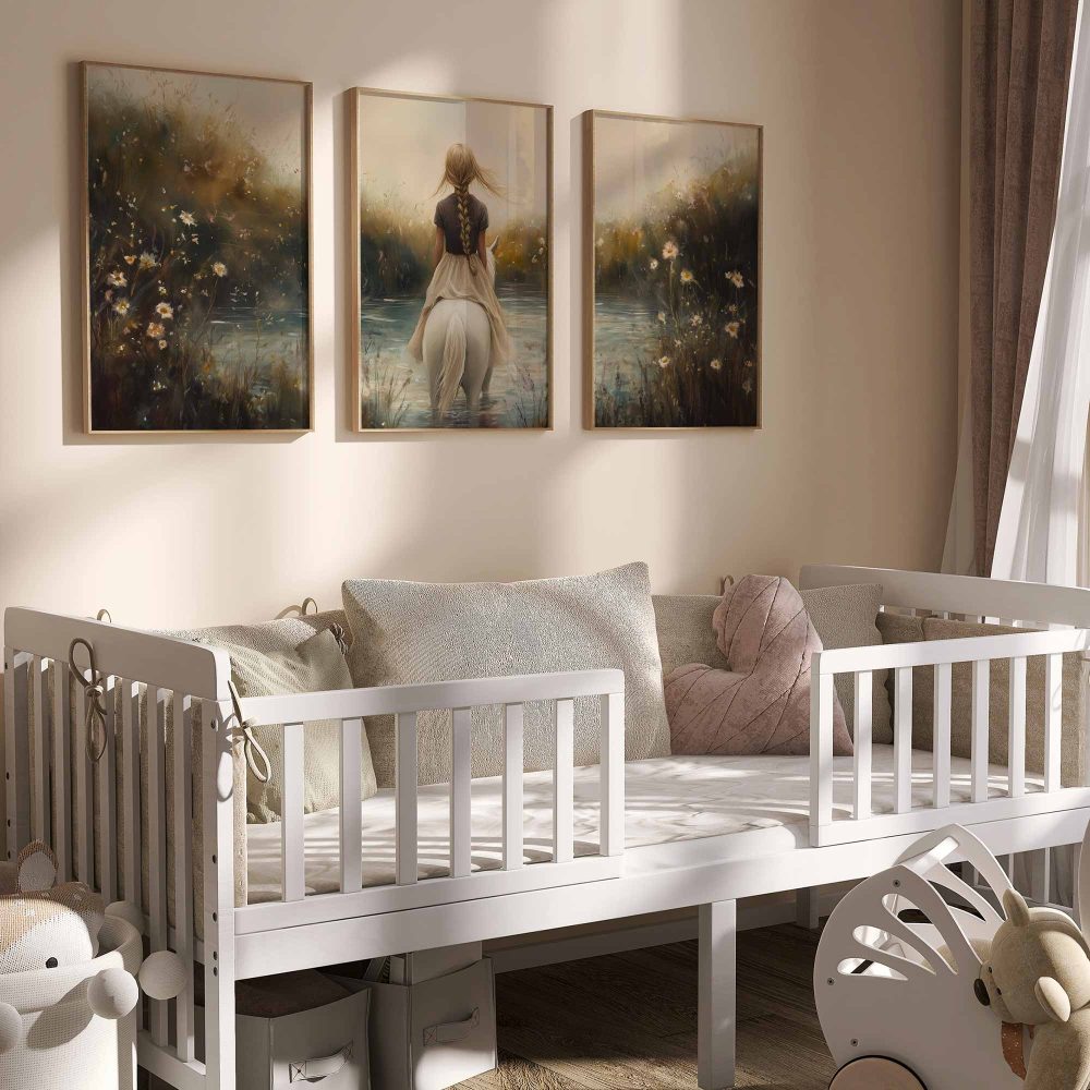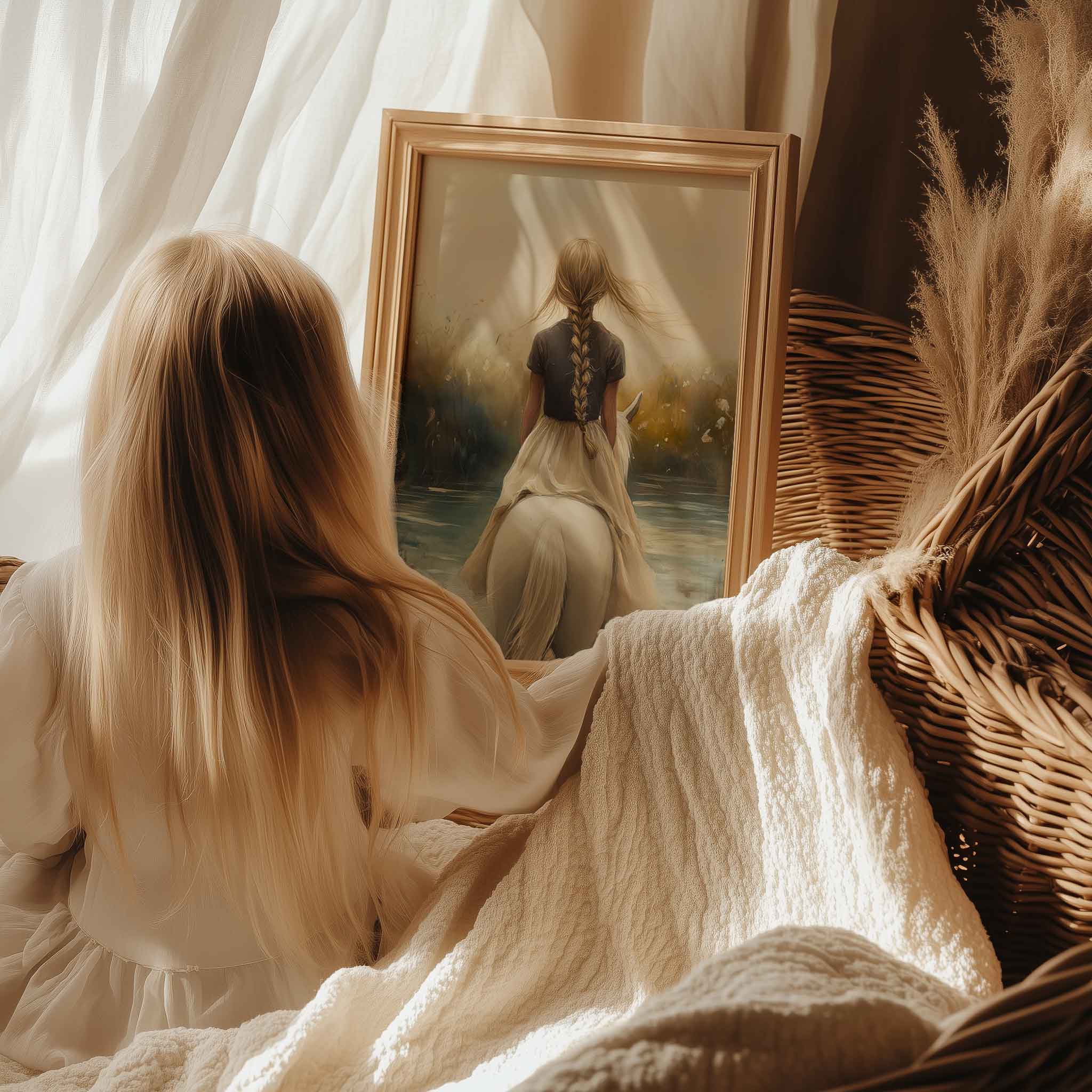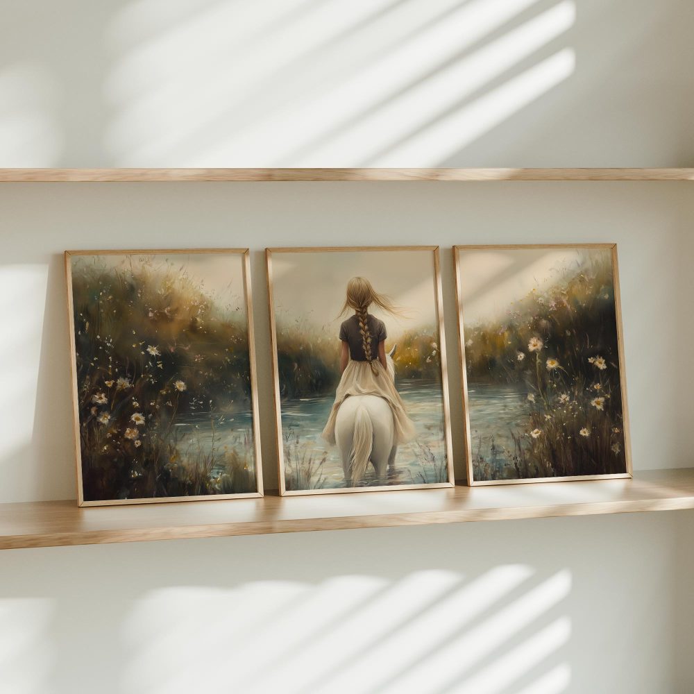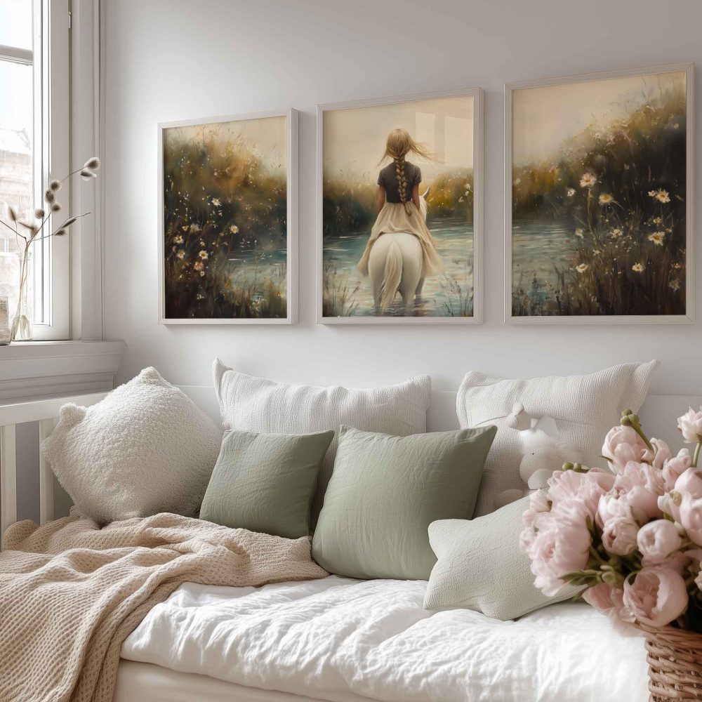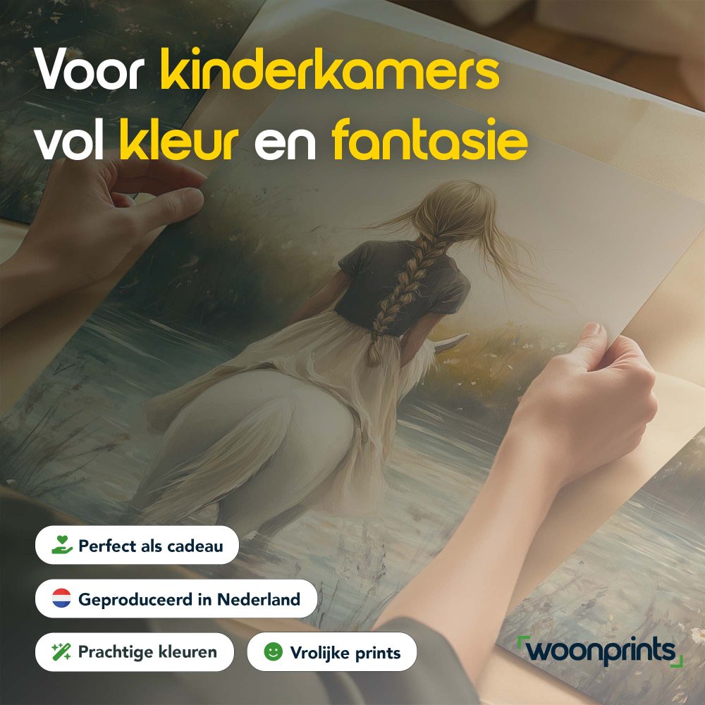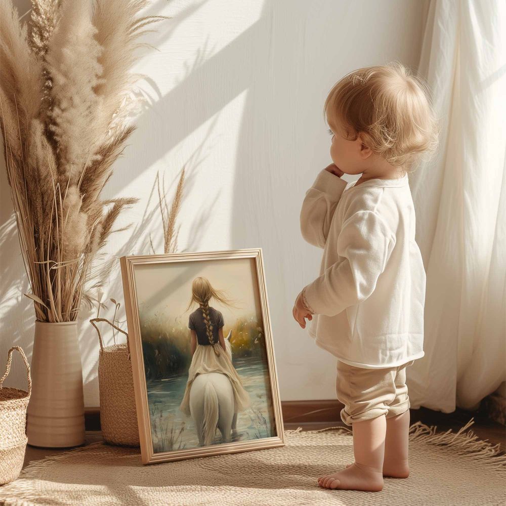 Terug naar collectie / Kinderkamer posters / Bloemen posters / Dromerig Meisje op Wit Paard in Bloemenveld