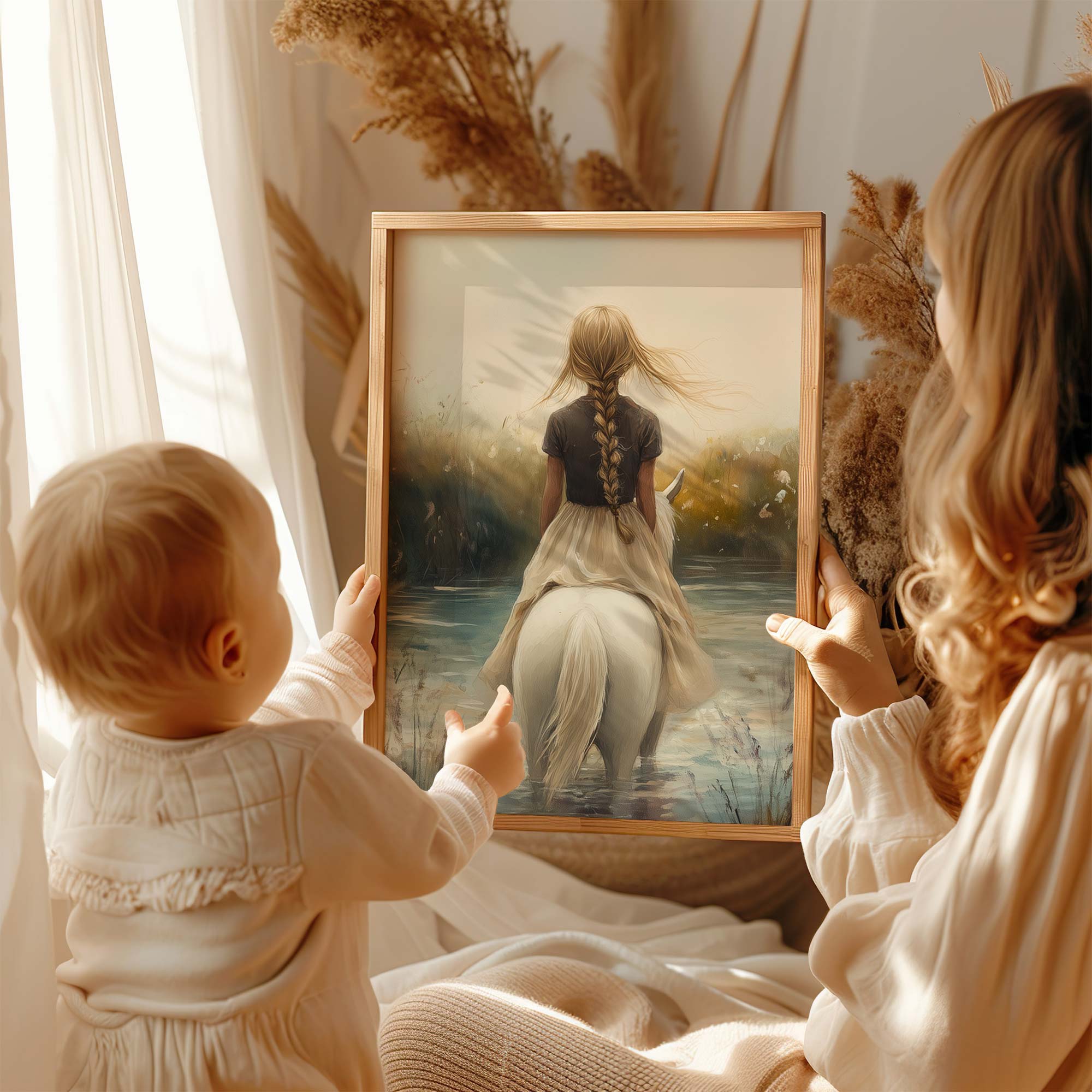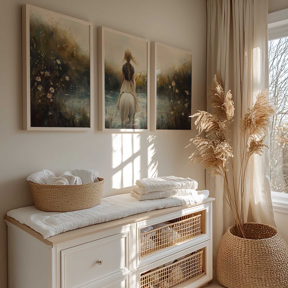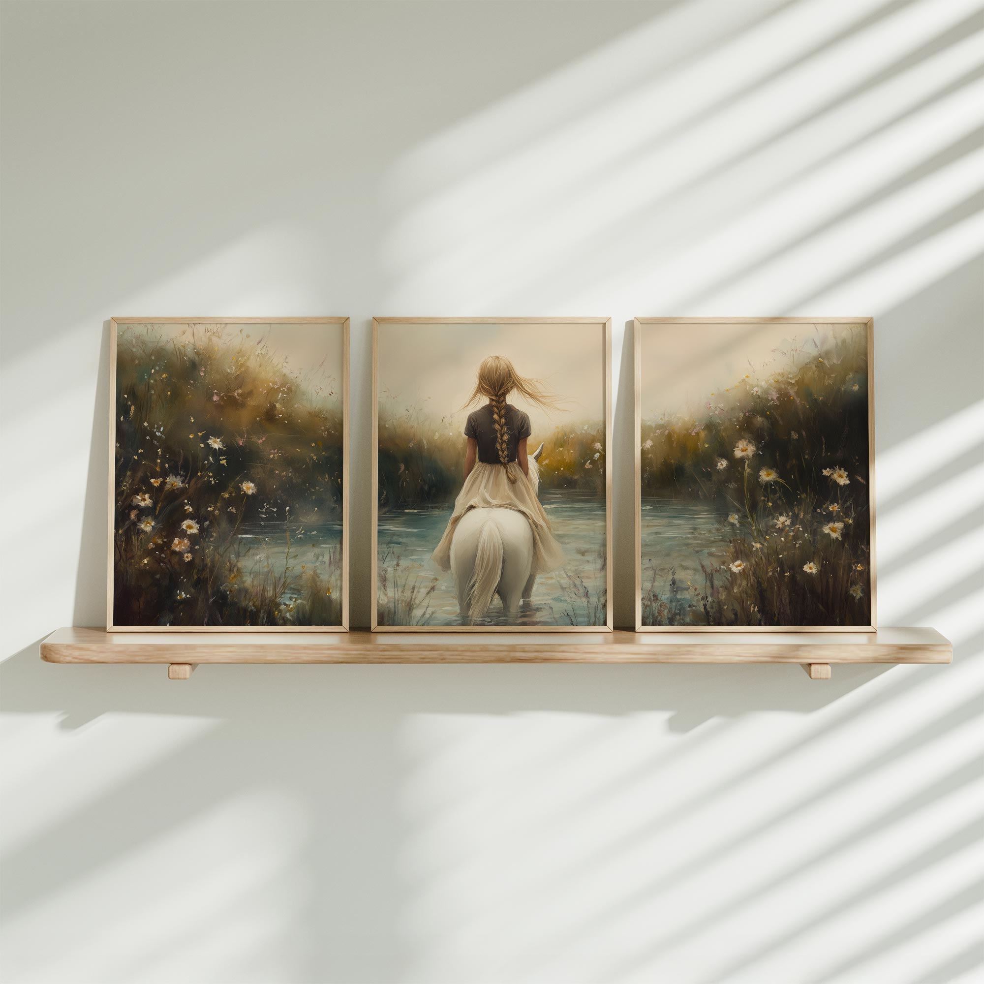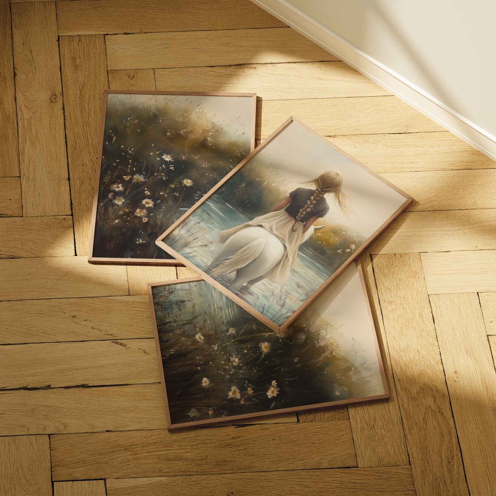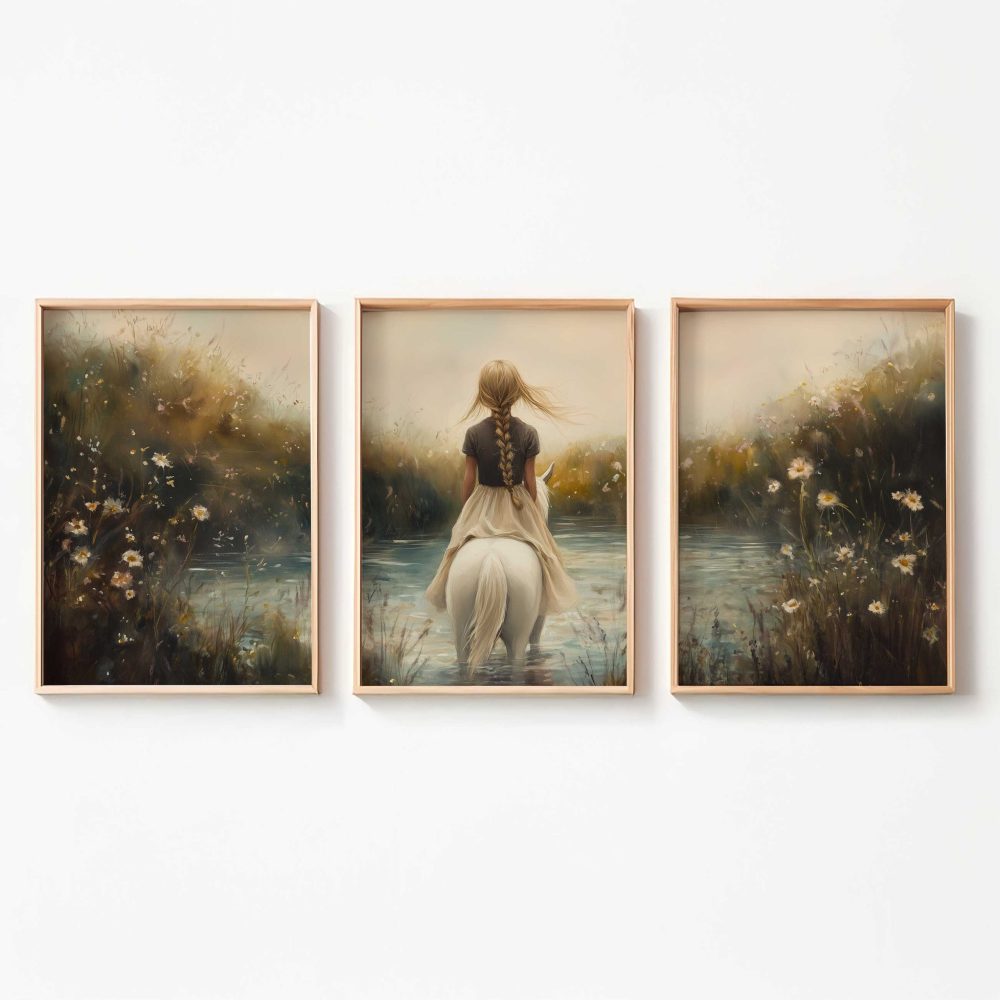 Terug naar collectie / Kinderkamer posters / Bloemen posters / Dromerig Meisje op Wit Paard in Bloemenveld