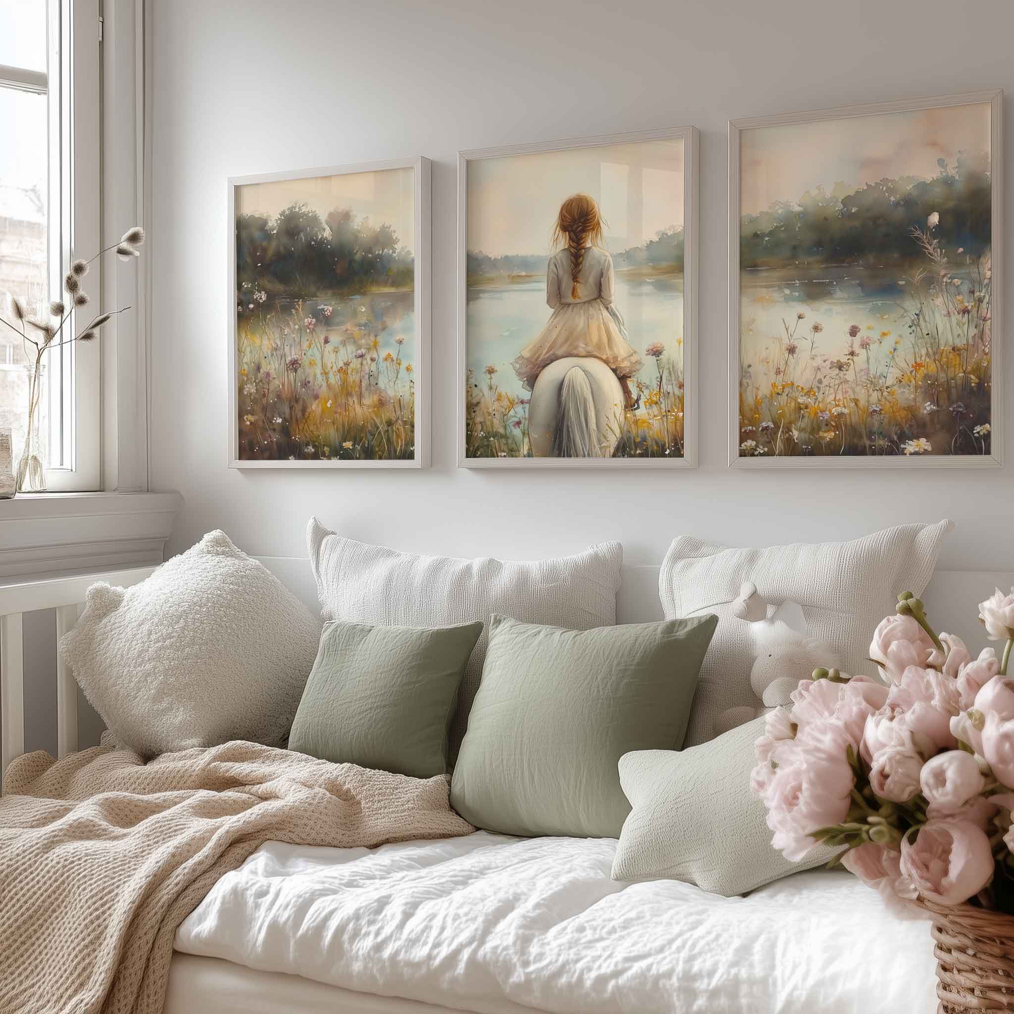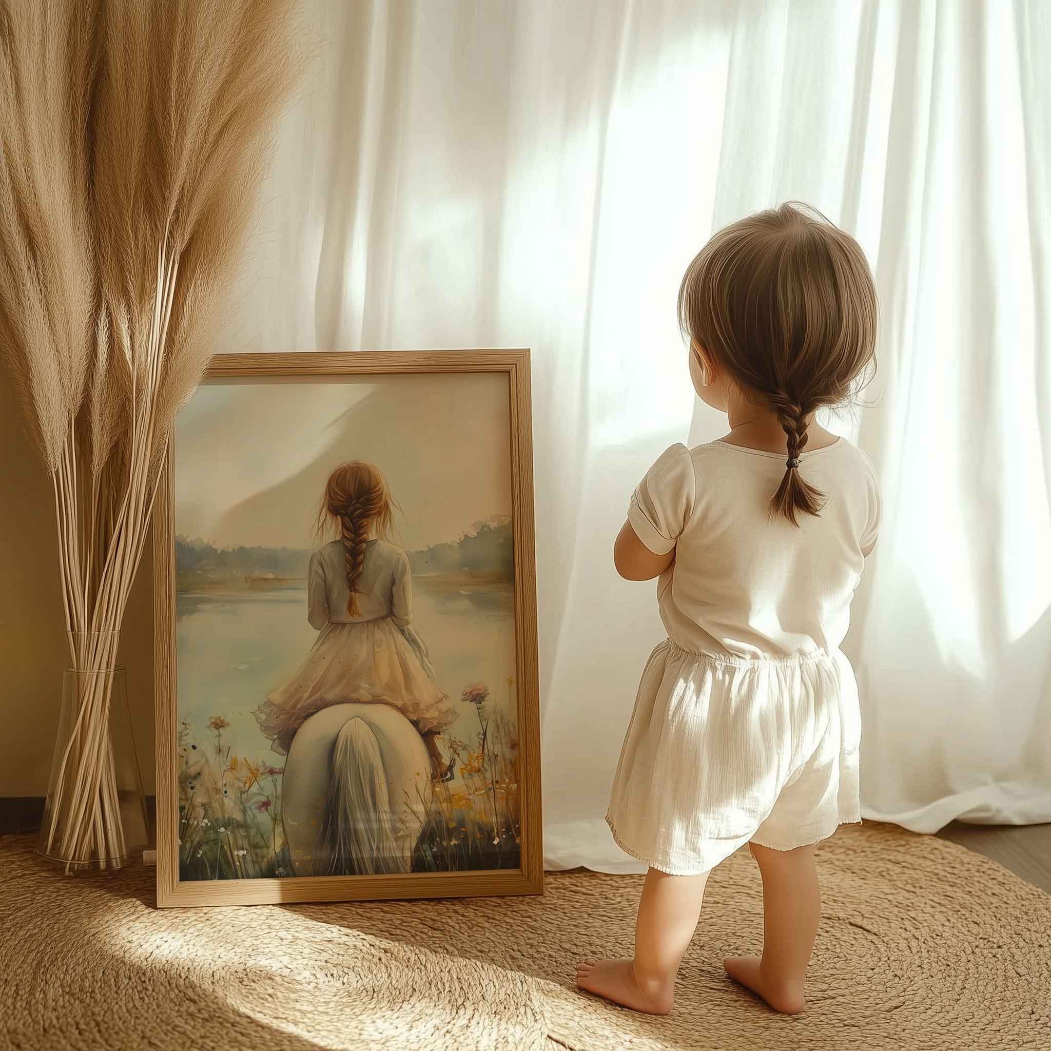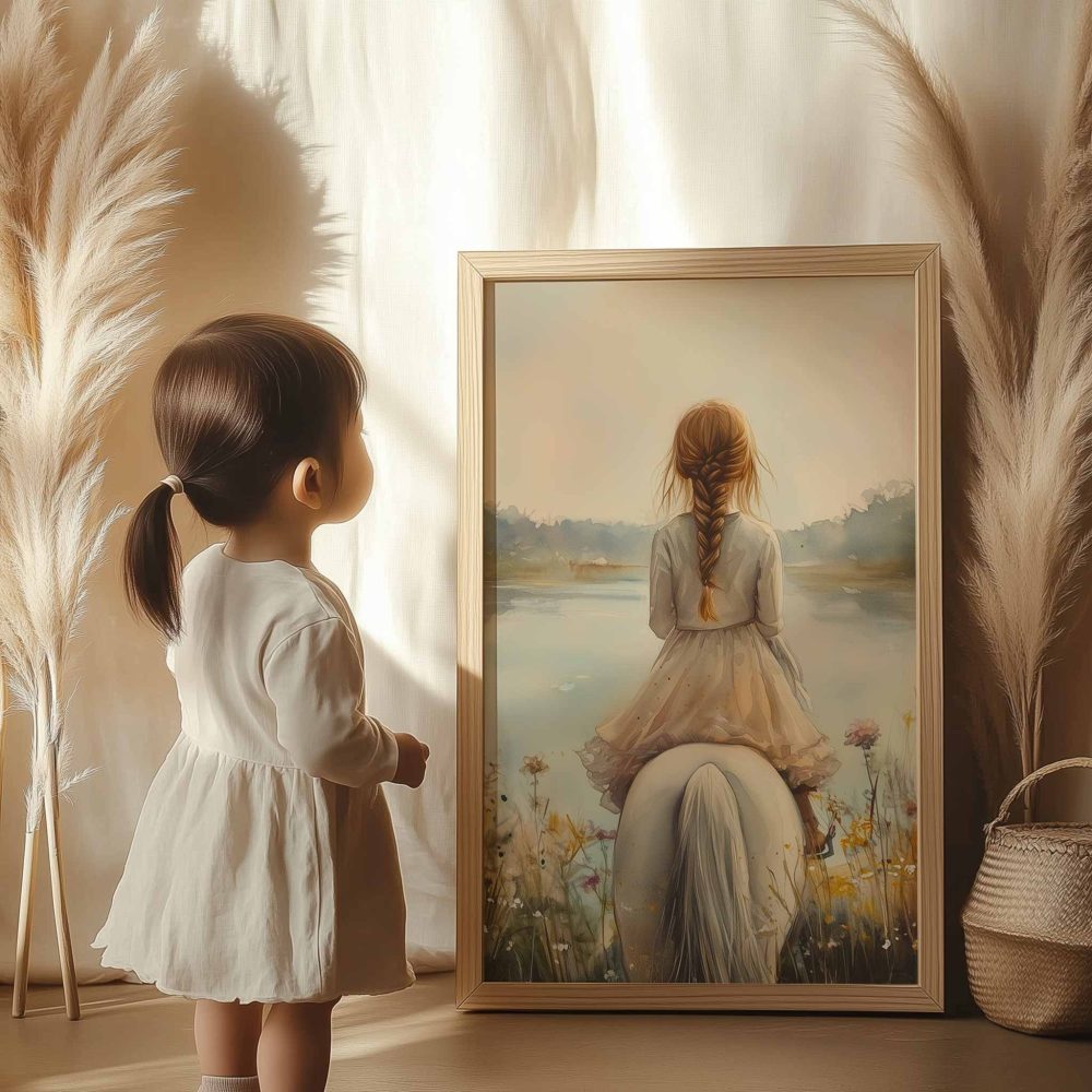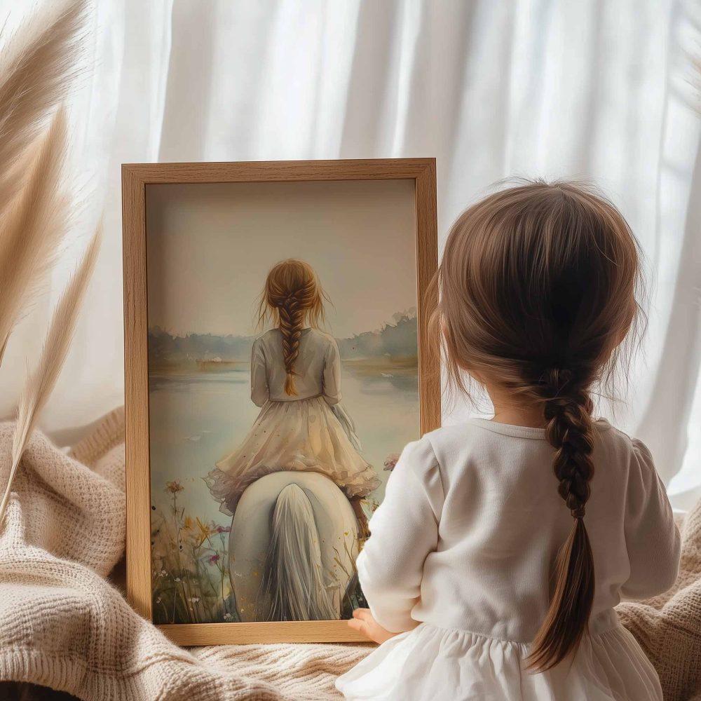 Terug naar collectie / Kinderkamer posters / Bloemen posters / Dromerig Meisje op Wit Paard tussen Wilde Bloemen