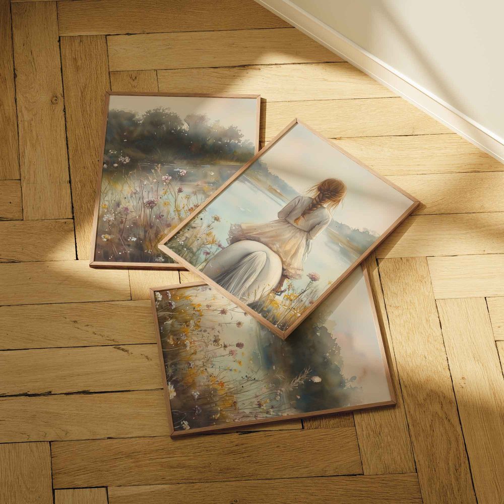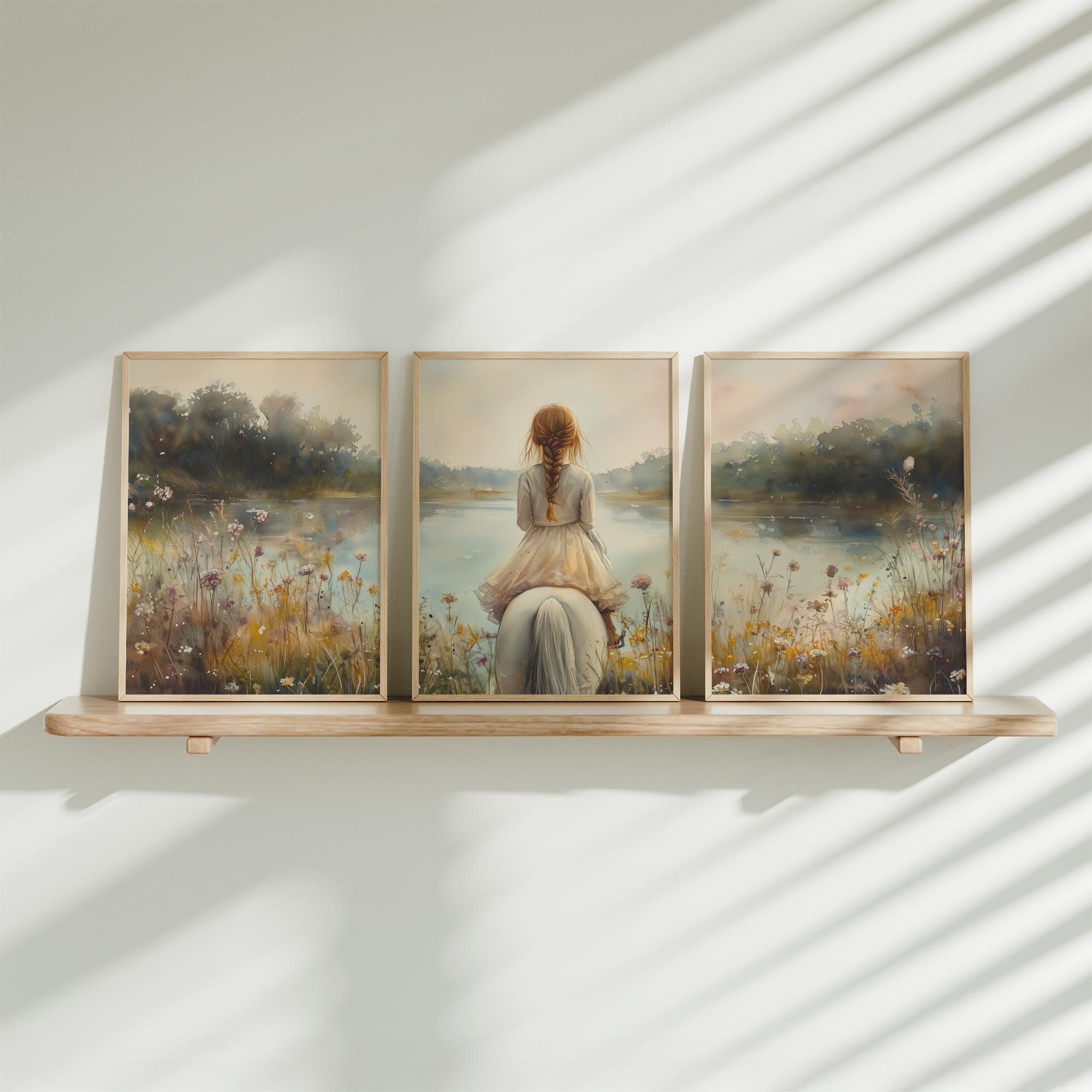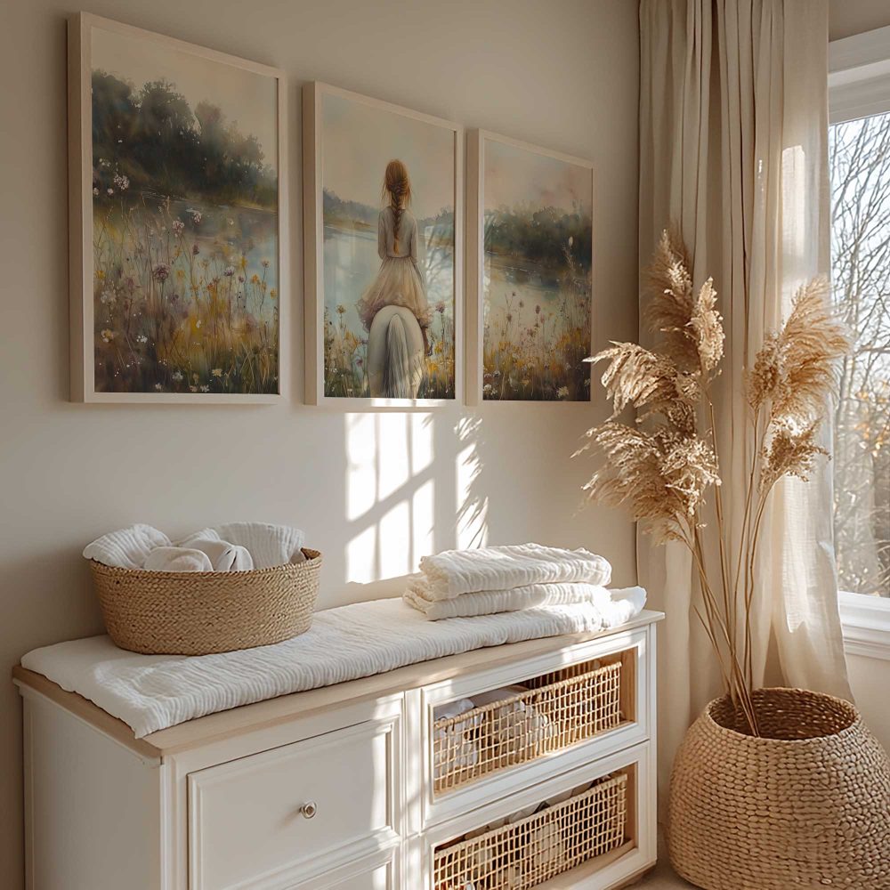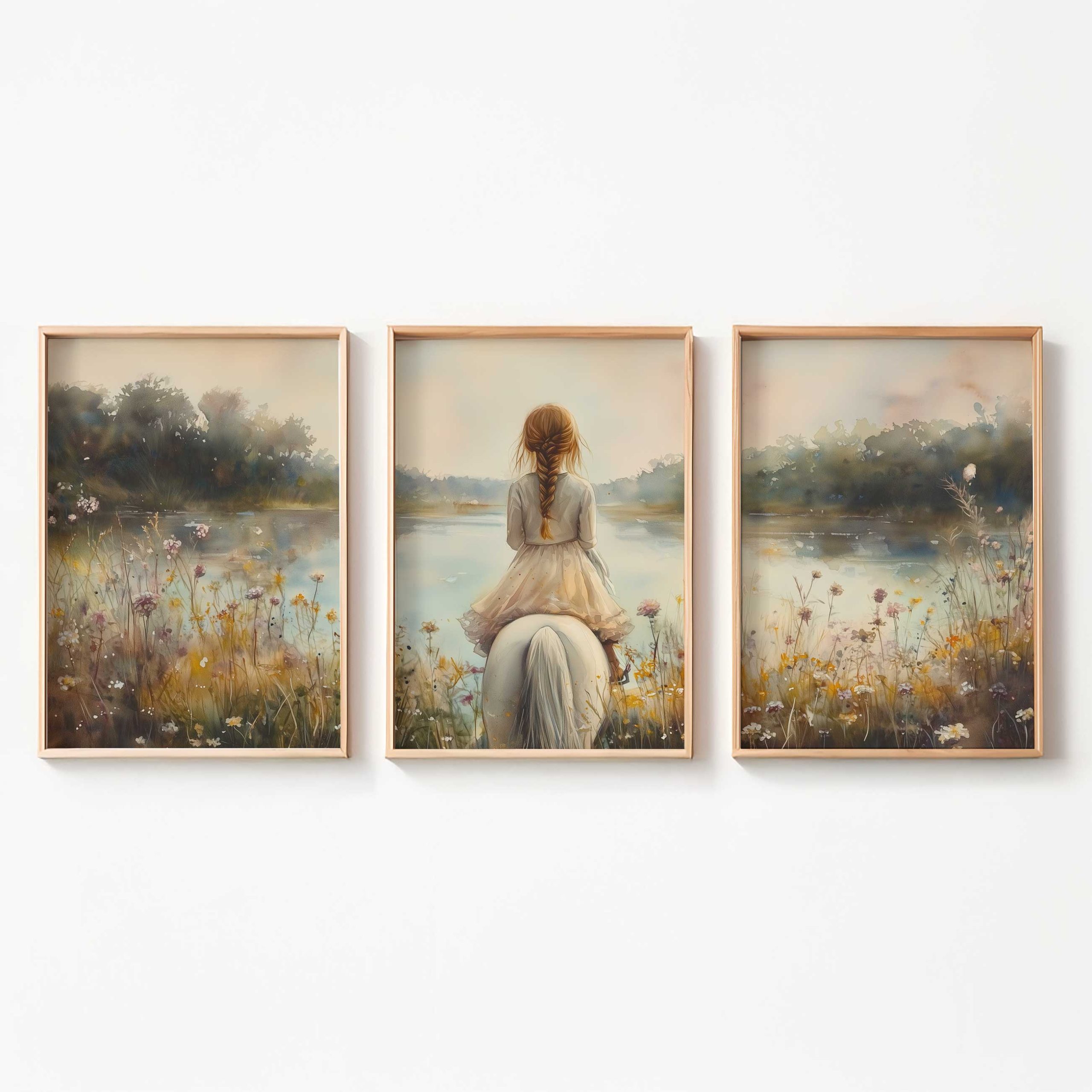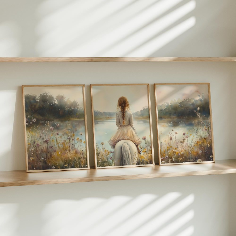 Terug naar collectie / Kinderkamer posters / Bloemen posters / Dromerig Meisje op Wit Paard tussen Wilde Bloemen