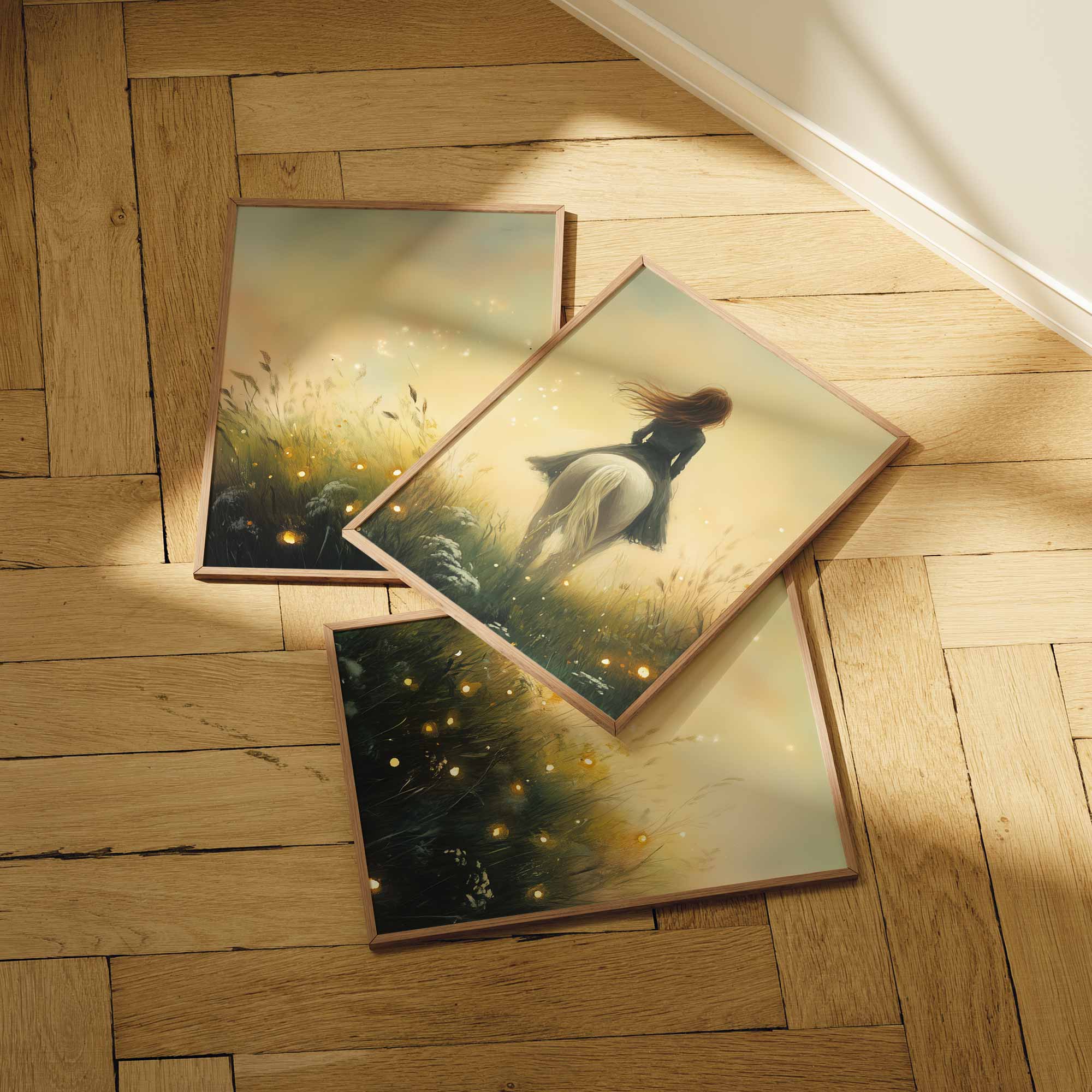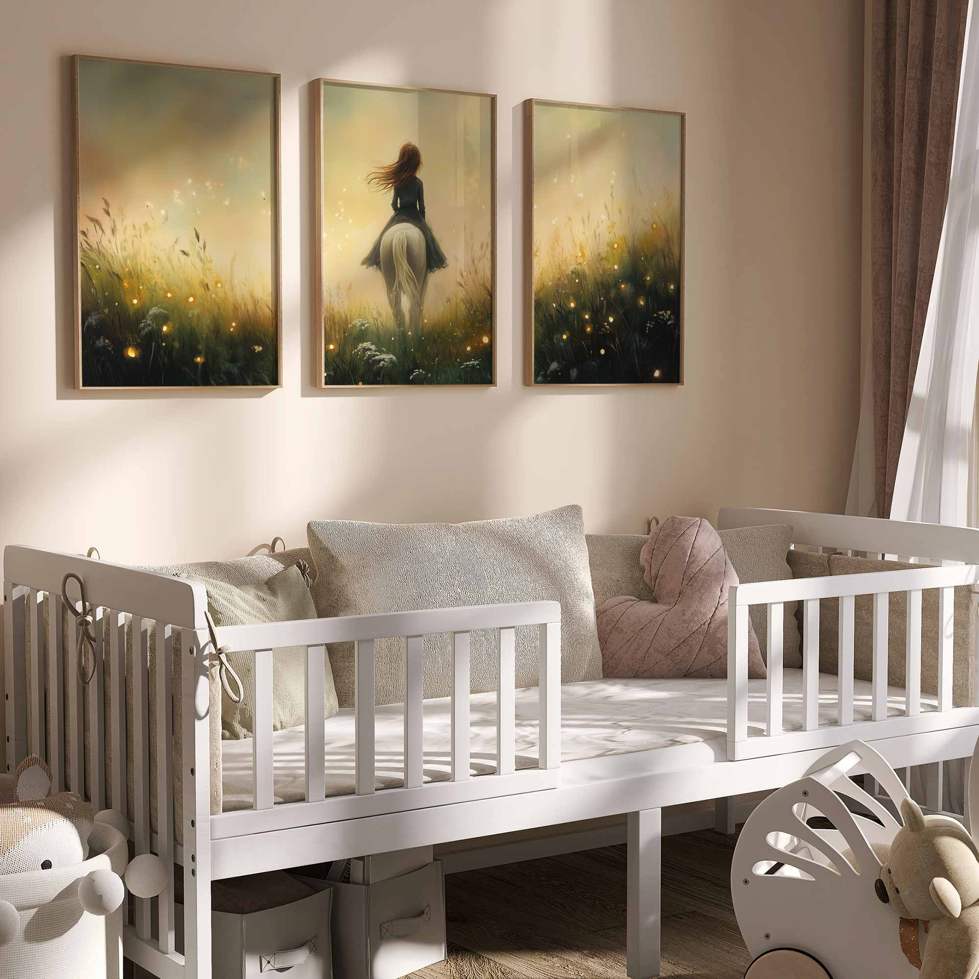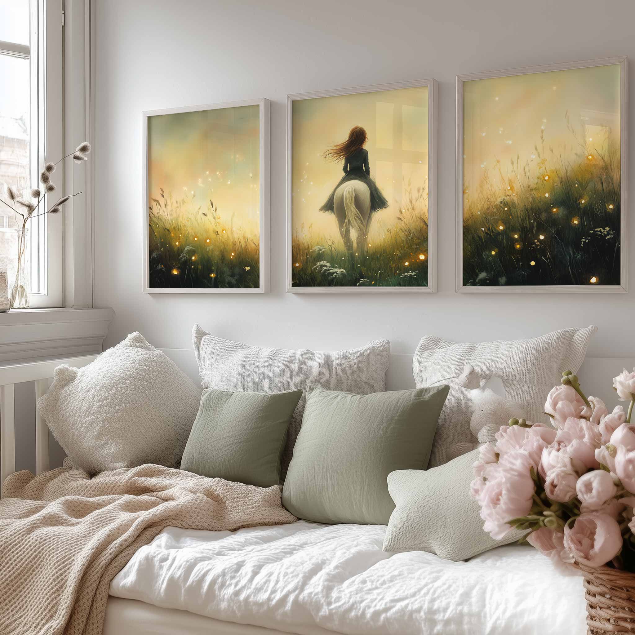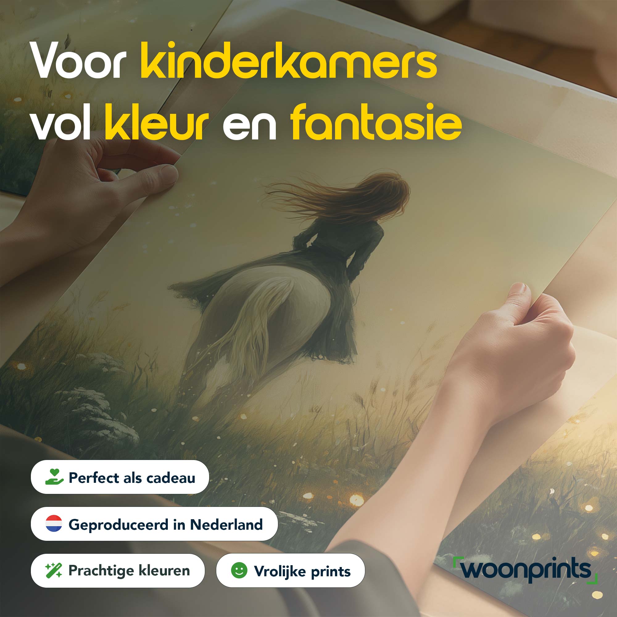 Terug naar collectie / Kinderkamer posters / Bloemen posters / Dromerig Meisje op Witte Paard in Bloemenveld
