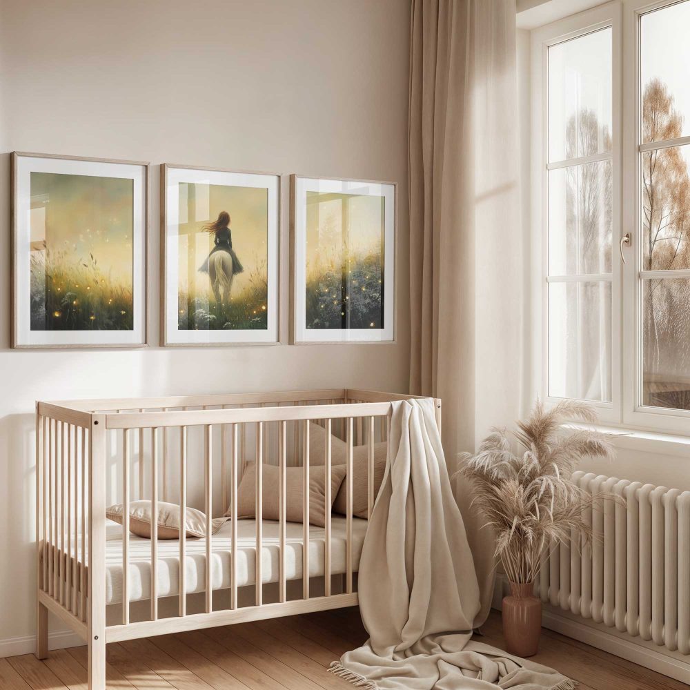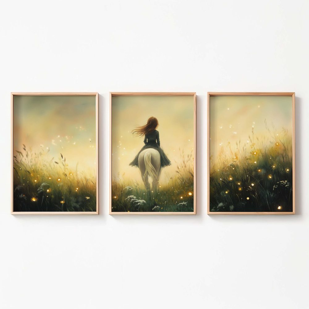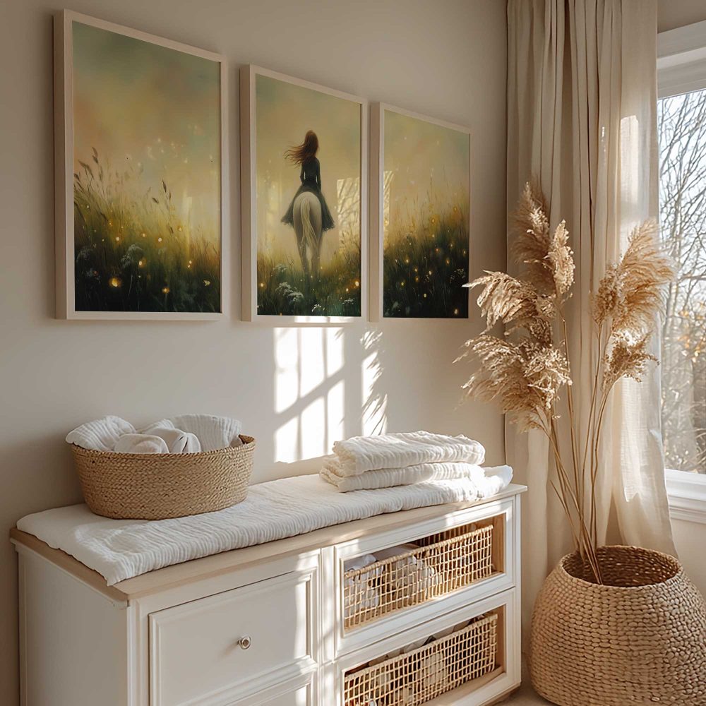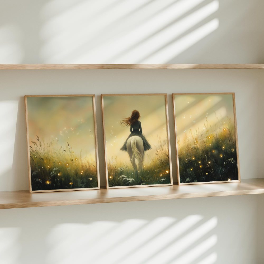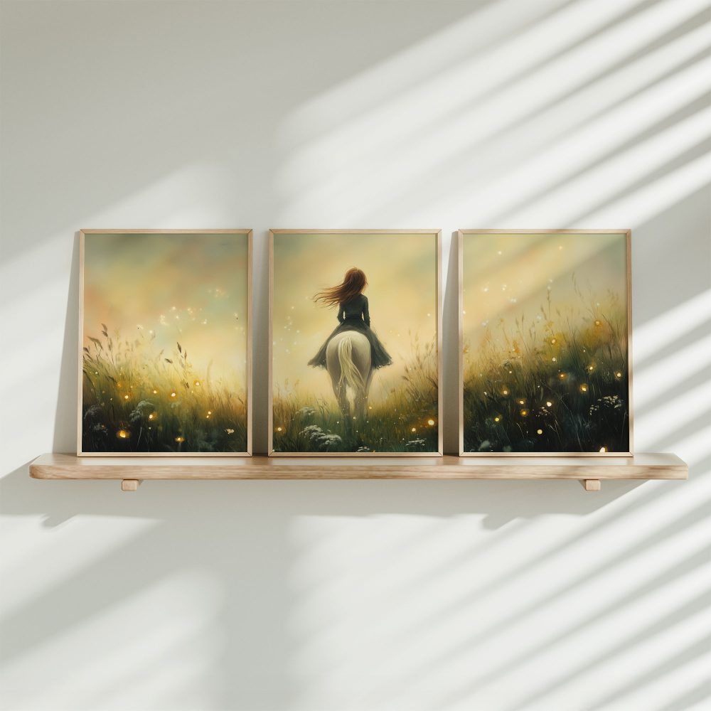 Terug naar collectie / Kinderkamer posters / Bloemen posters / Dromerig Meisje op Witte Paard in Bloemenveld