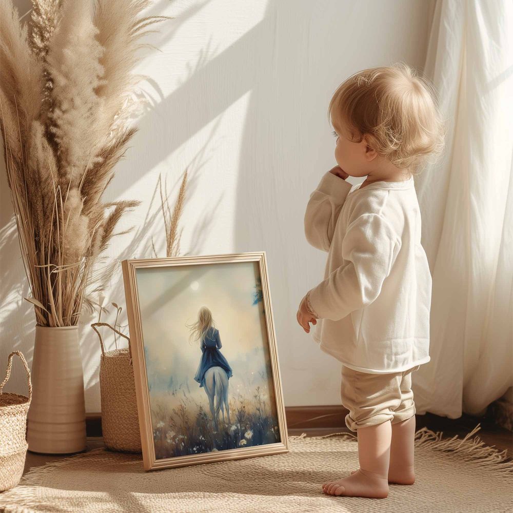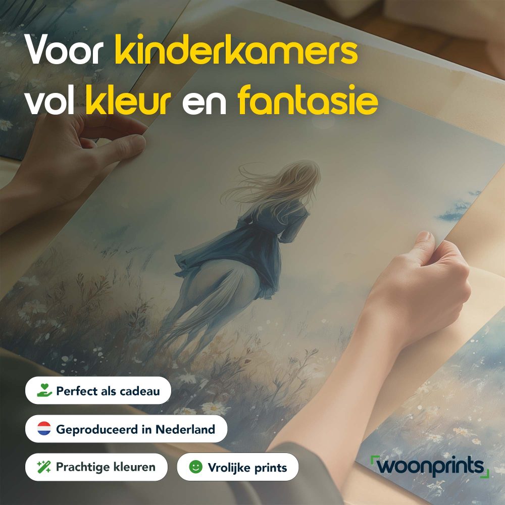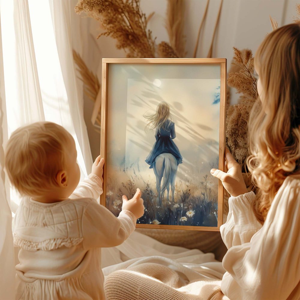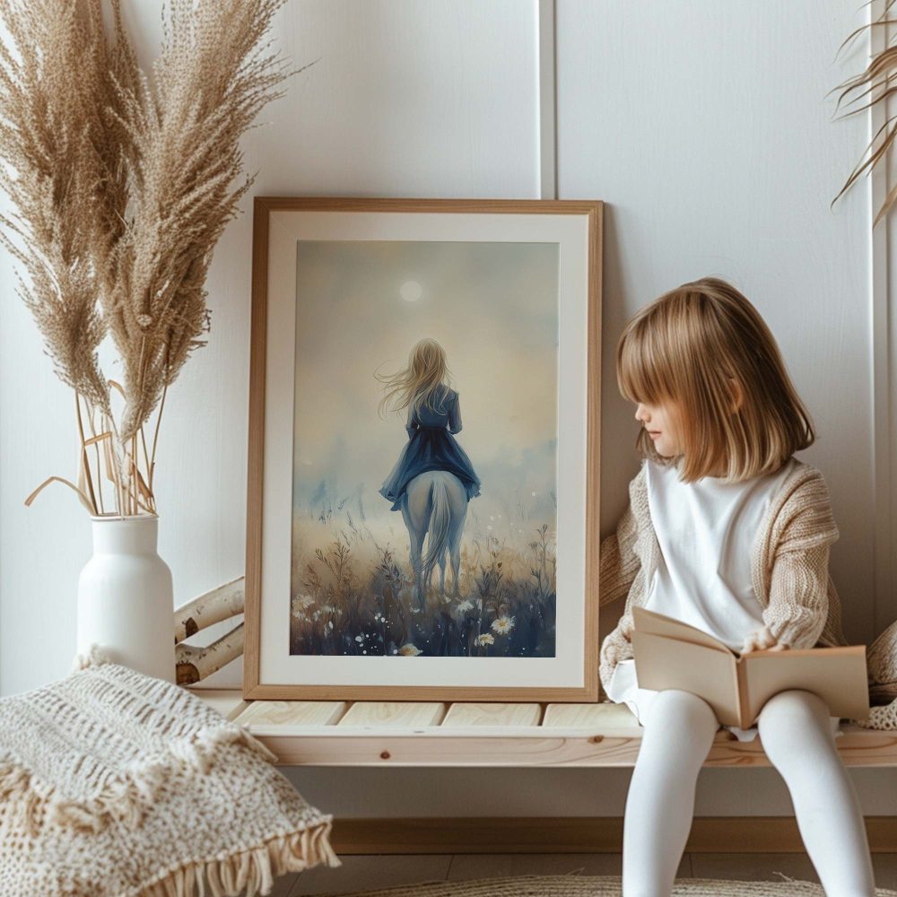 Terug naar collectie / Kinderkamer posters / Bloemen posters / Dromerig Meisje te Paard in Bloeiend Landschap