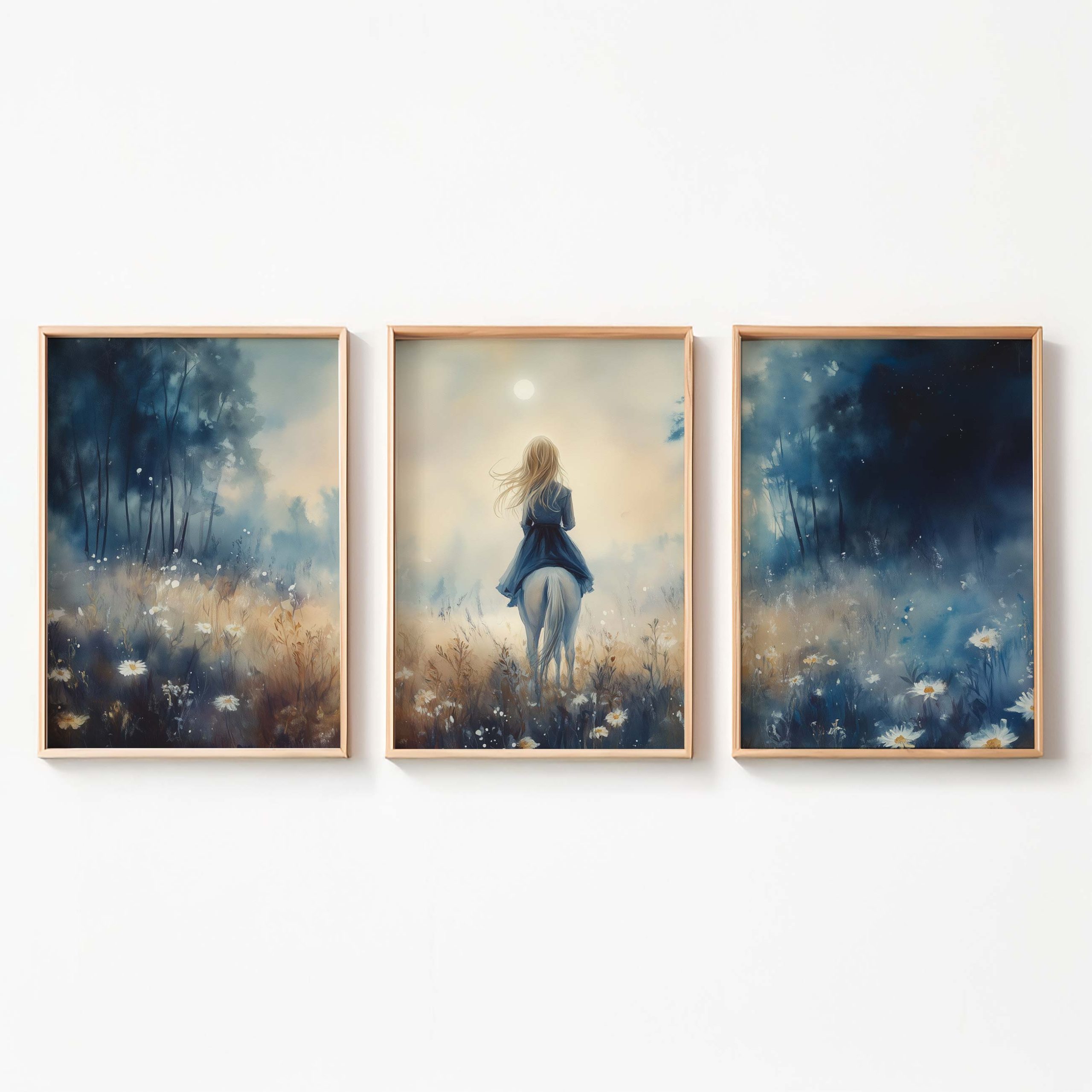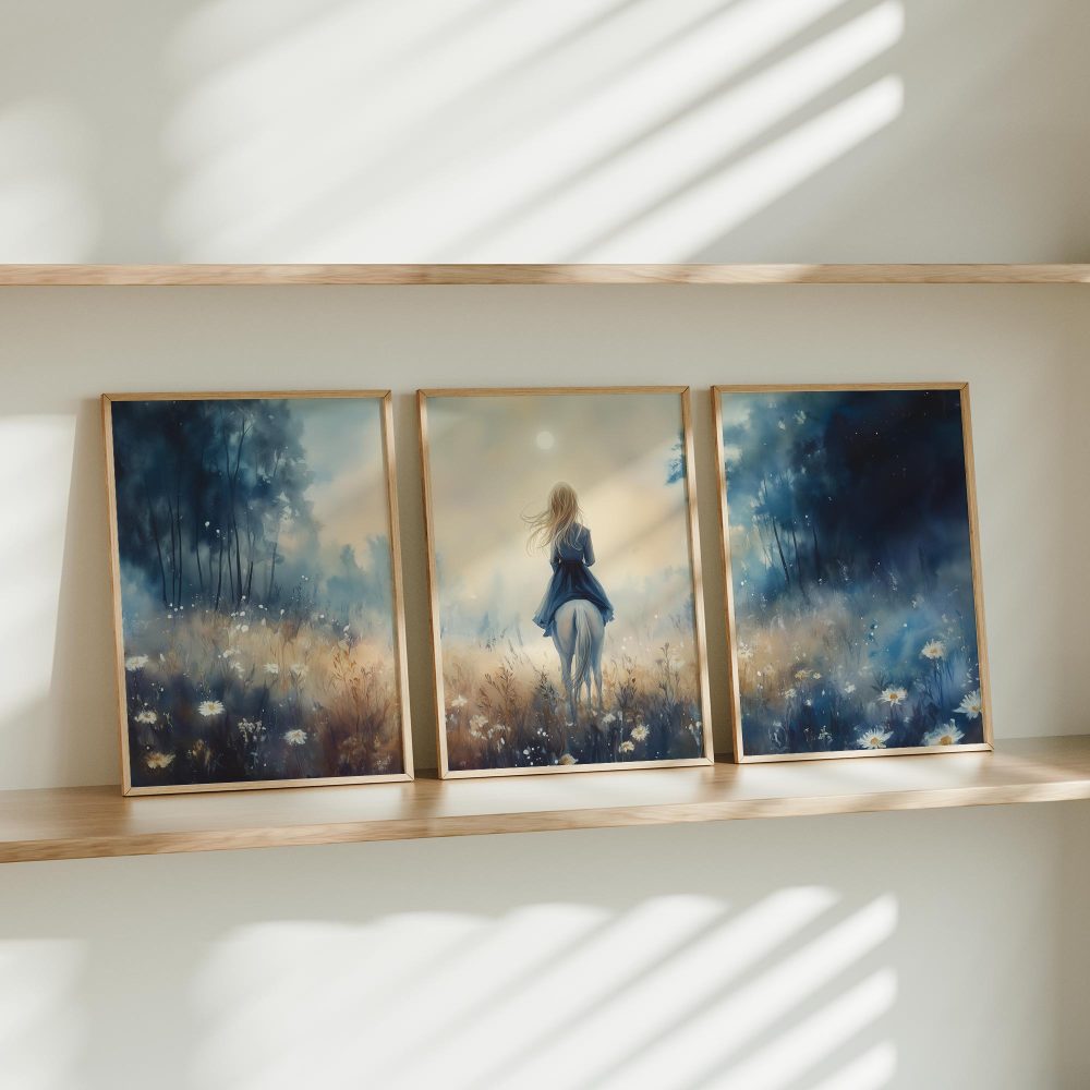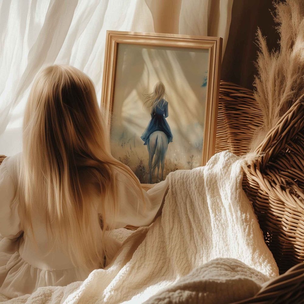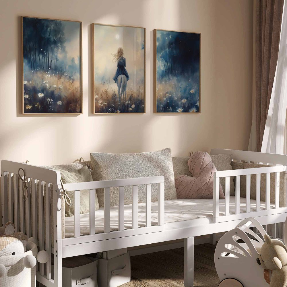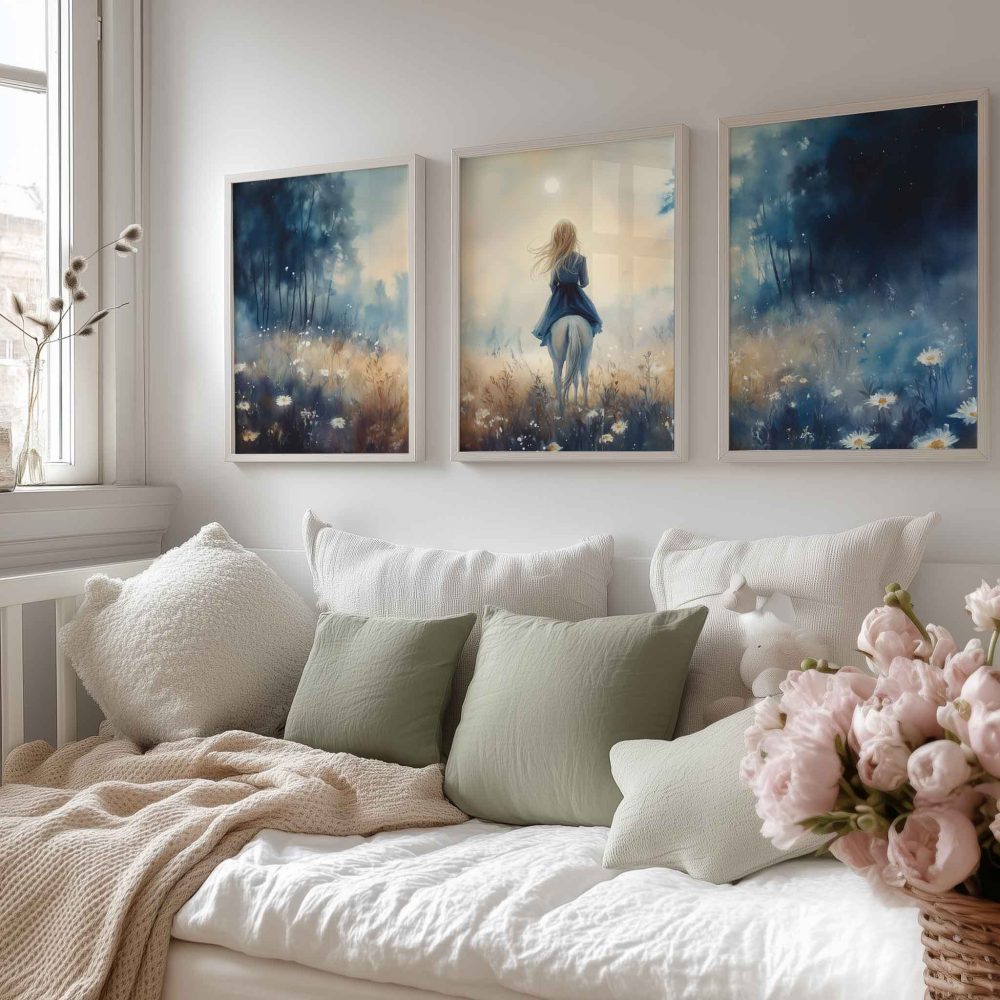 Terug naar collectie / Kinderkamer posters / Bloemen posters / Dromerig Meisje te Paard in Bloeiend Landschap