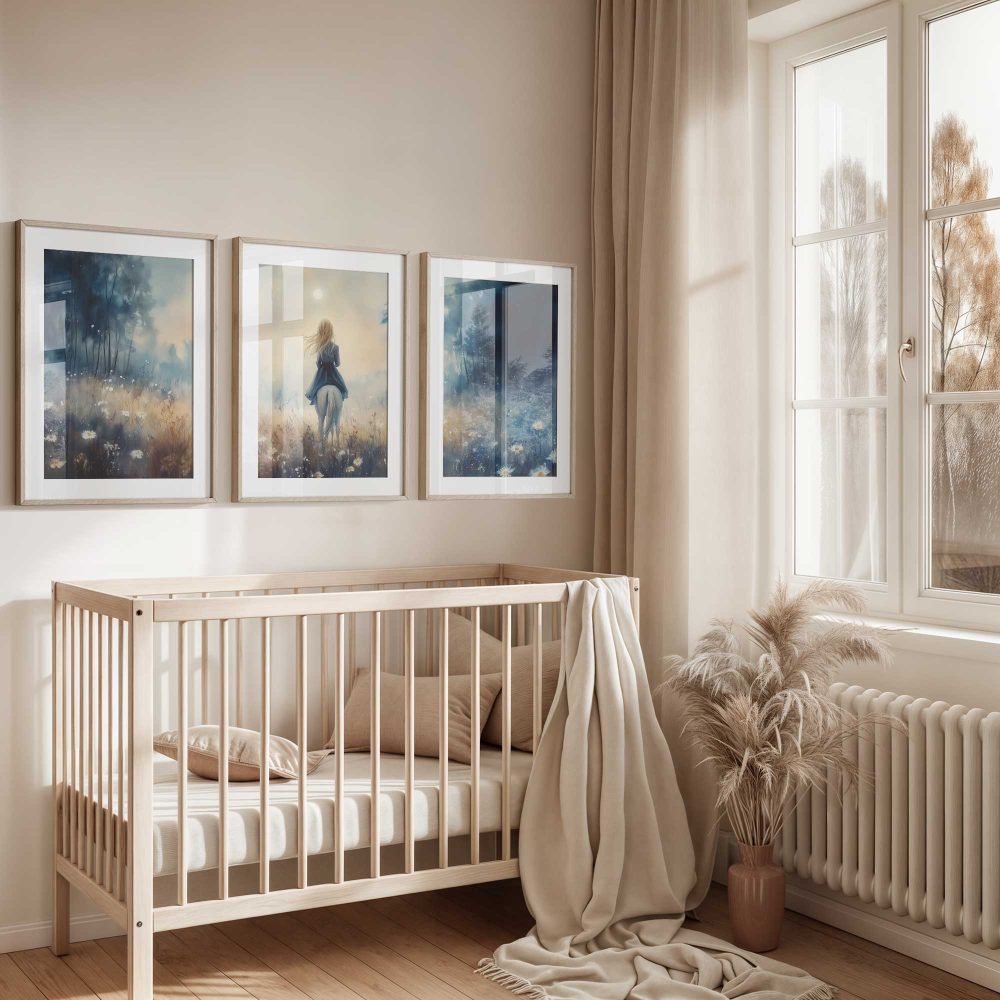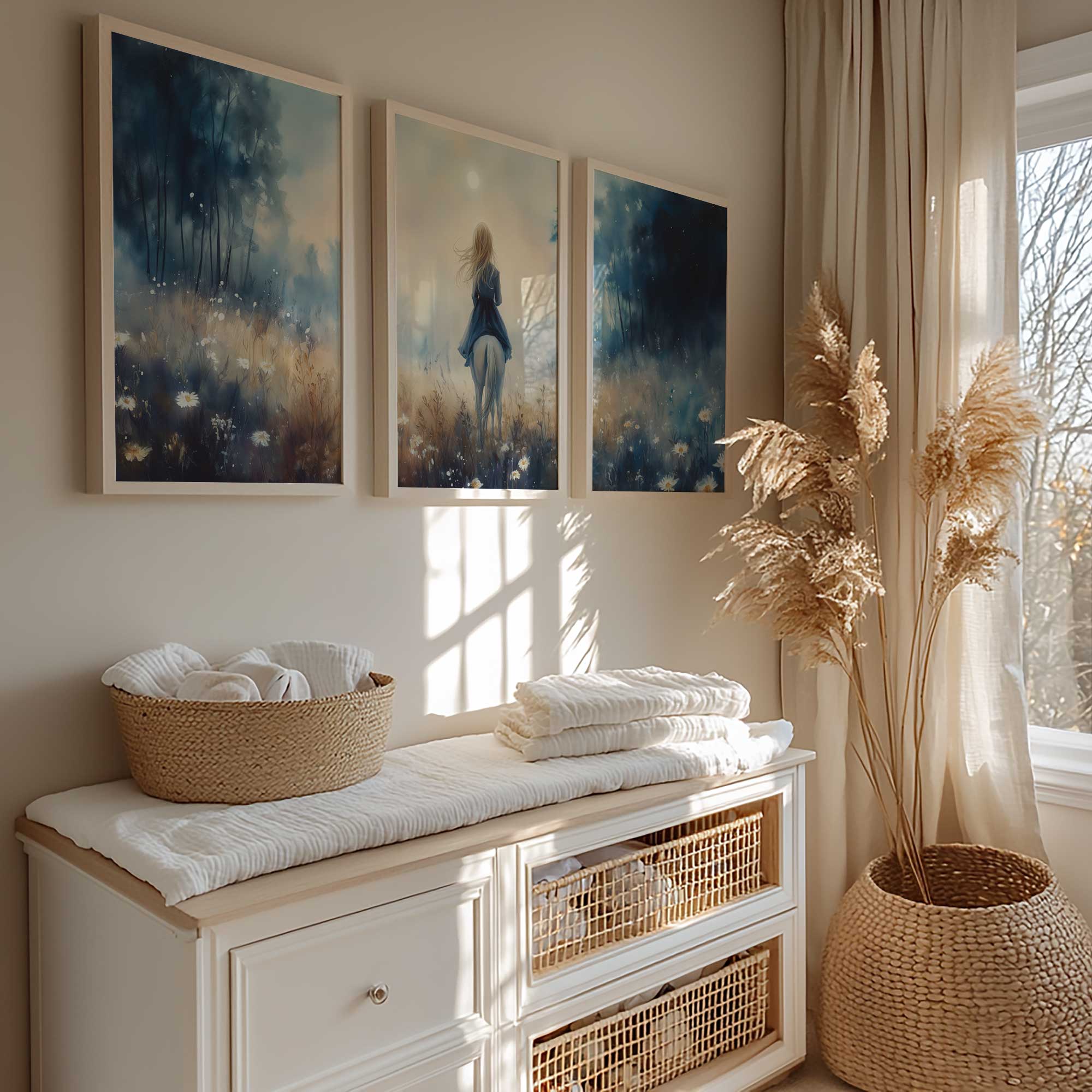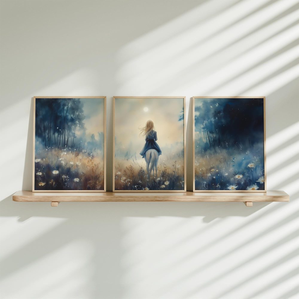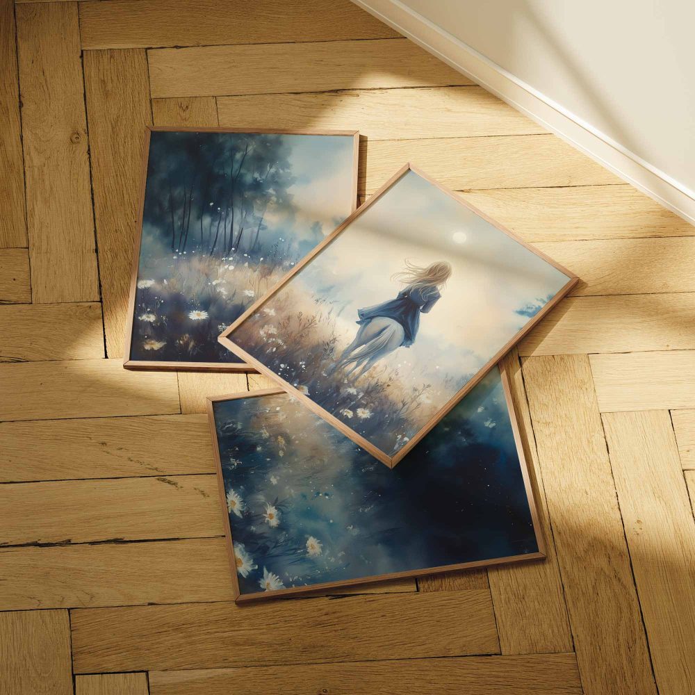 Terug naar collectie / Kinderkamer posters / Bloemen posters / Dromerig Meisje te Paard in Bloeiend Landschap