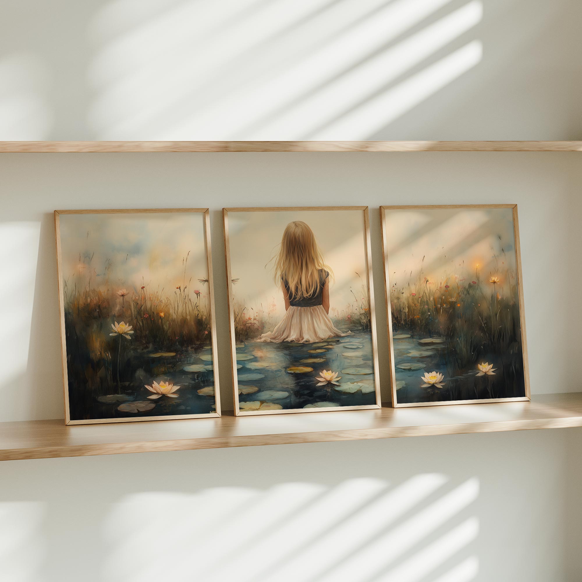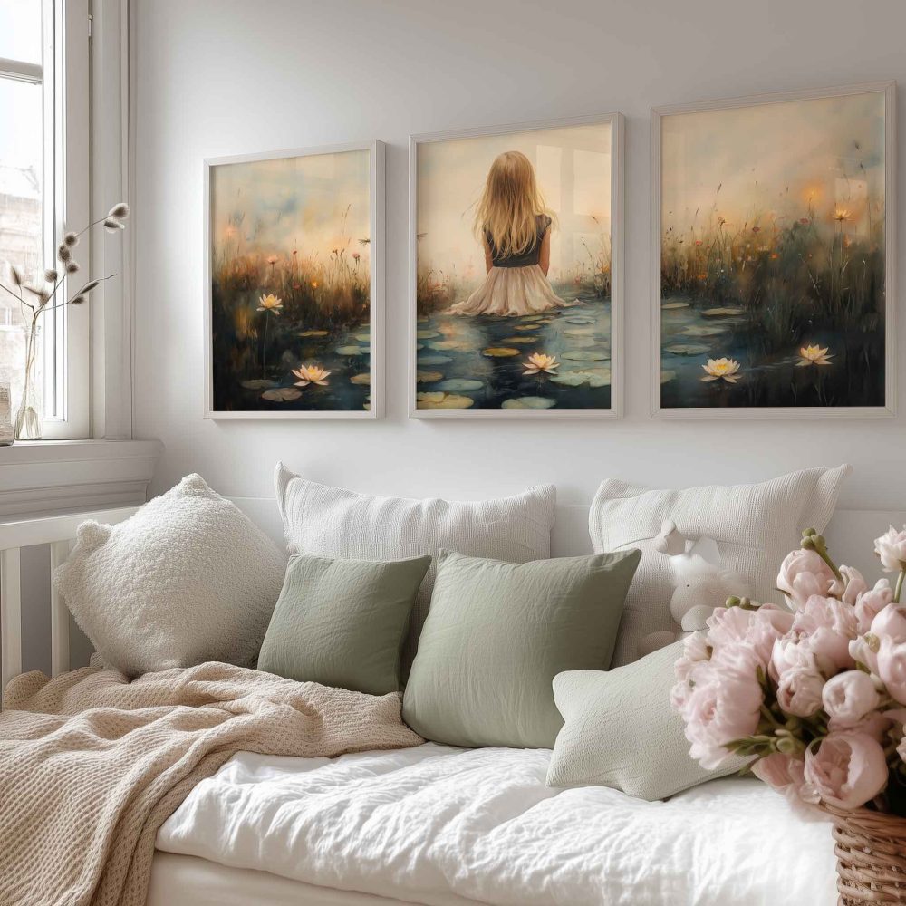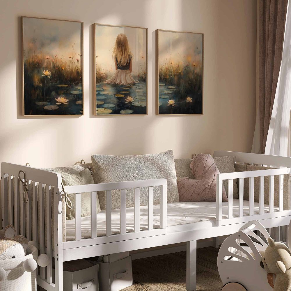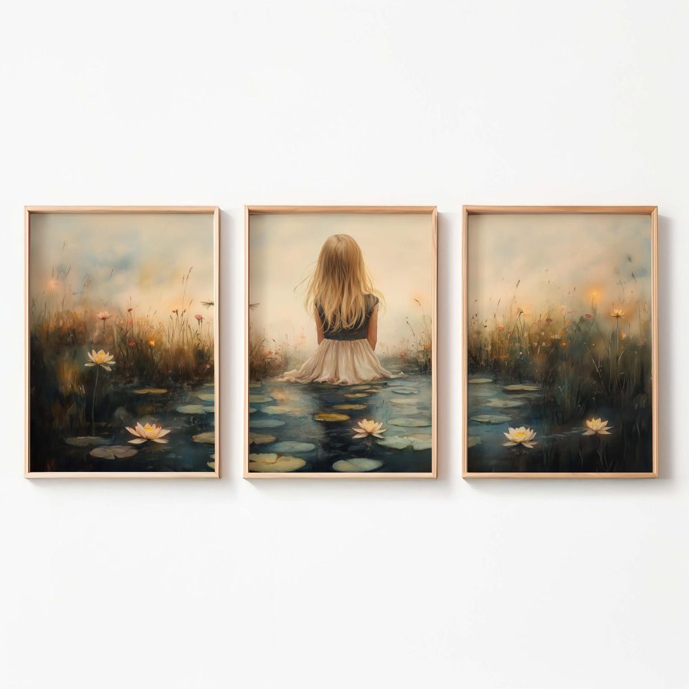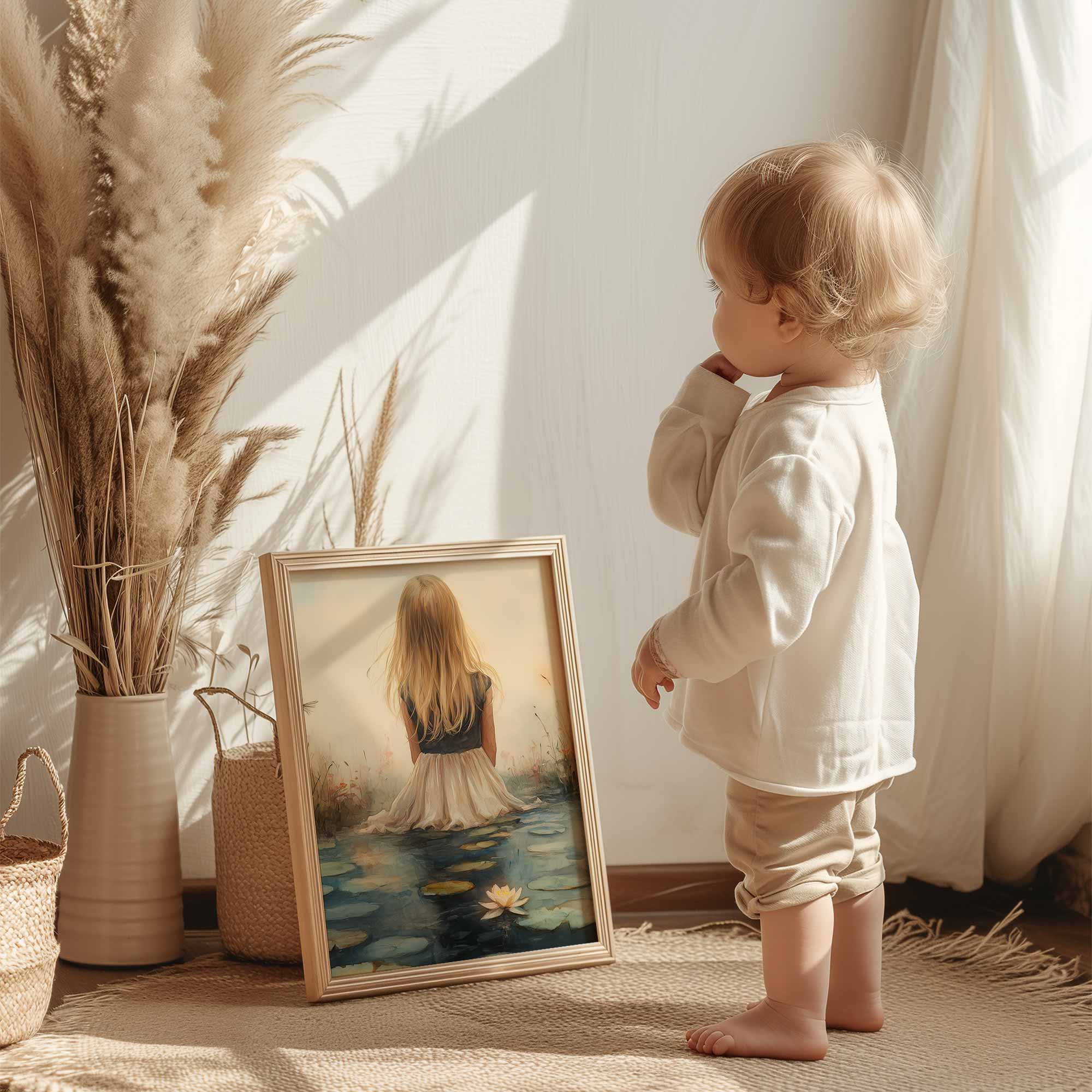 Terug naar collectie / Kinderkamer posters / Bloemen posters / Dromerig meisje tussen waterlelies en bloemen