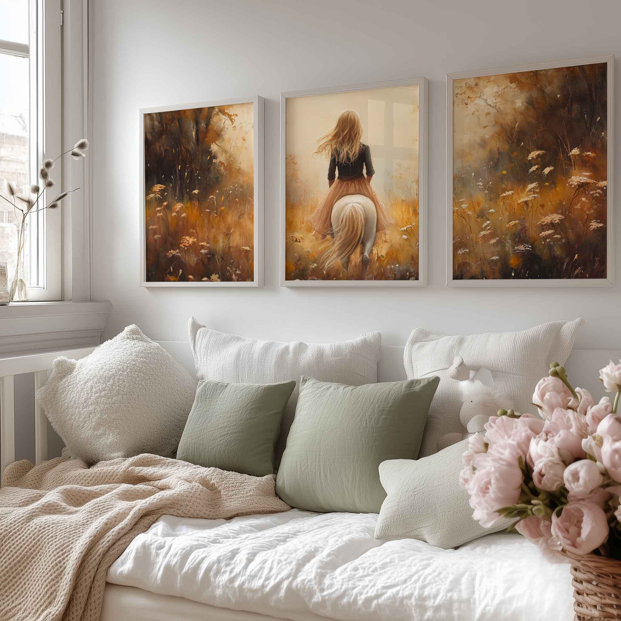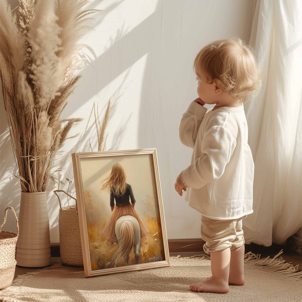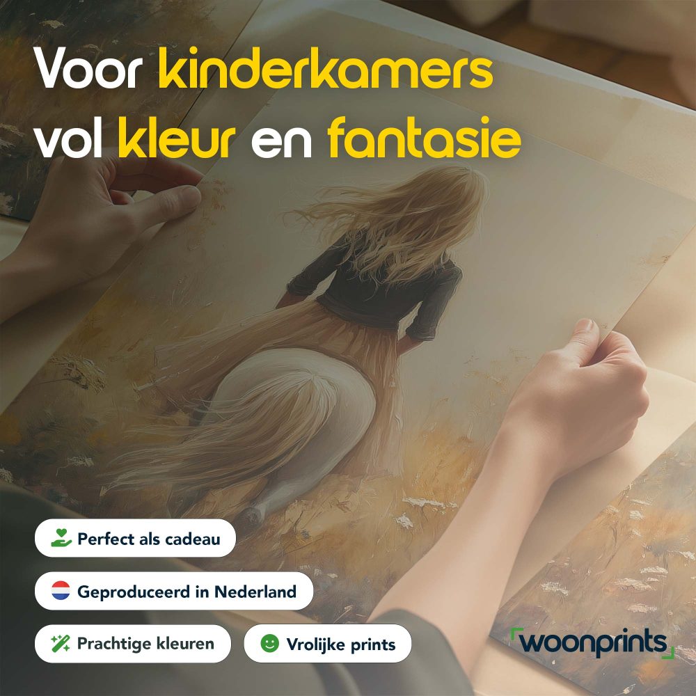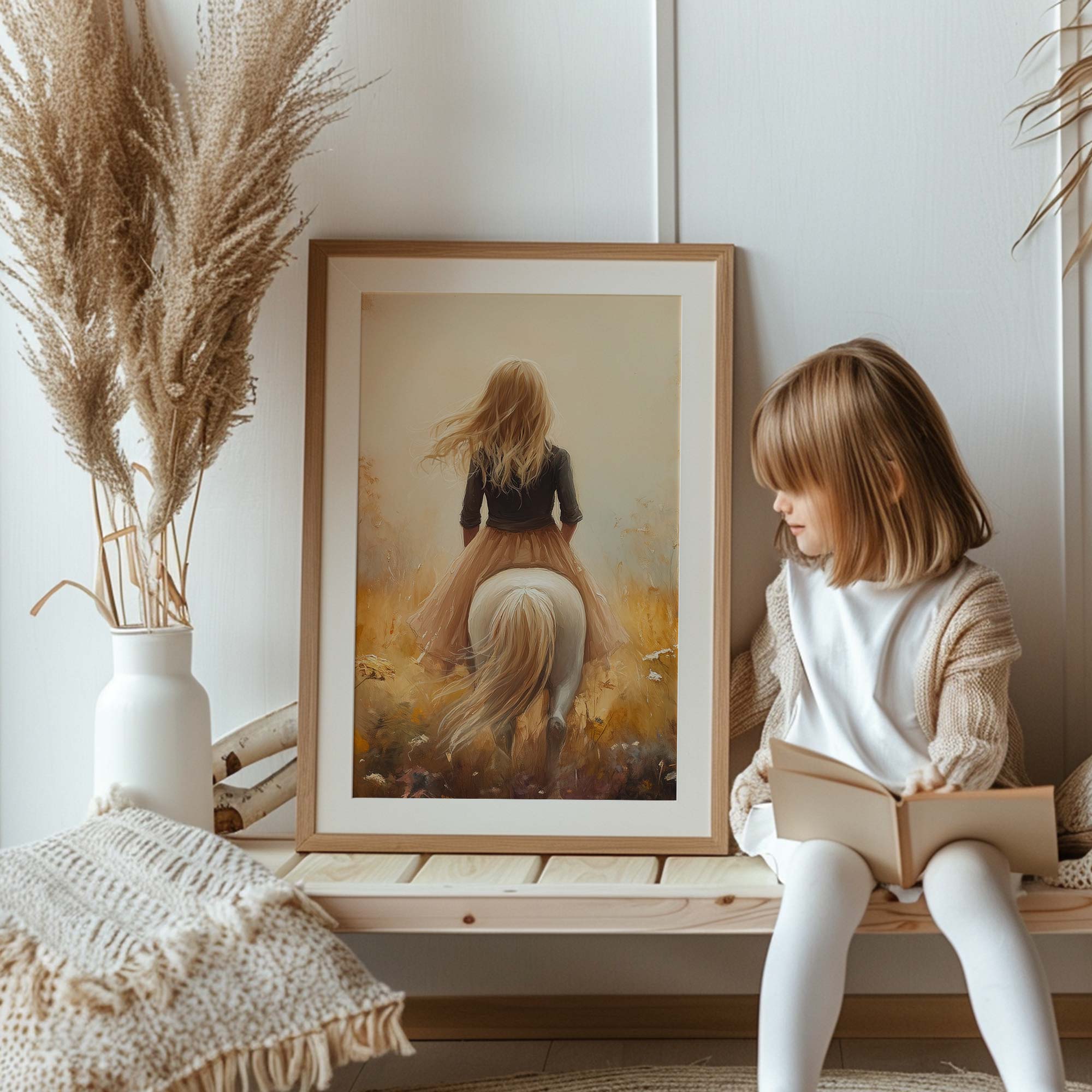 Terug naar collectie / Kinderkamer posters / Bloemen posters / Dromerig Paard in Bloeiend Landschap – Roze Sfeer