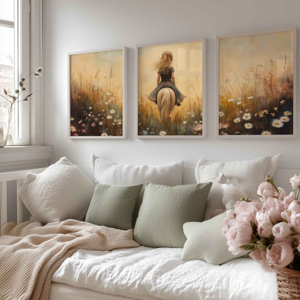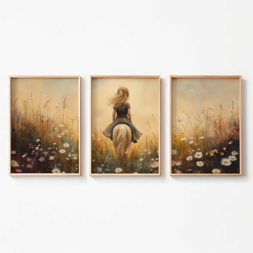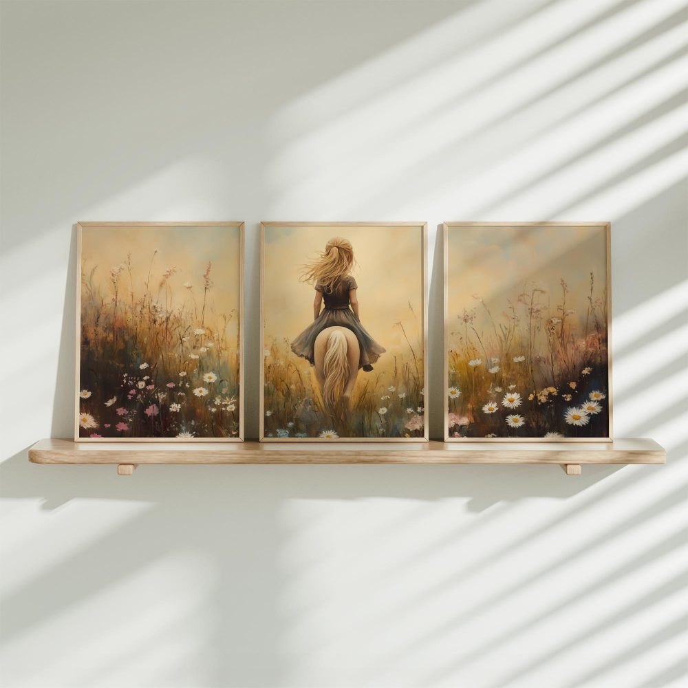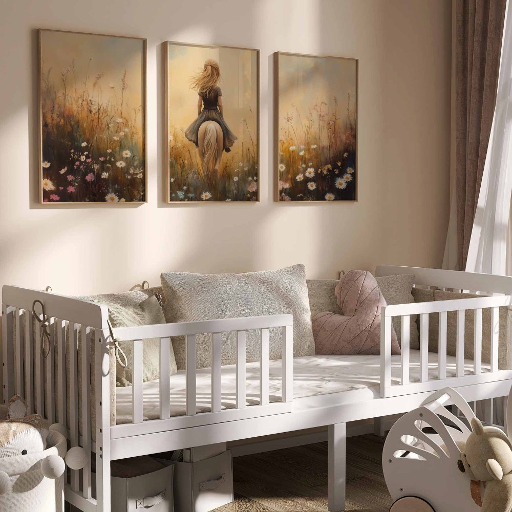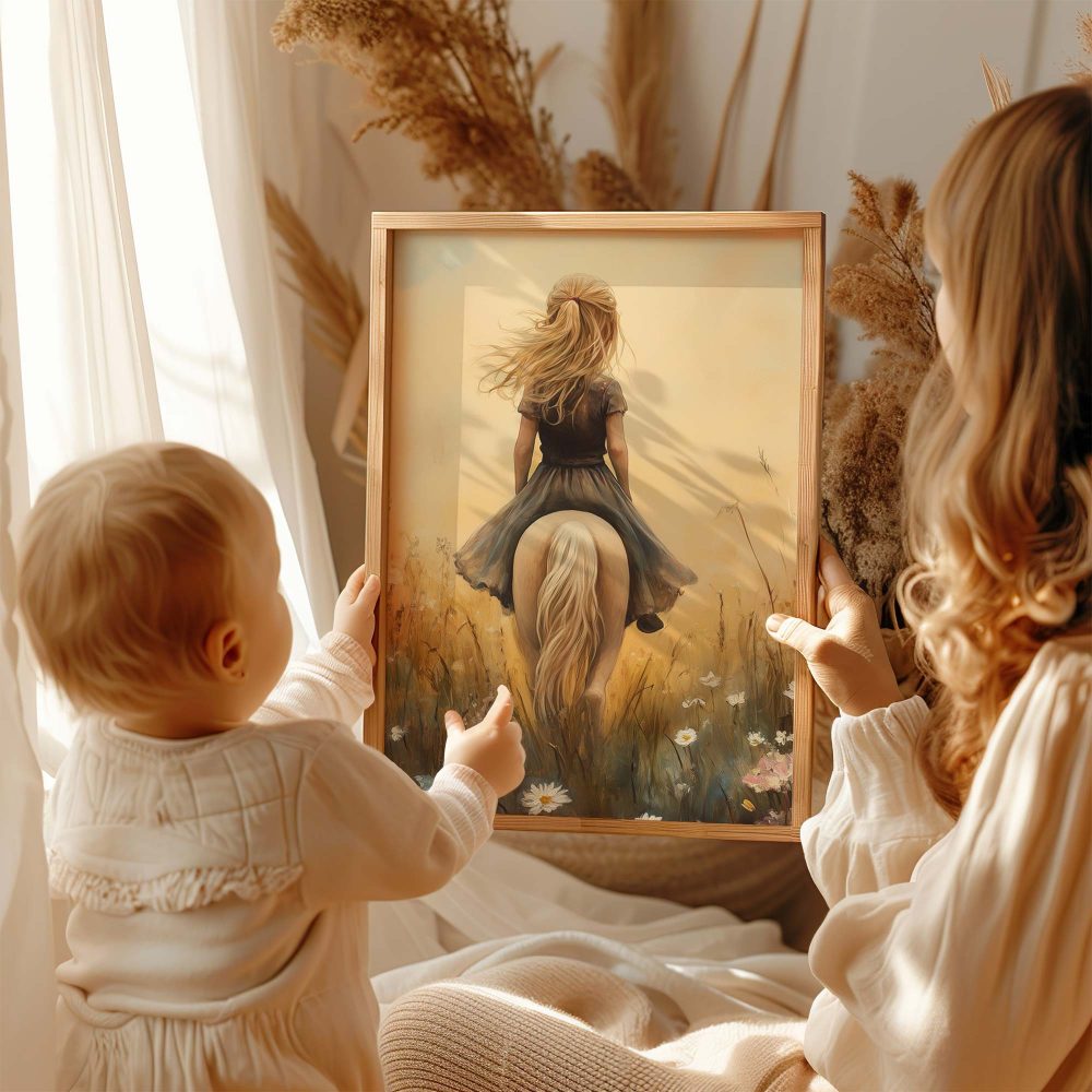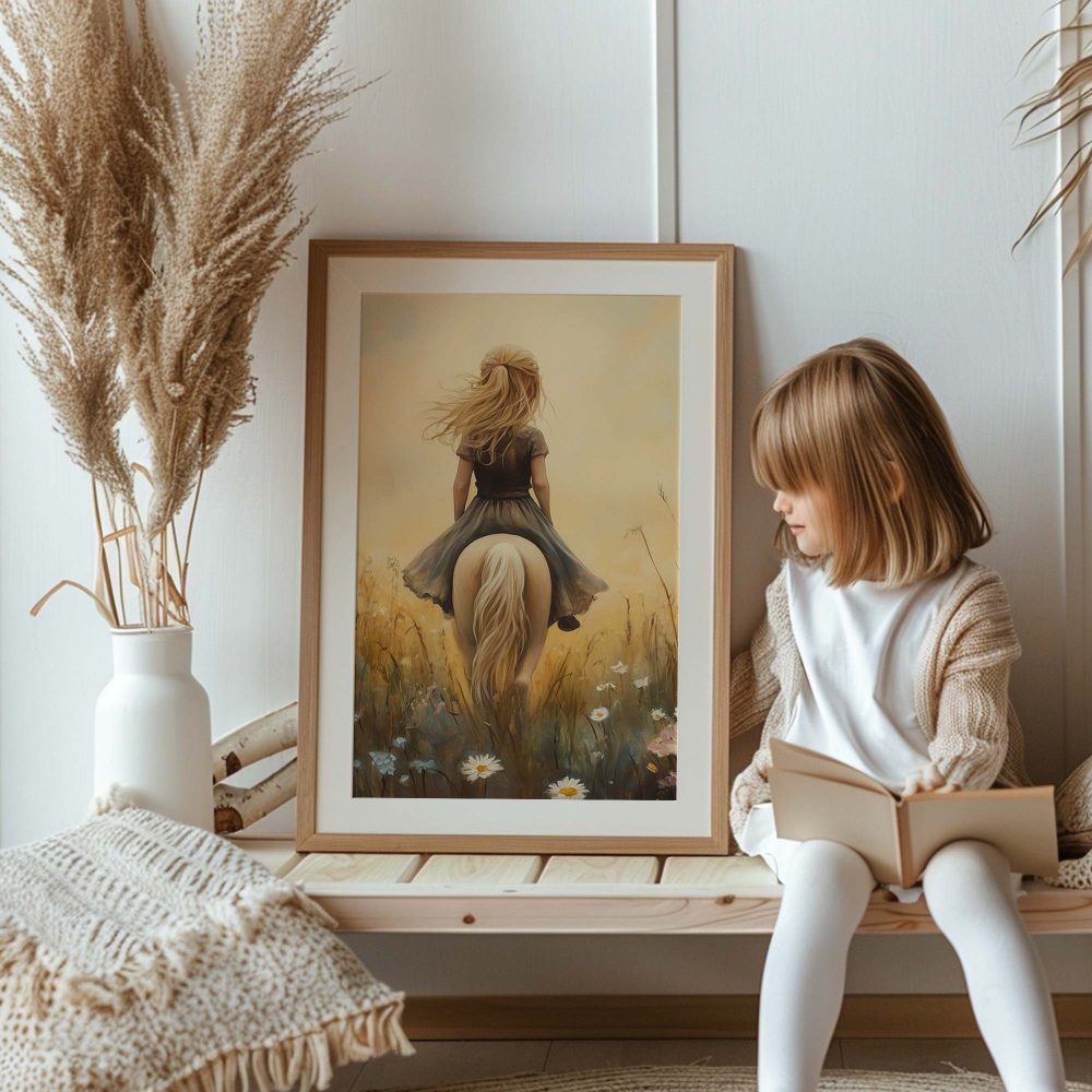 Terug naar collectie / Kinderkamer posters / Bloemen posters / Dromerig Paardrijden in een Bloemenveld