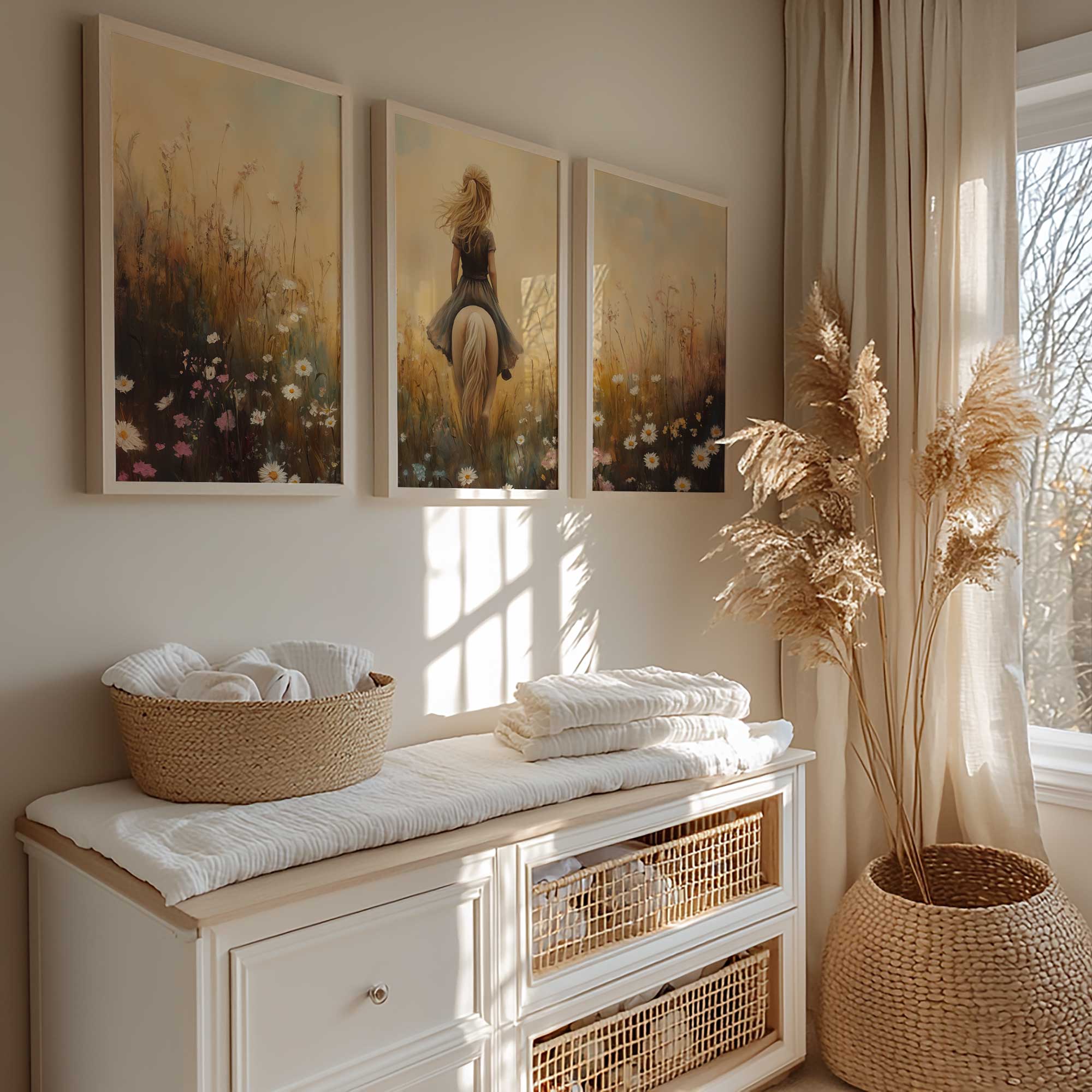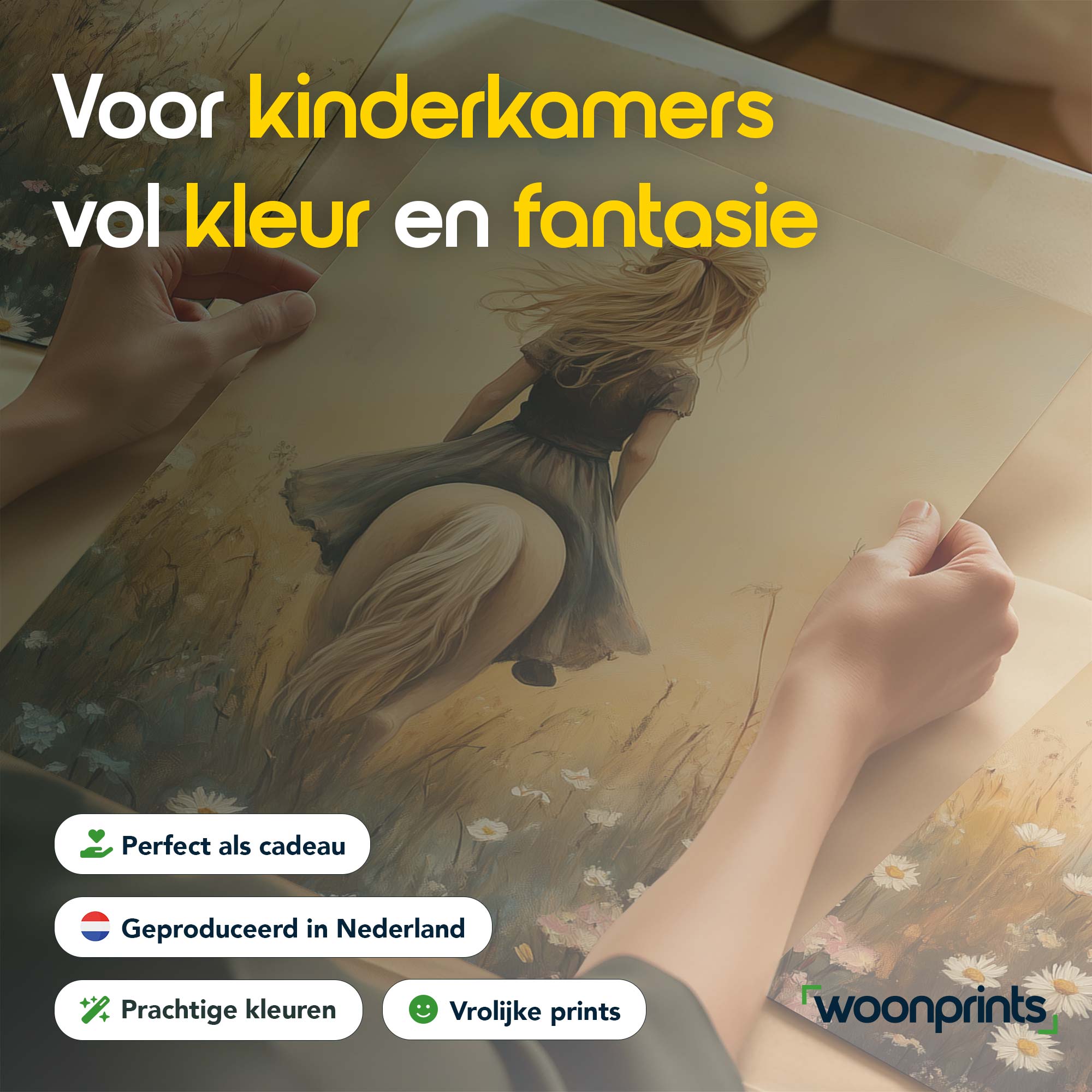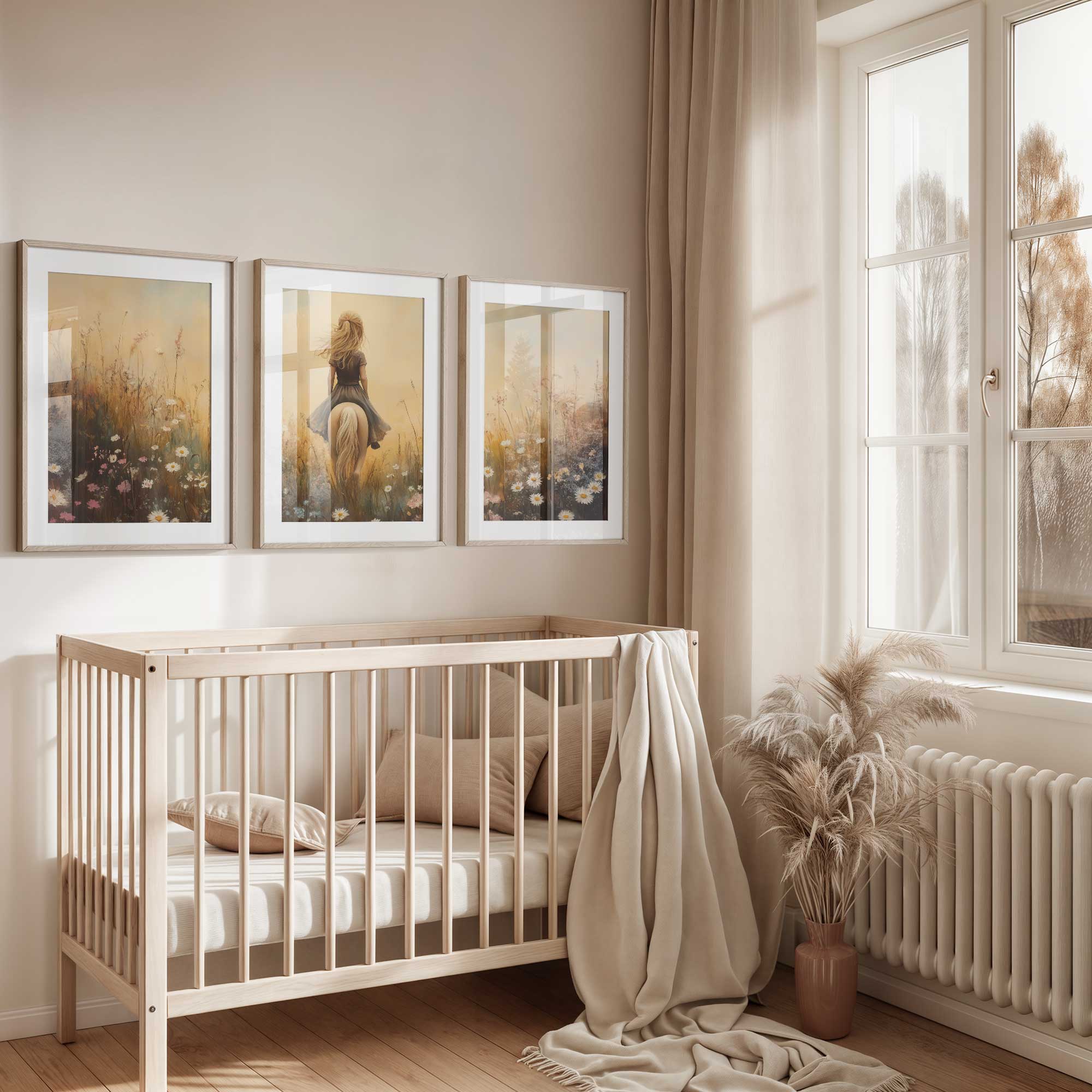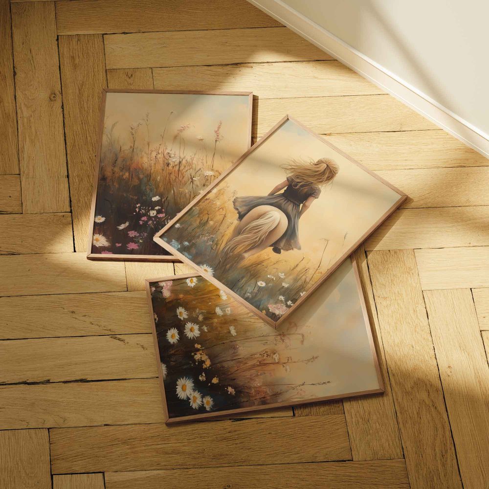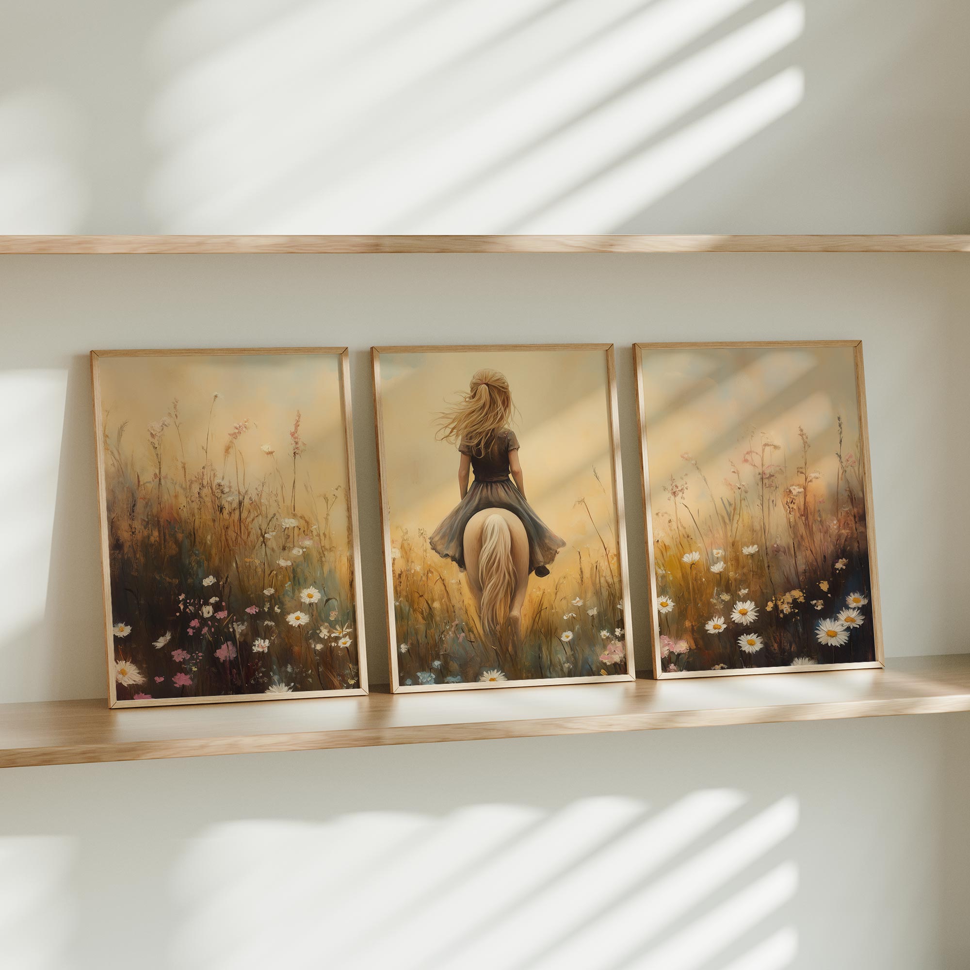 Terug naar collectie / Kinderkamer posters / Bloemen posters / Dromerig Paardrijden in een Bloemenveld