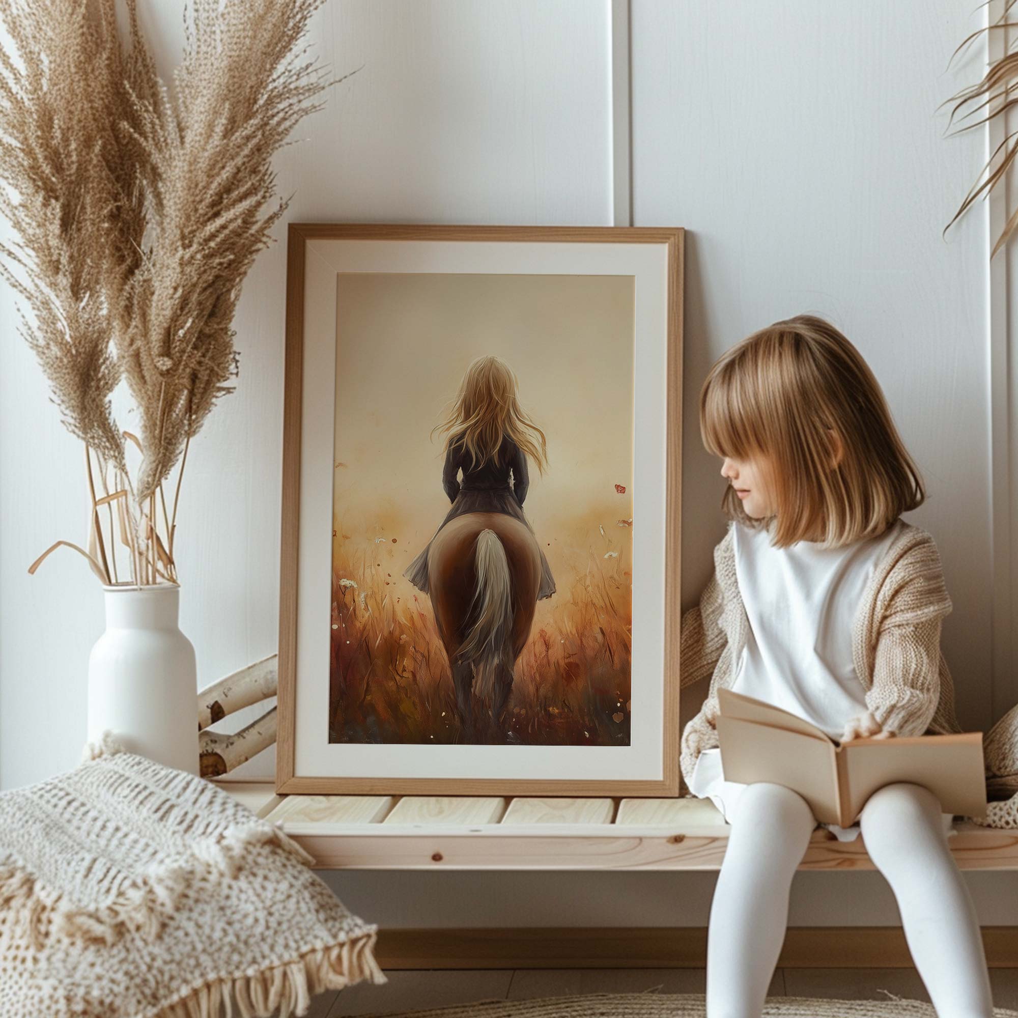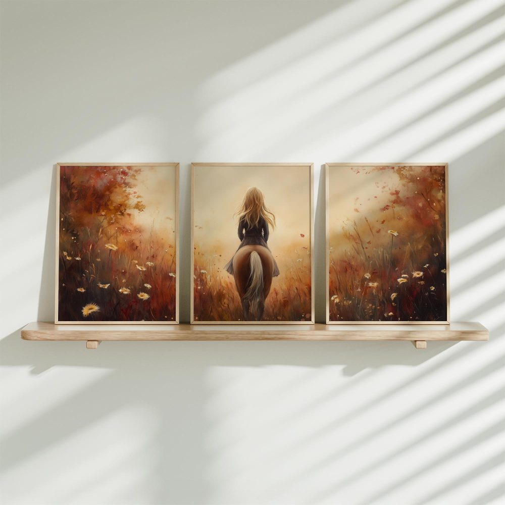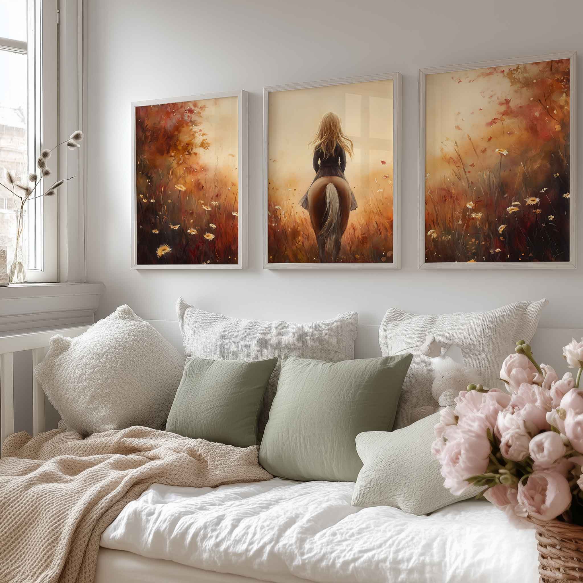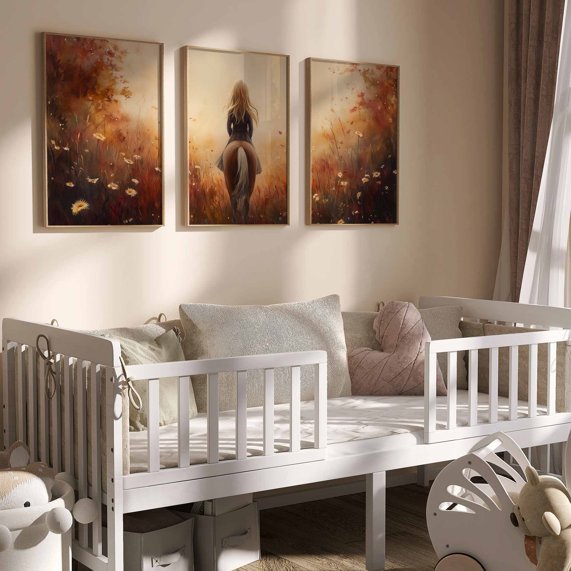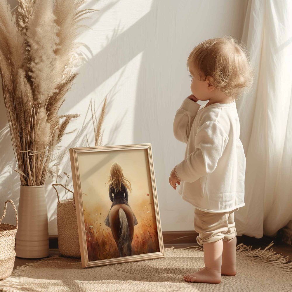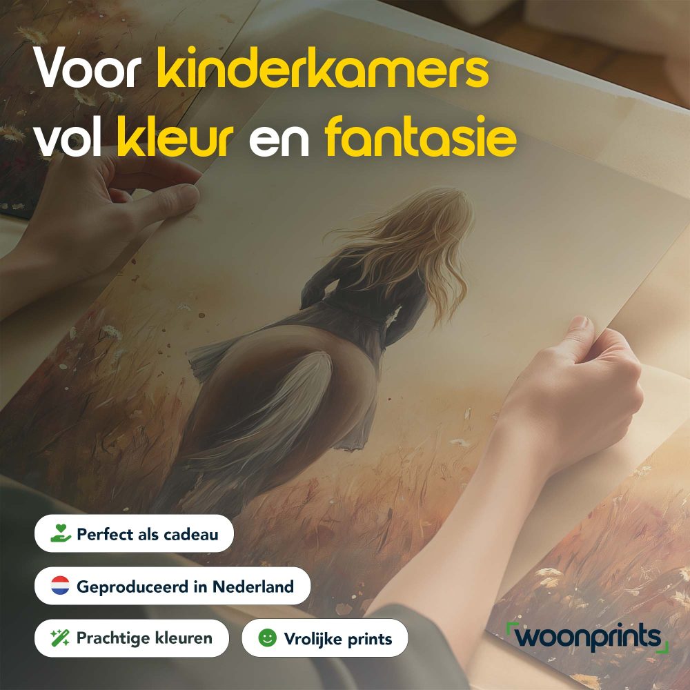 Terug naar collectie / Kinderkamer posters / Avontuurlijk posters / Dromerig Paardrijden in een Bloemenveld