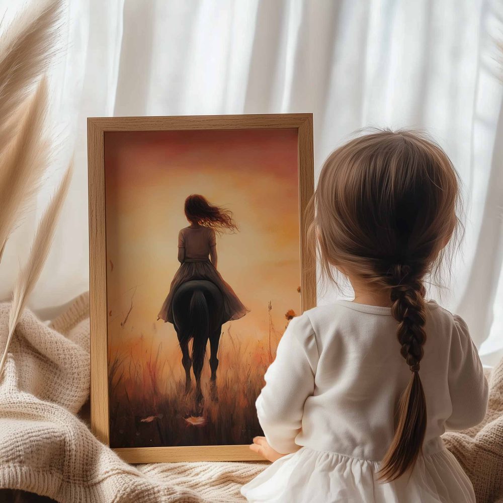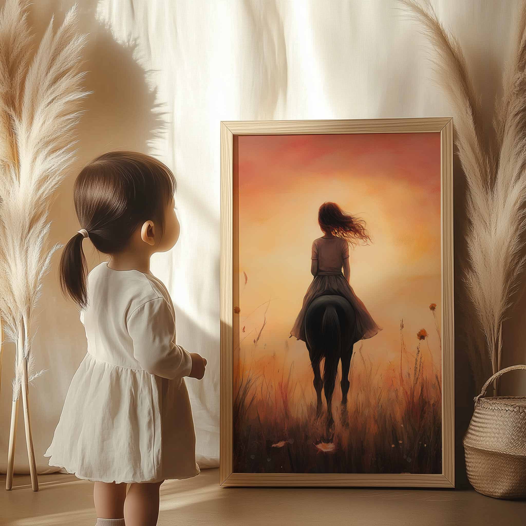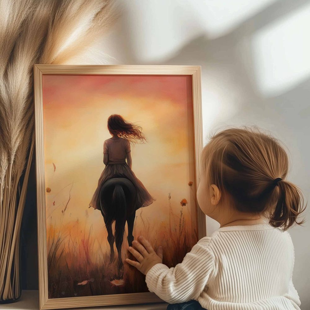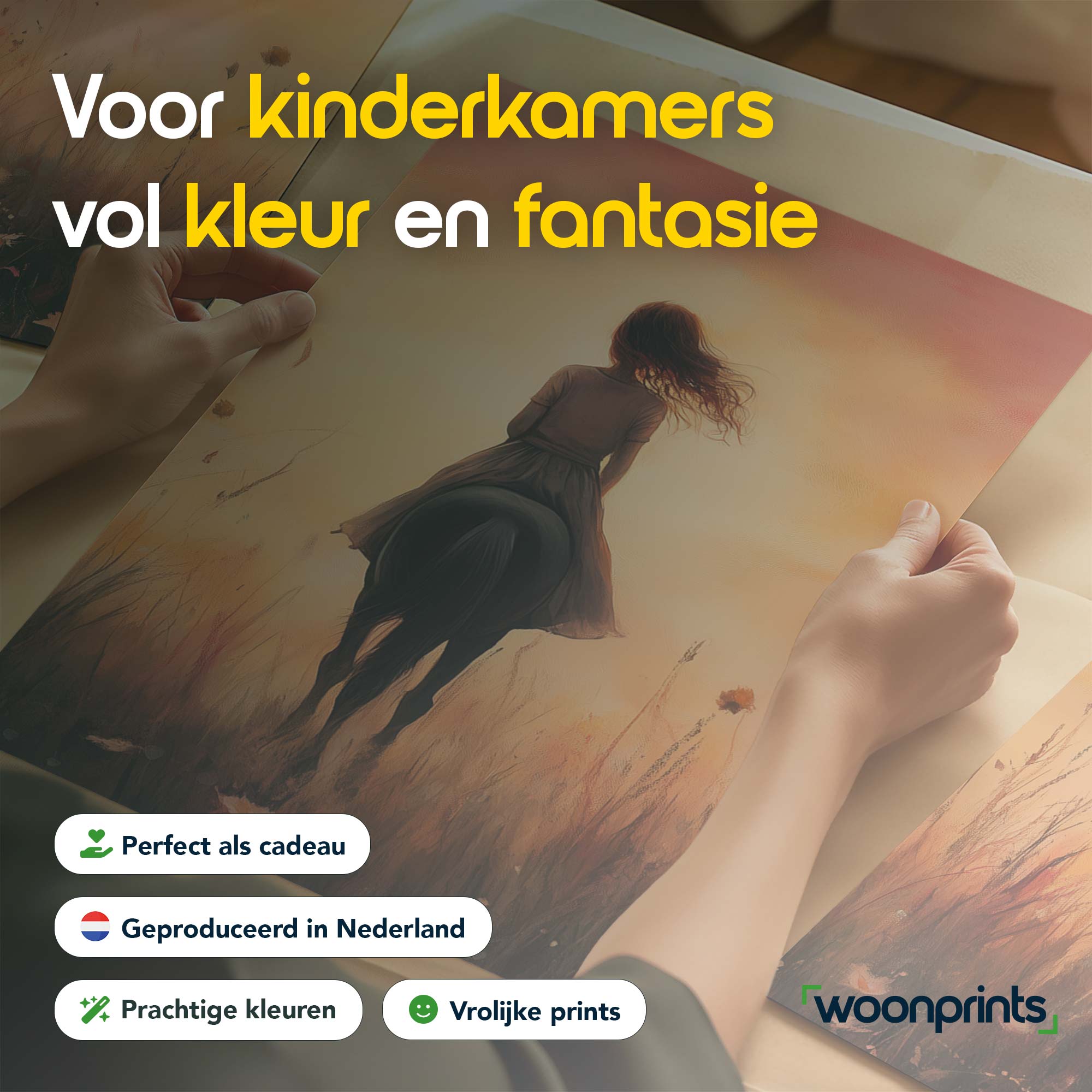 Terug naar collectie / Kinderkamer posters / Avontuurlijk posters / Dromerig Paardrijden in een Zonsondergang