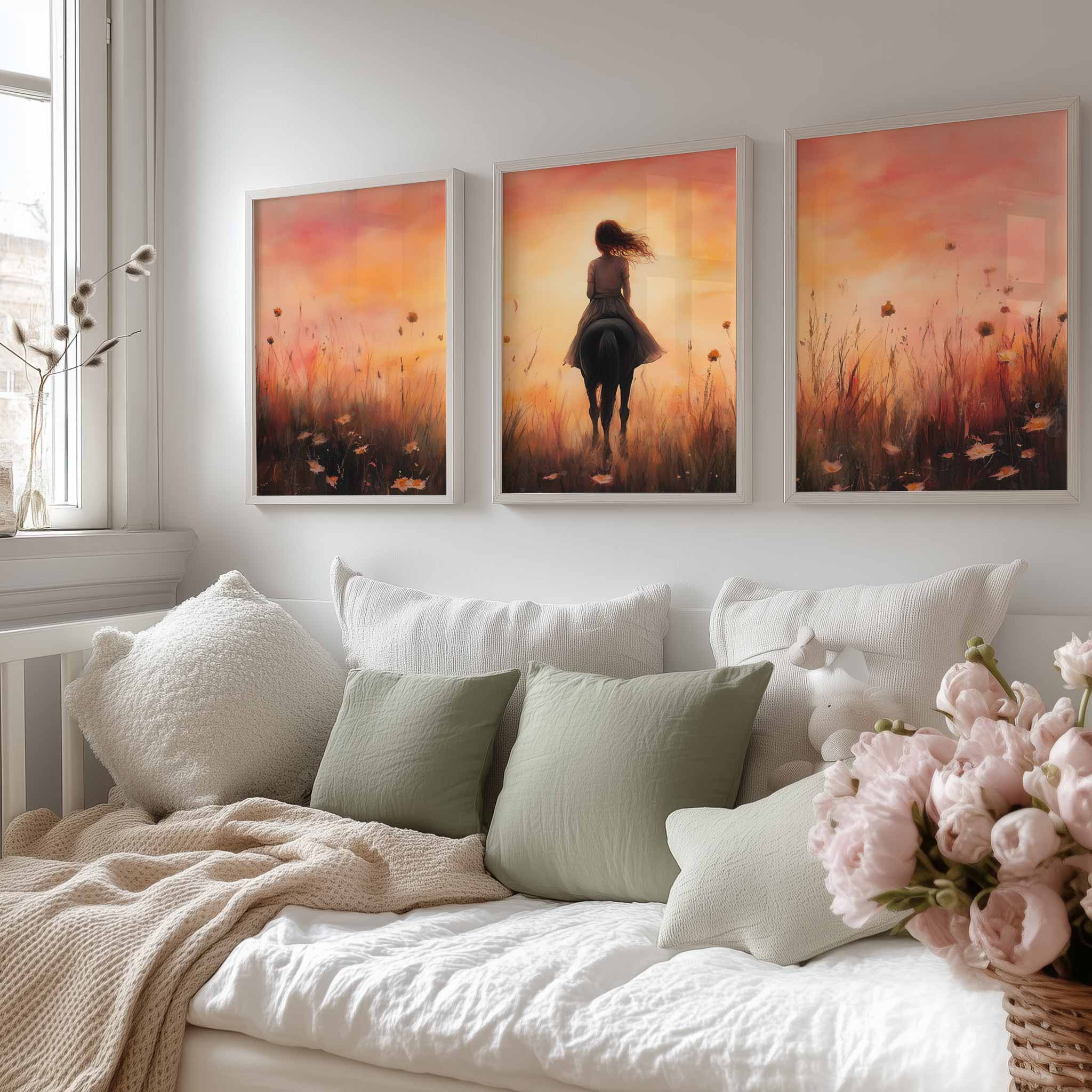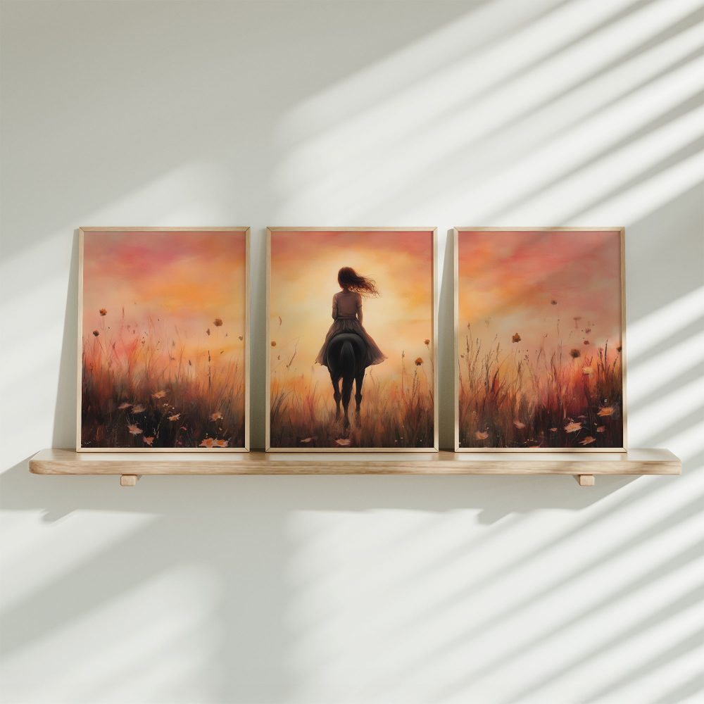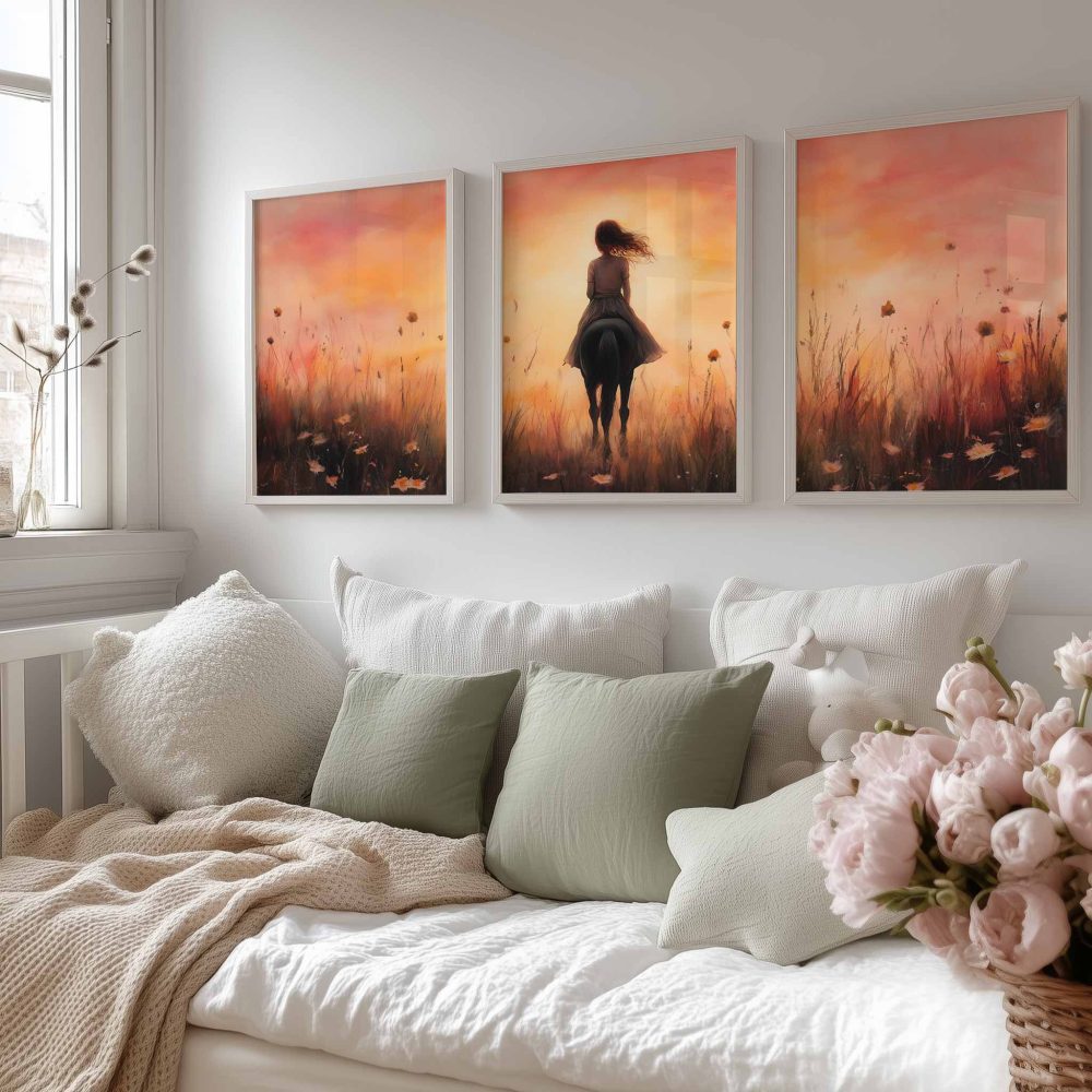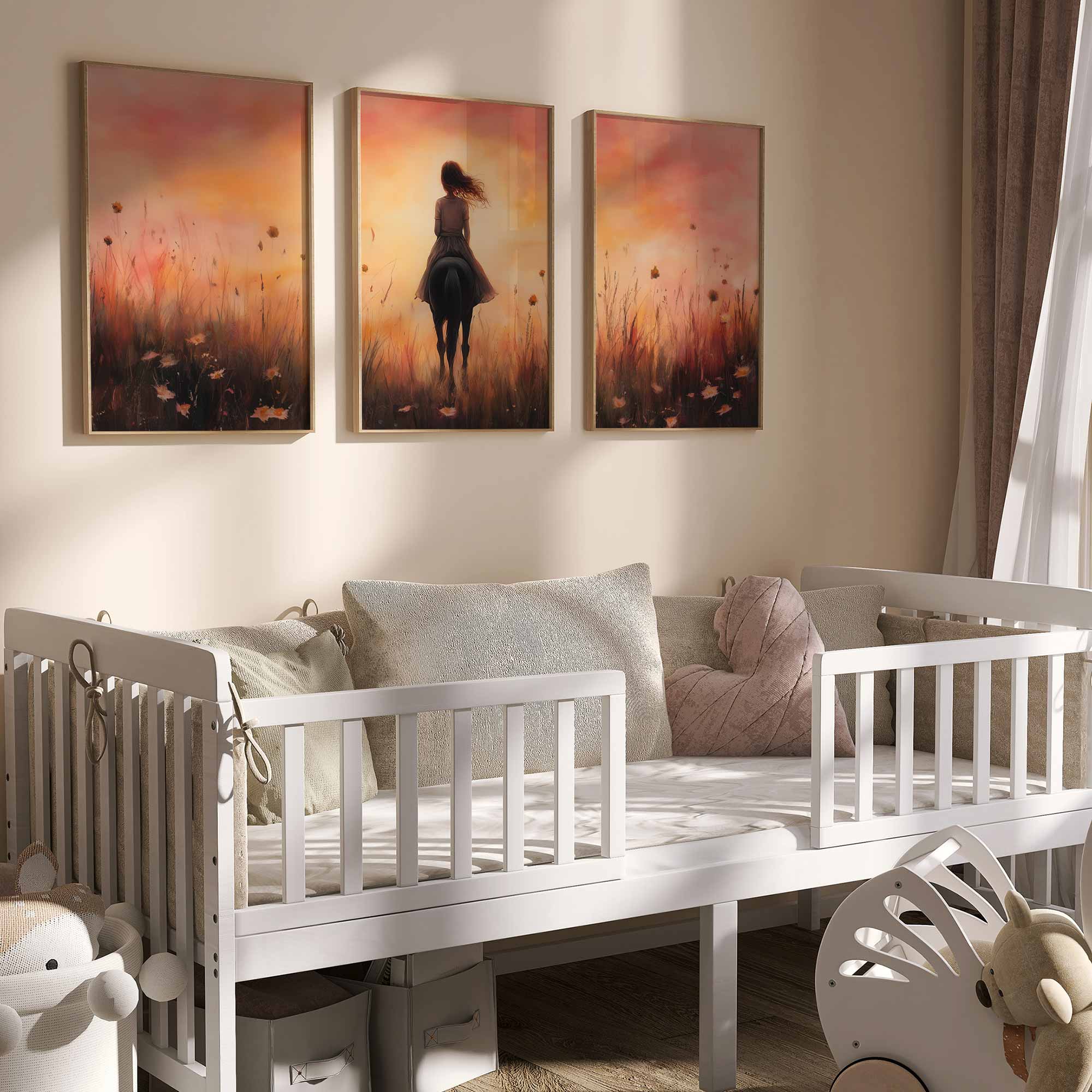 Terug naar collectie / Kinderkamer posters / Avontuurlijk posters / Dromerig Paardrijden in een Zonsondergang