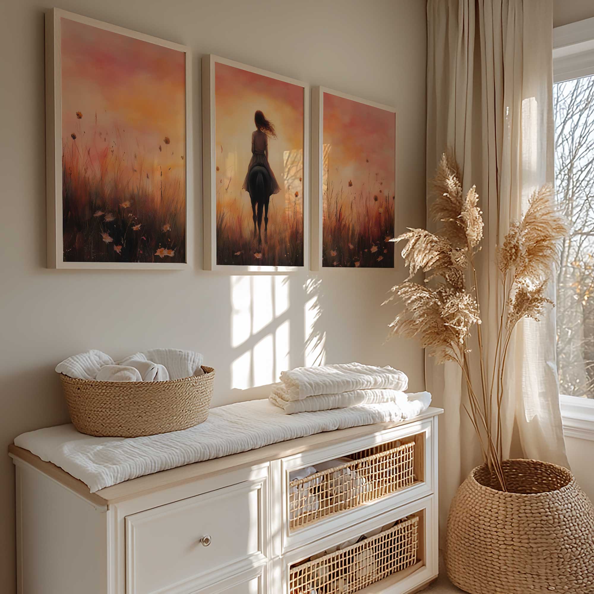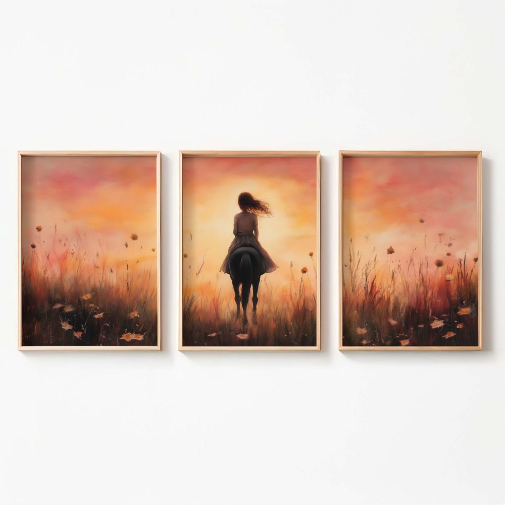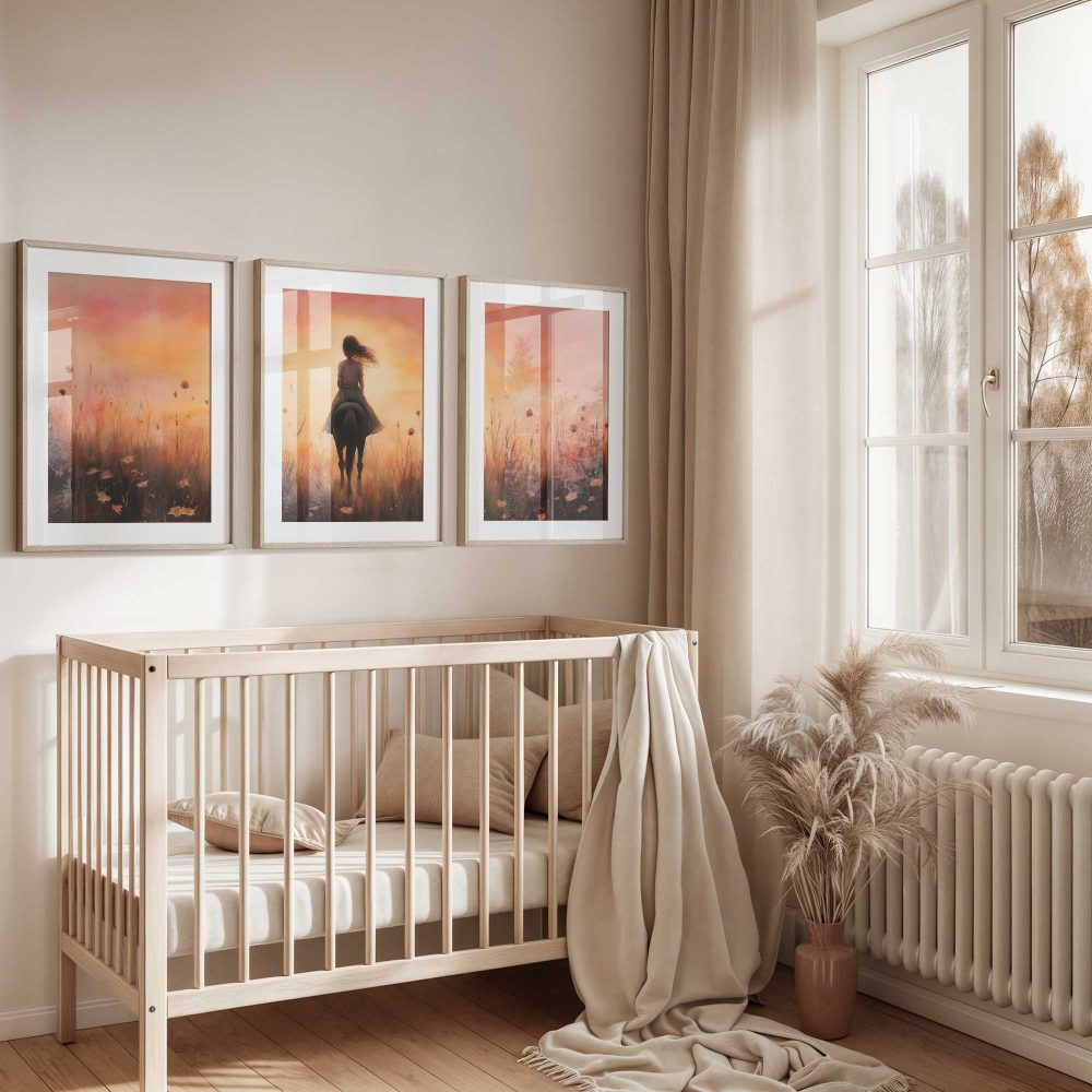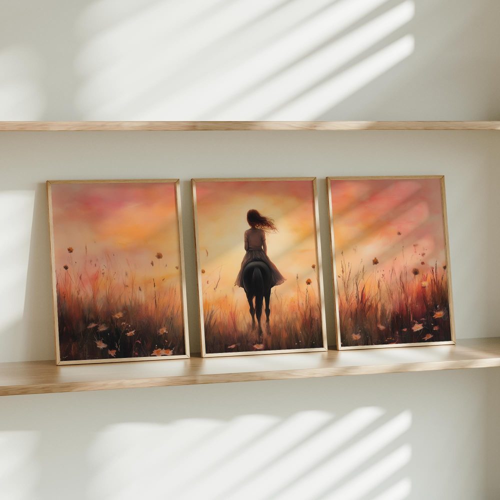 Terug naar collectie / Kinderkamer posters / Avontuurlijk posters / Dromerig Paardrijden in een Zonsondergang