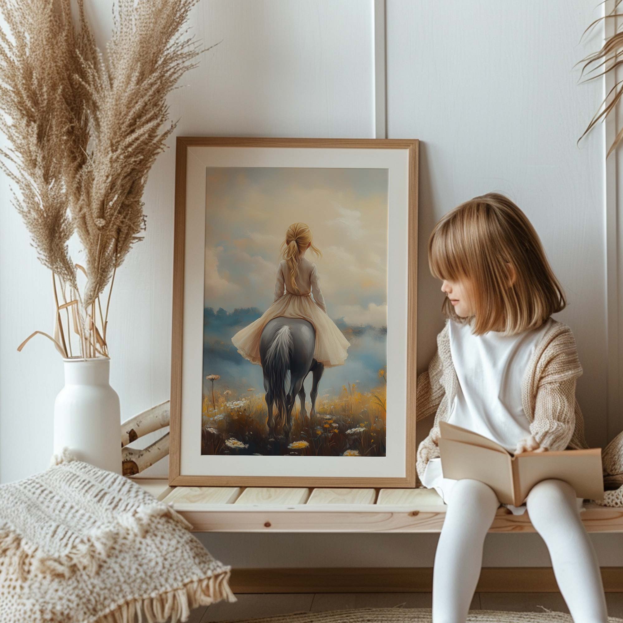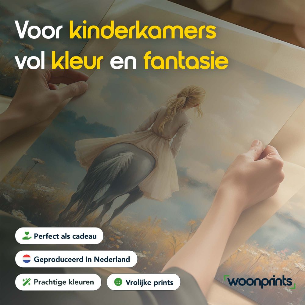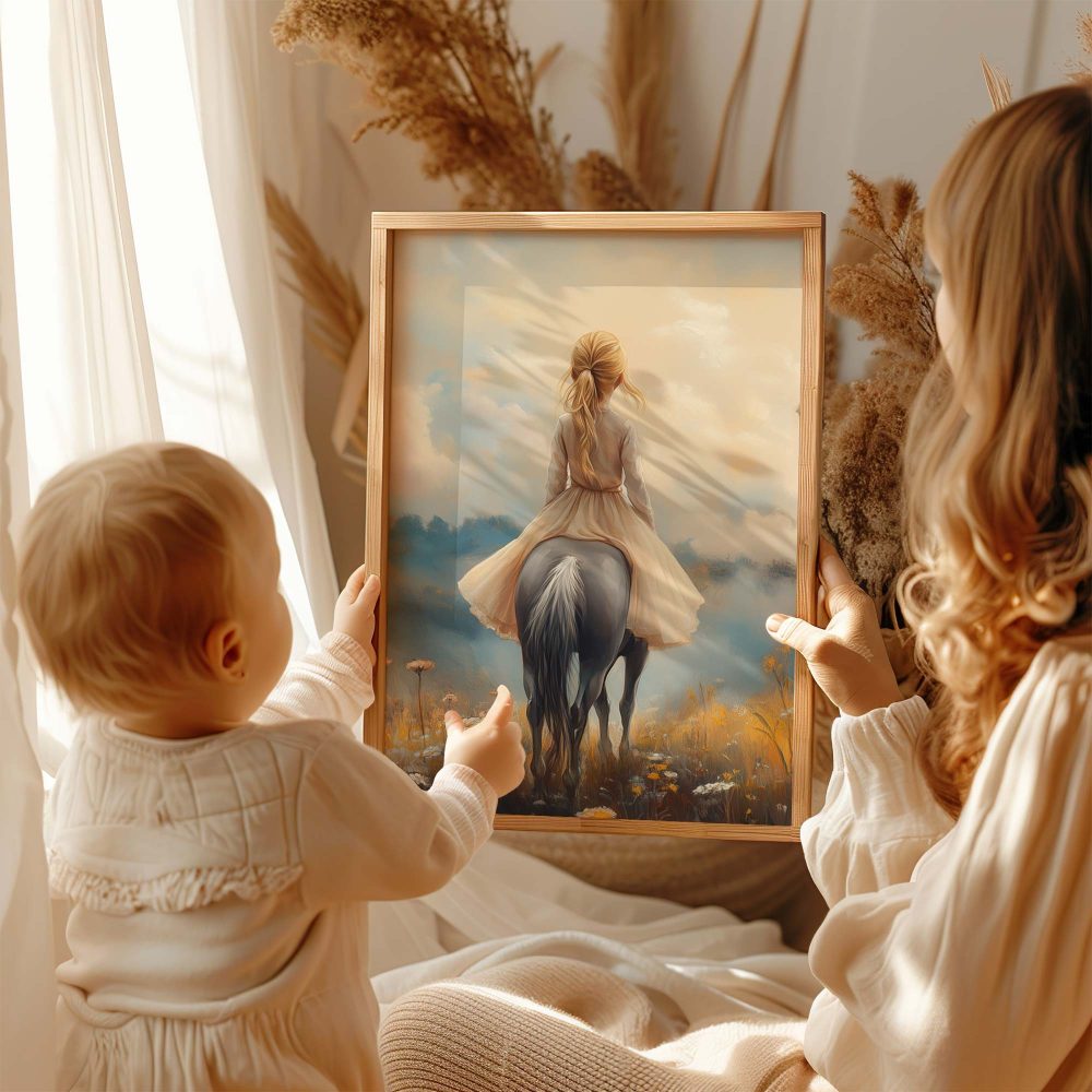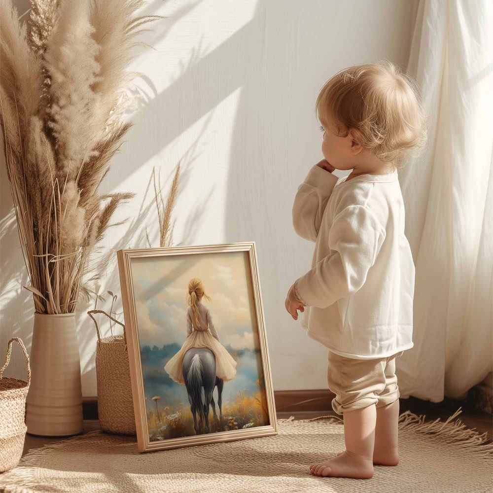 Terug naar collectie / Kinderkamer posters / Bloemen posters / Dromerig Paardrijdmeisje in Pastel Bloemenveld