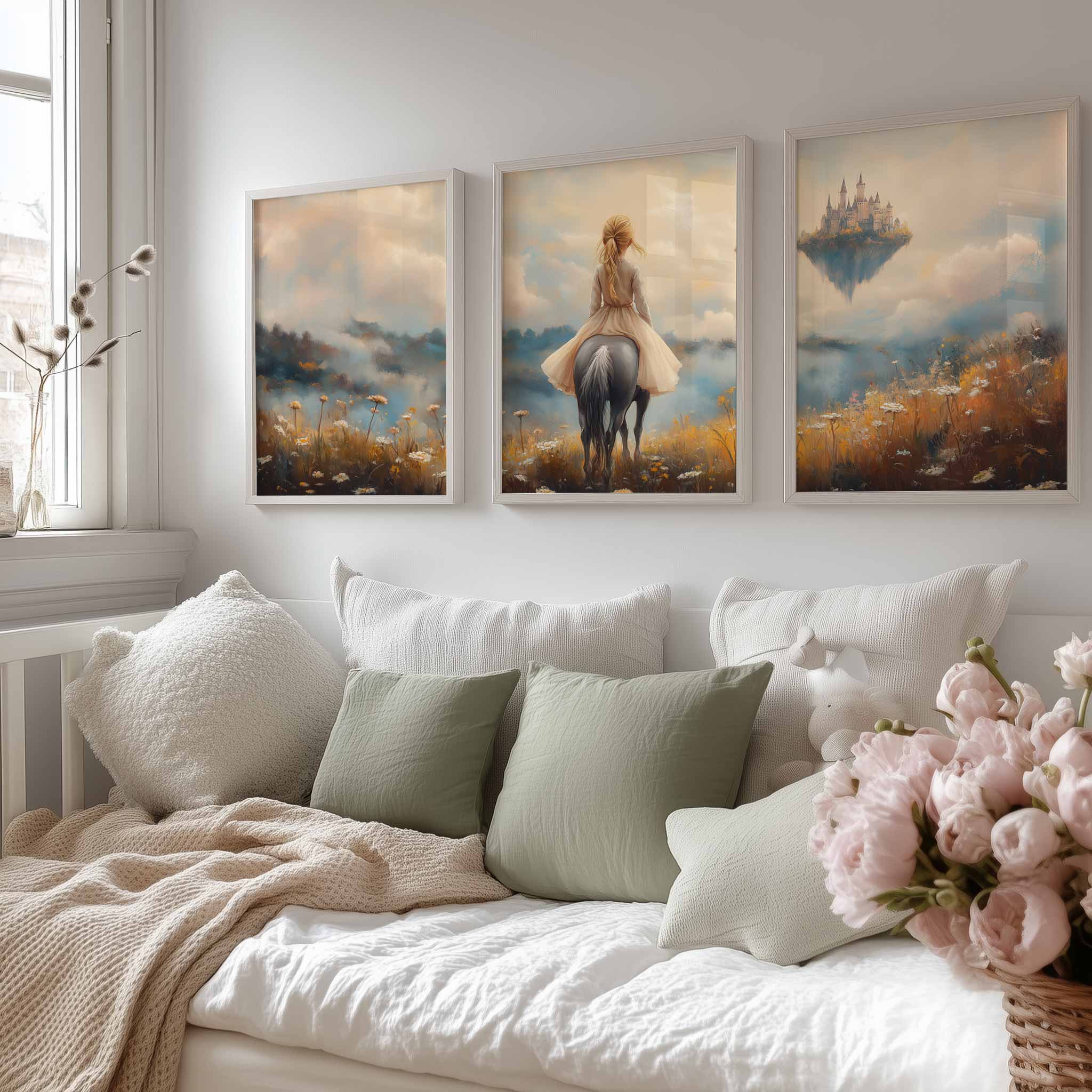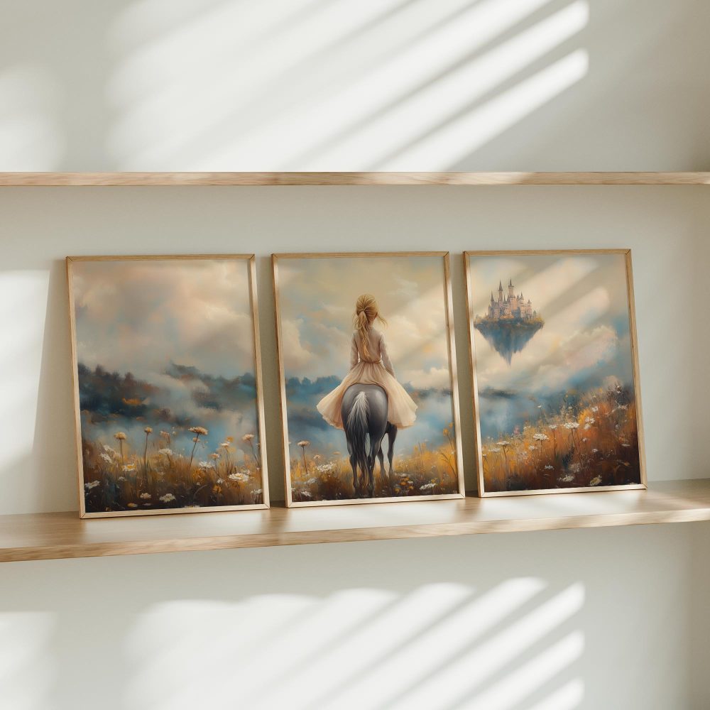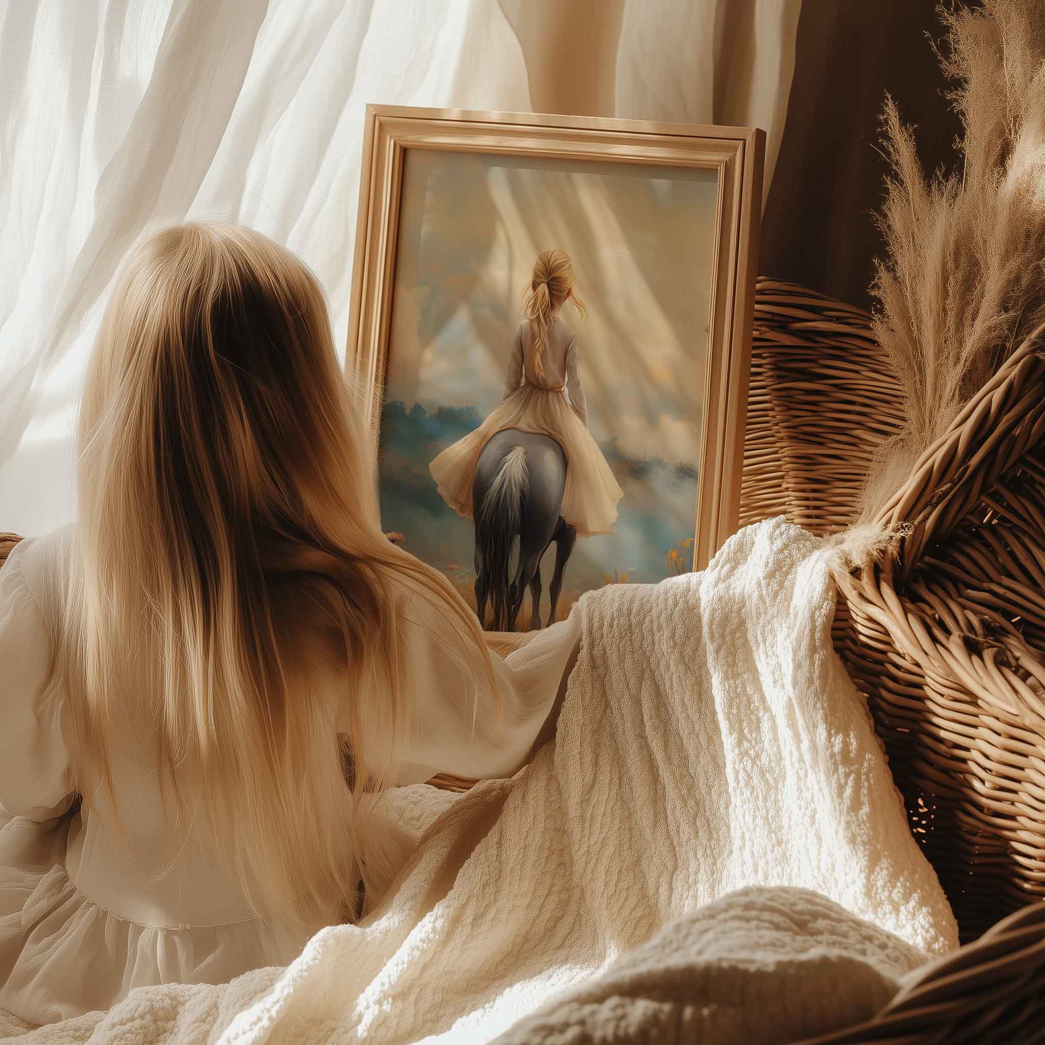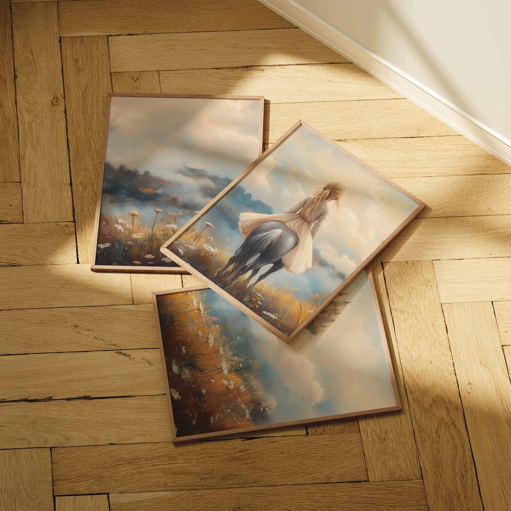 Terug naar collectie / Kinderkamer posters / Bloemen posters / Dromerig Paardrijdmeisje in Pastel Bloemenveld