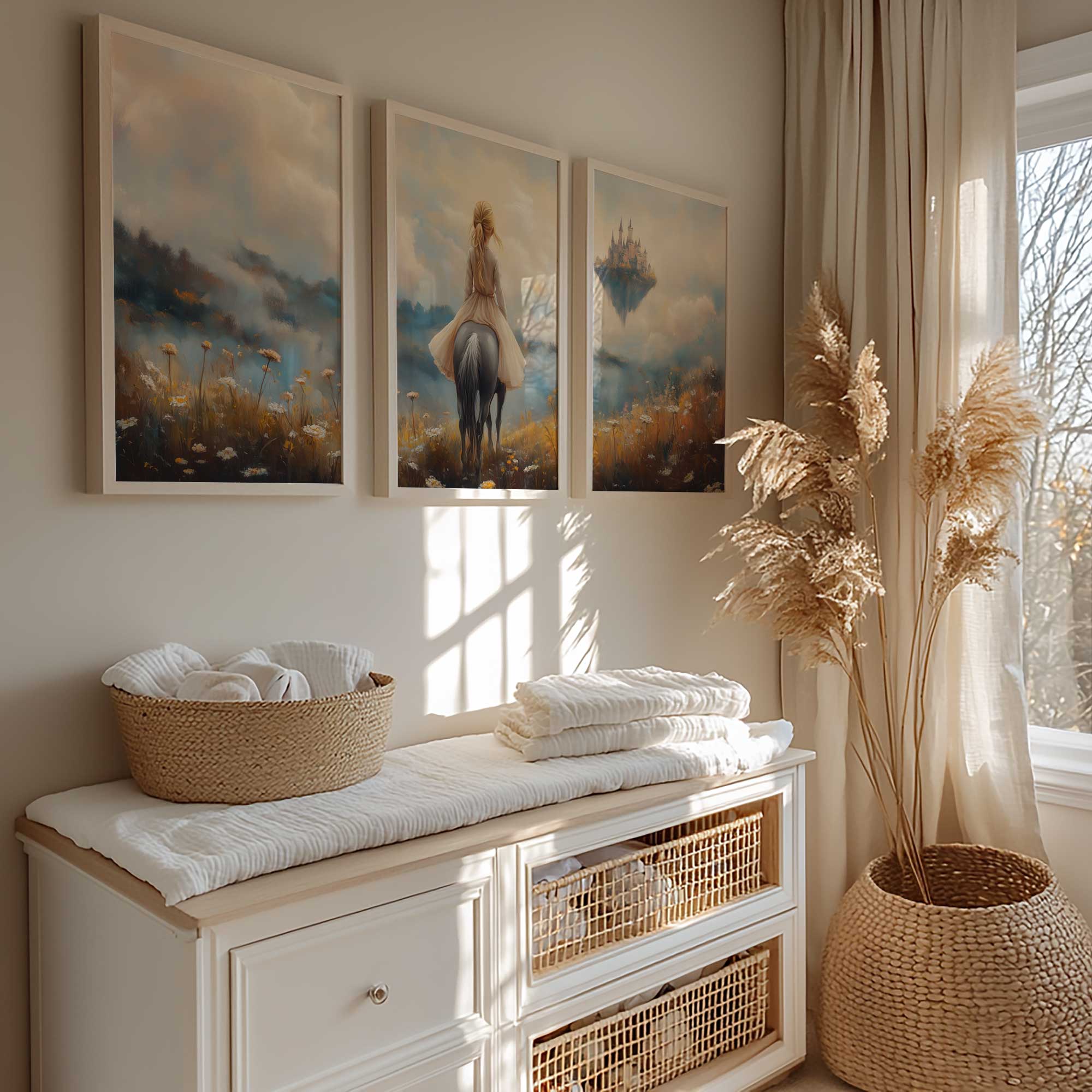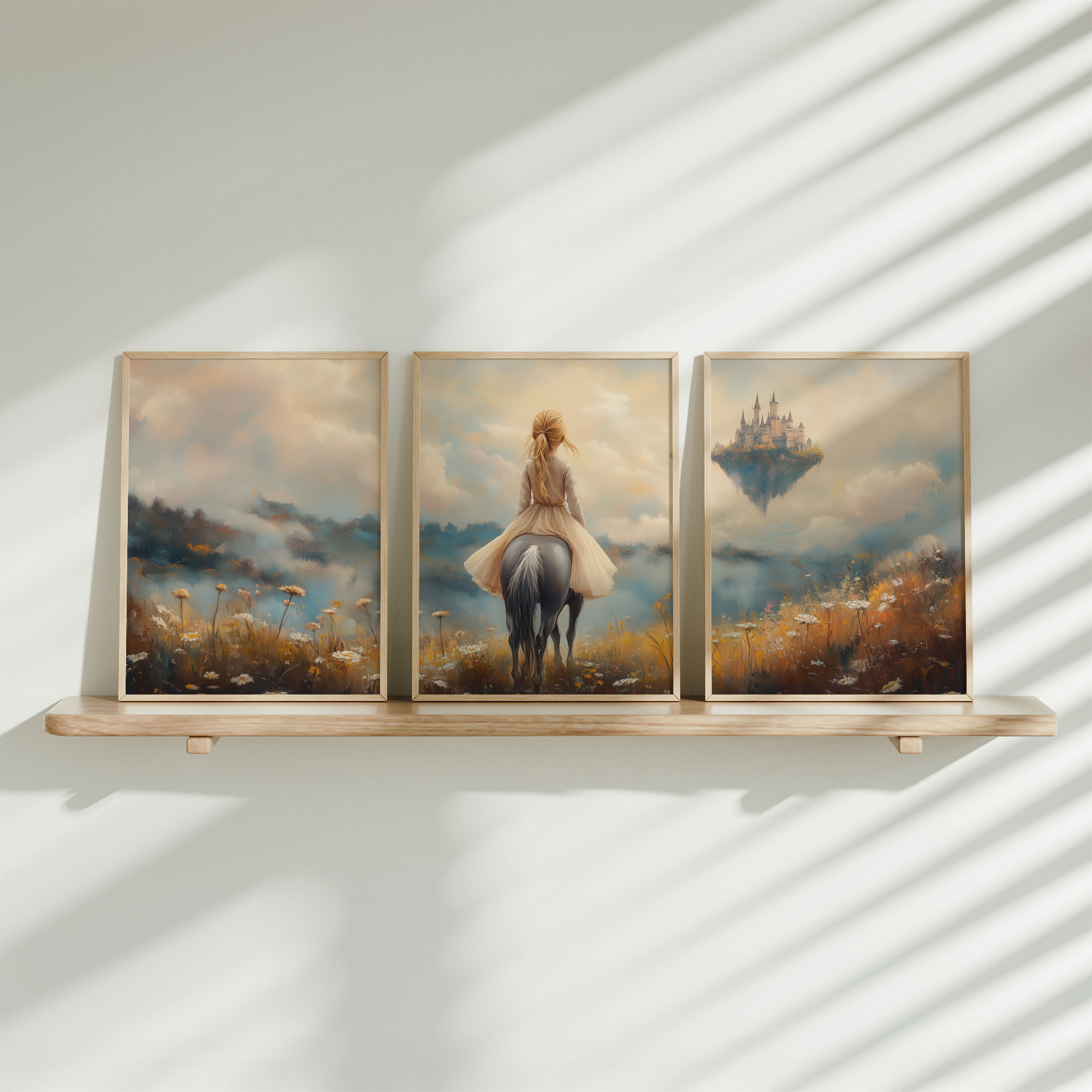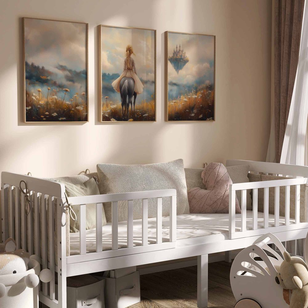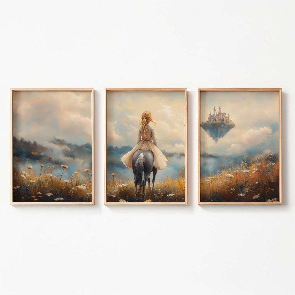 Terug naar collectie / Kinderkamer posters / Bloemen posters / Dromerig Paardrijdmeisje in Pastel Bloemenveld