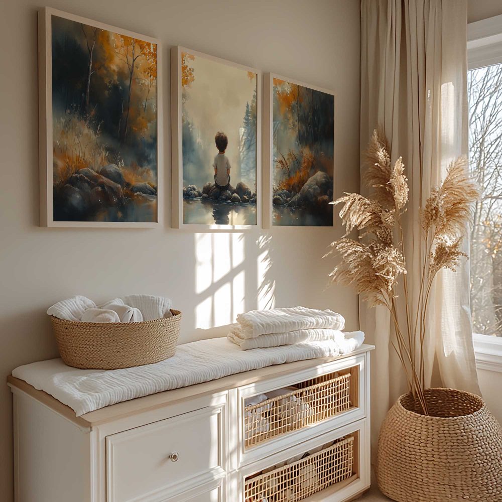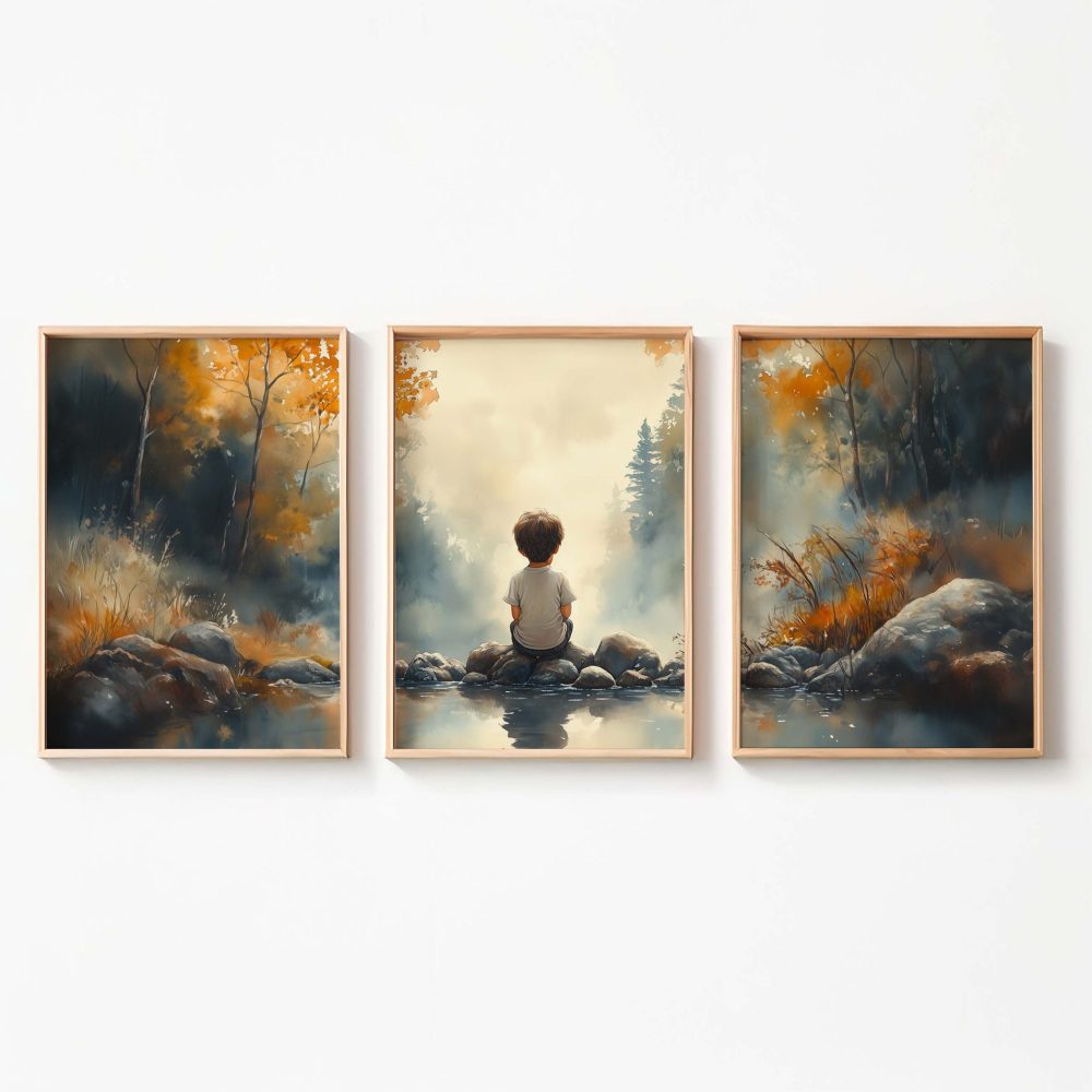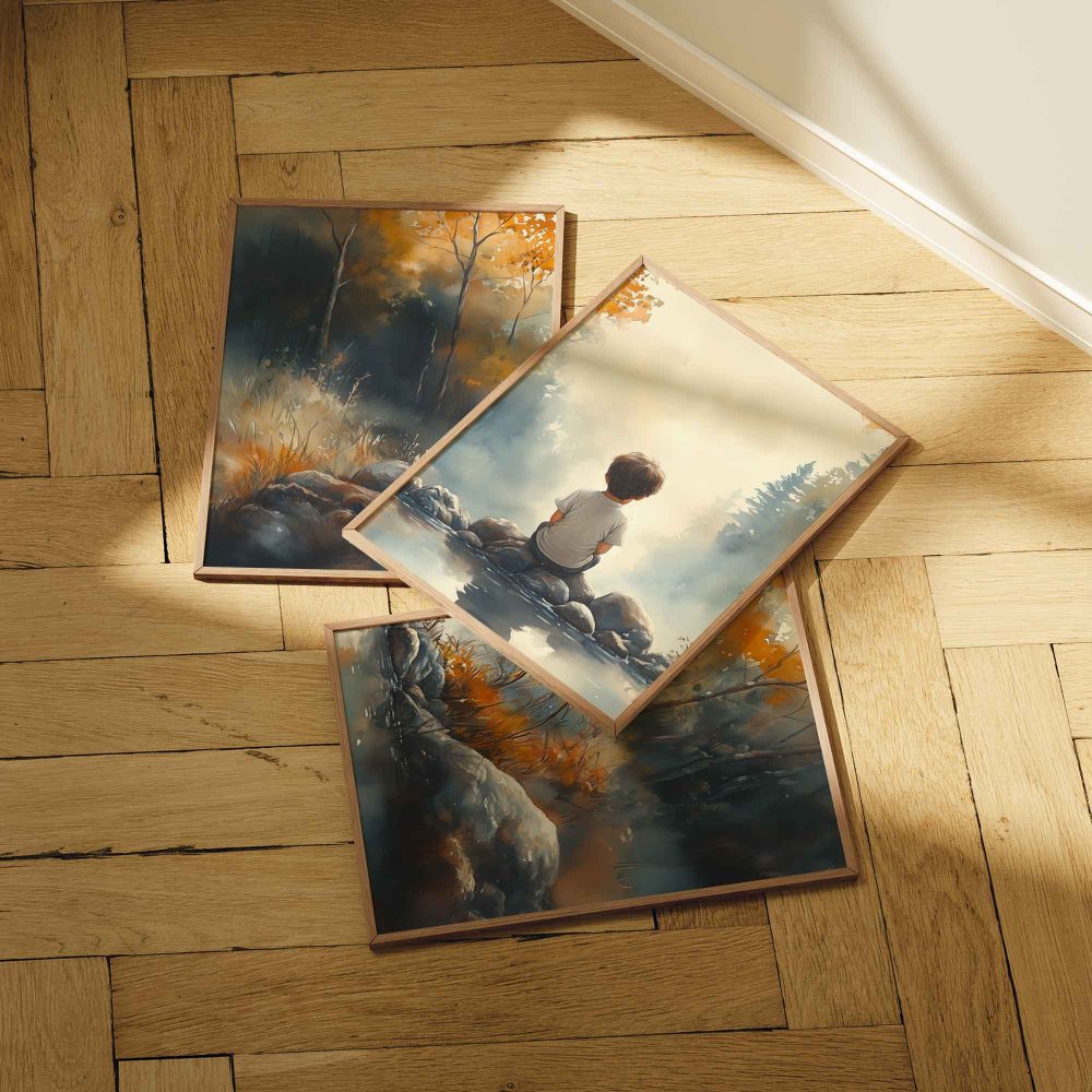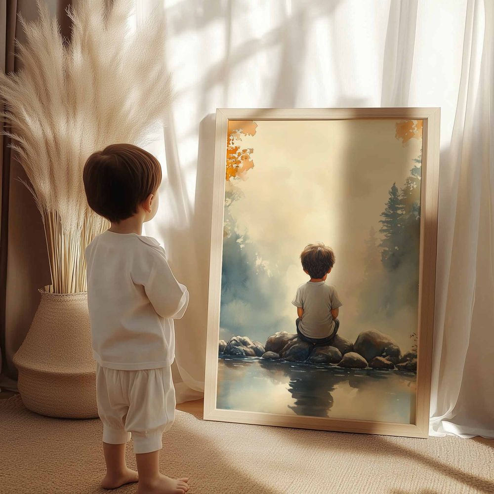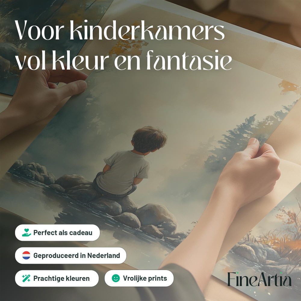 Terug naar collectie / Kinderkamer posters / Dromerig Riviertafereel met Jongen in het Bos