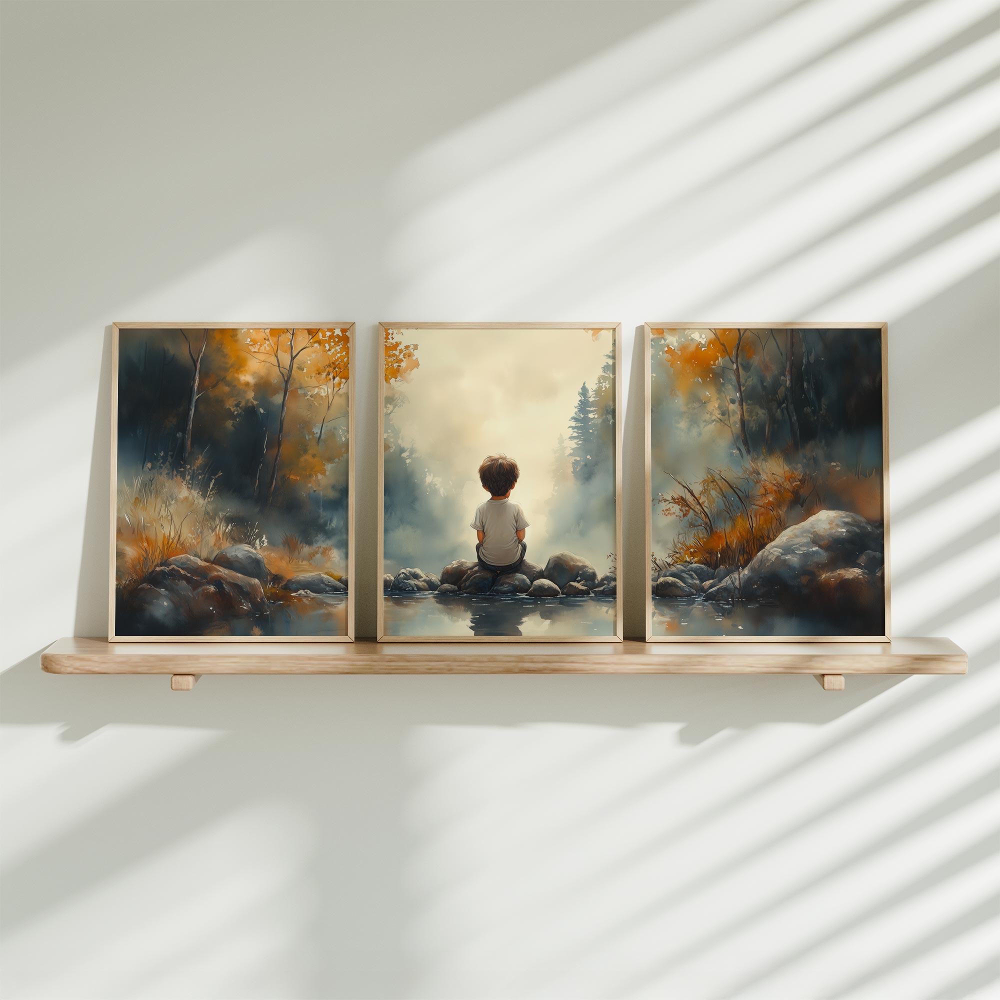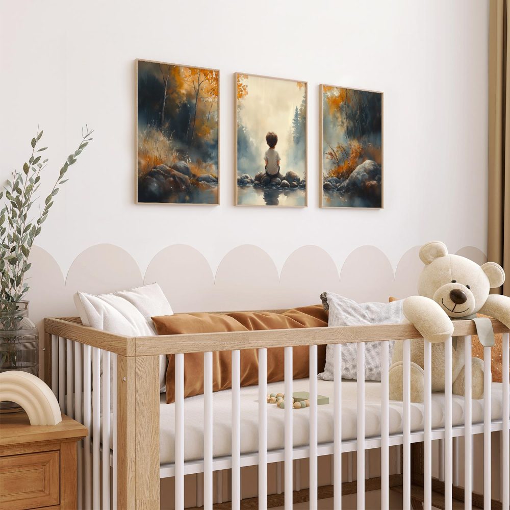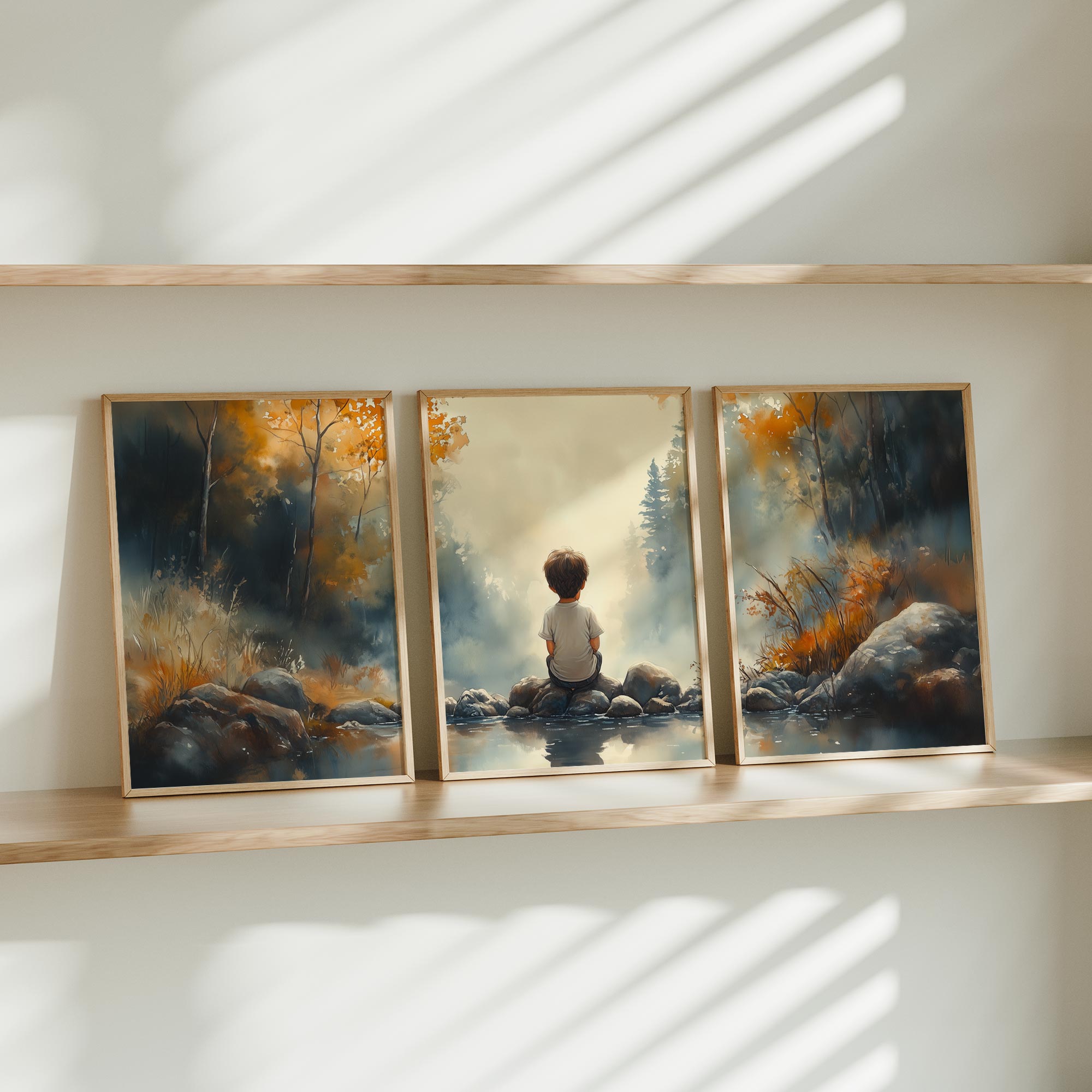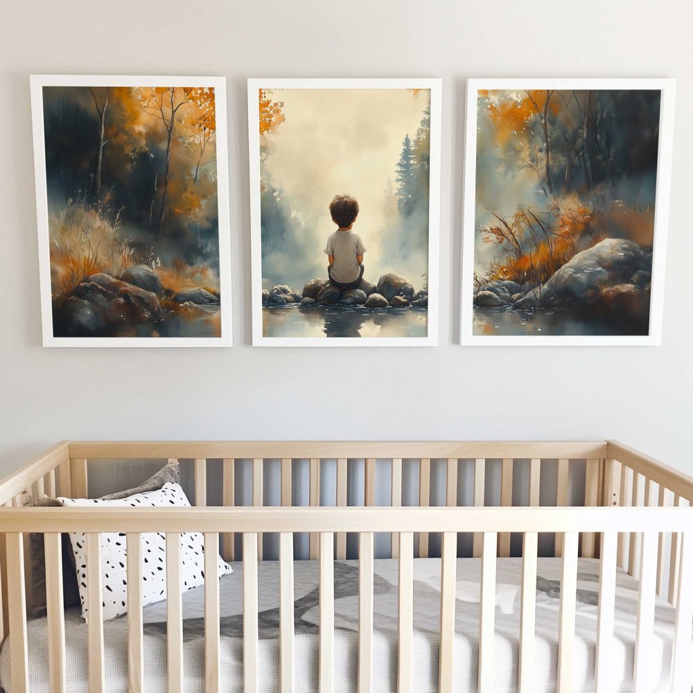 Terug naar collectie / Kinderkamer posters / Dromerig Riviertafereel met Jongen in het Bos