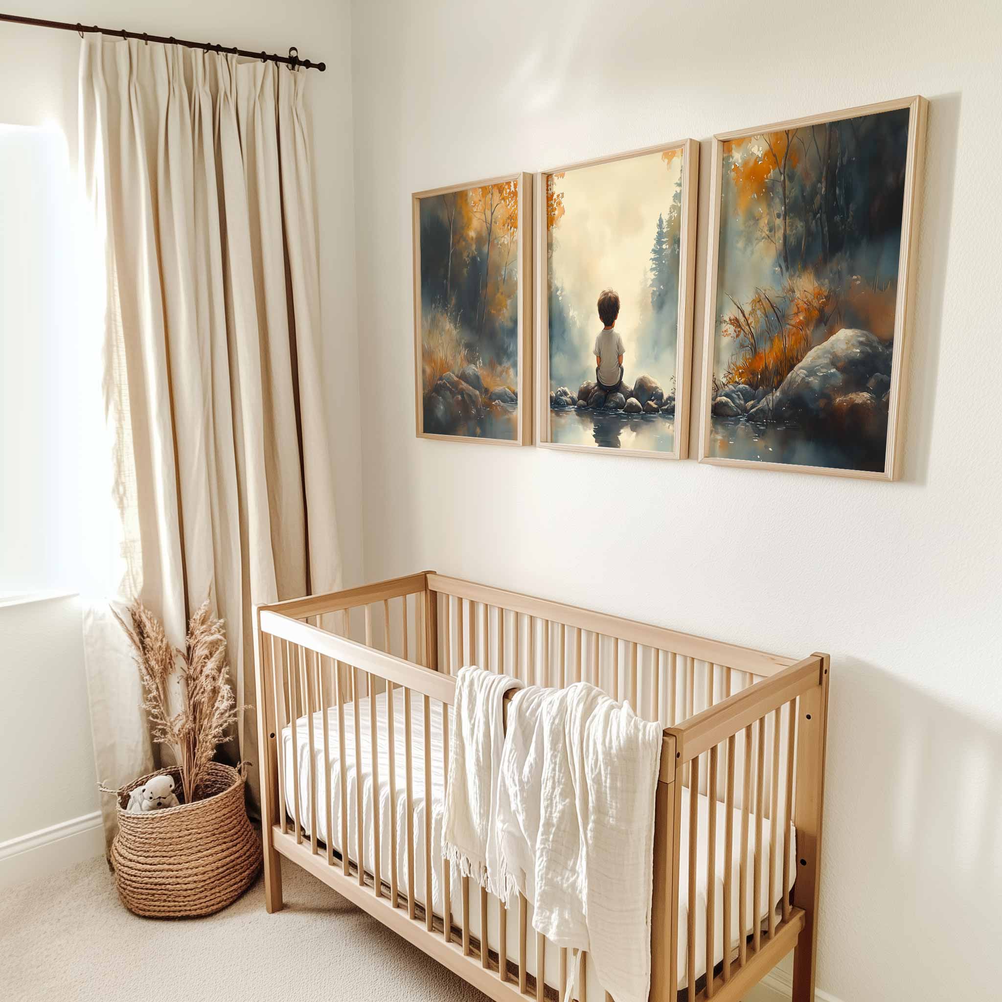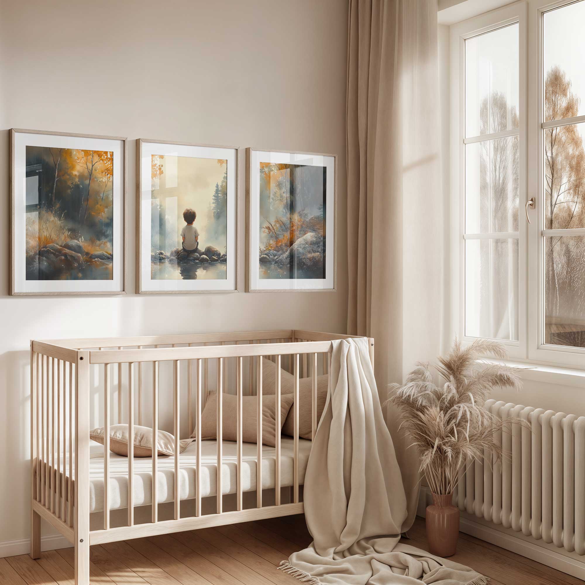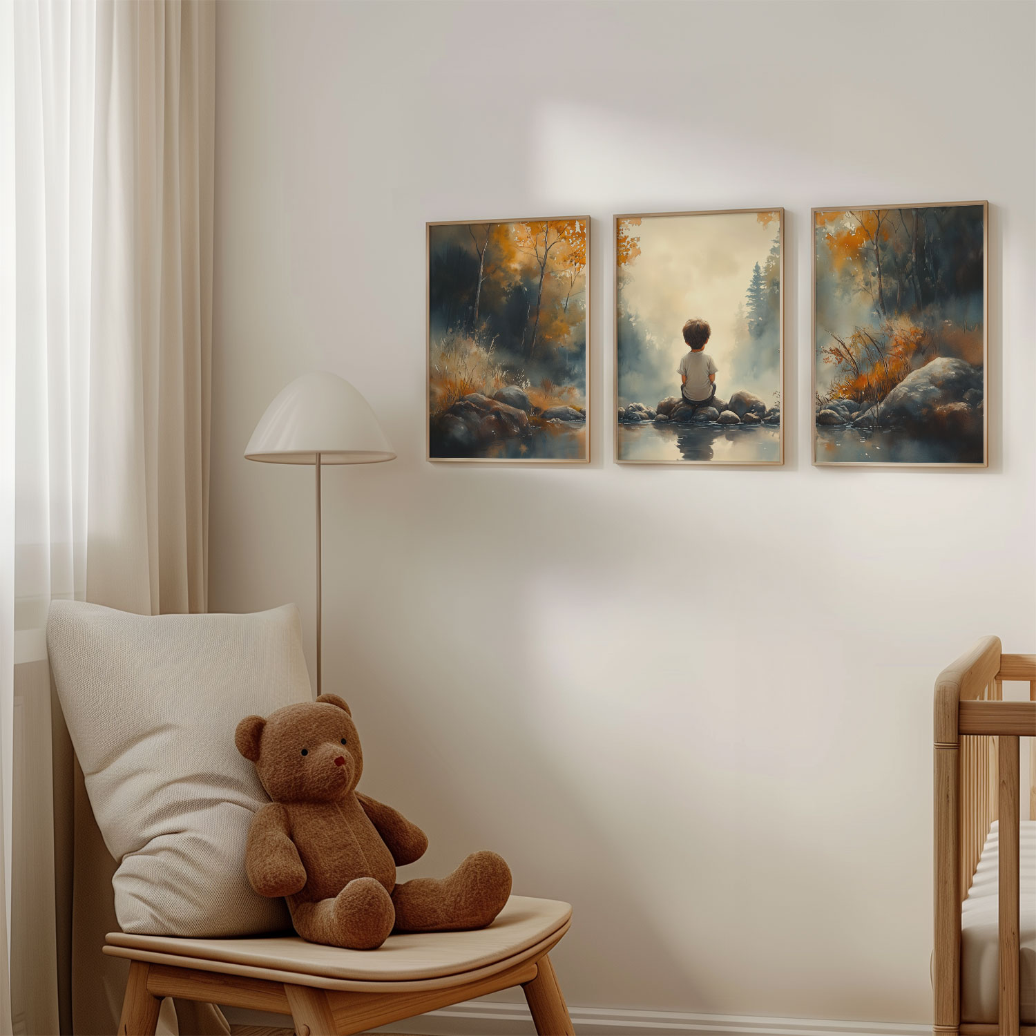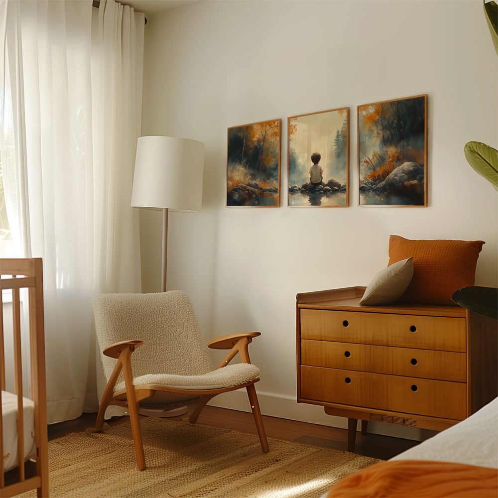 Terug naar collectie / Kinderkamer posters / Dromerig Riviertafereel met Jongen in het Bos