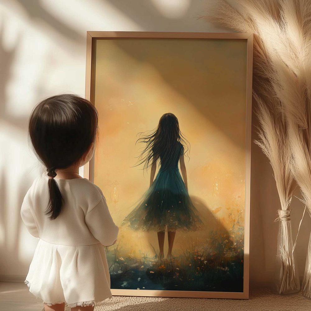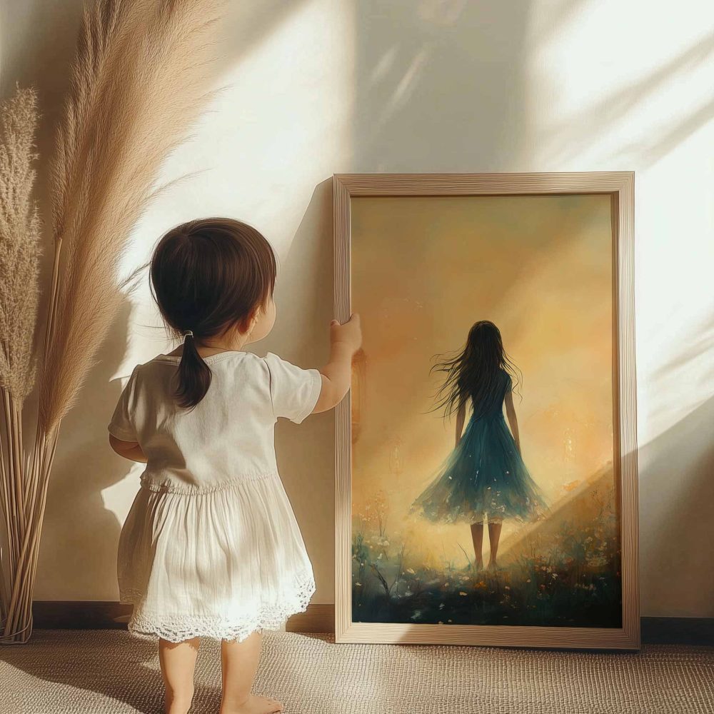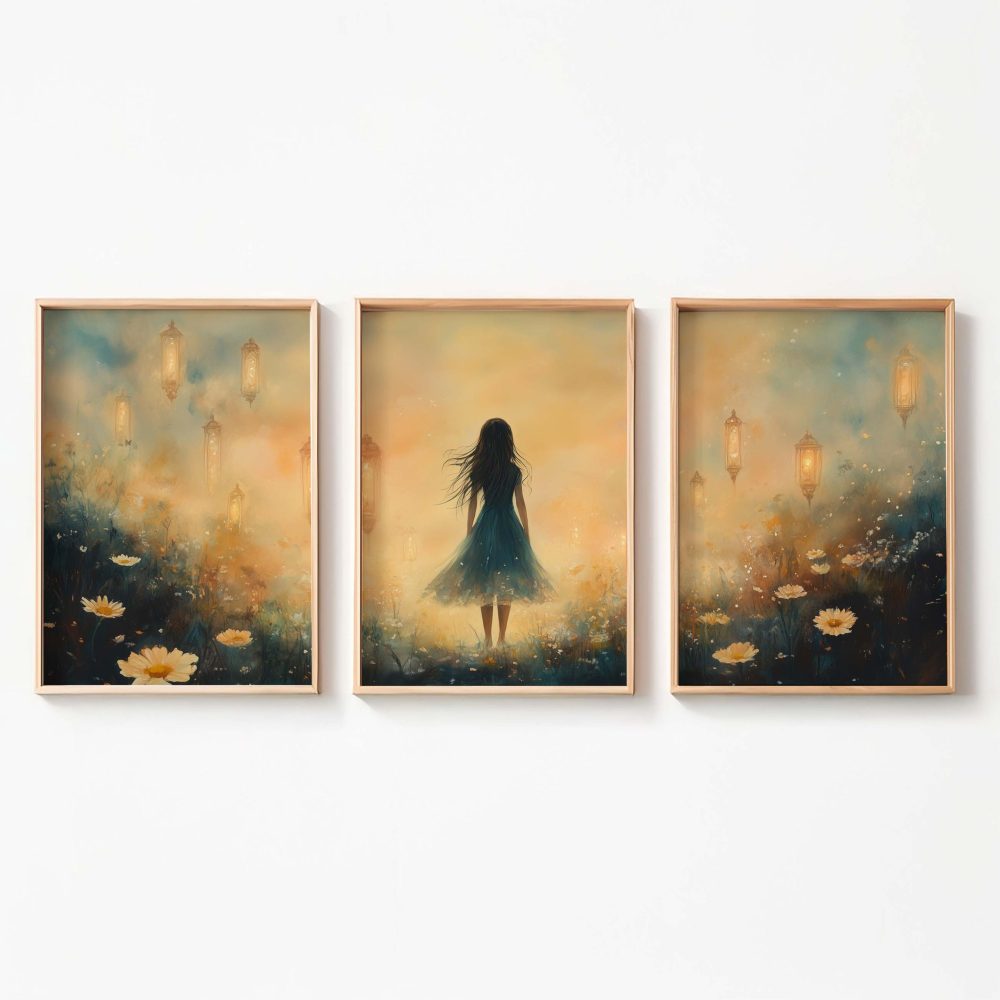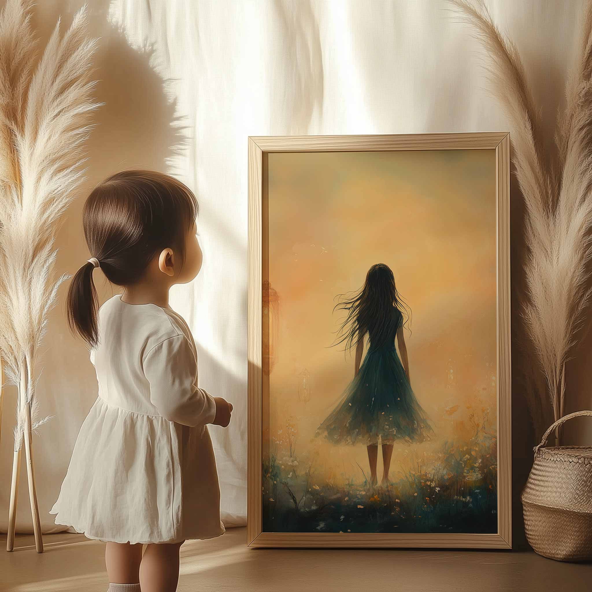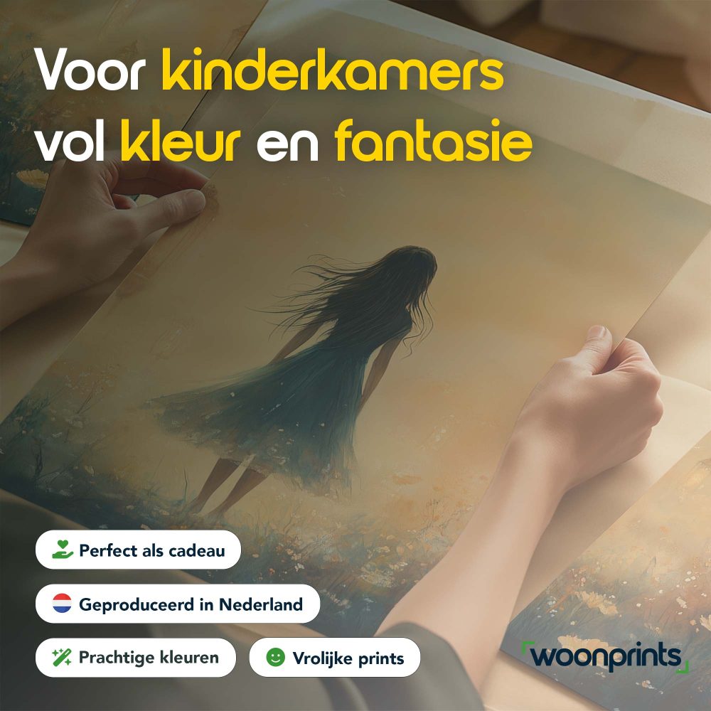 Terug naar collectie / Kinderkamer posters / Bloemen posters / Dromerig veld van bloemen en blauwe jurk